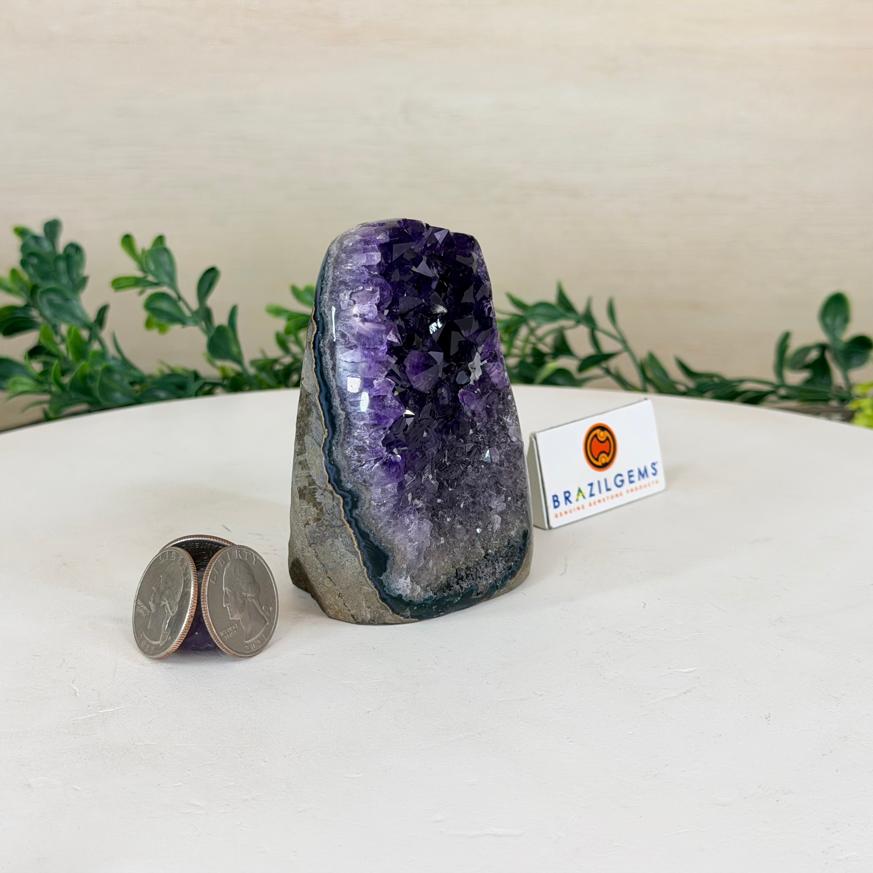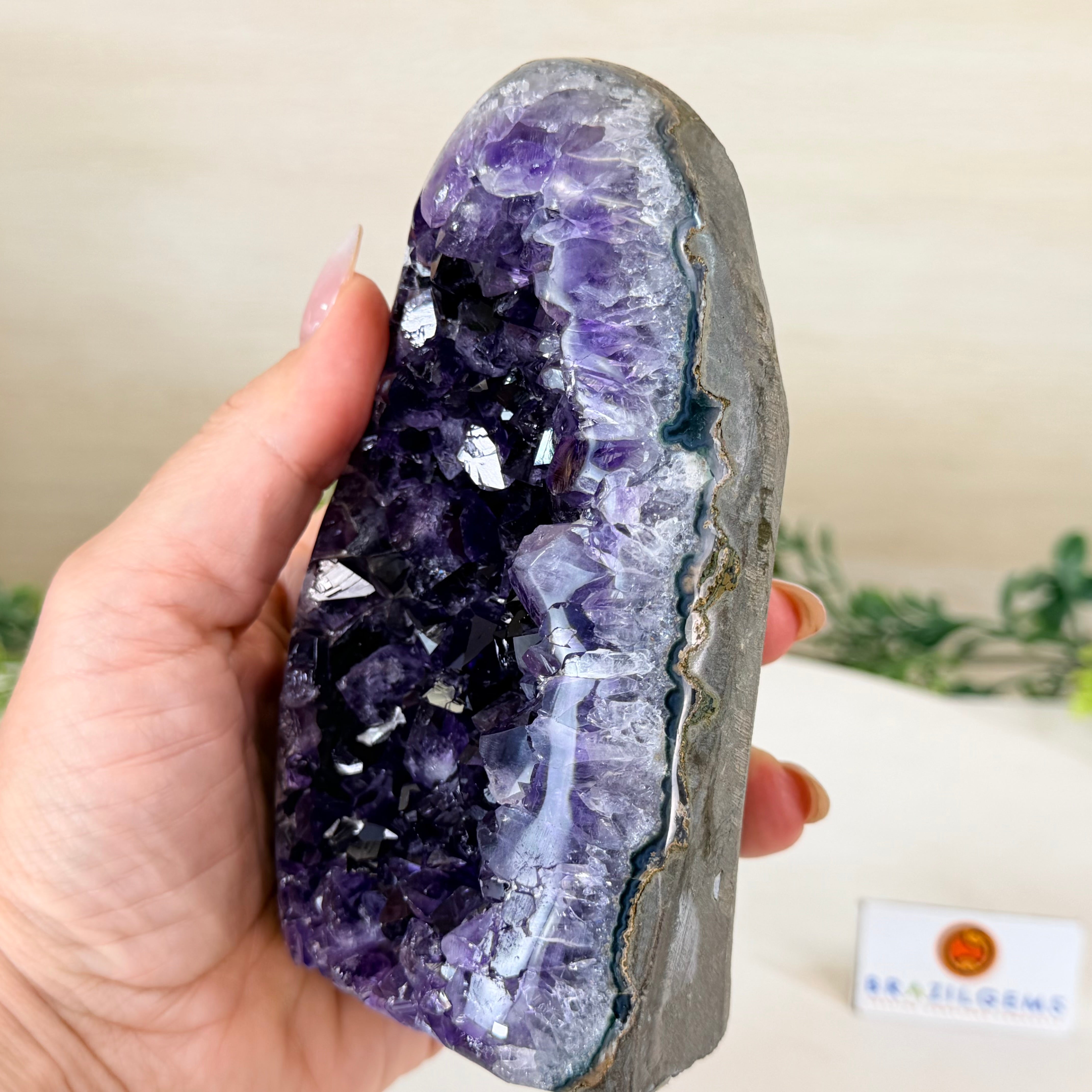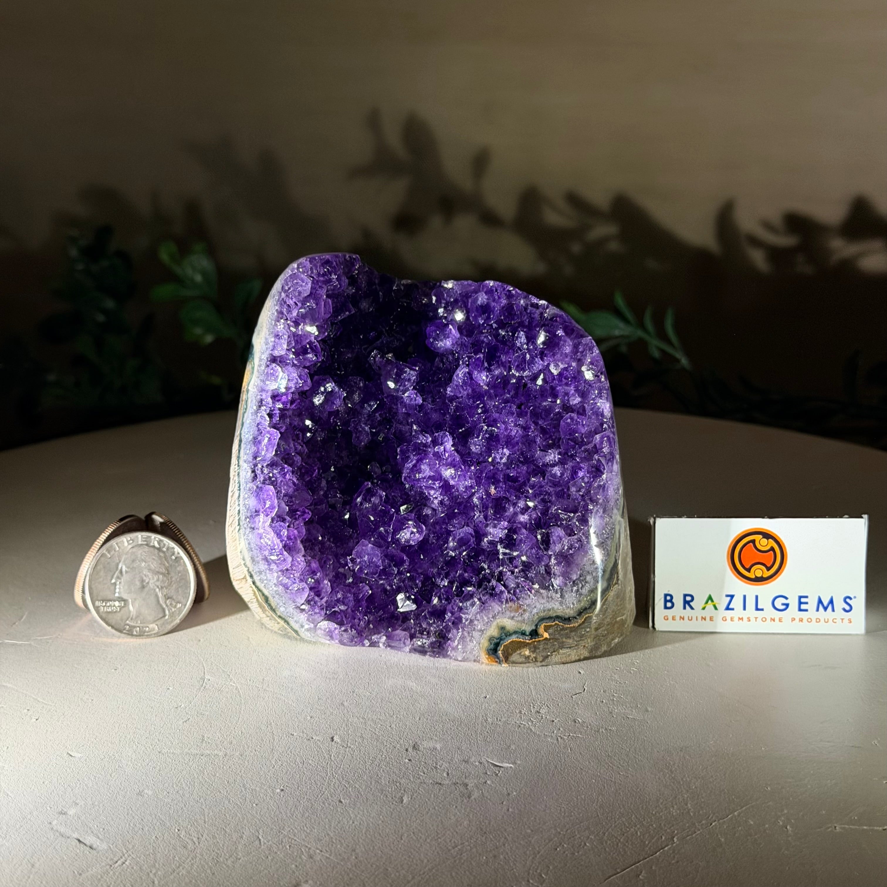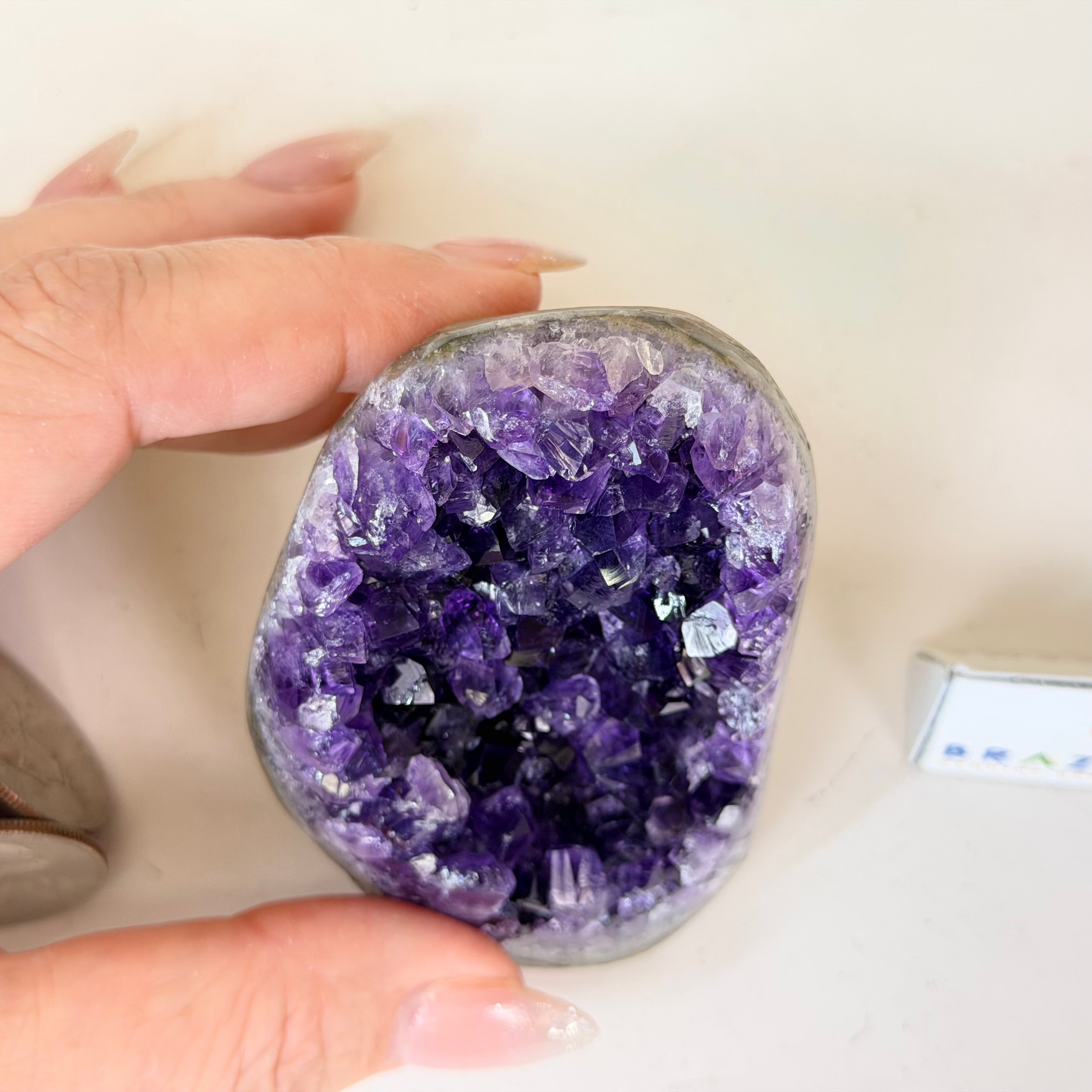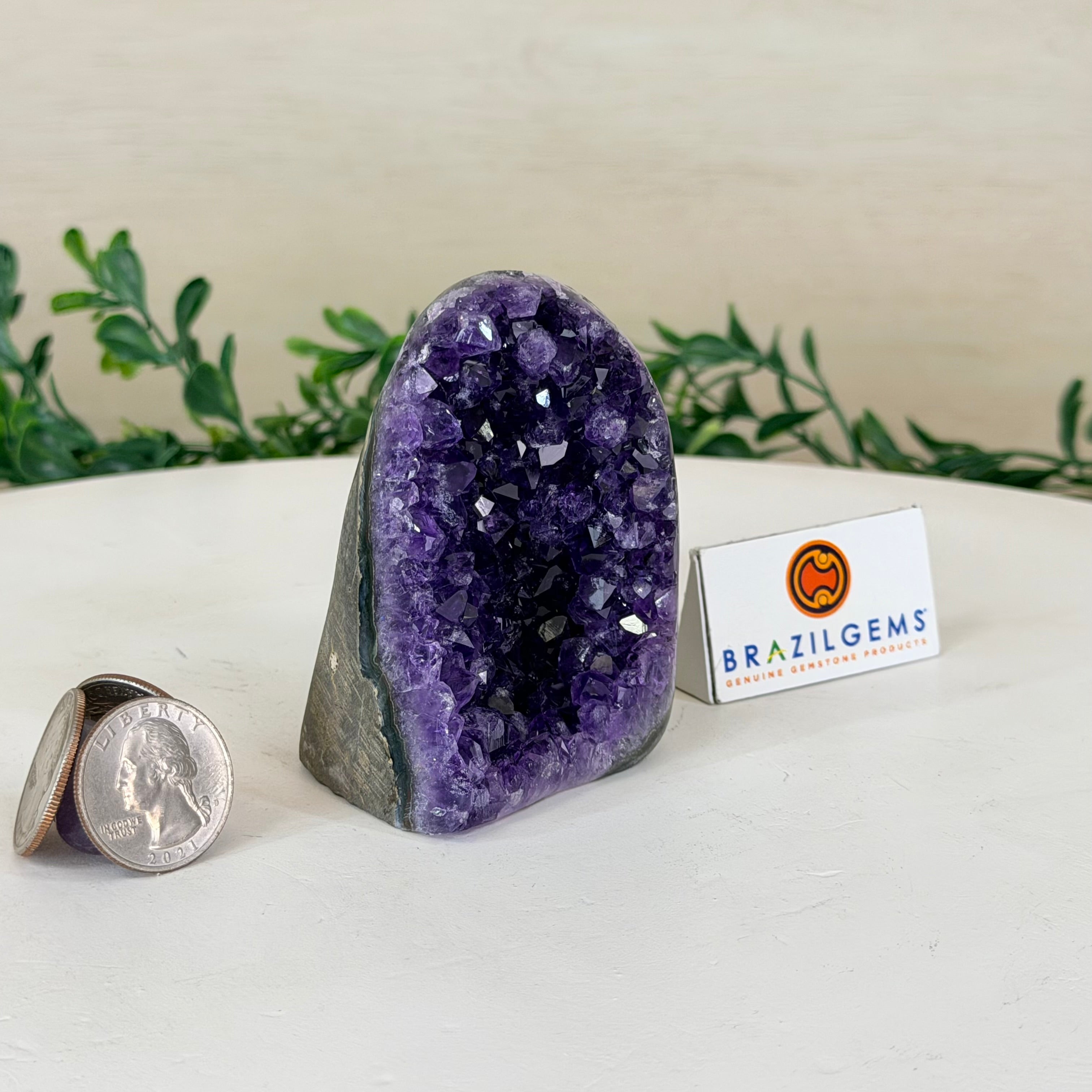 These clusters grow inside geodes–where mineral-rich water slowly deposits crystals over time. The result is a captivating arrangement of pointed amethyst crystals that can beautify any space.