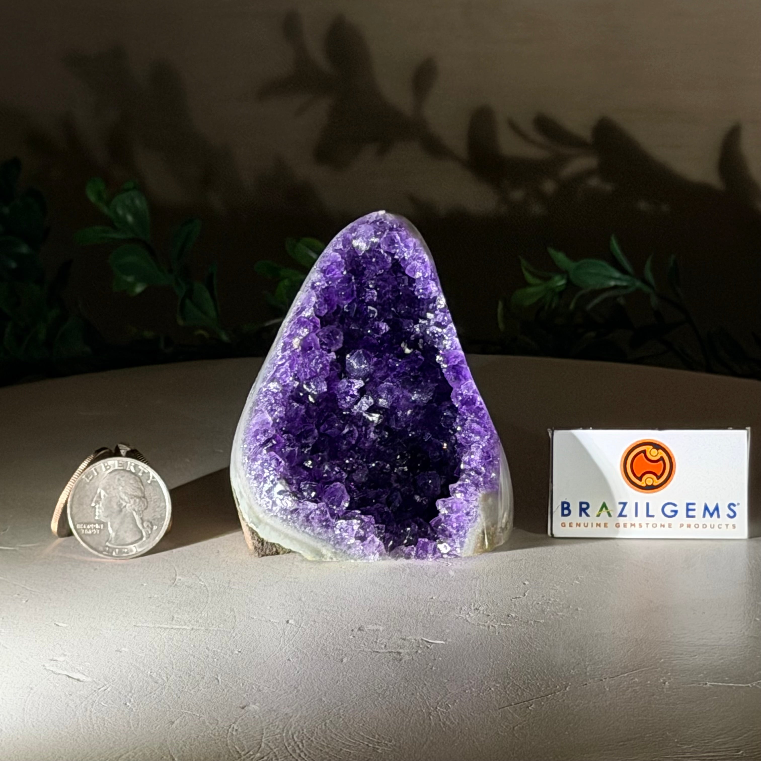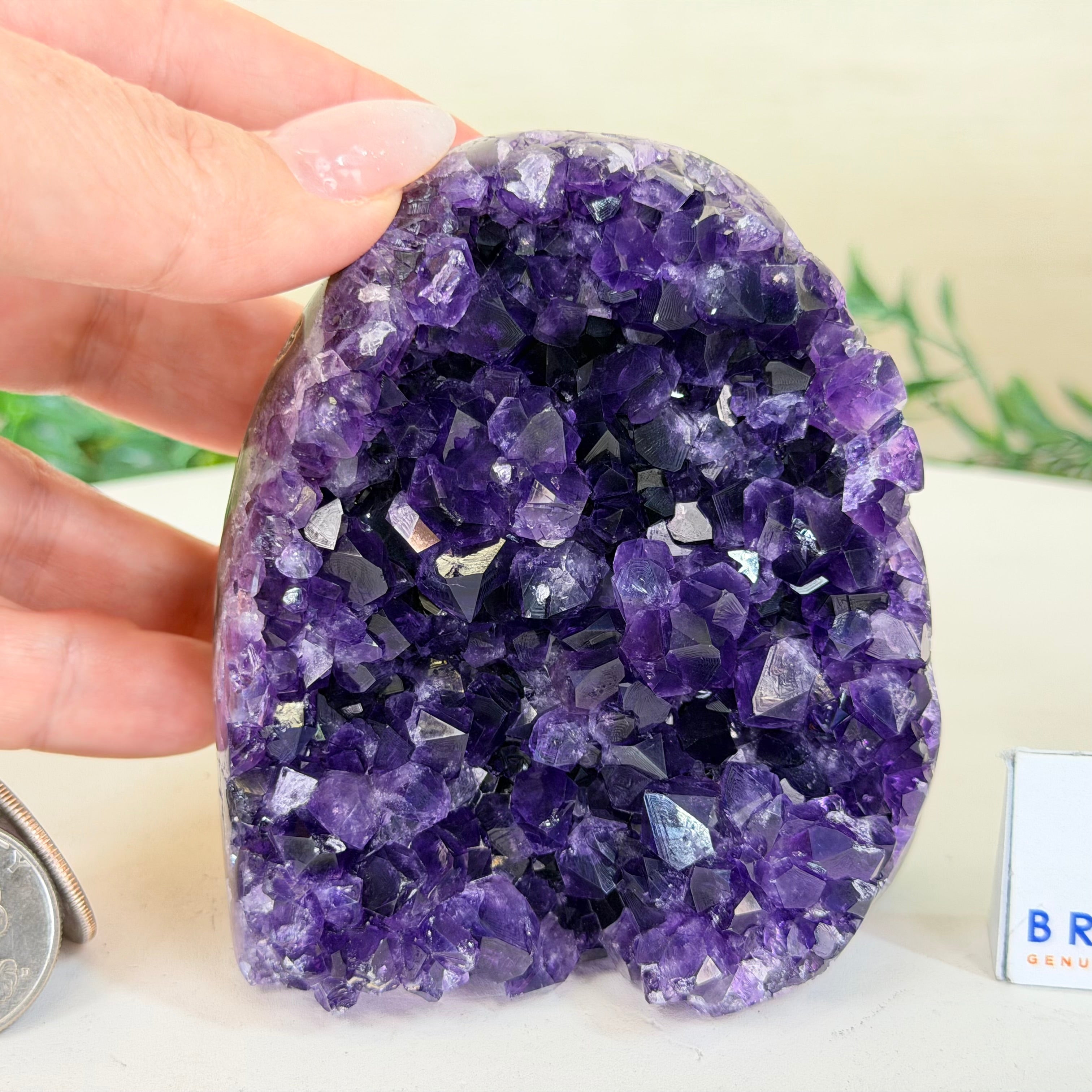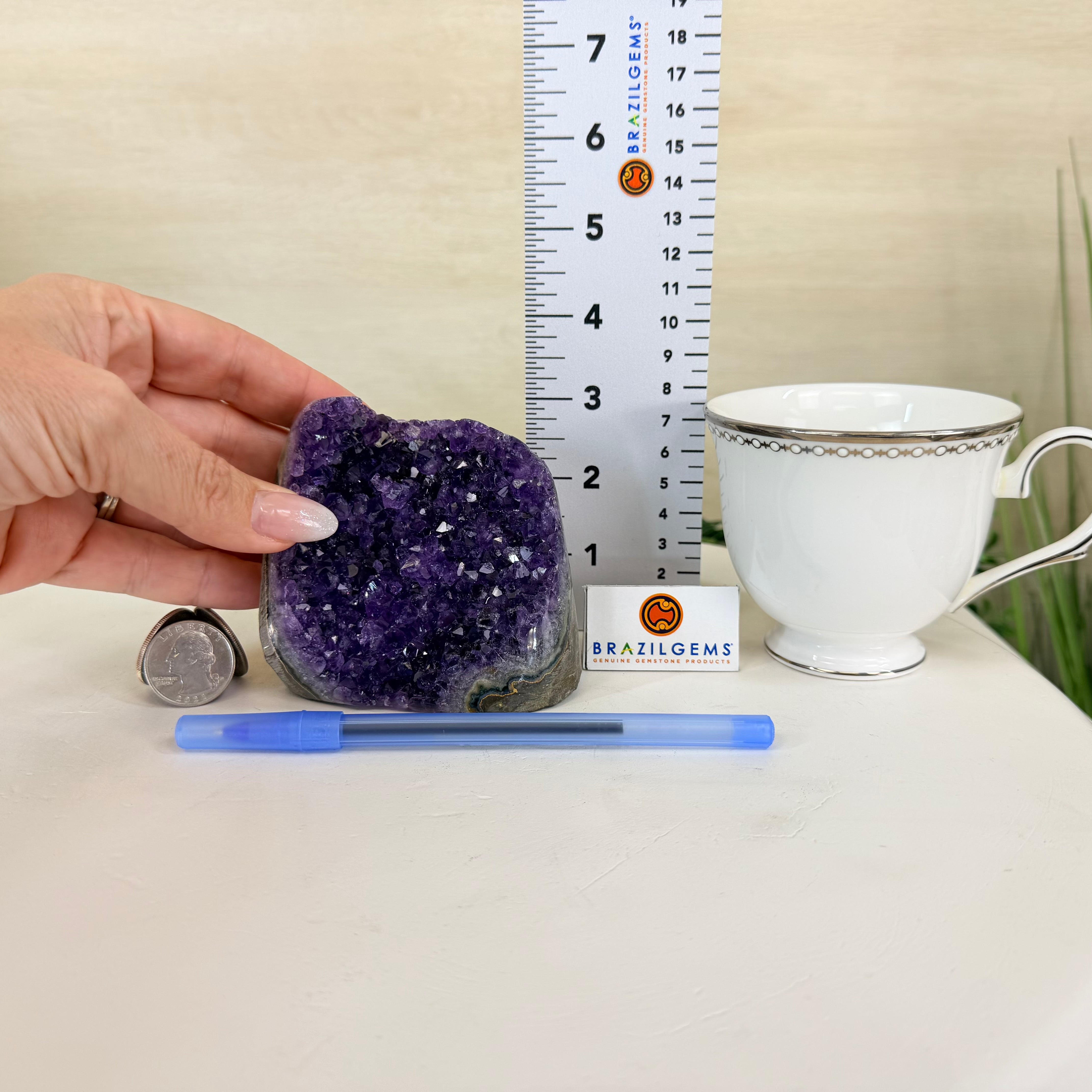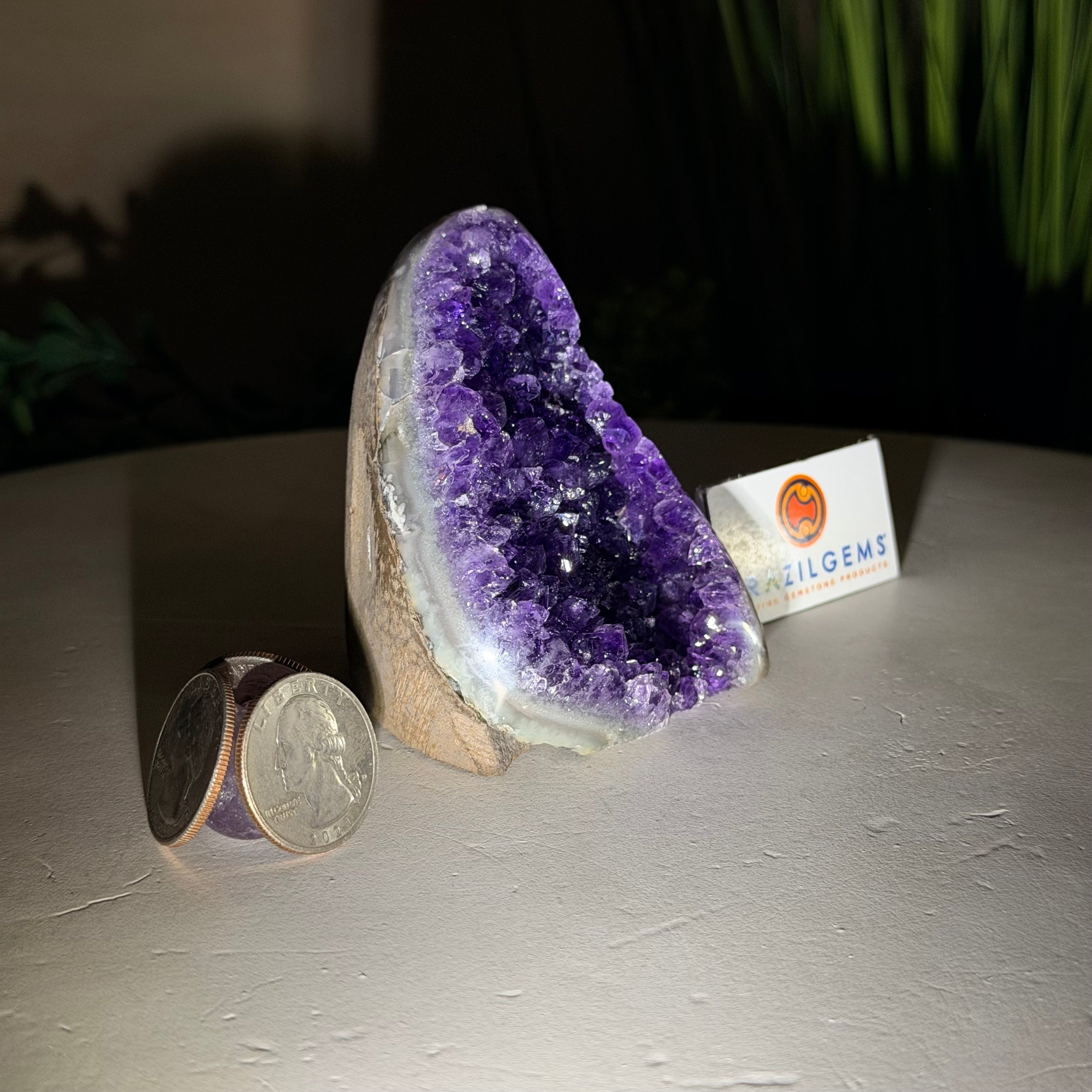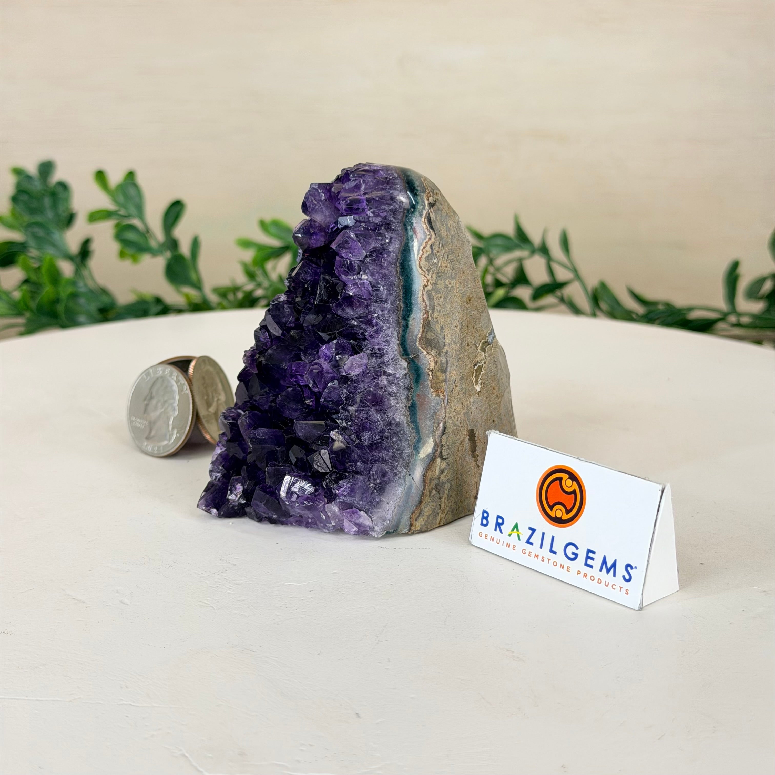 These clusters grow inside geodes–where mineral-rich water slowly deposits crystals over time. The result is a captivating arrangement of pointed amethyst crystals that can beautify any space.