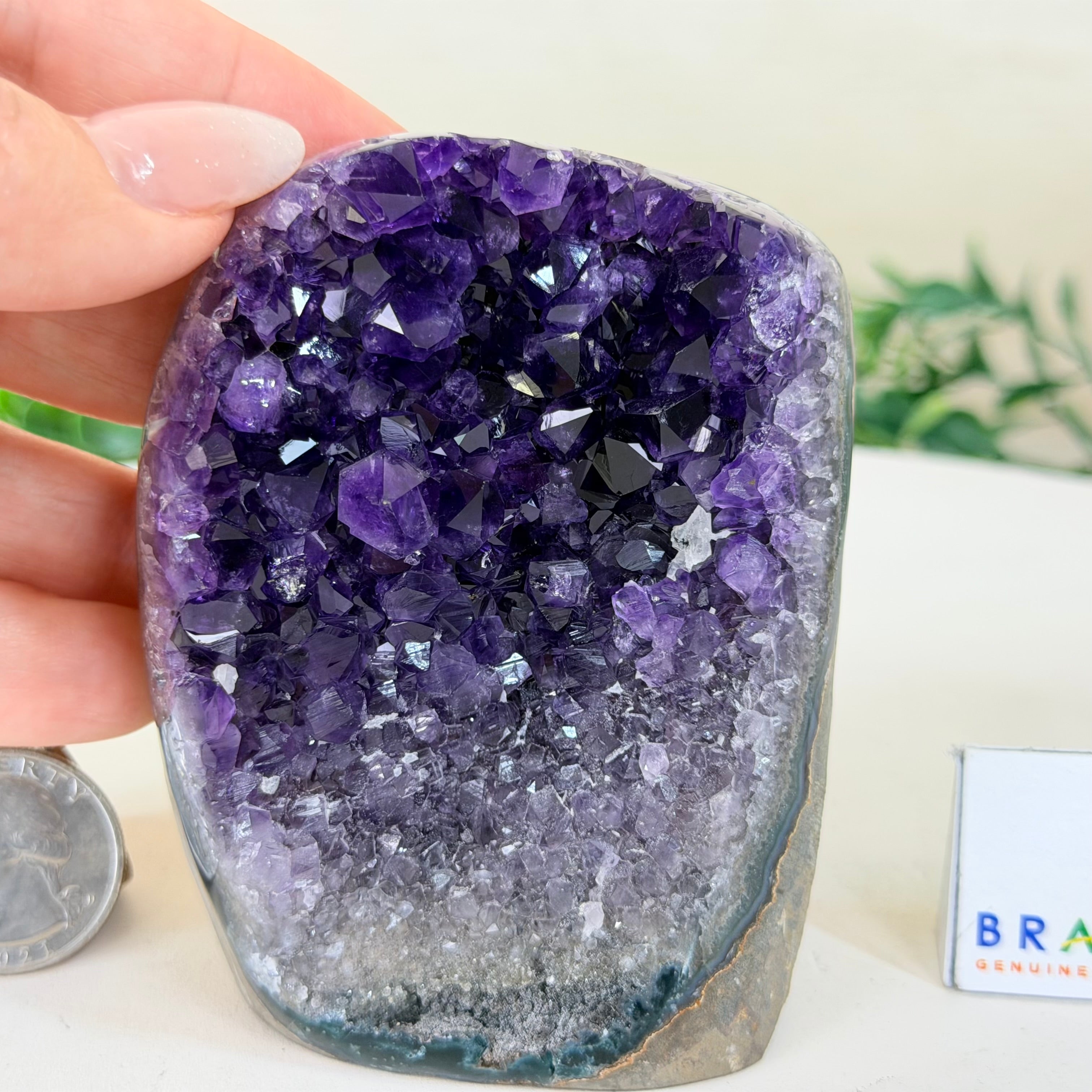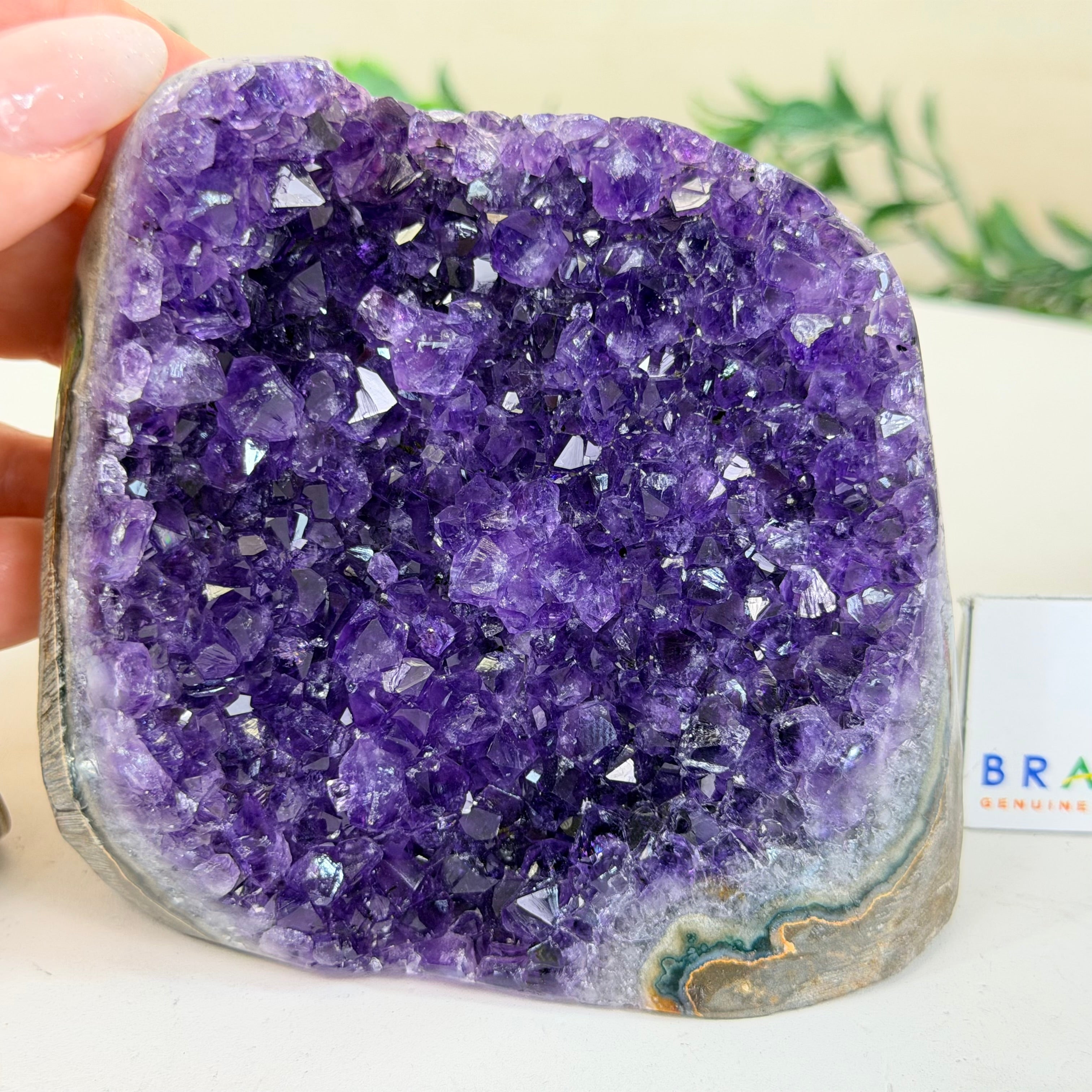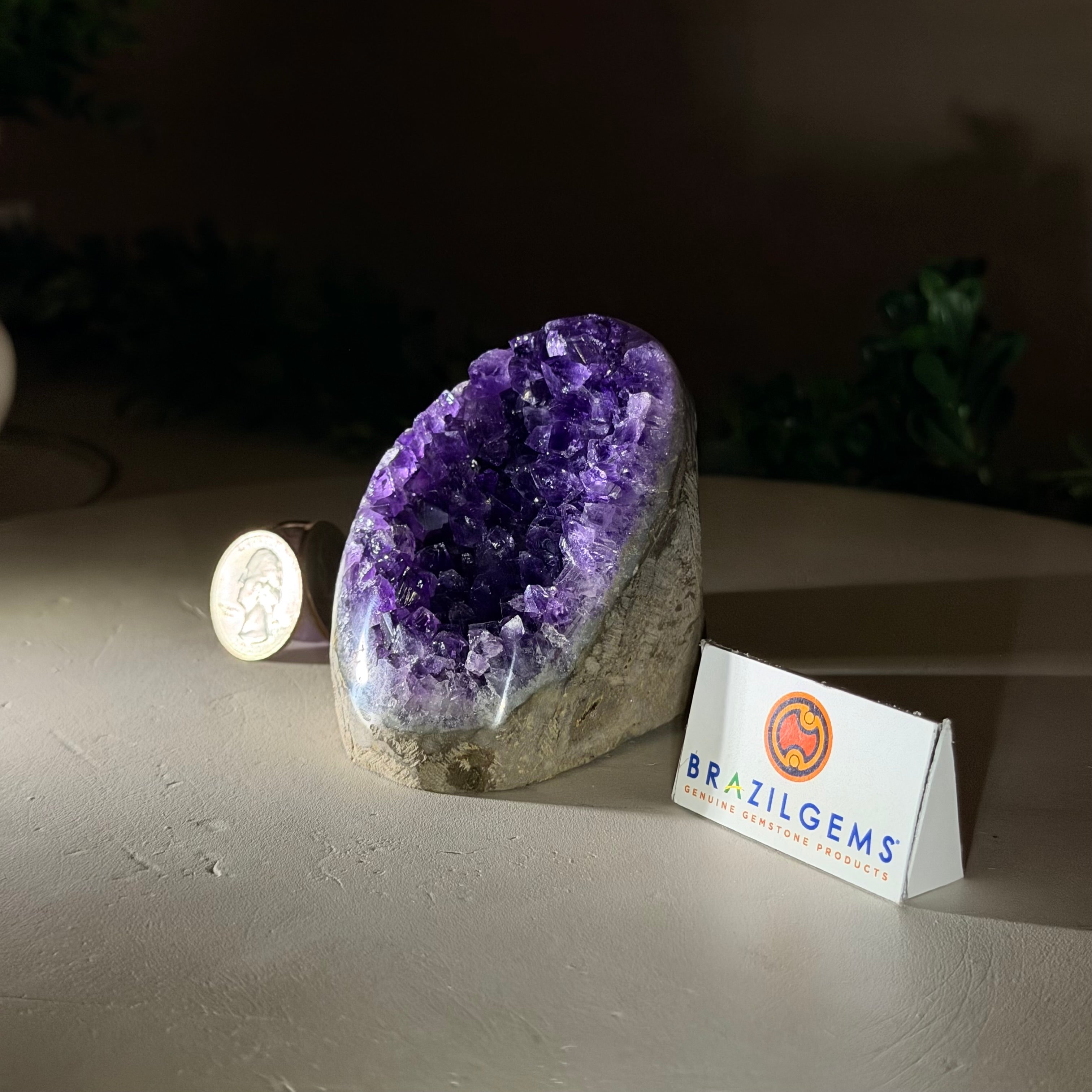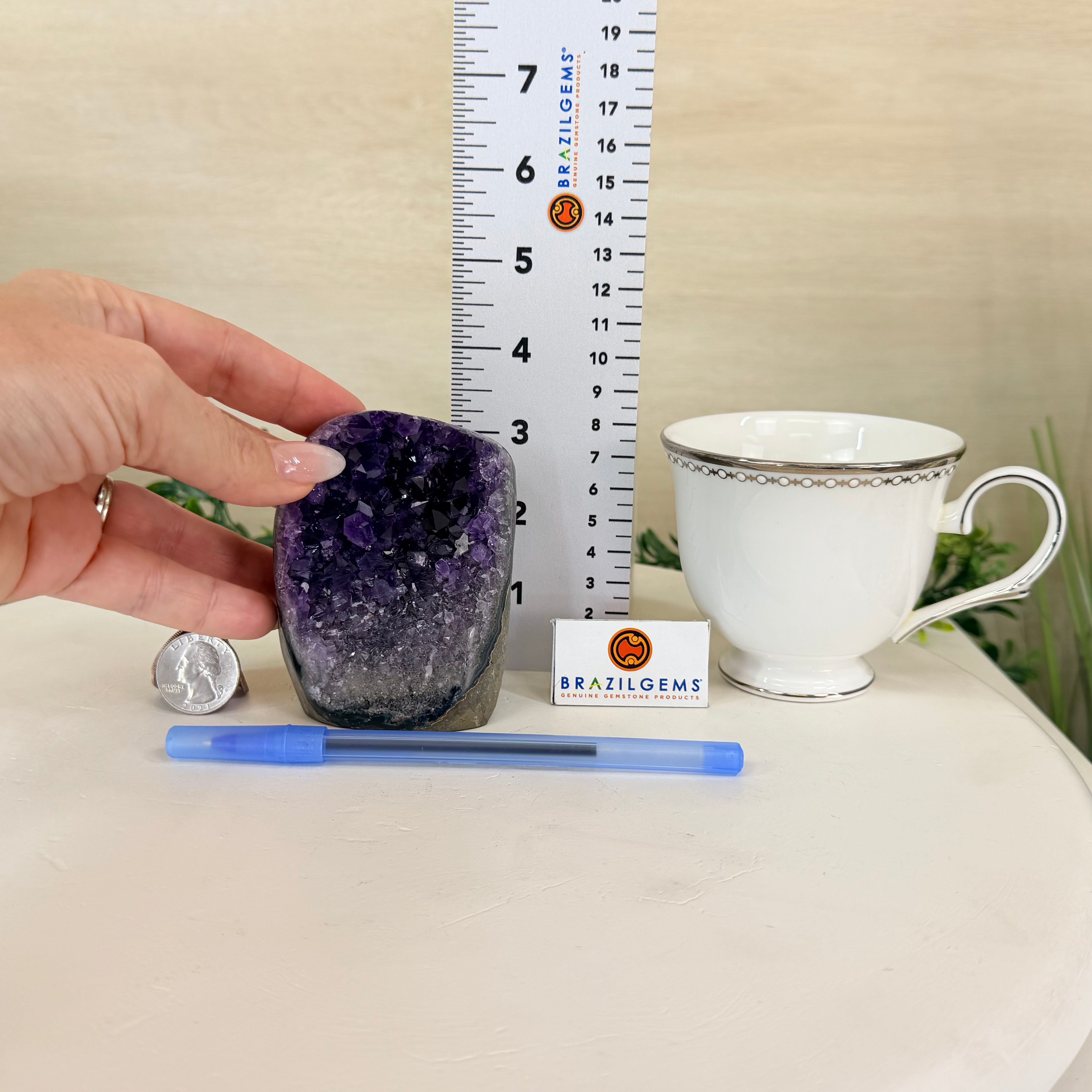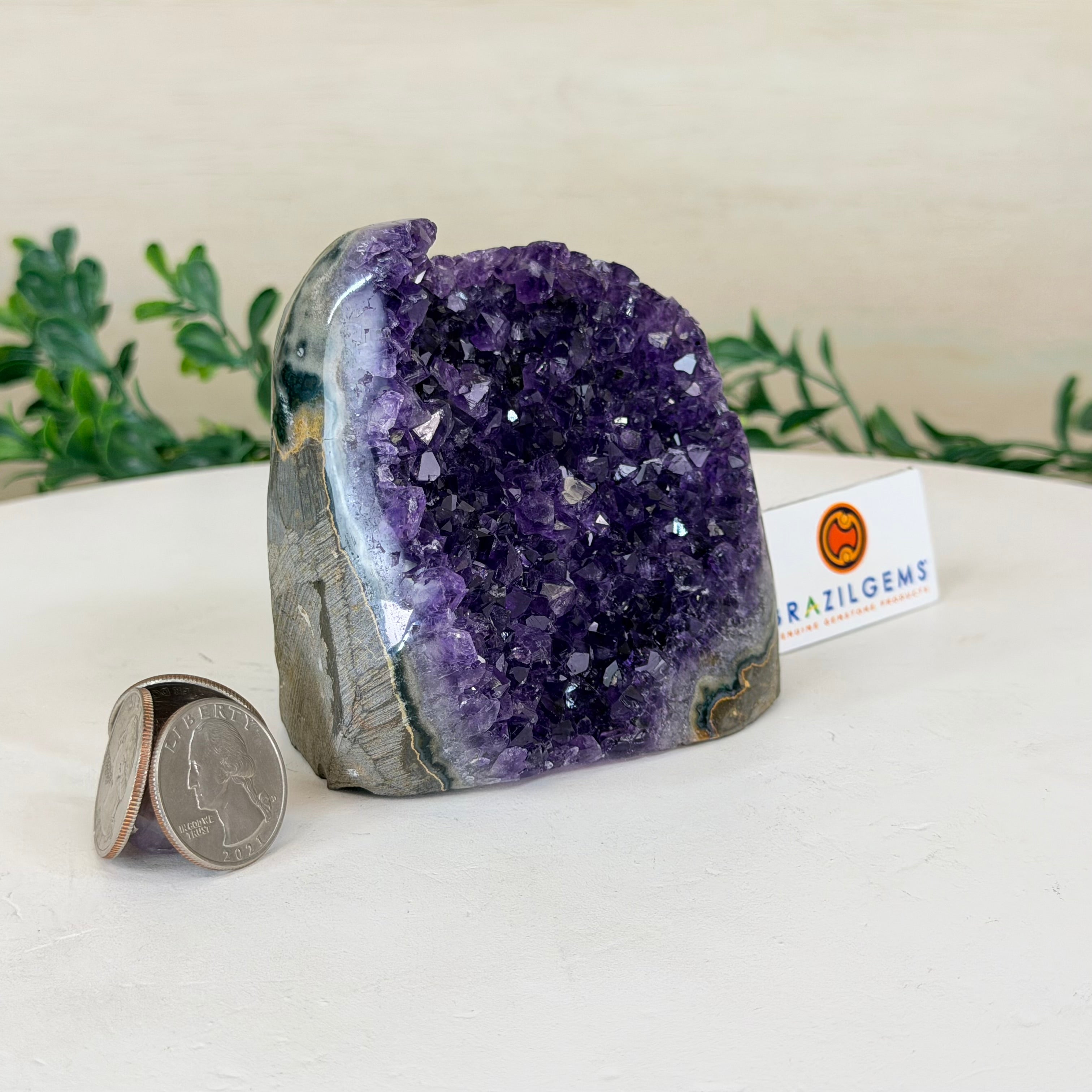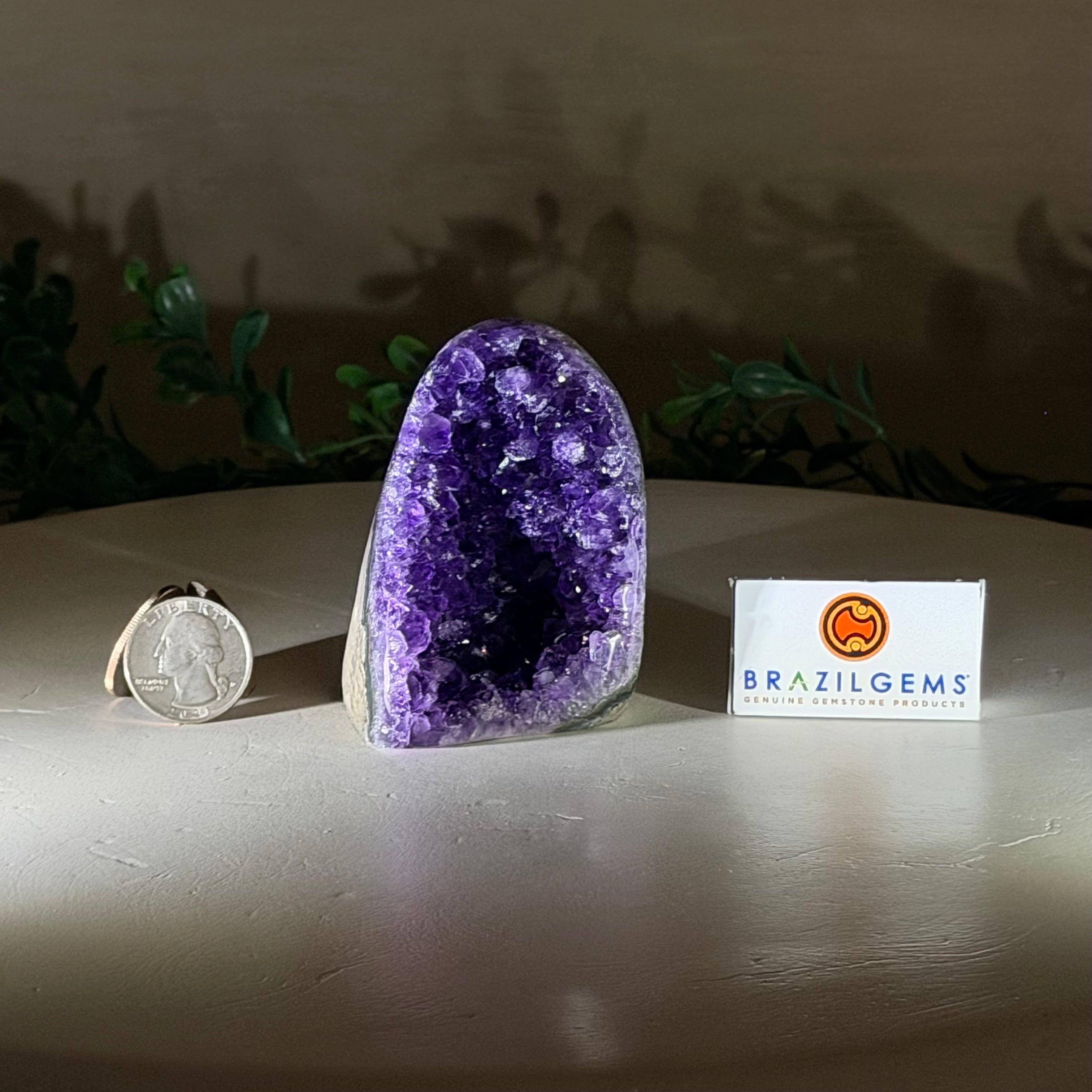 These clusters grow inside geodes–where mineral-rich water slowly deposits crystals over time. The result is a captivating arrangement of pointed amethyst crystals that can beautify any space.