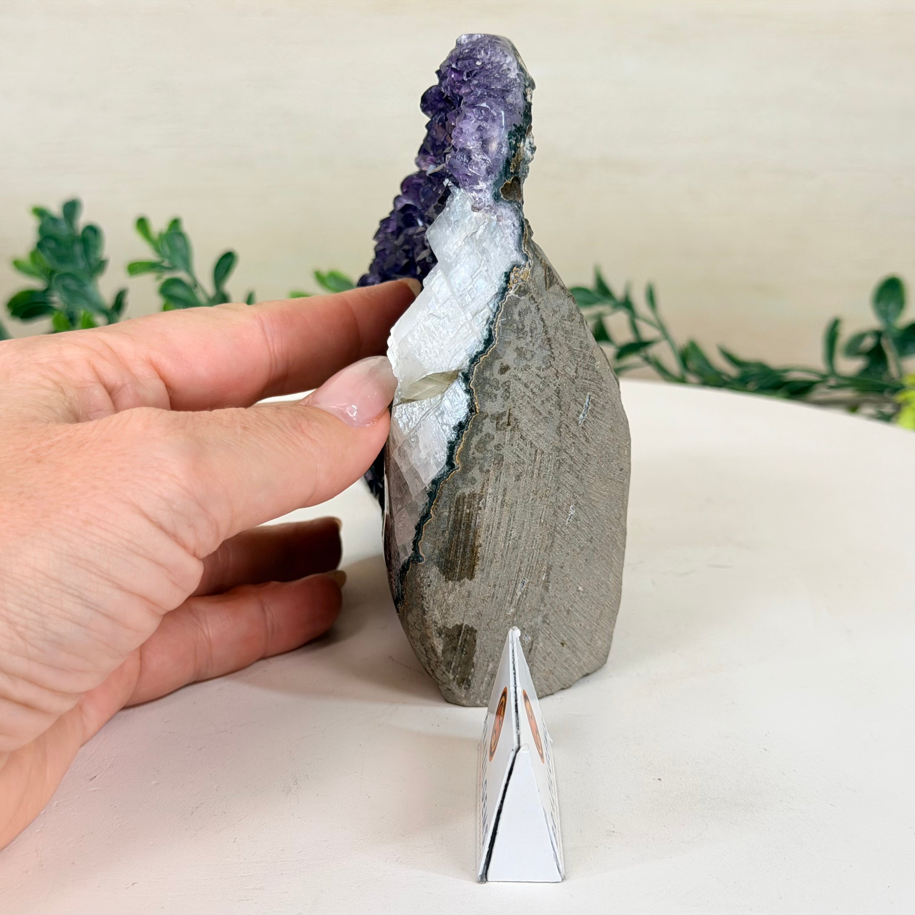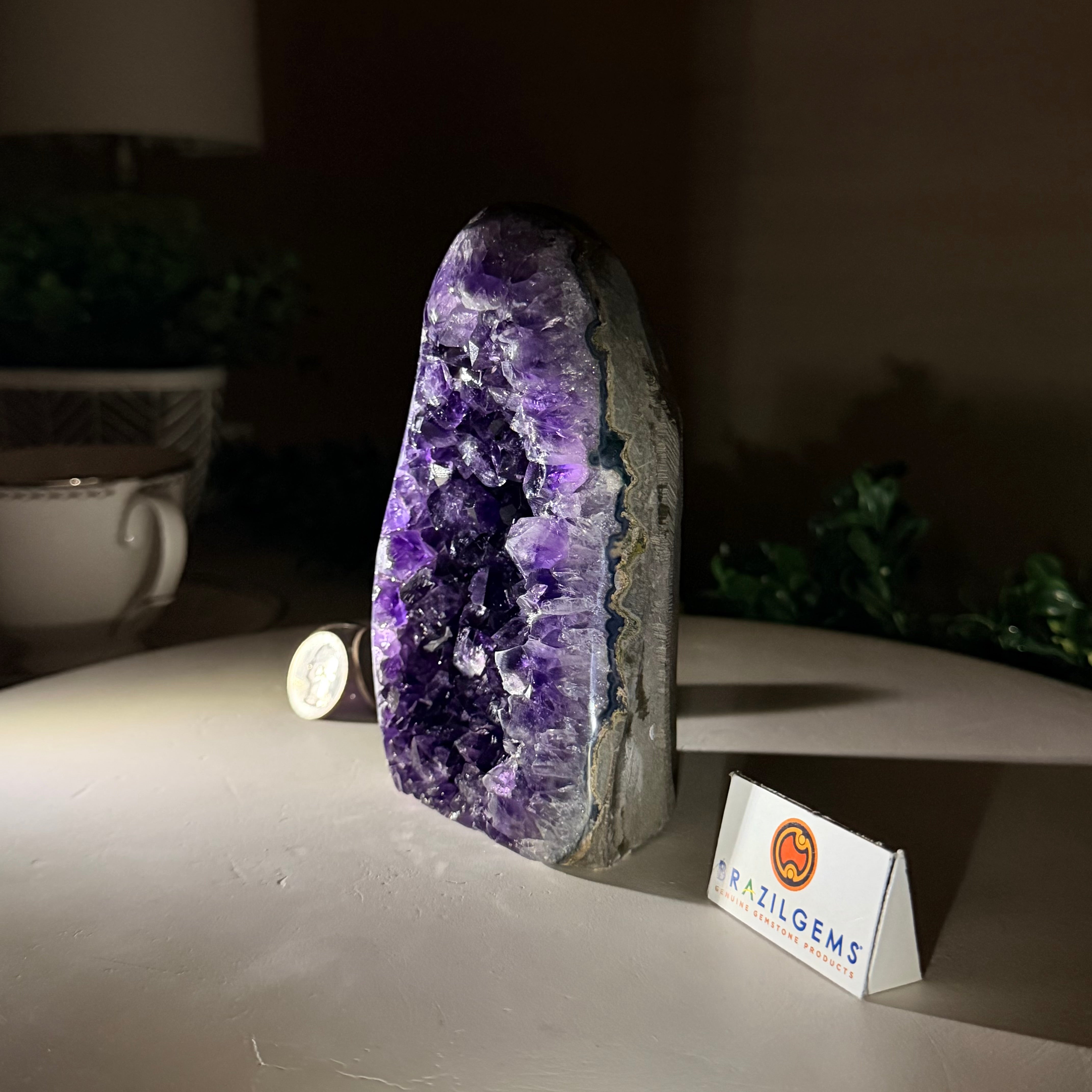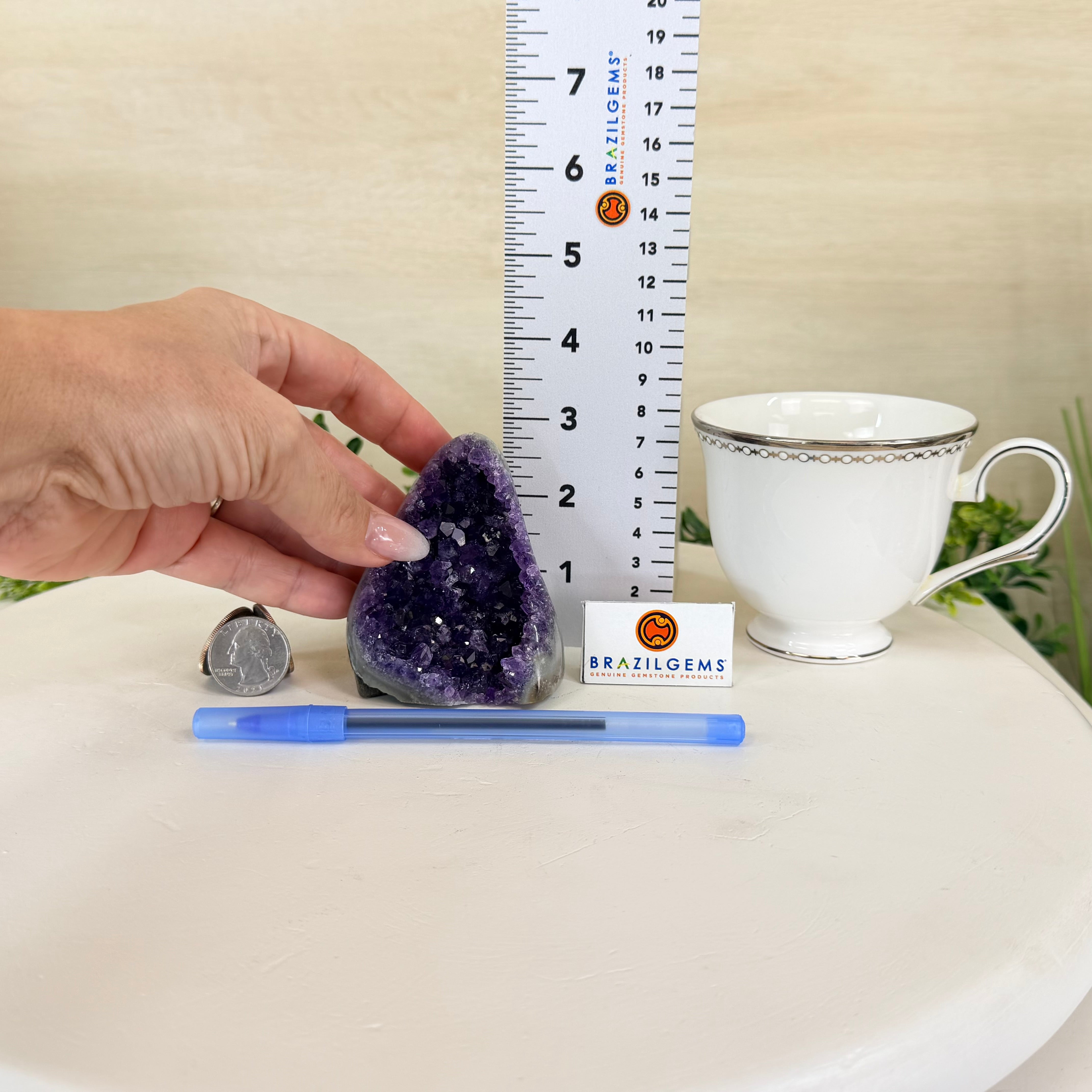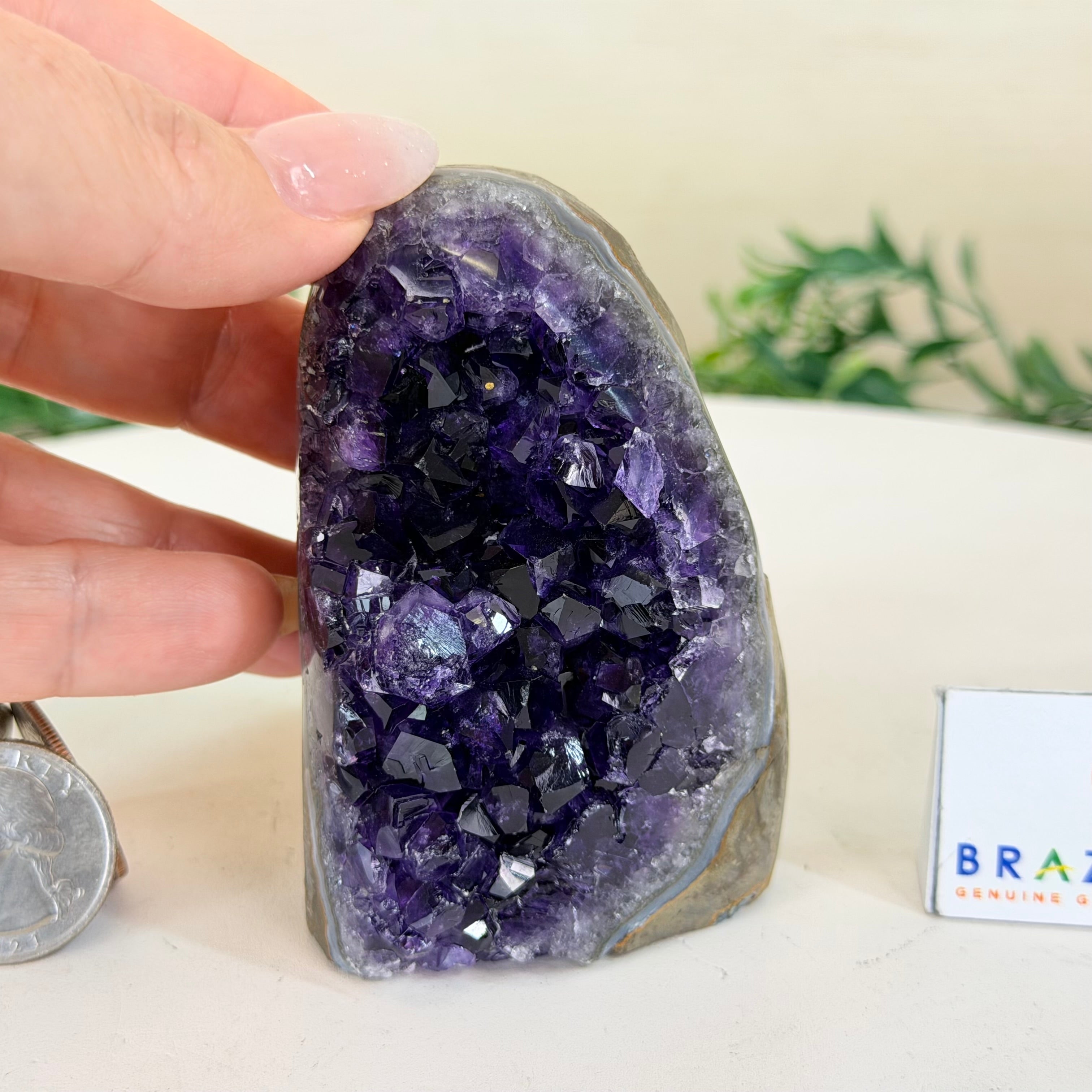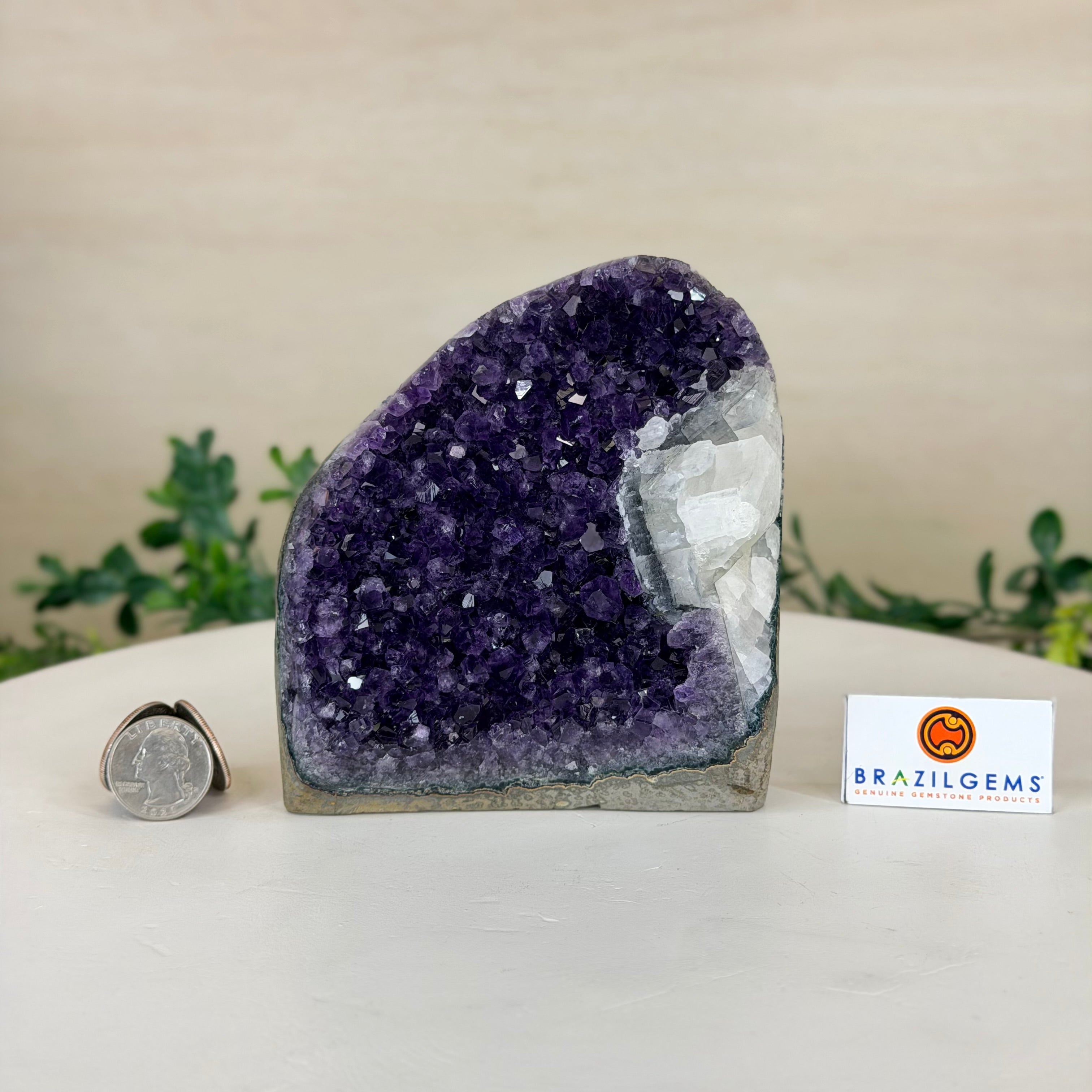 These clusters grow inside geodes–where mineral-rich water slowly deposits crystals over time. The result is a captivating arrangement of pointed amethyst crystals that can beautify any space.