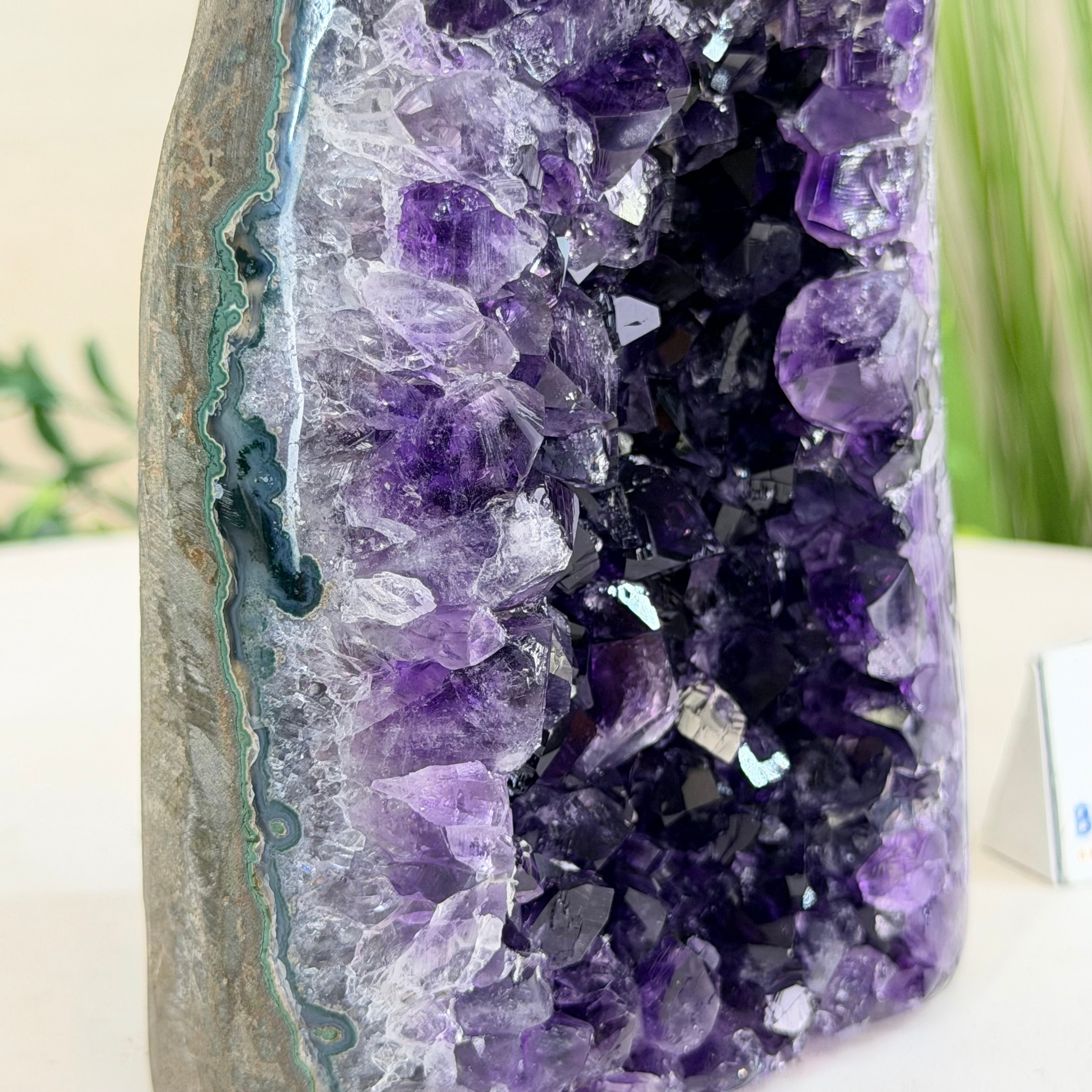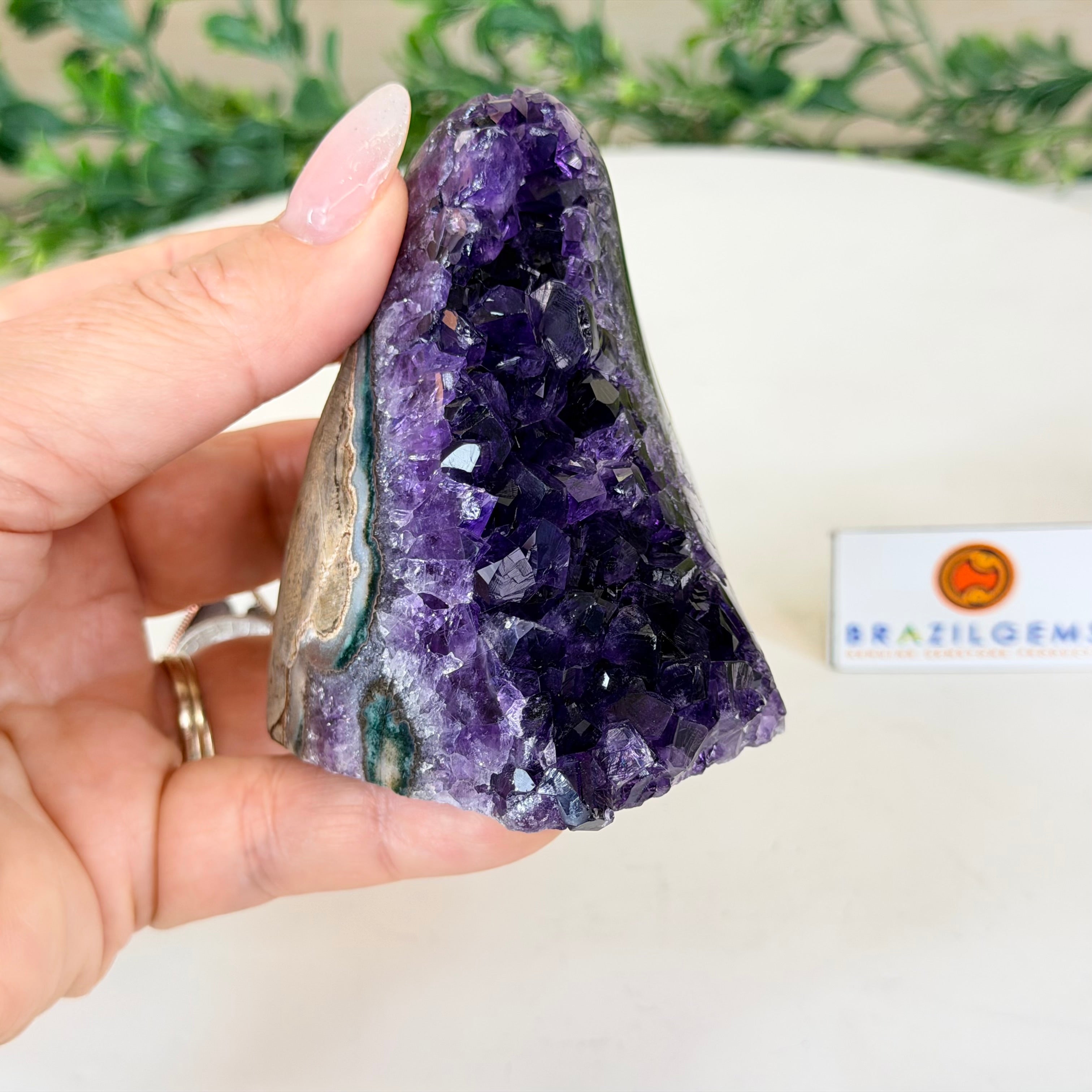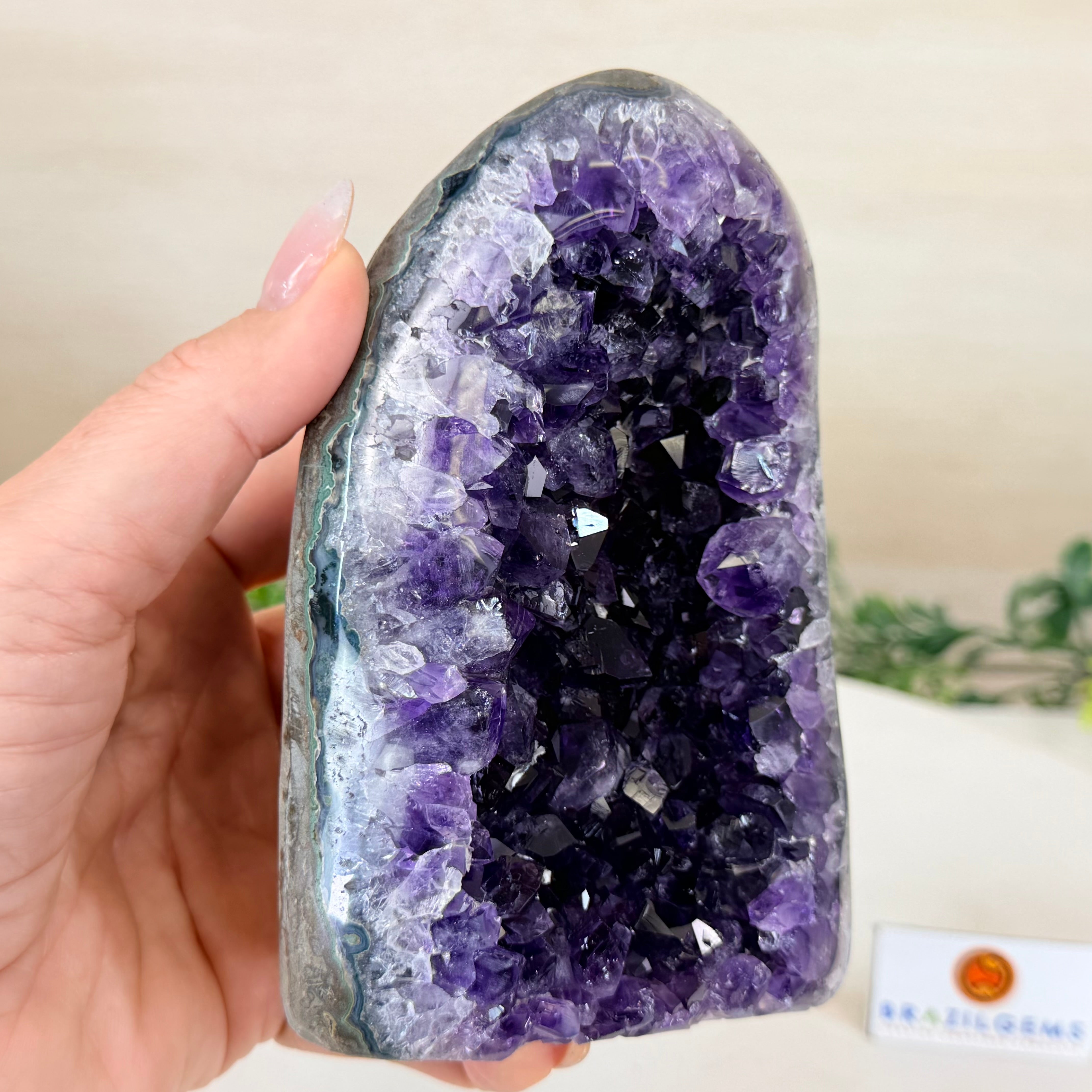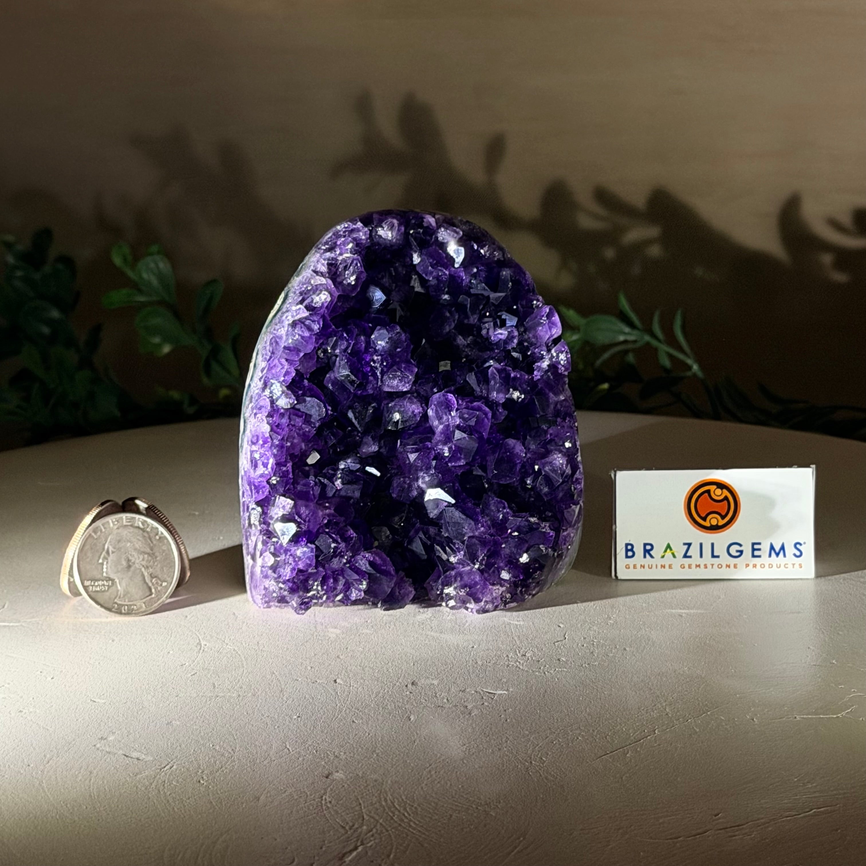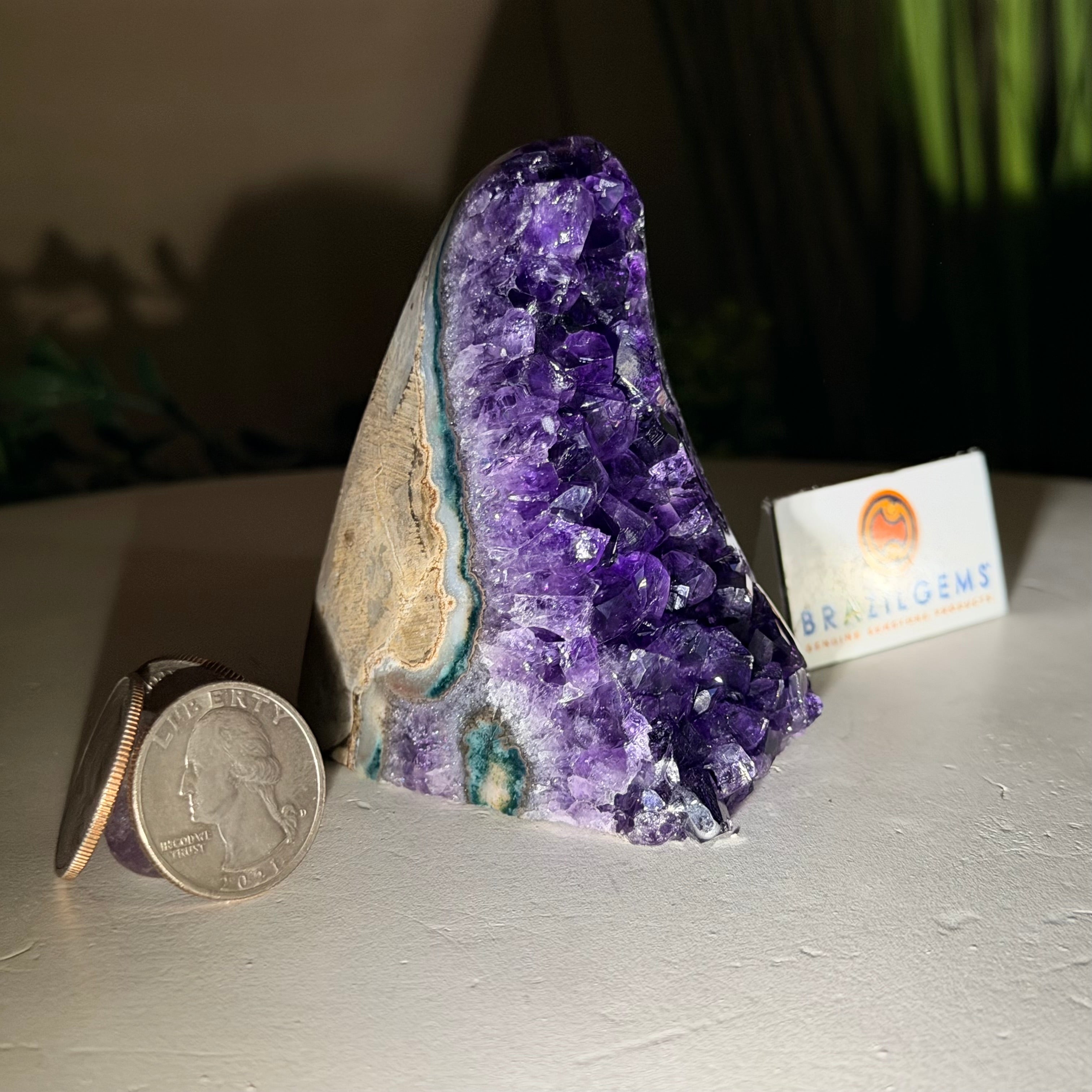 These clusters grow inside geodes–where mineral-rich water slowly deposits crystals over time. The result is a captivating arrangement of pointed amethyst crystals that can beautify any space.