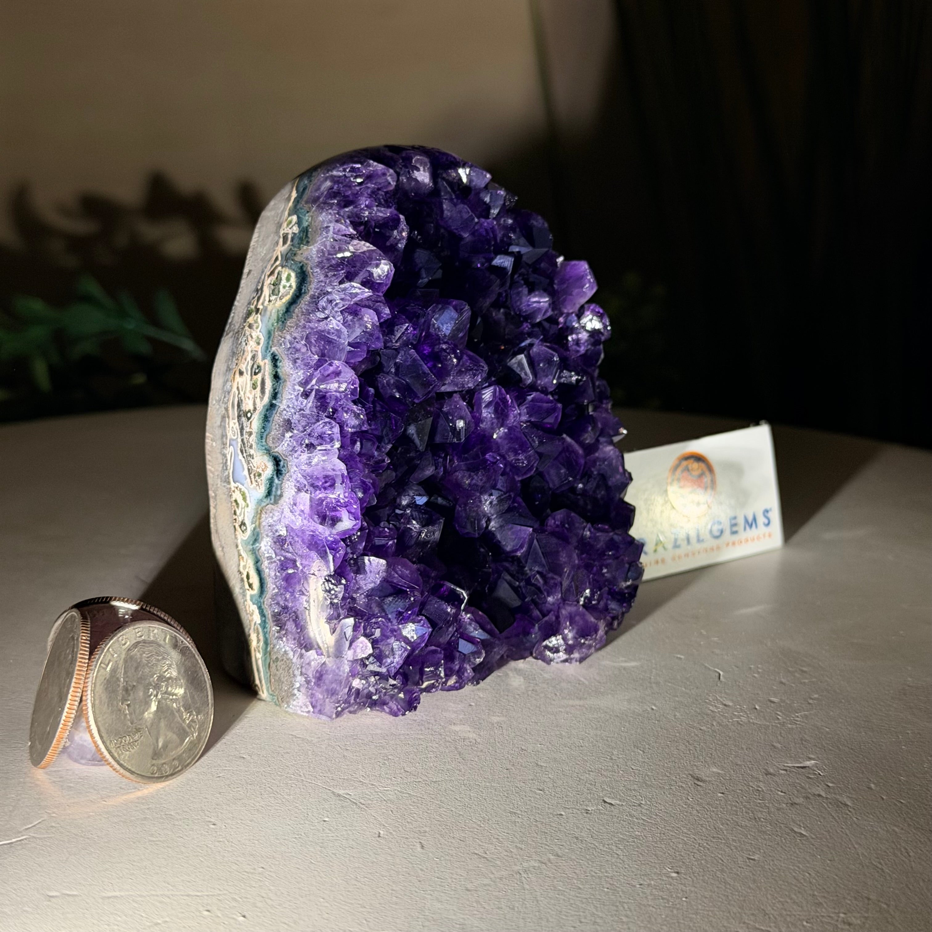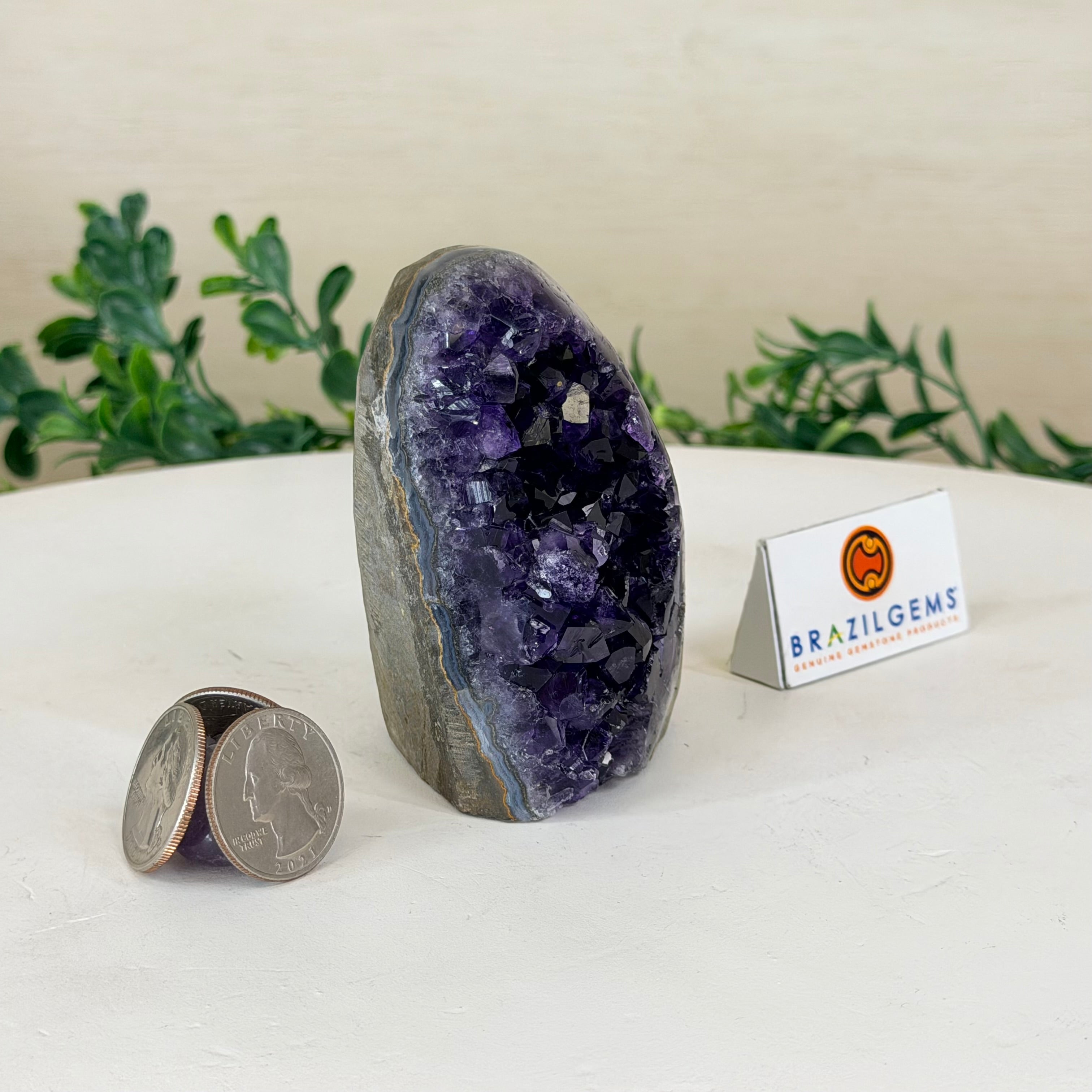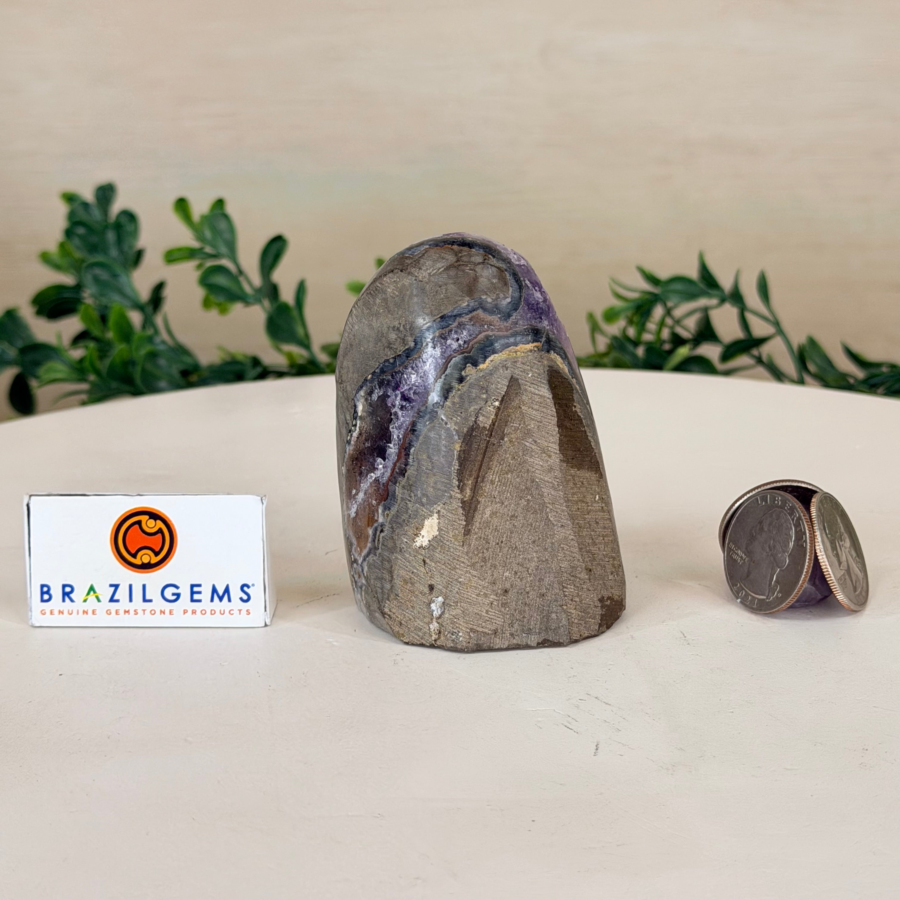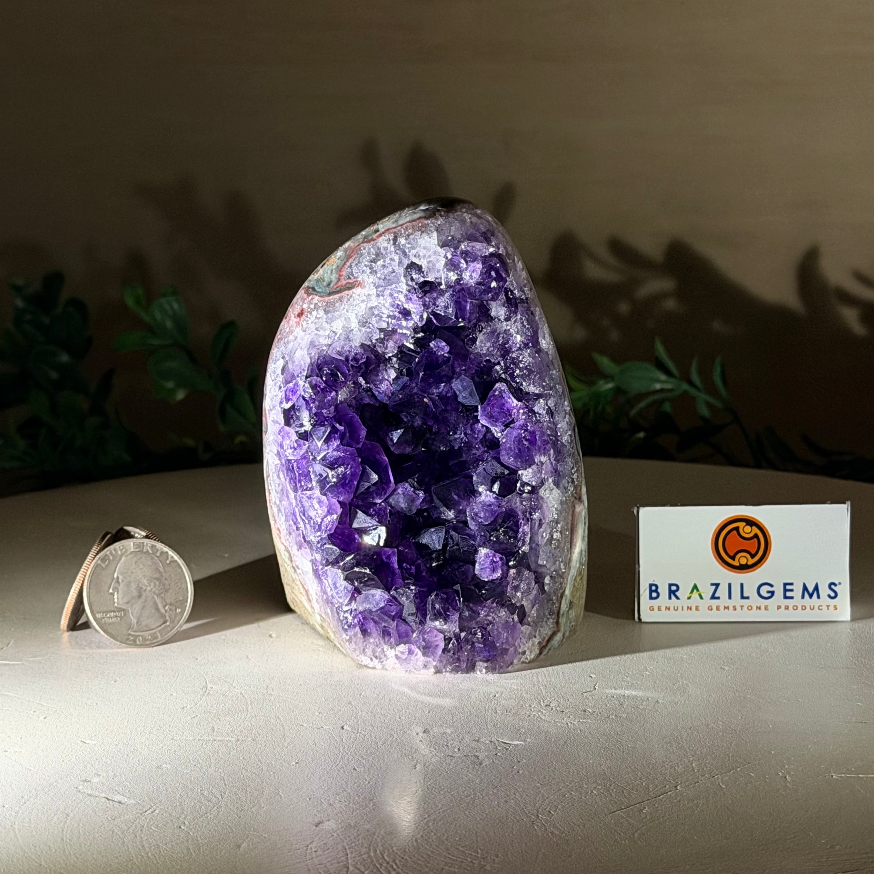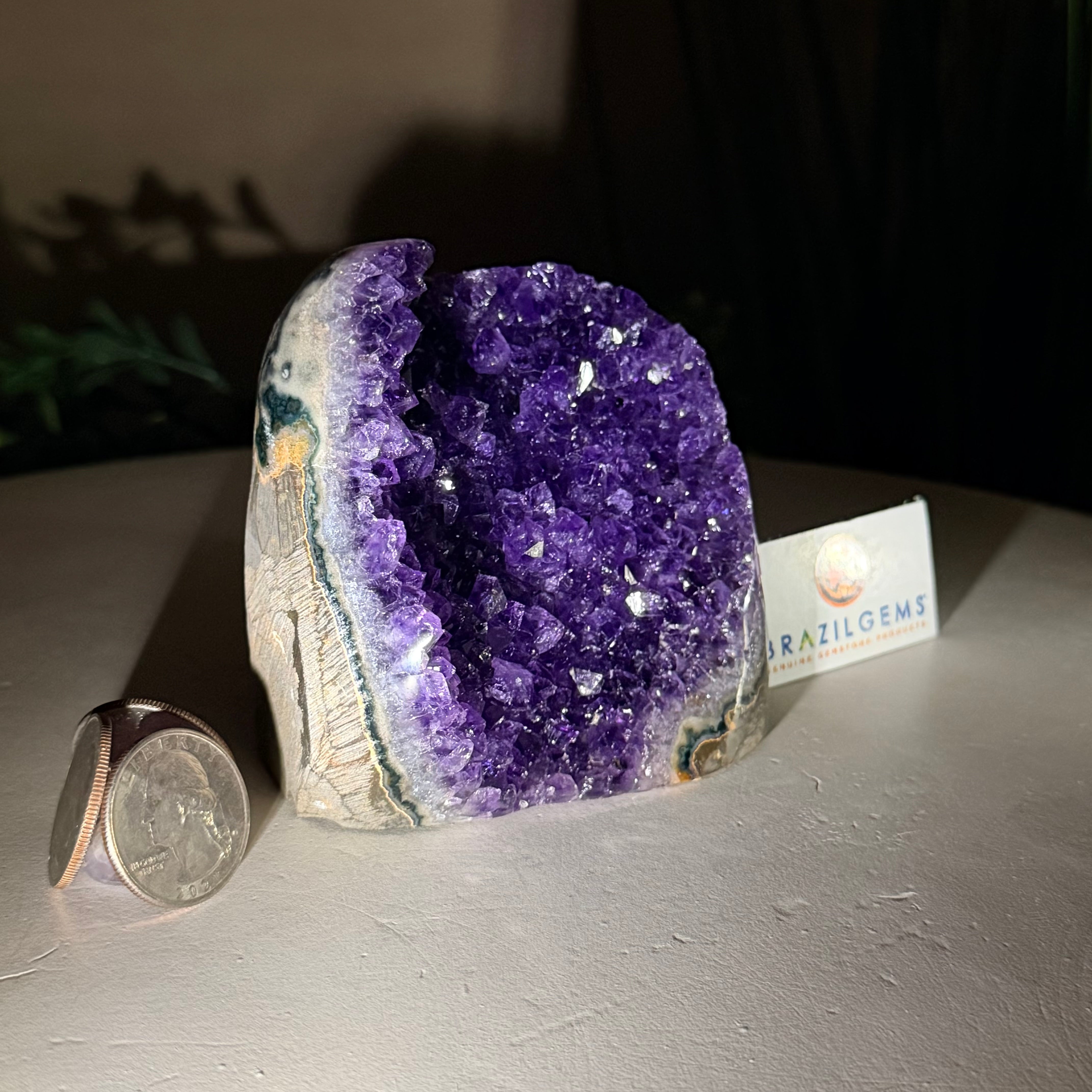 These clusters grow inside geodes–where mineral-rich water slowly deposits crystals over time. The result is a captivating arrangement of pointed amethyst crystals that can beautify any space.