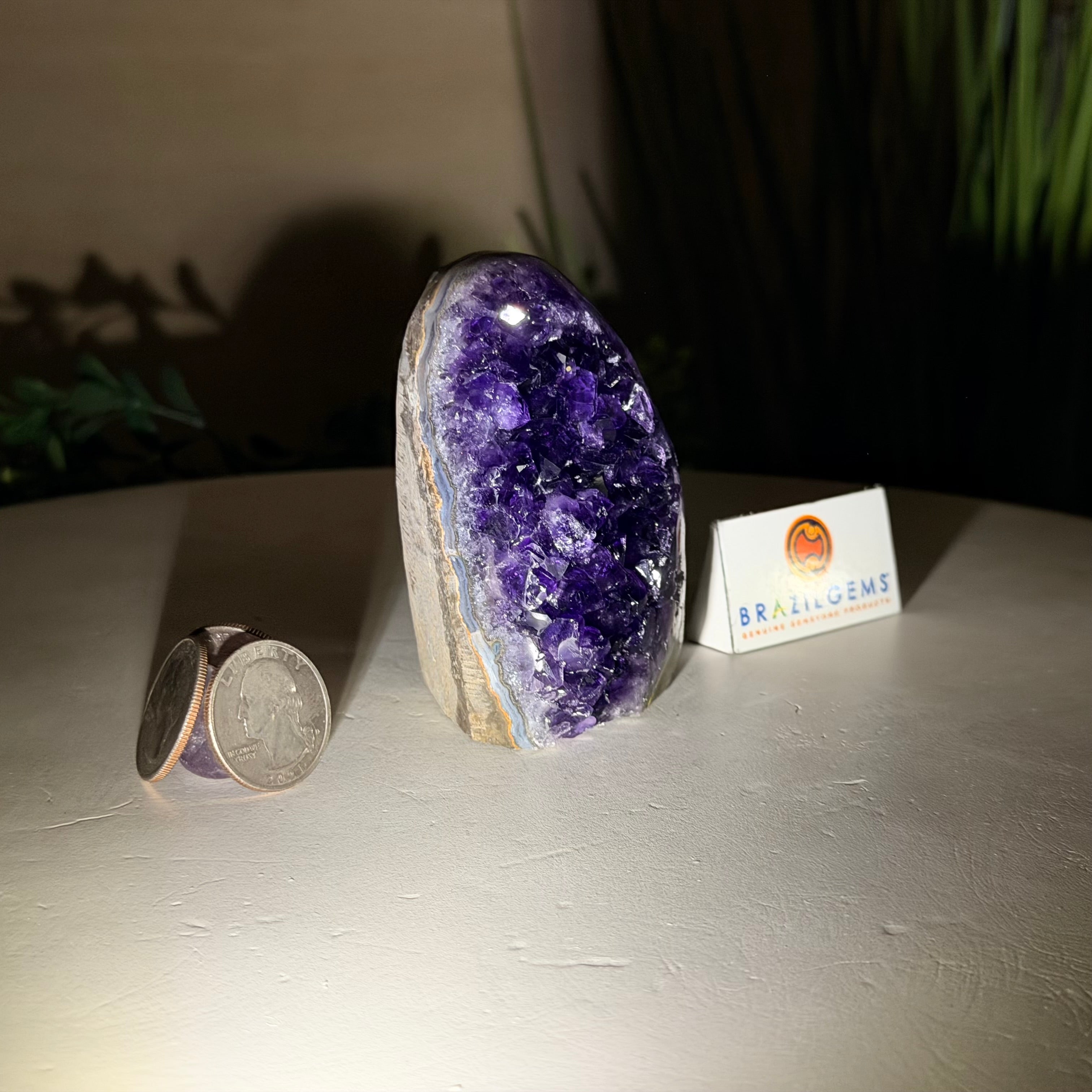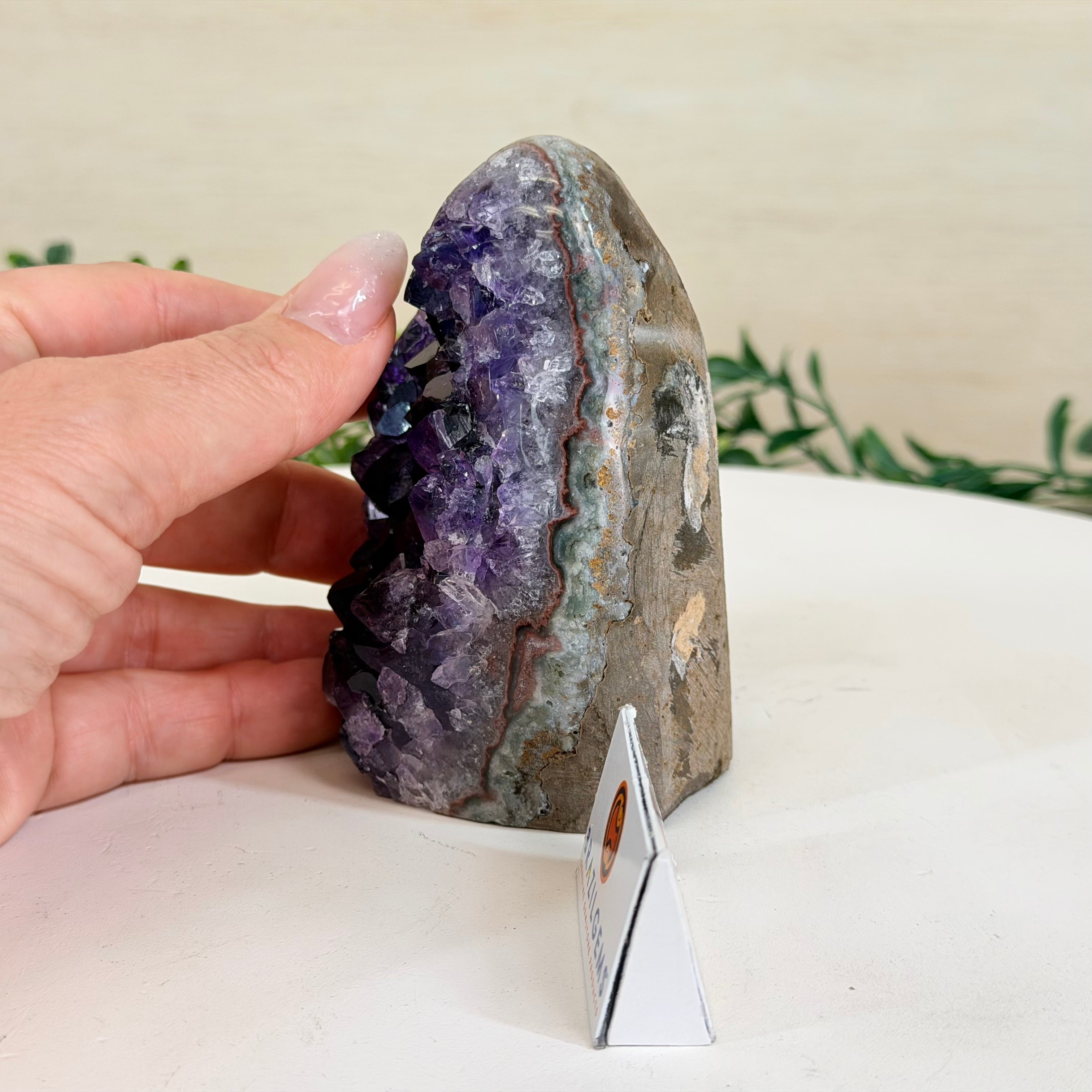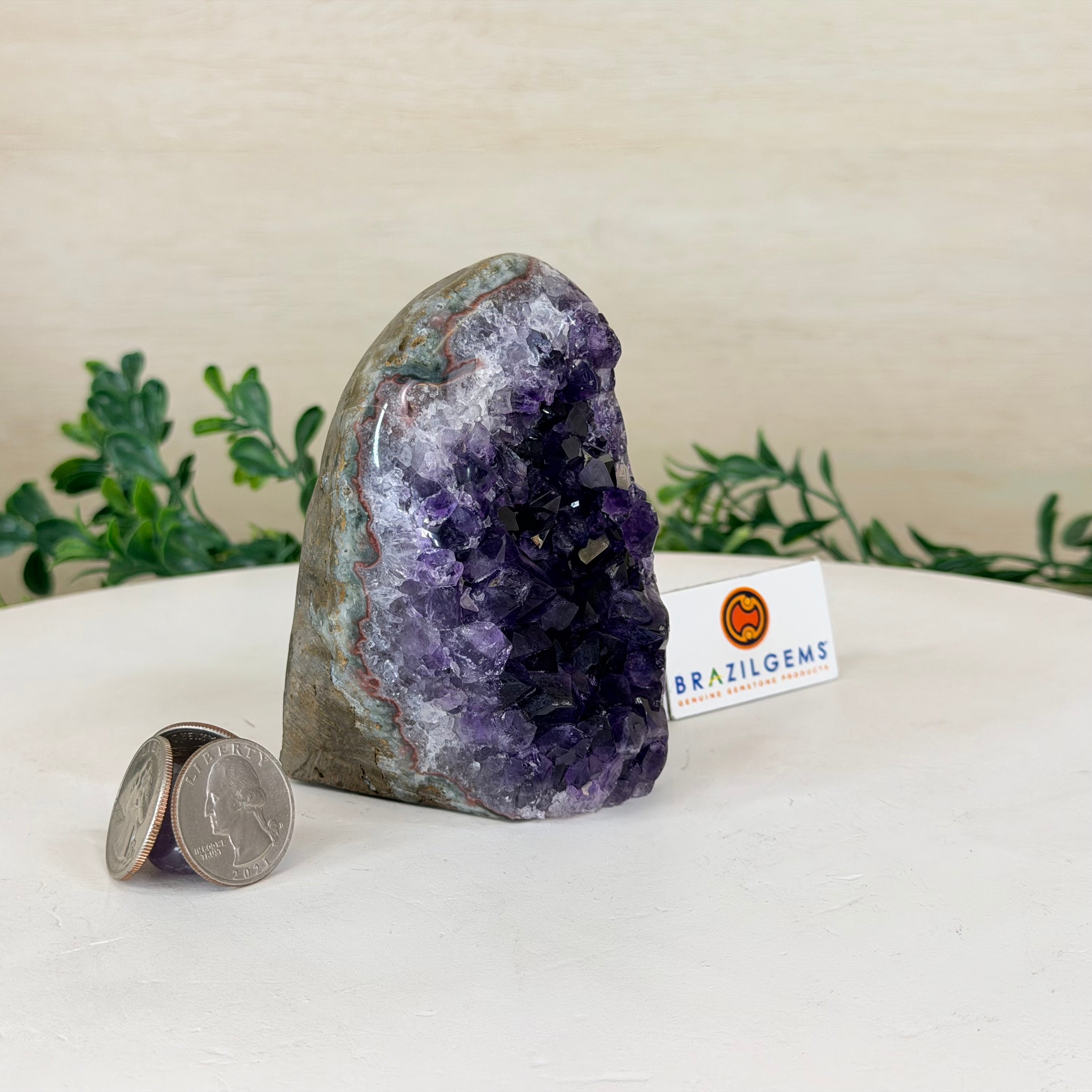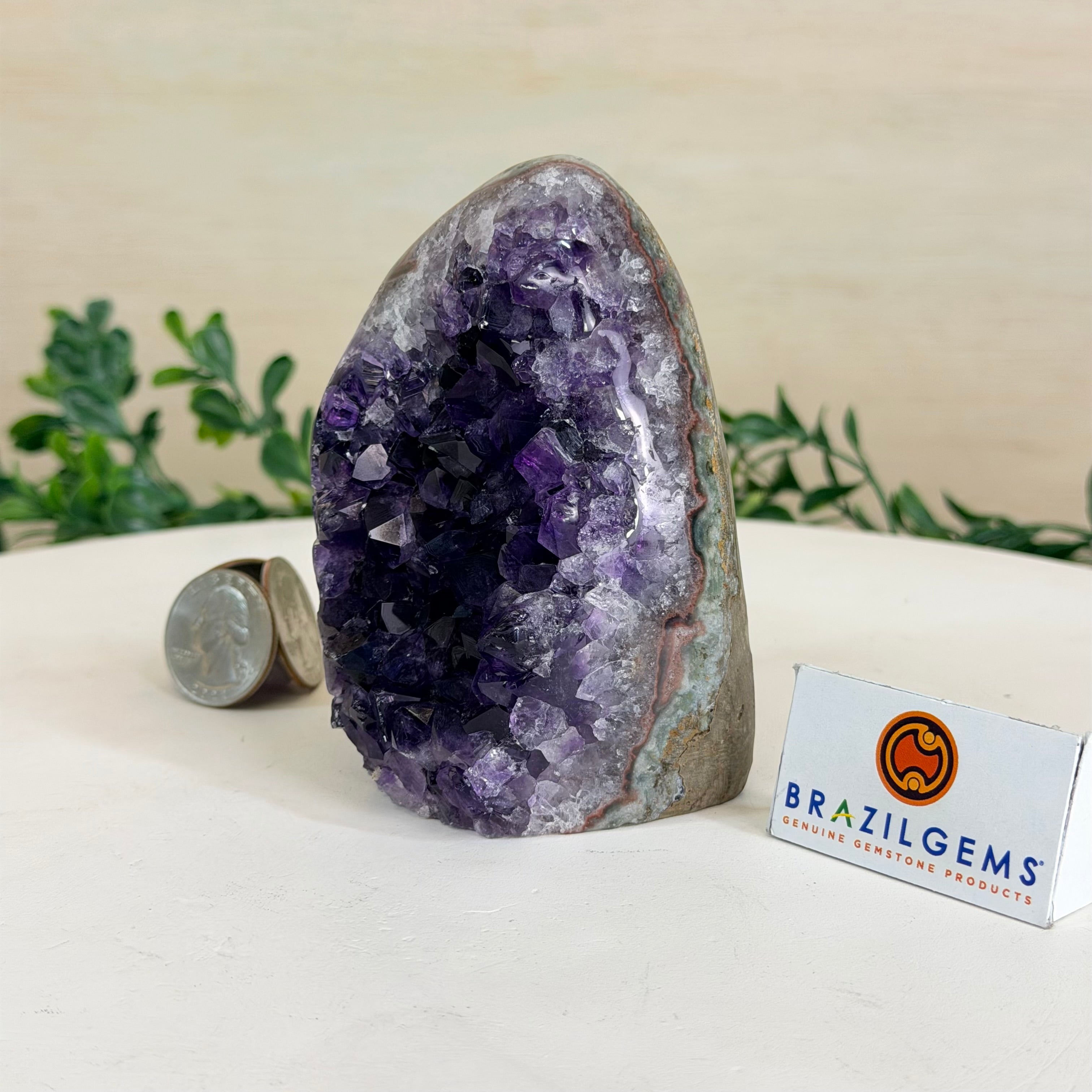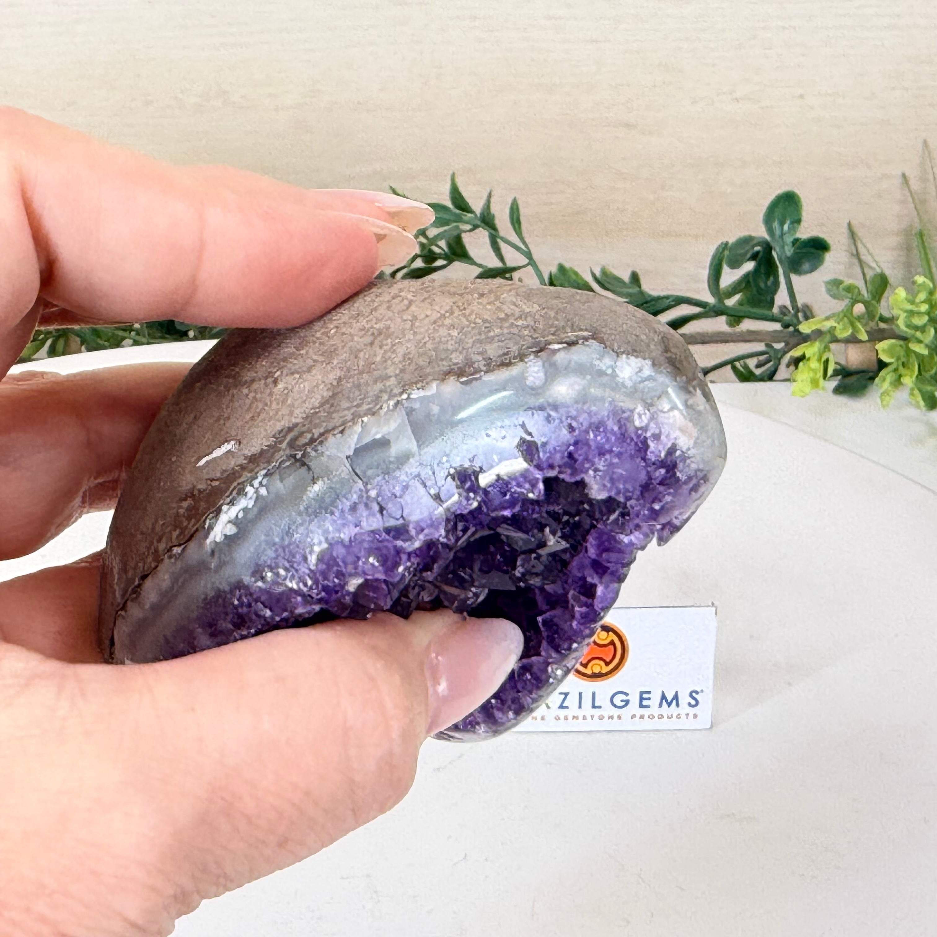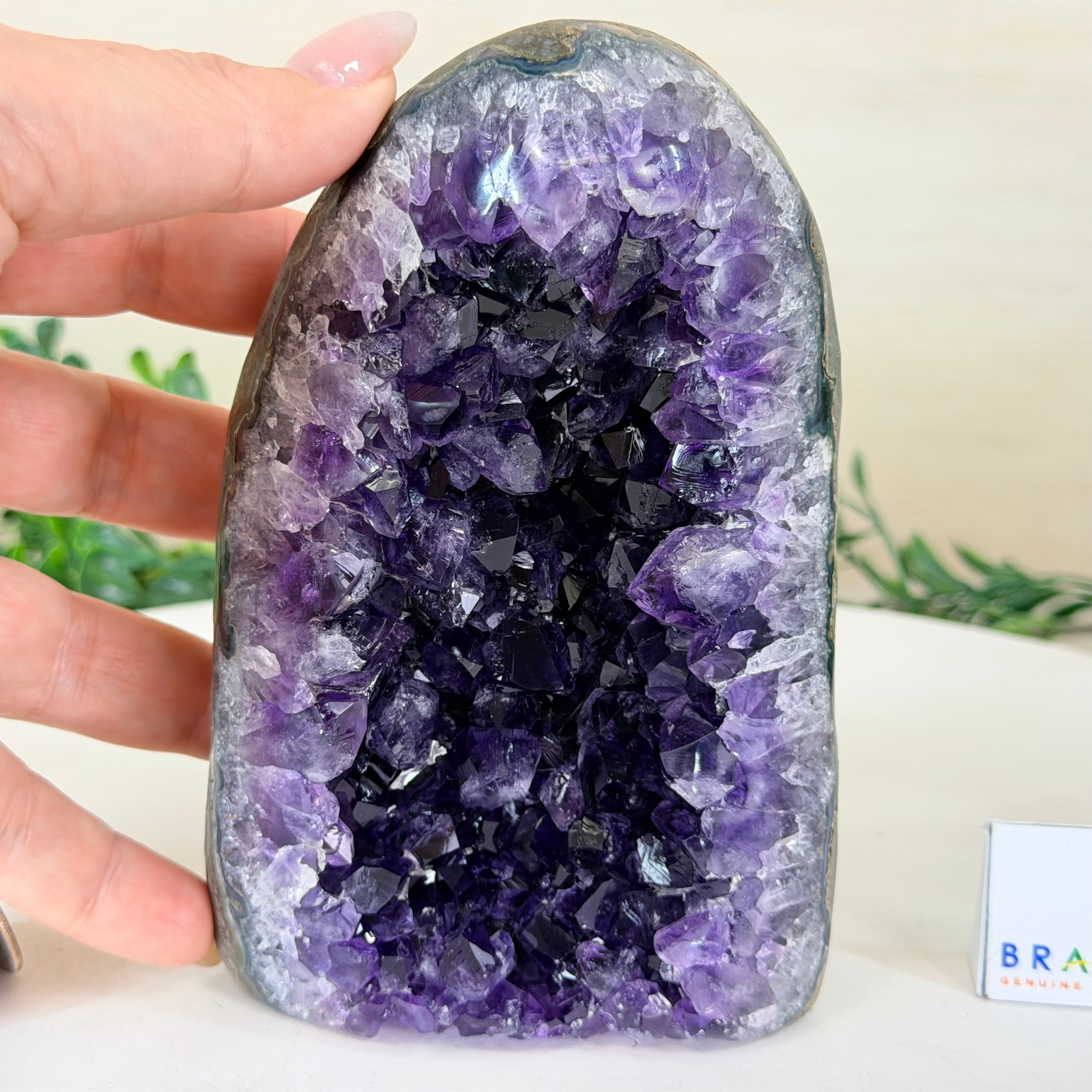 These clusters grow inside geodes–where mineral-rich water slowly deposits crystals over time. The result is a captivating arrangement of pointed amethyst crystals that can beautify any space.