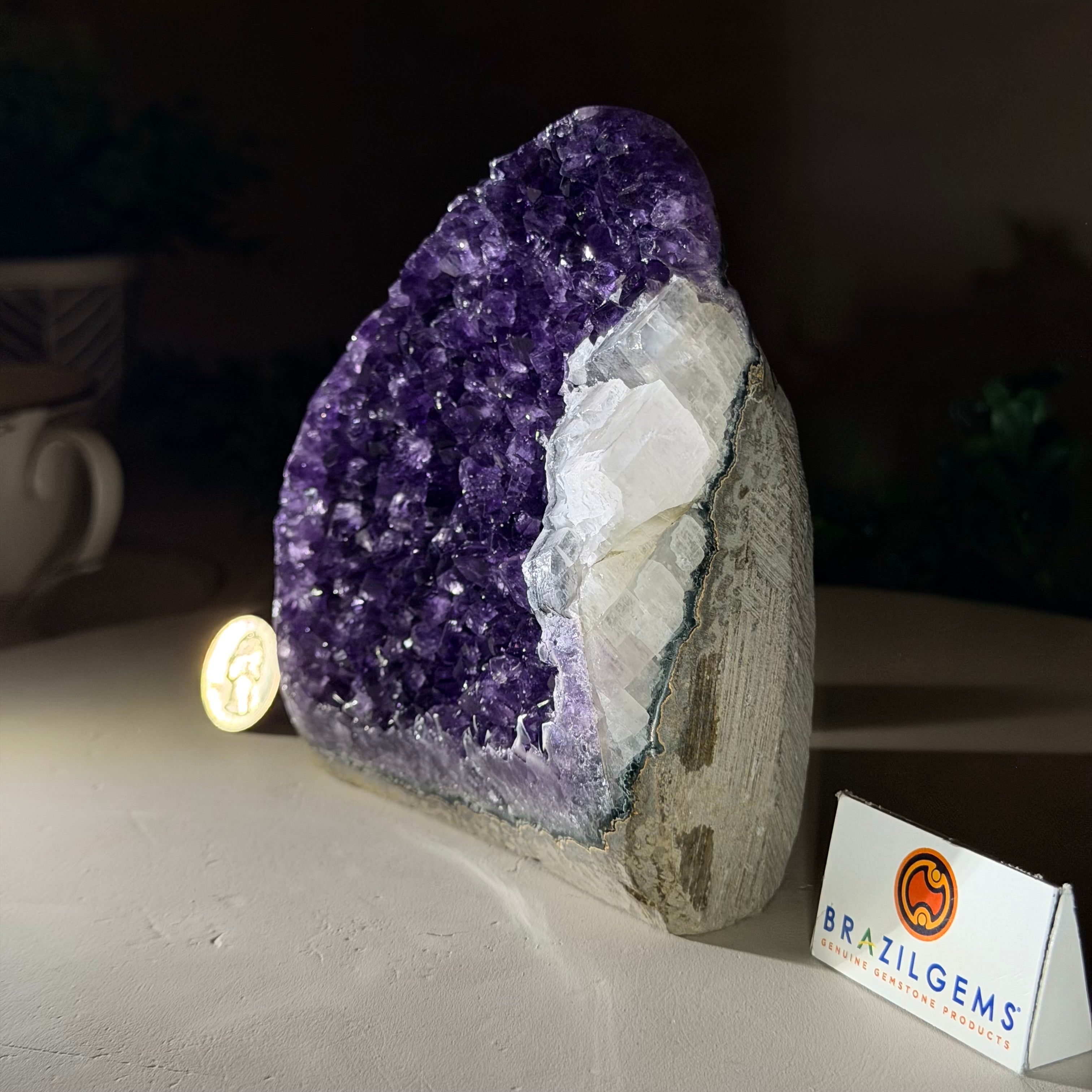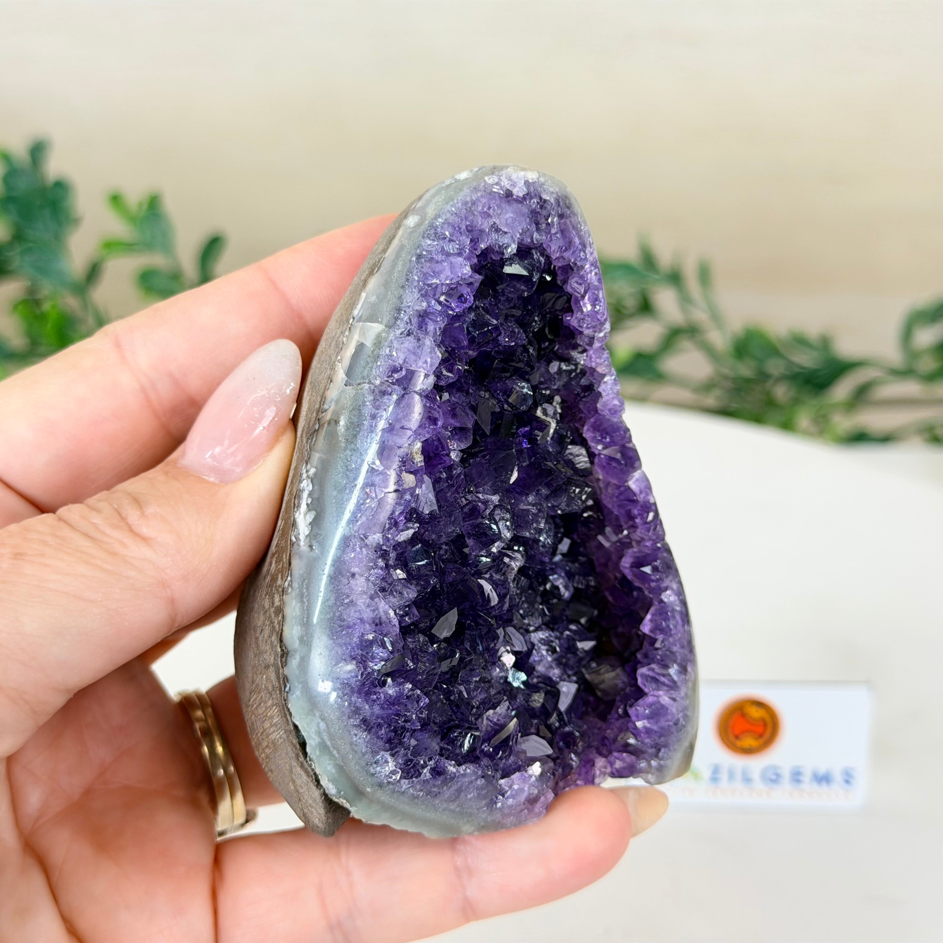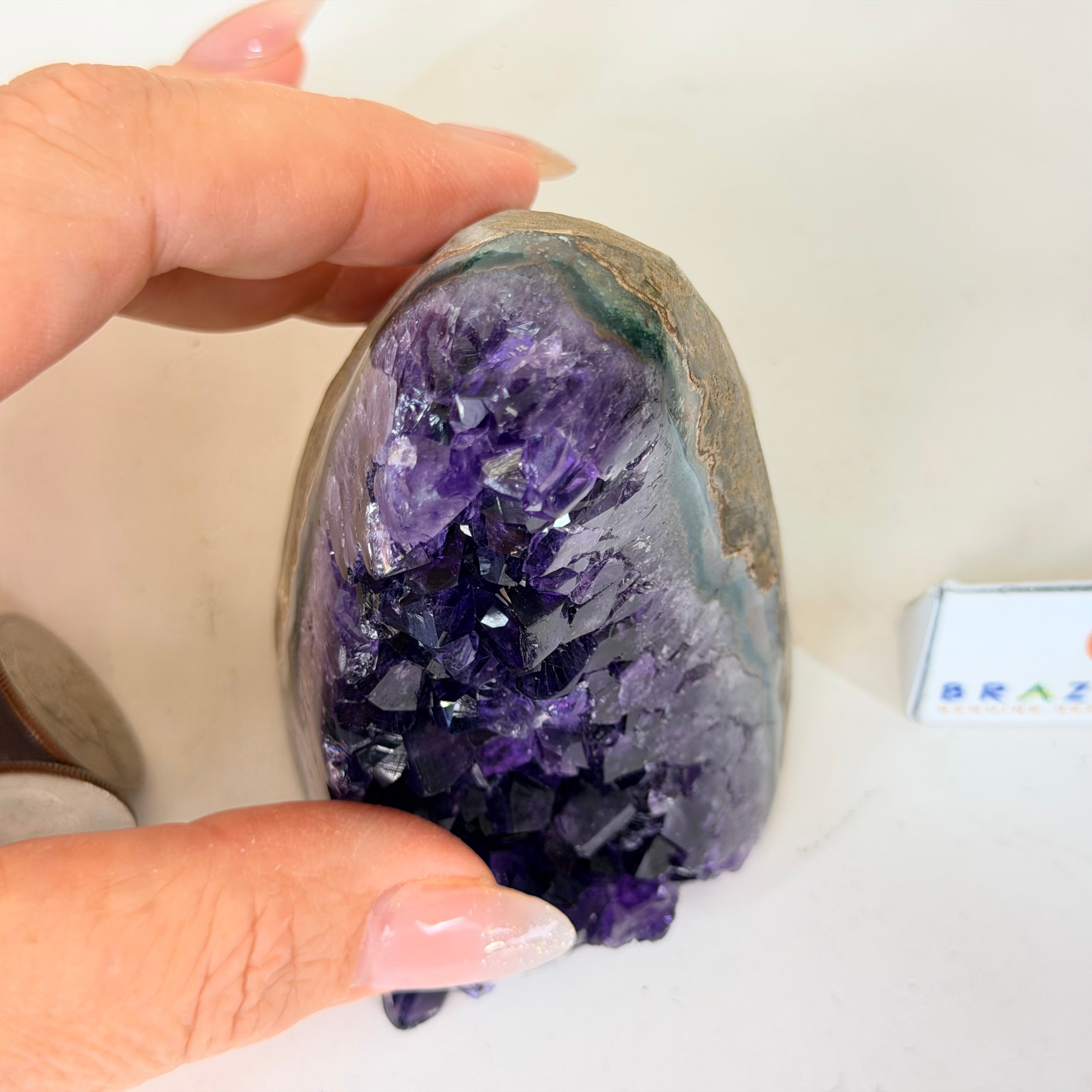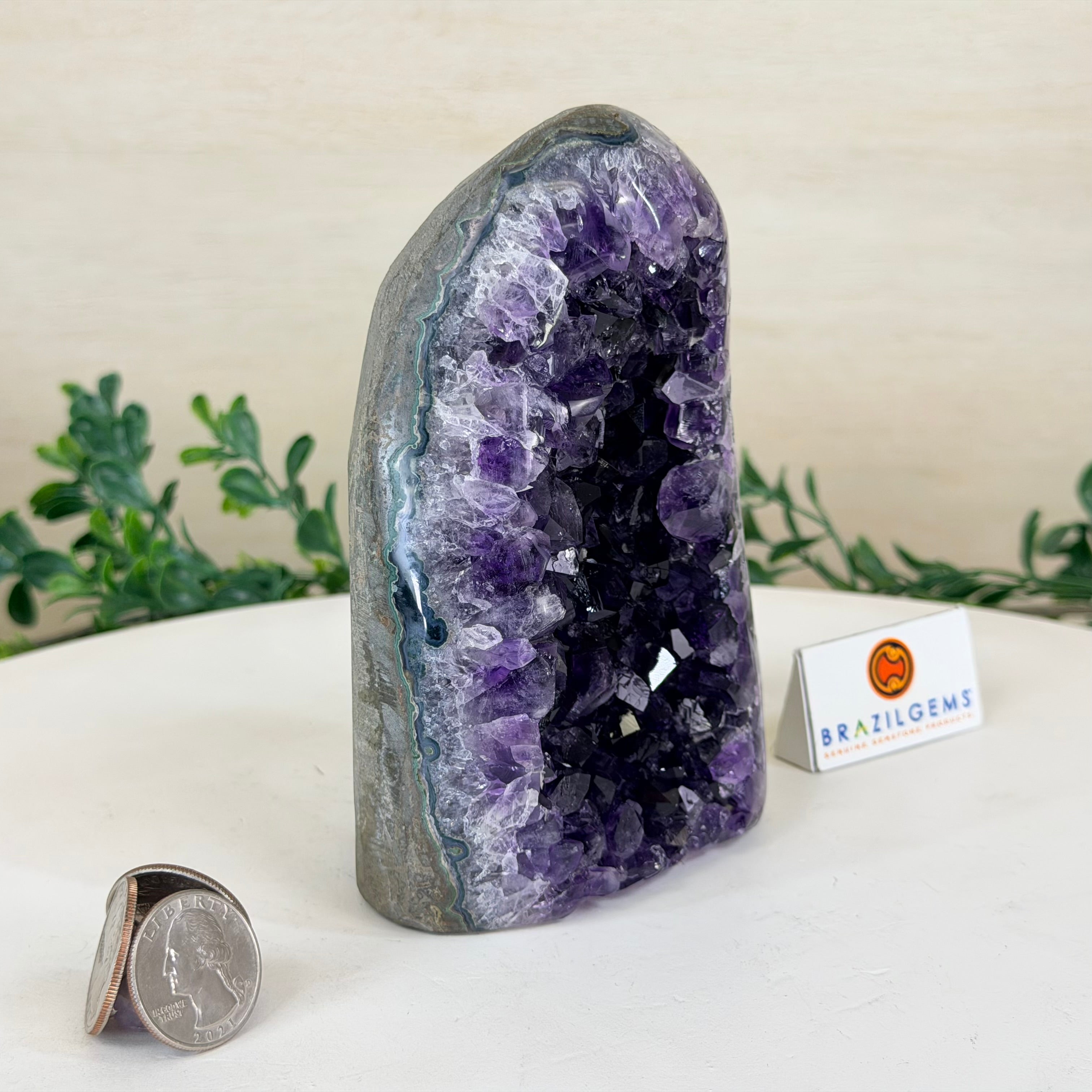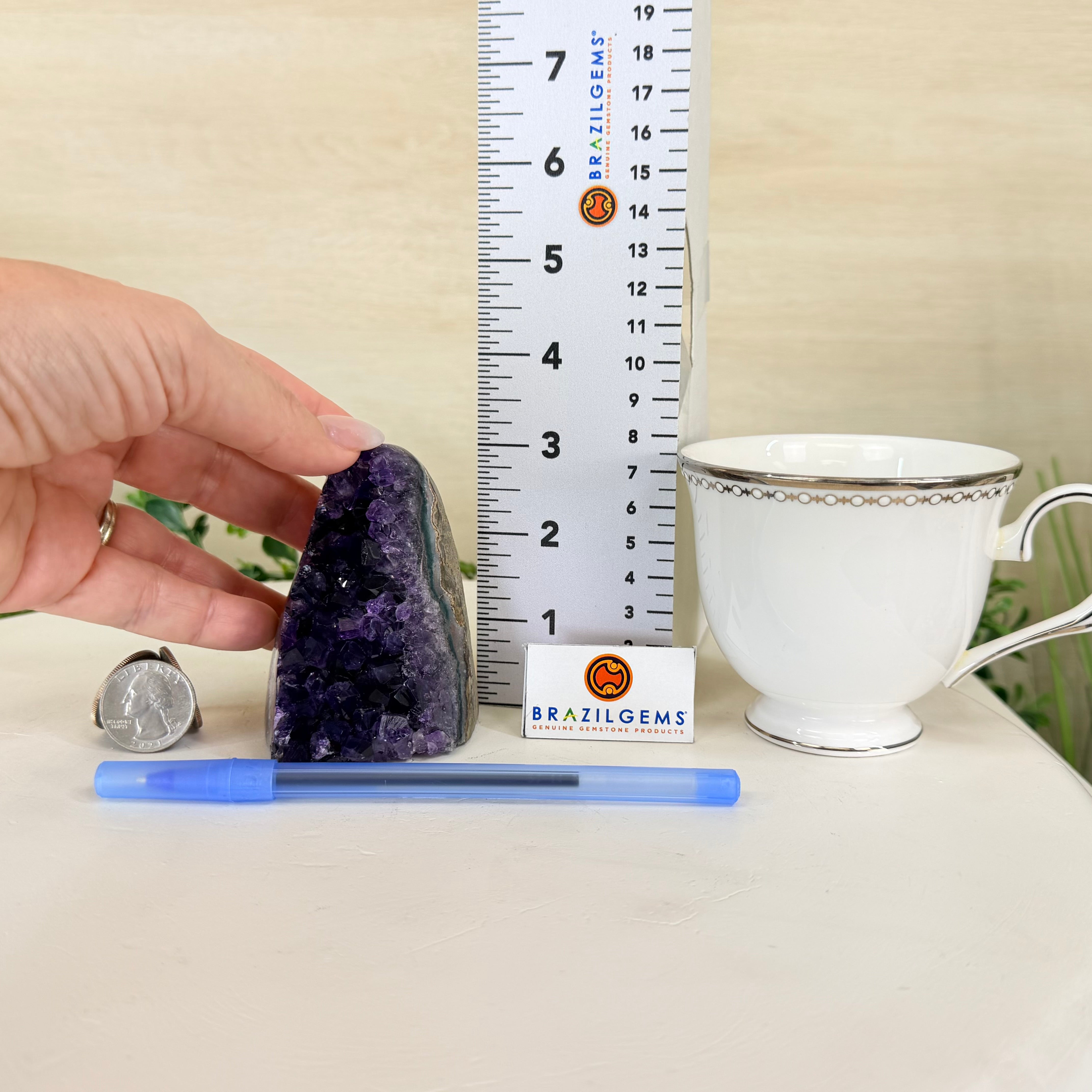 These clusters grow inside geodes–where mineral-rich water slowly deposits crystals over time. The result is a captivating arrangement of pointed amethyst crystals that can beautify any space.
