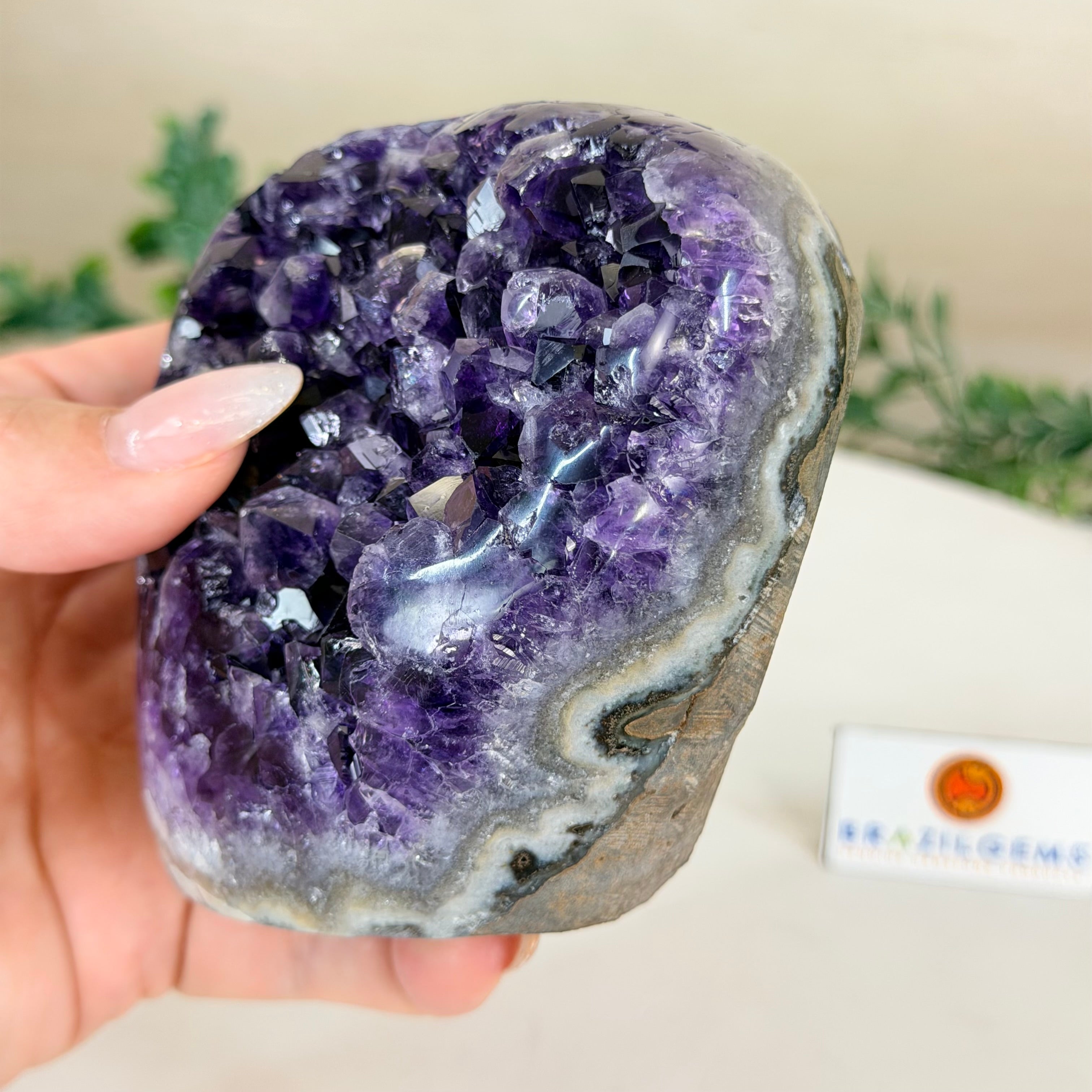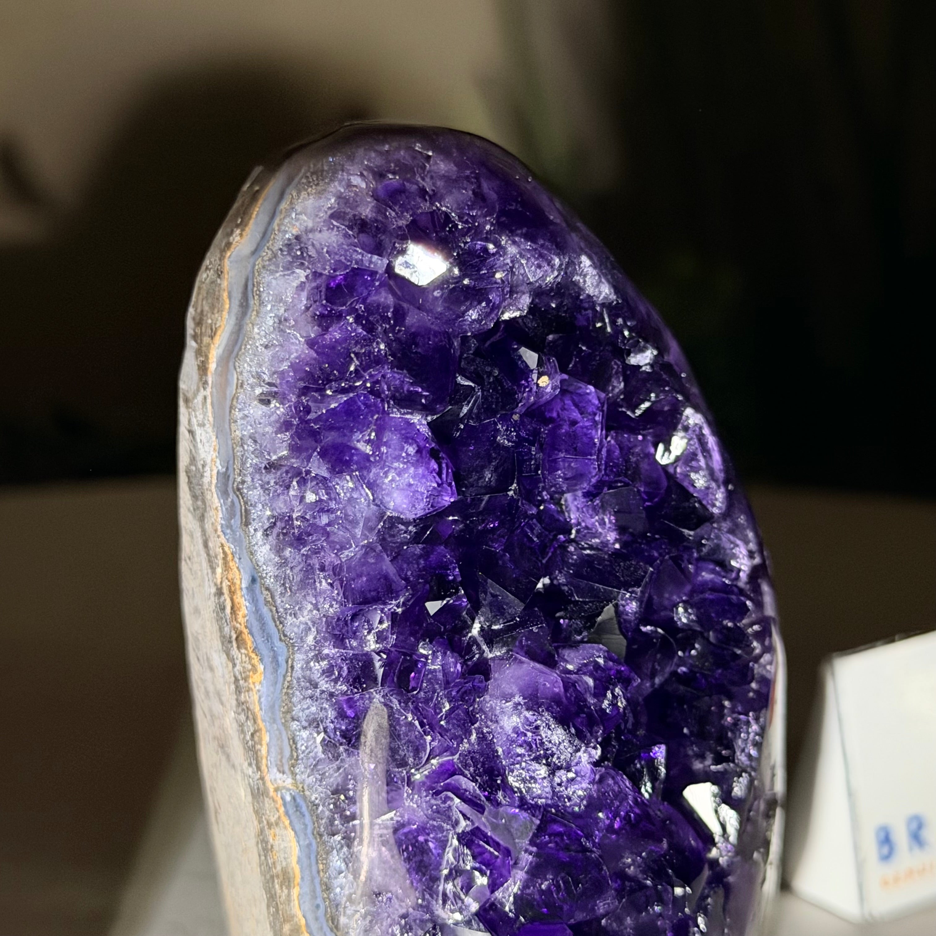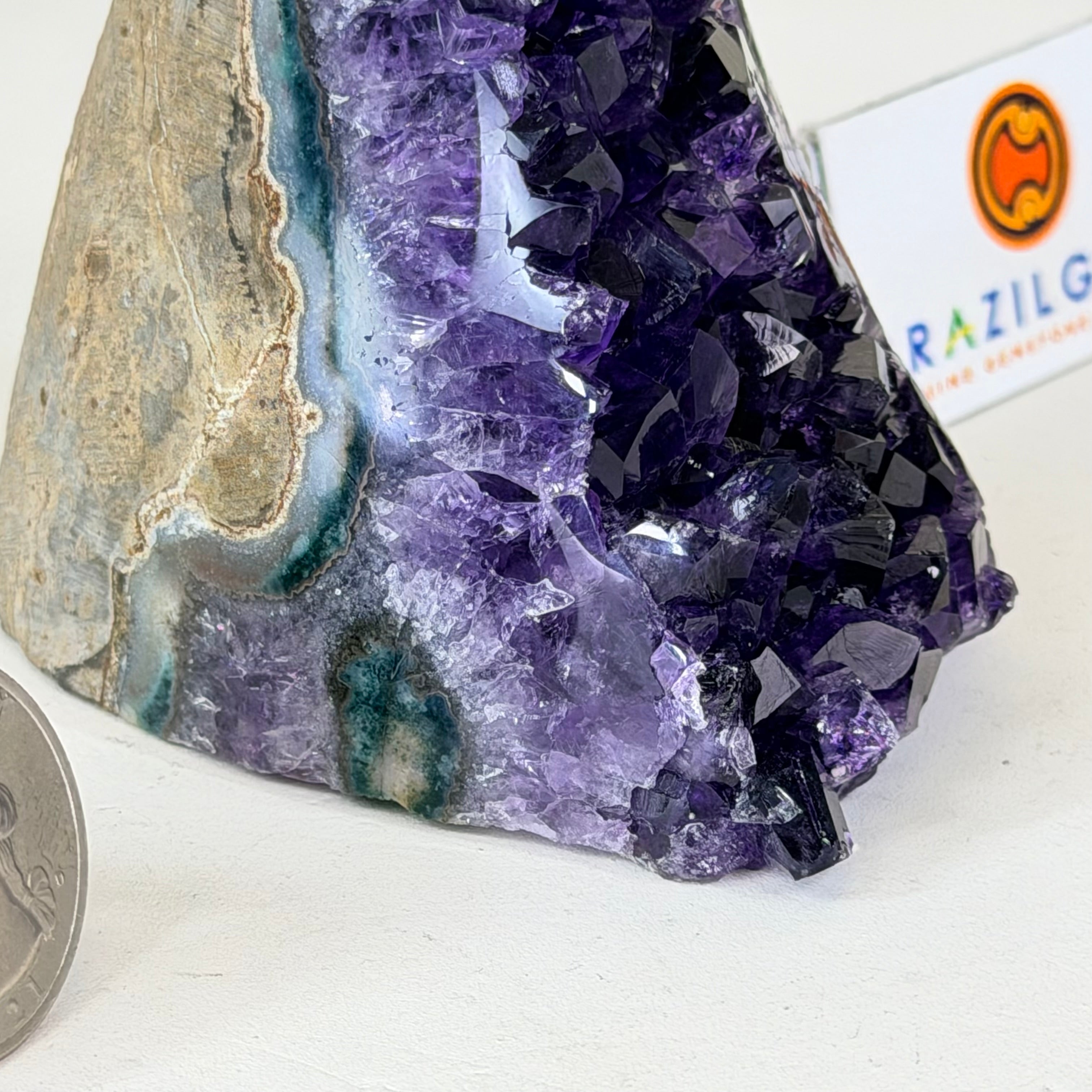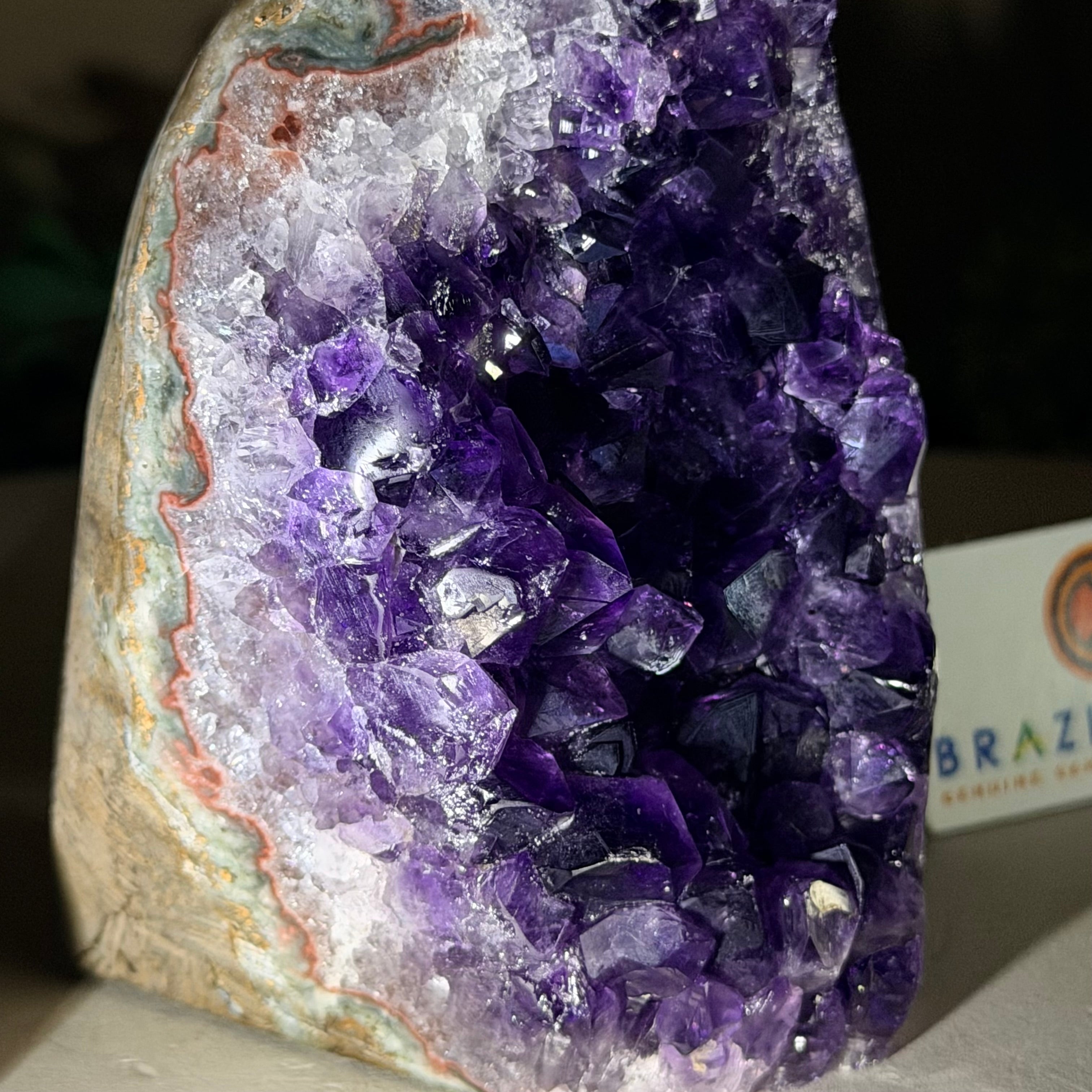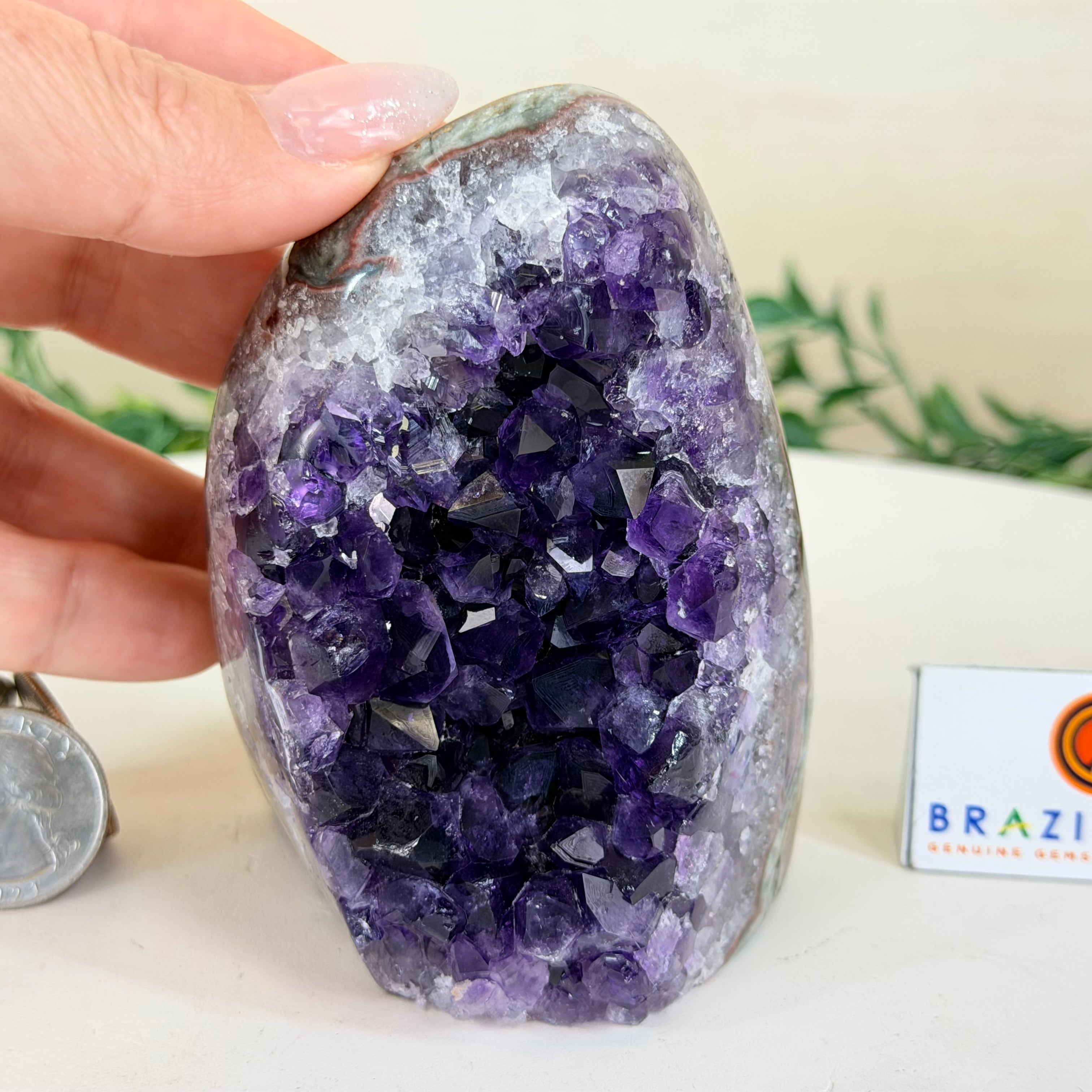 These clusters grow inside geodes–where mineral-rich water slowly deposits crystals over time. The result is a captivating arrangement of pointed amethyst crystals that can beautify any space.