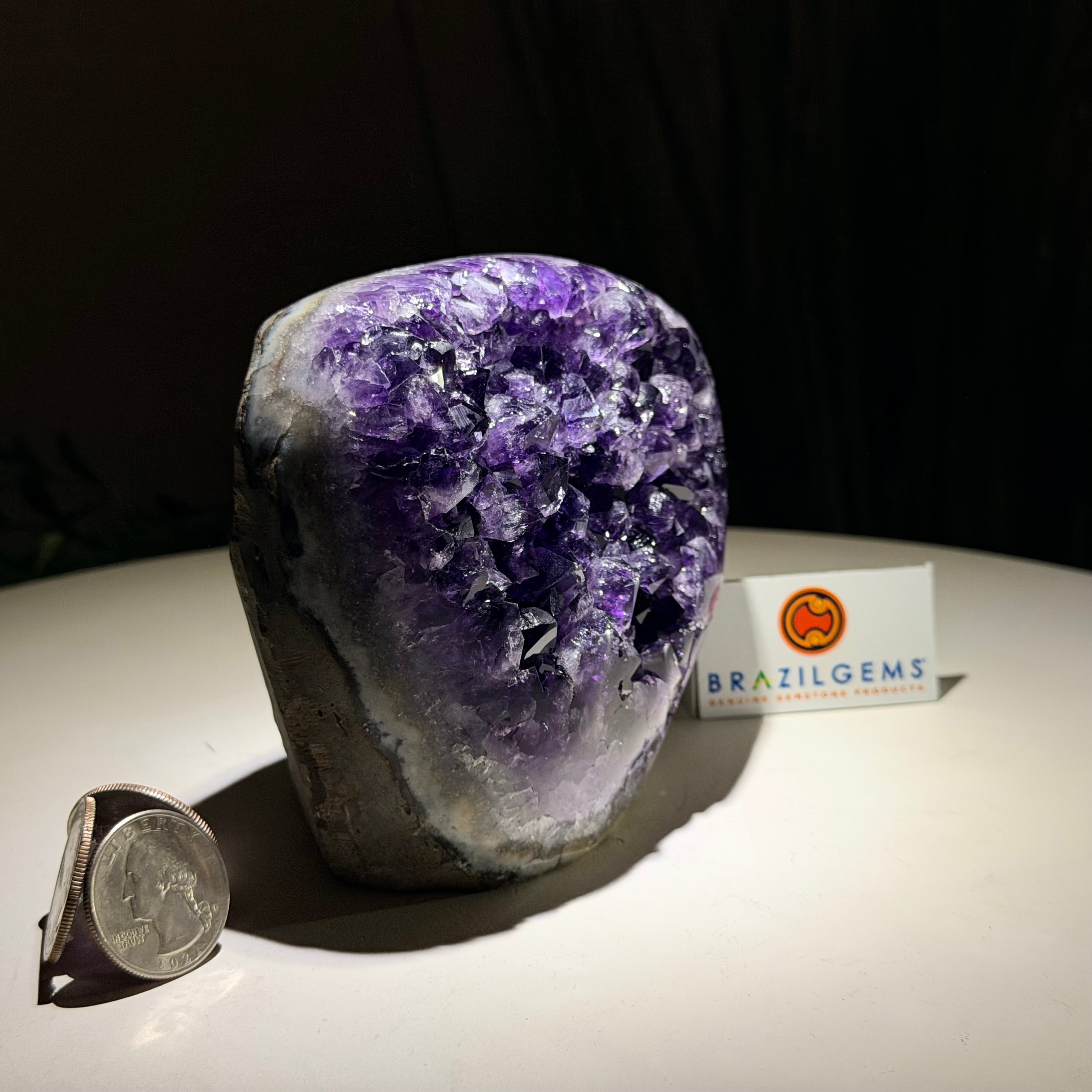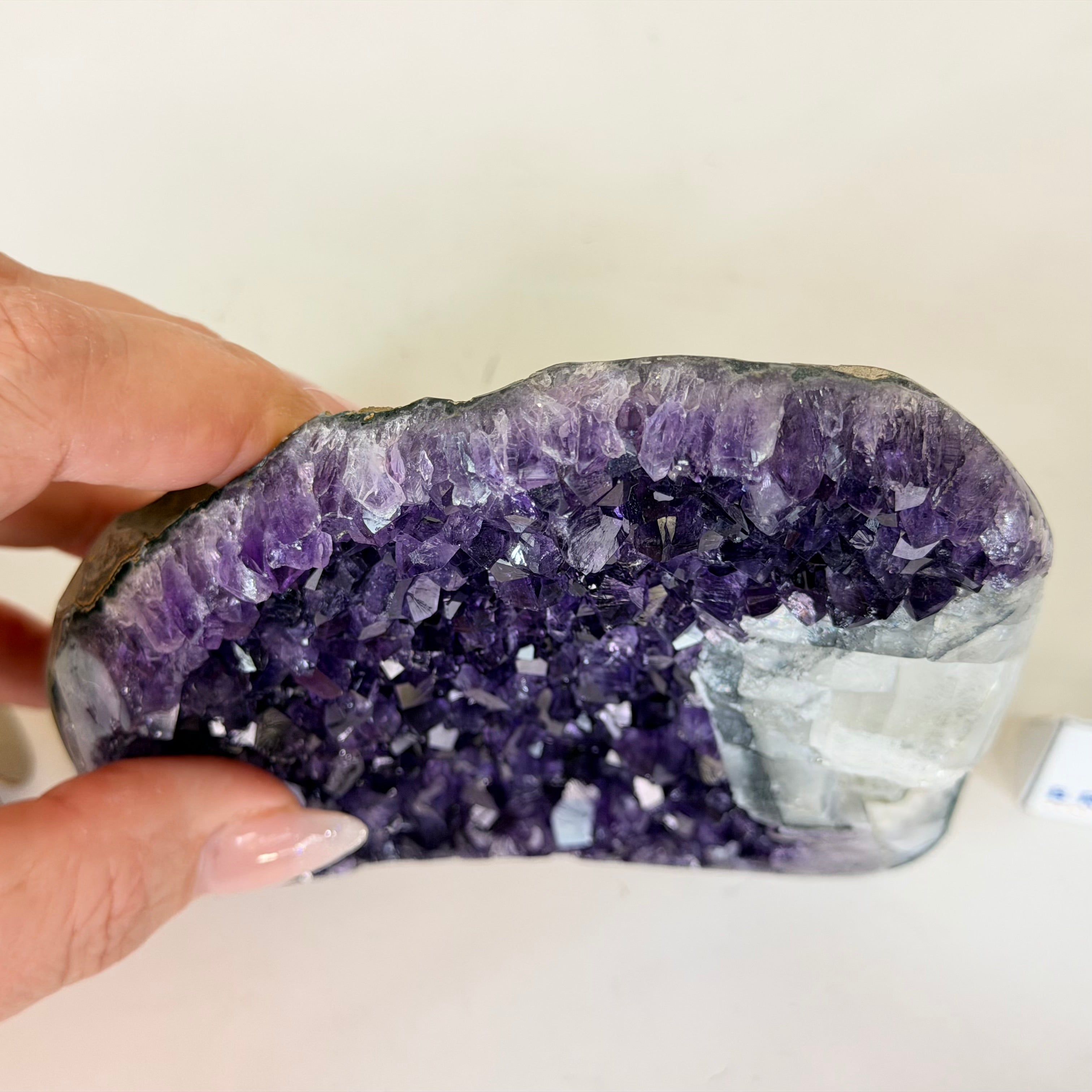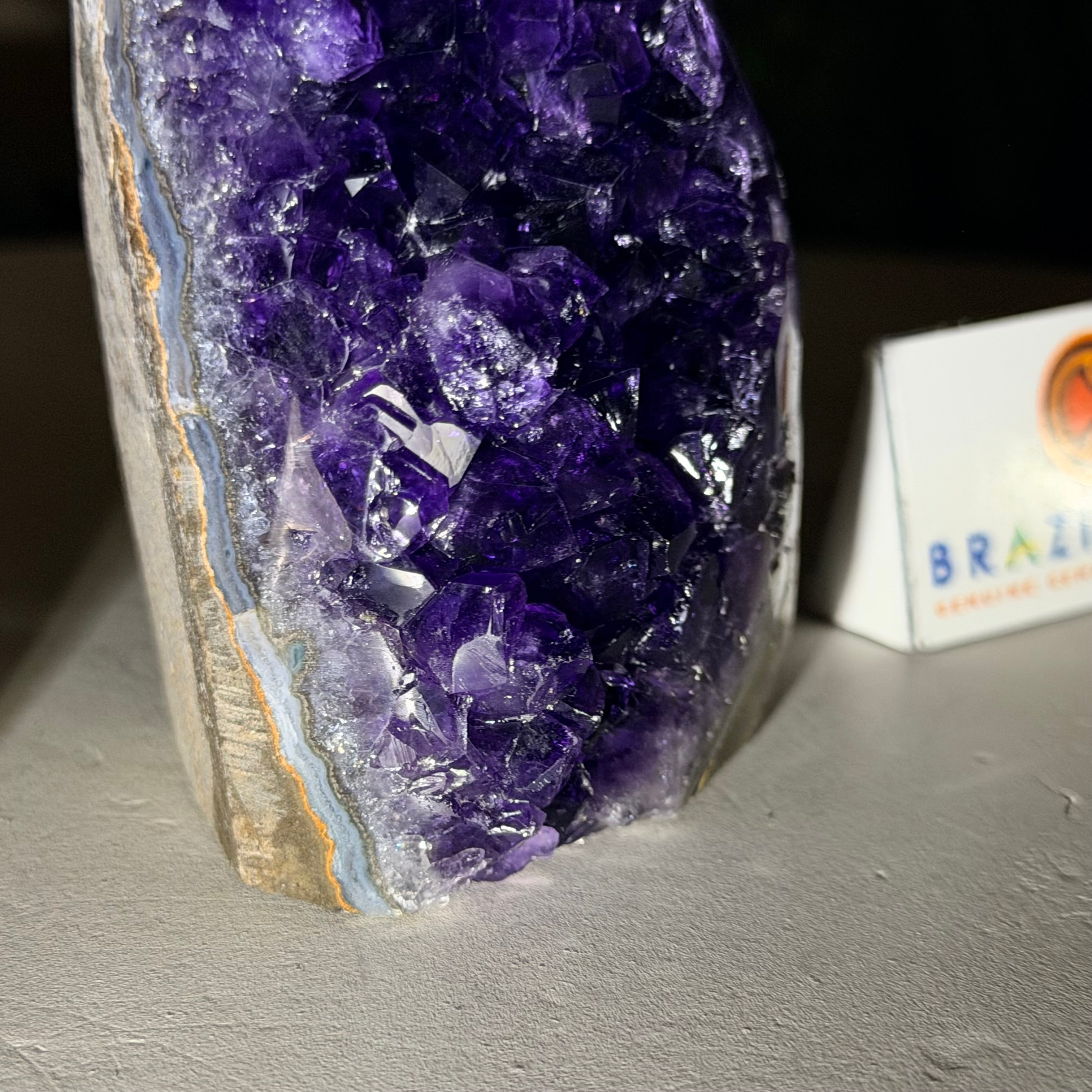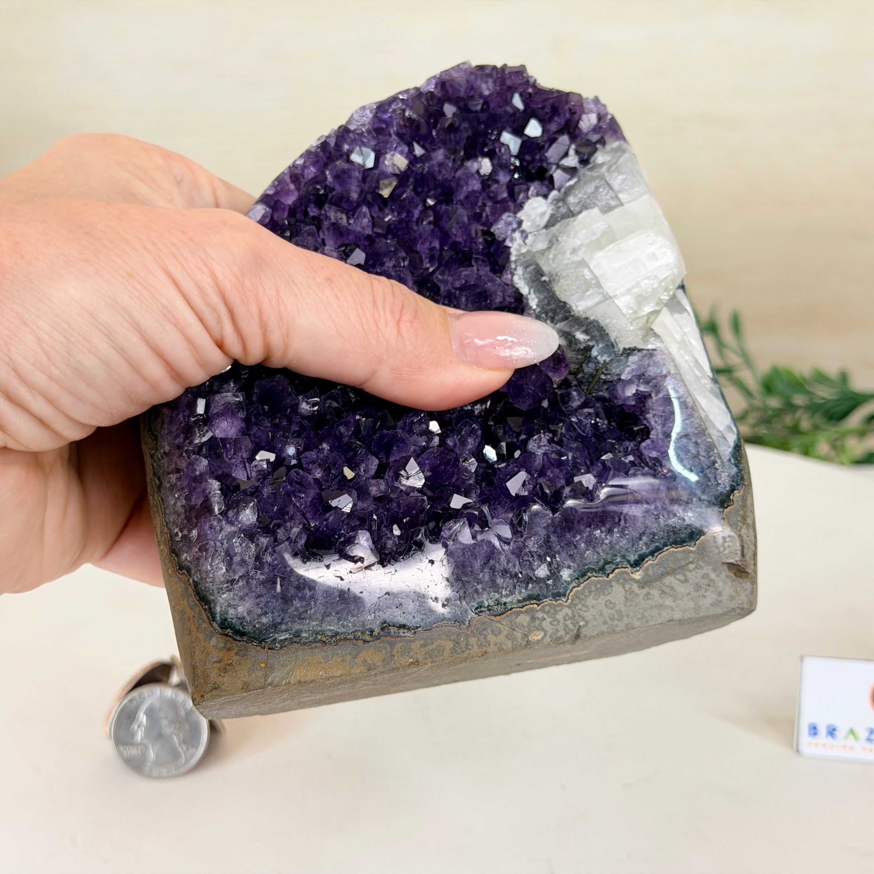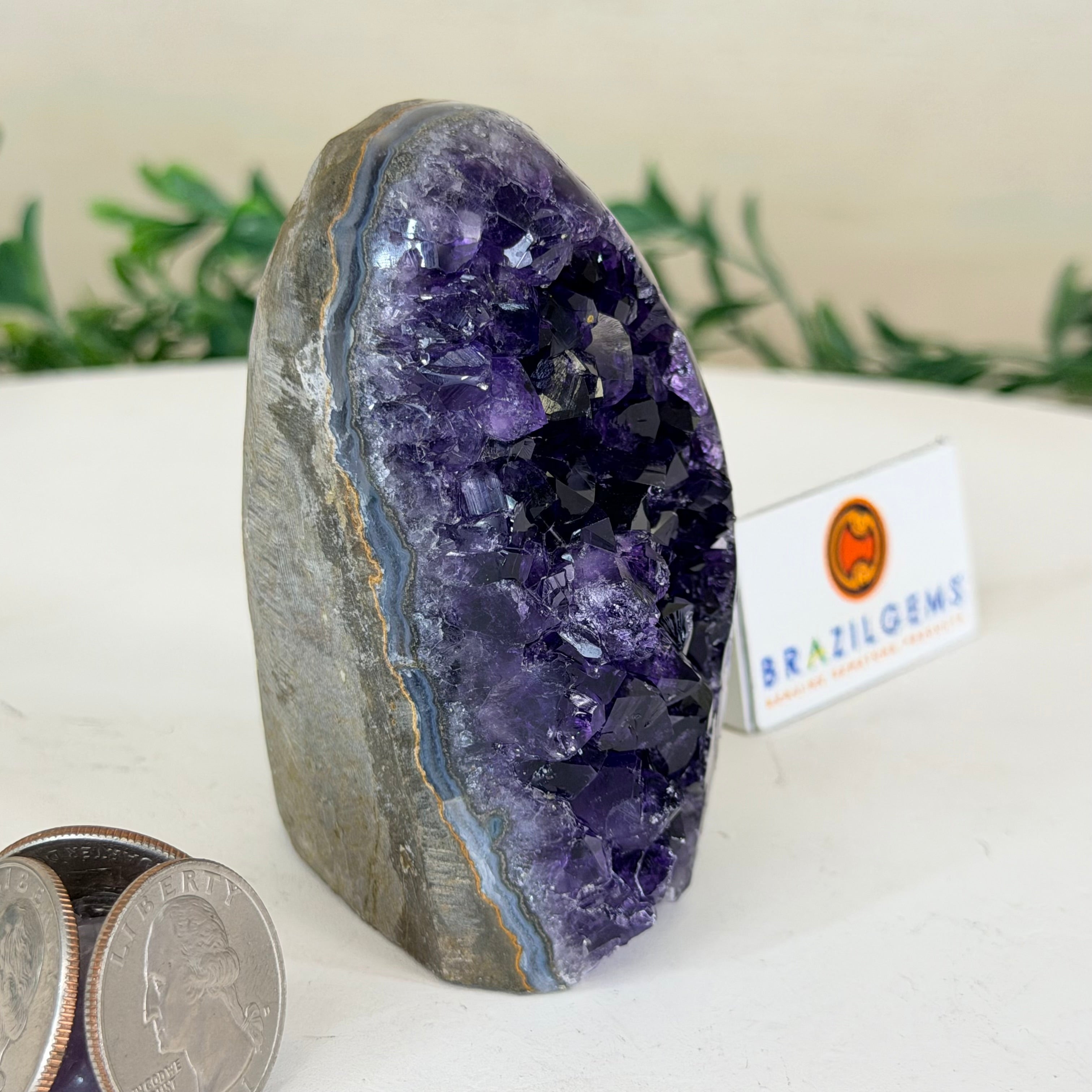 These clusters grow inside geodes–where mineral-rich water slowly deposits crystals over time. The result is a captivating arrangement of pointed amethyst crystals that can beautify any space.
