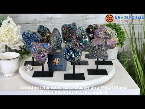 Disclaimer: The model/image you select is the exact gemstone you will receive. These are natural gemstone crystals sold by Brazil Gems® as is and as you see them in their images. They may contain natural imperfections as well as imperfections, broken edges, cracks and repairs from the extraction, mounting and aura bonding processes. The bottom of the crystal has a drilled hole so it can mount onto the metal stand which has been painted black. The group photos and video are there to serve as an idea of how these items are relative to each other. Those specific items may or may not still be available for sale since each one is unique. The rainbow aura effect is achieved through a process called vacuum deposition where vaporized metals such as titanium and/or niobium are bonded to the natural crystal in a vacuum chamber, giving it that iridescent metallic sheen. At Brazil Gems® we make every effort to get measurements as exact as possible but they are done by human hands & eyes and therefore may have minor discrepancies.