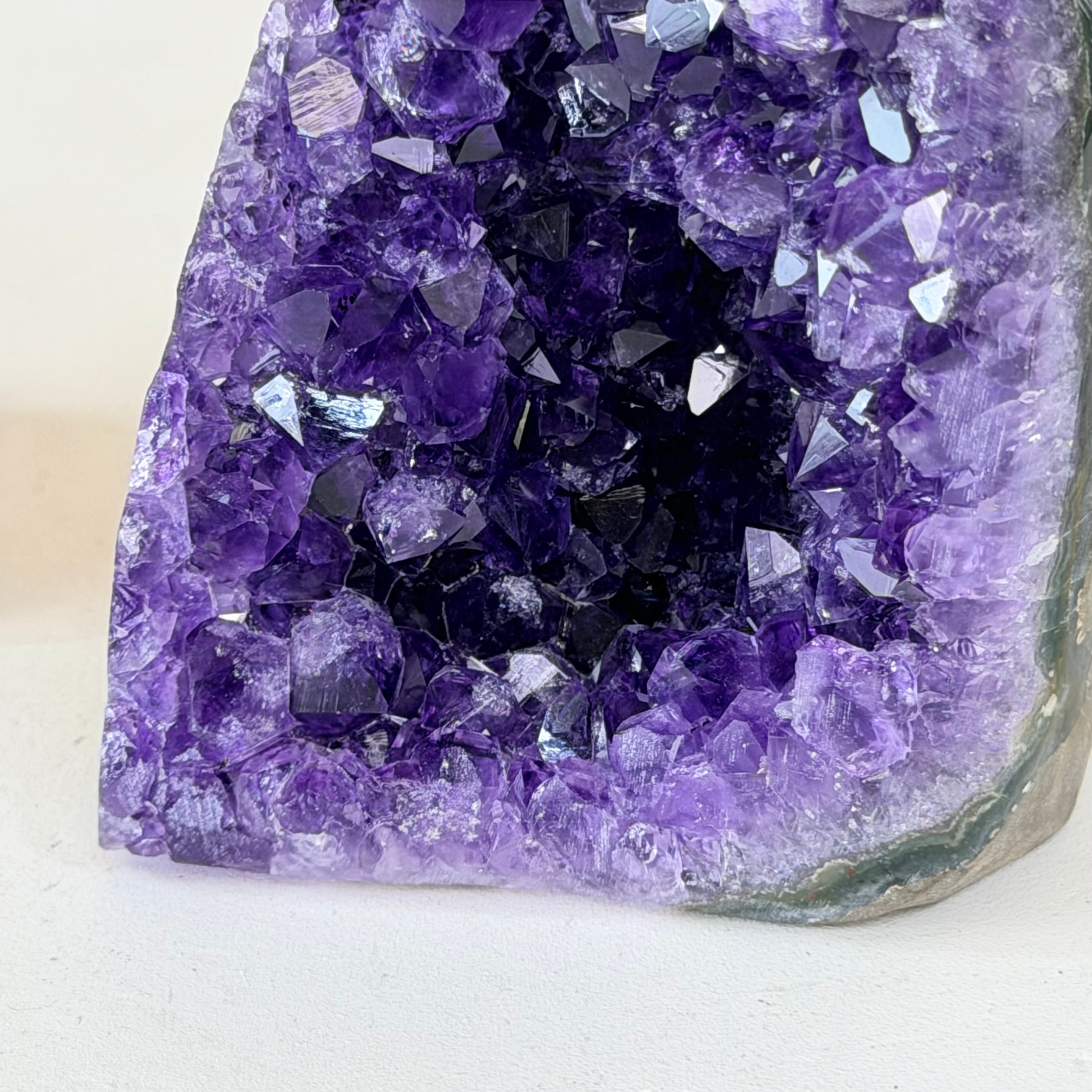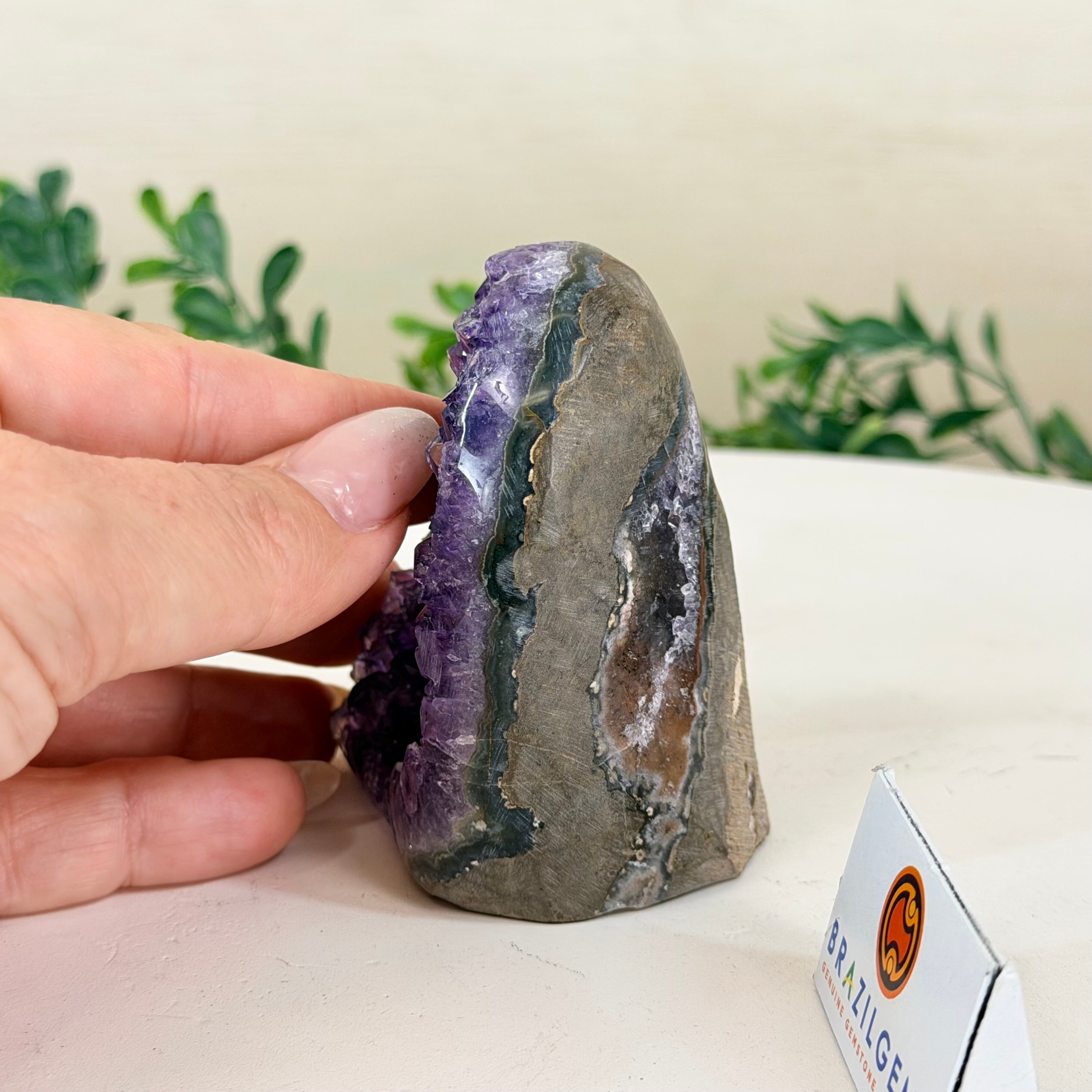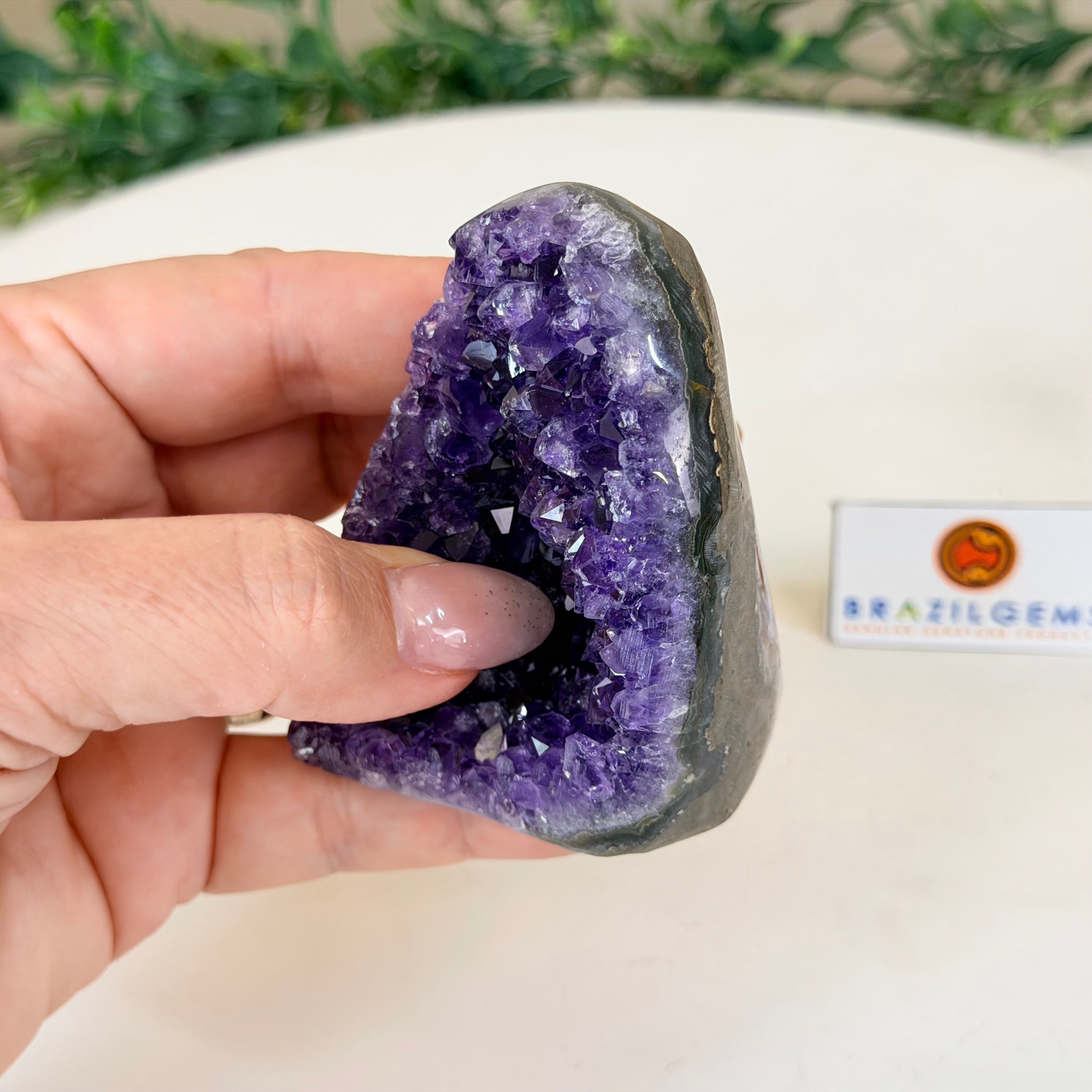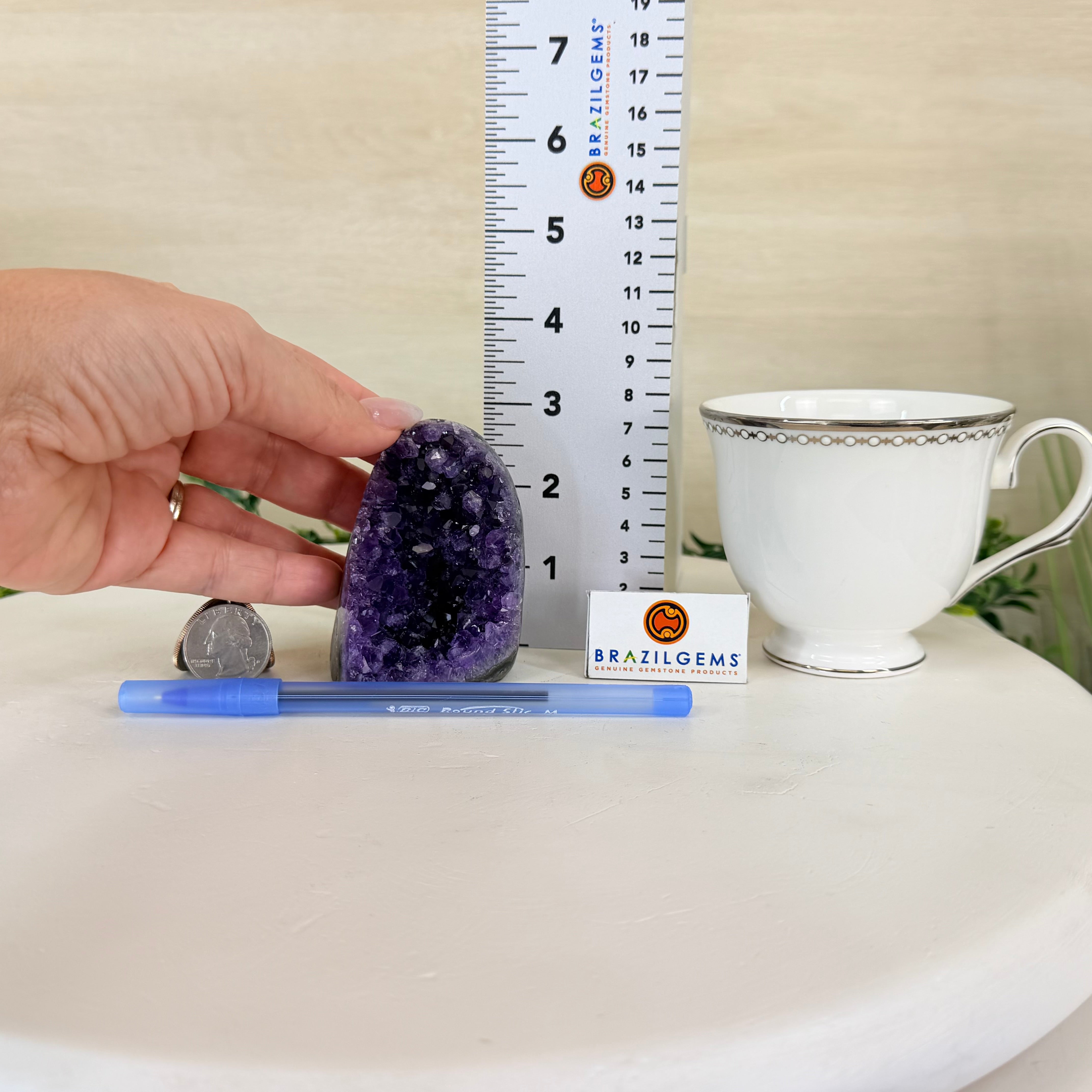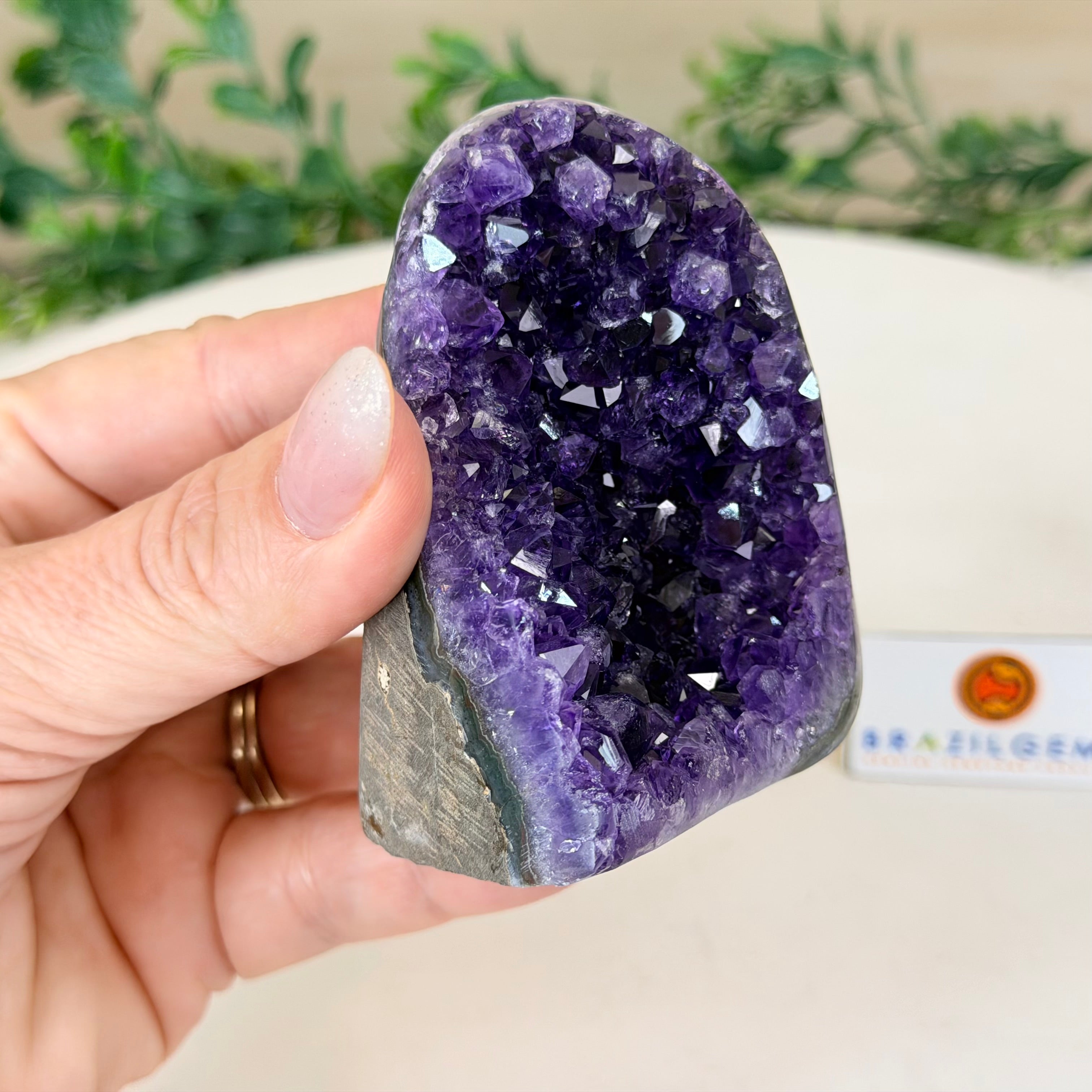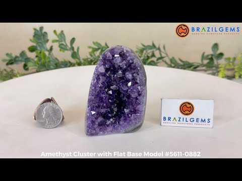 Embrace the natural beauty of this Small Brazilian Extra Plus Quality Amethyst Crystal Cluster with a flat base by Brazil Gems®. This piece has deep purple colors, nicely shaped crystal points and polished edges.