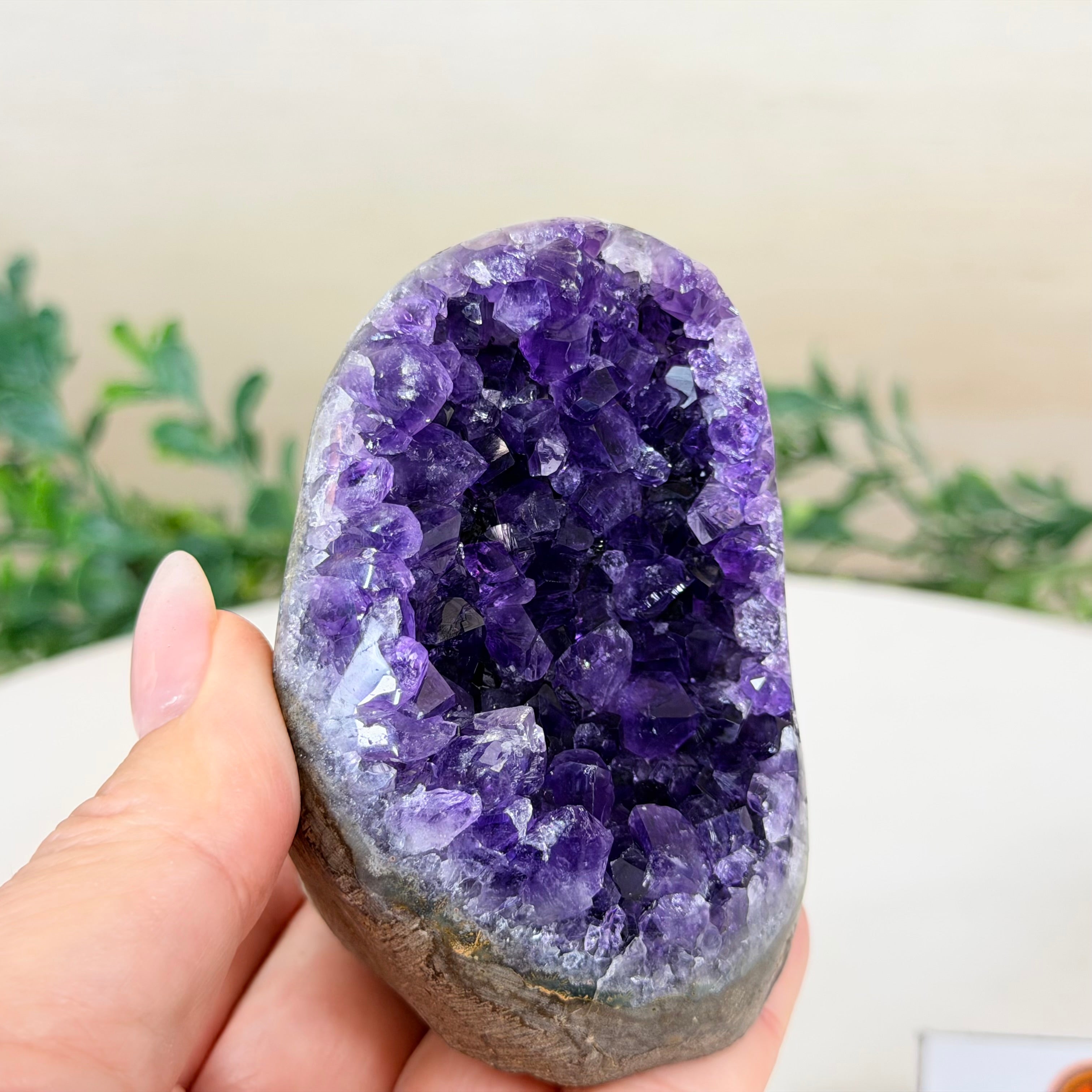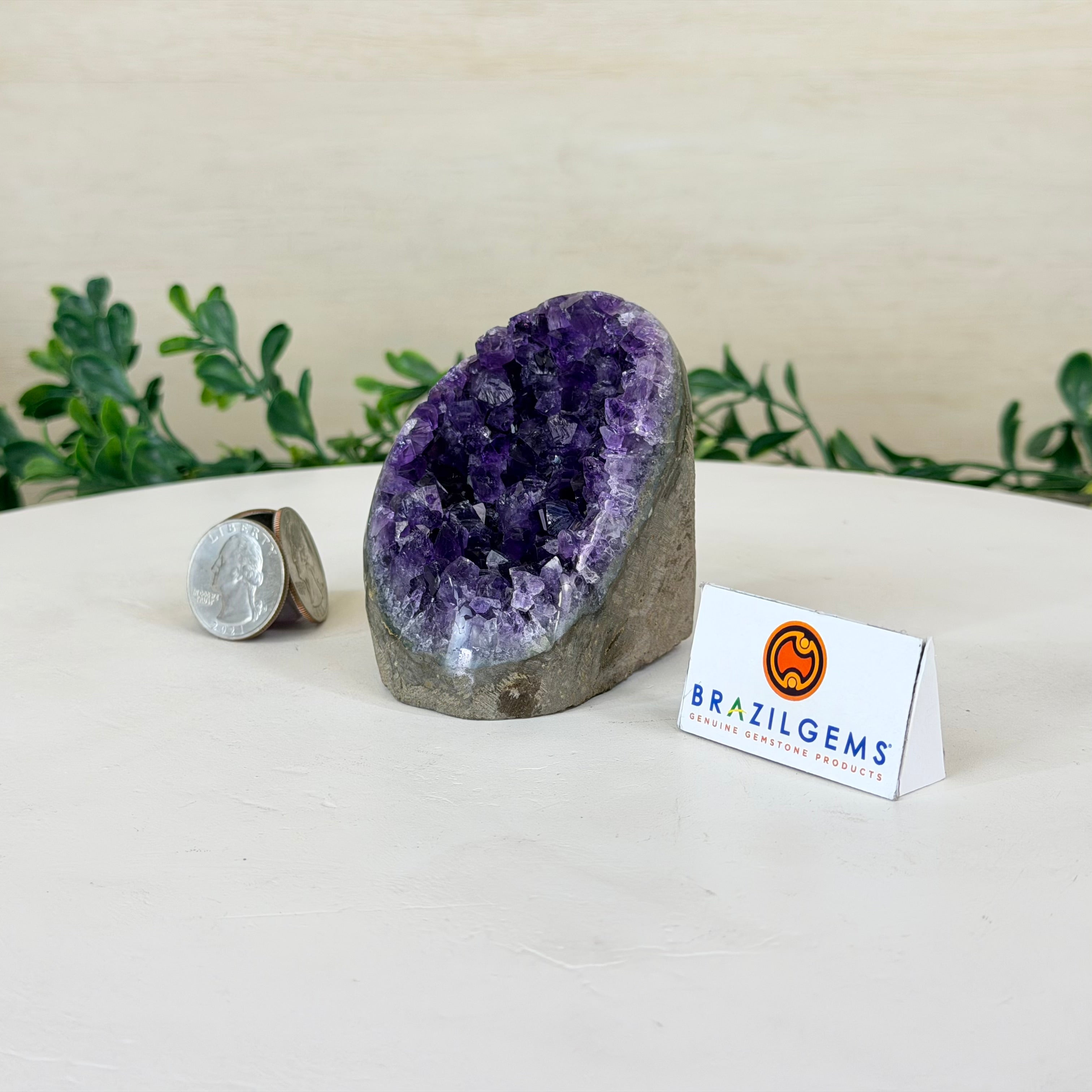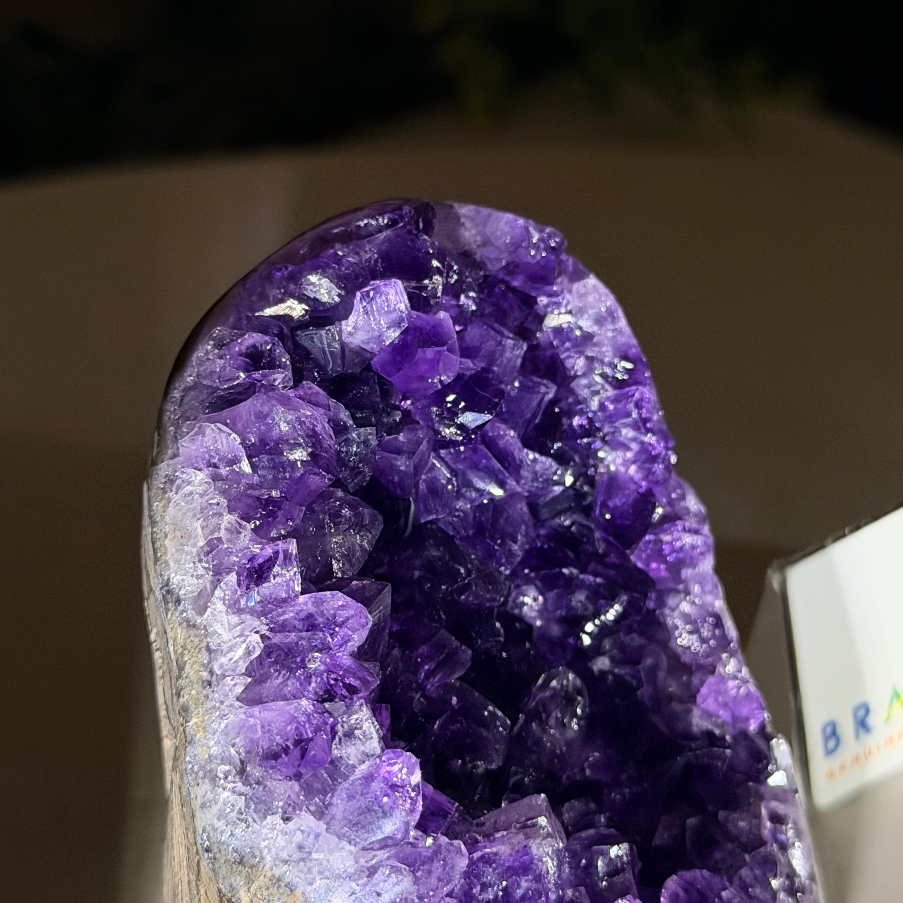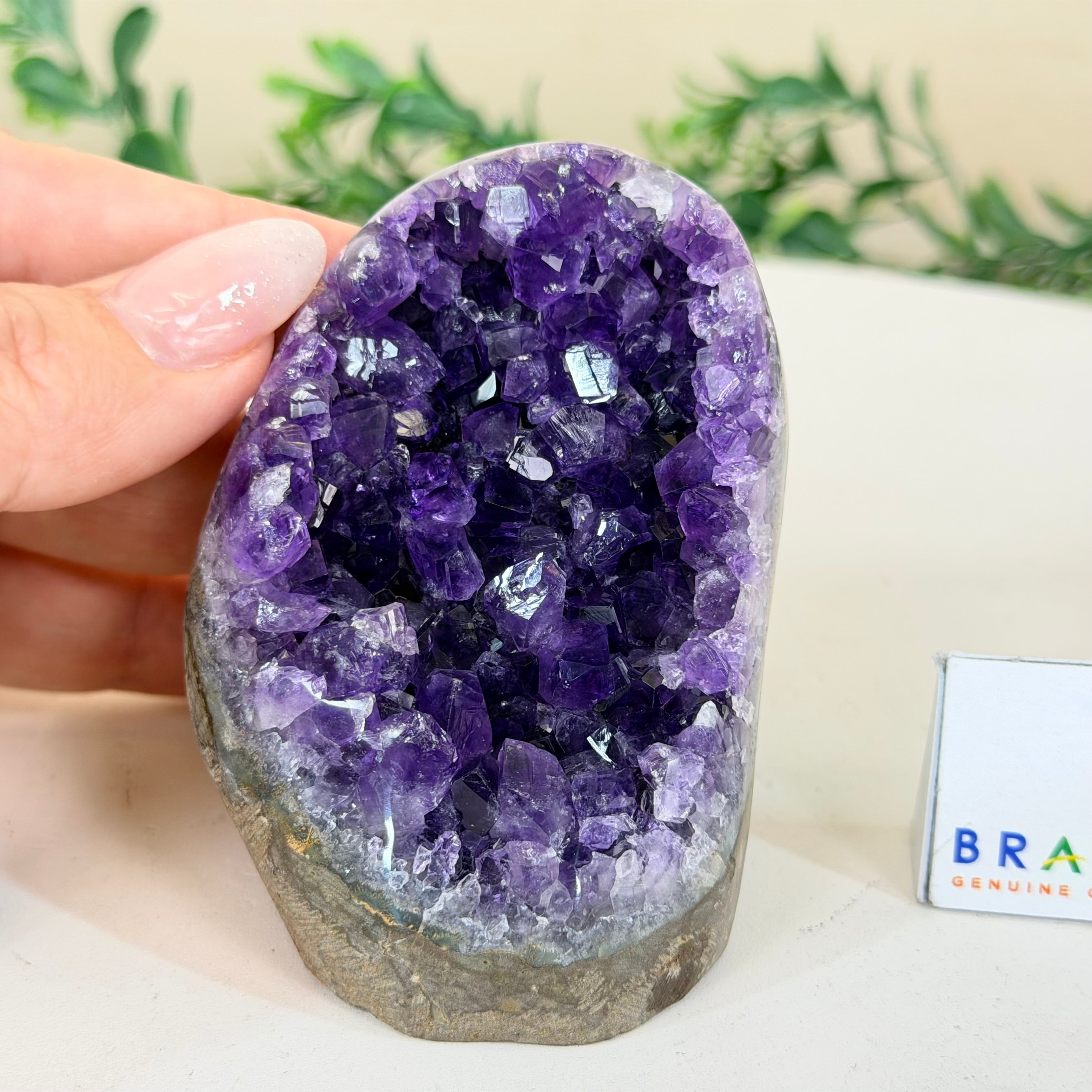 Embrace the natural beauty of this Small Brazilian Extra Plus Quality Amethyst Crystal Cluster with a flat base by Brazil Gems®. This piece has deep purple colors, nicely shaped crystal points and polished edges.