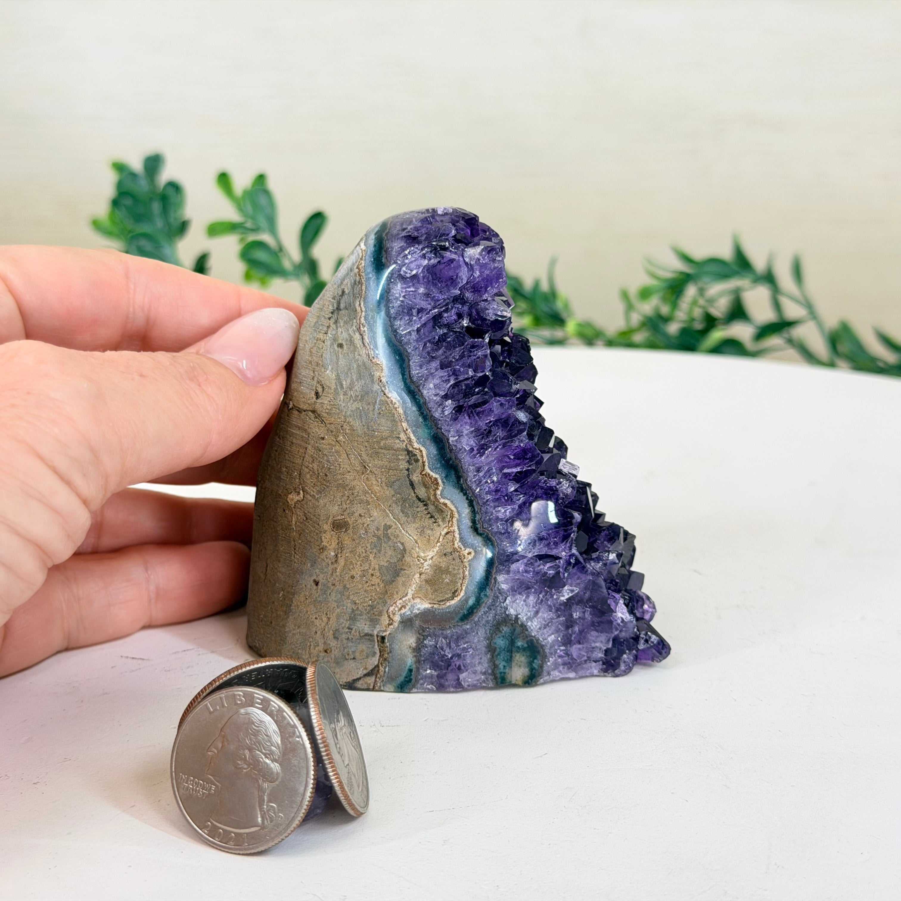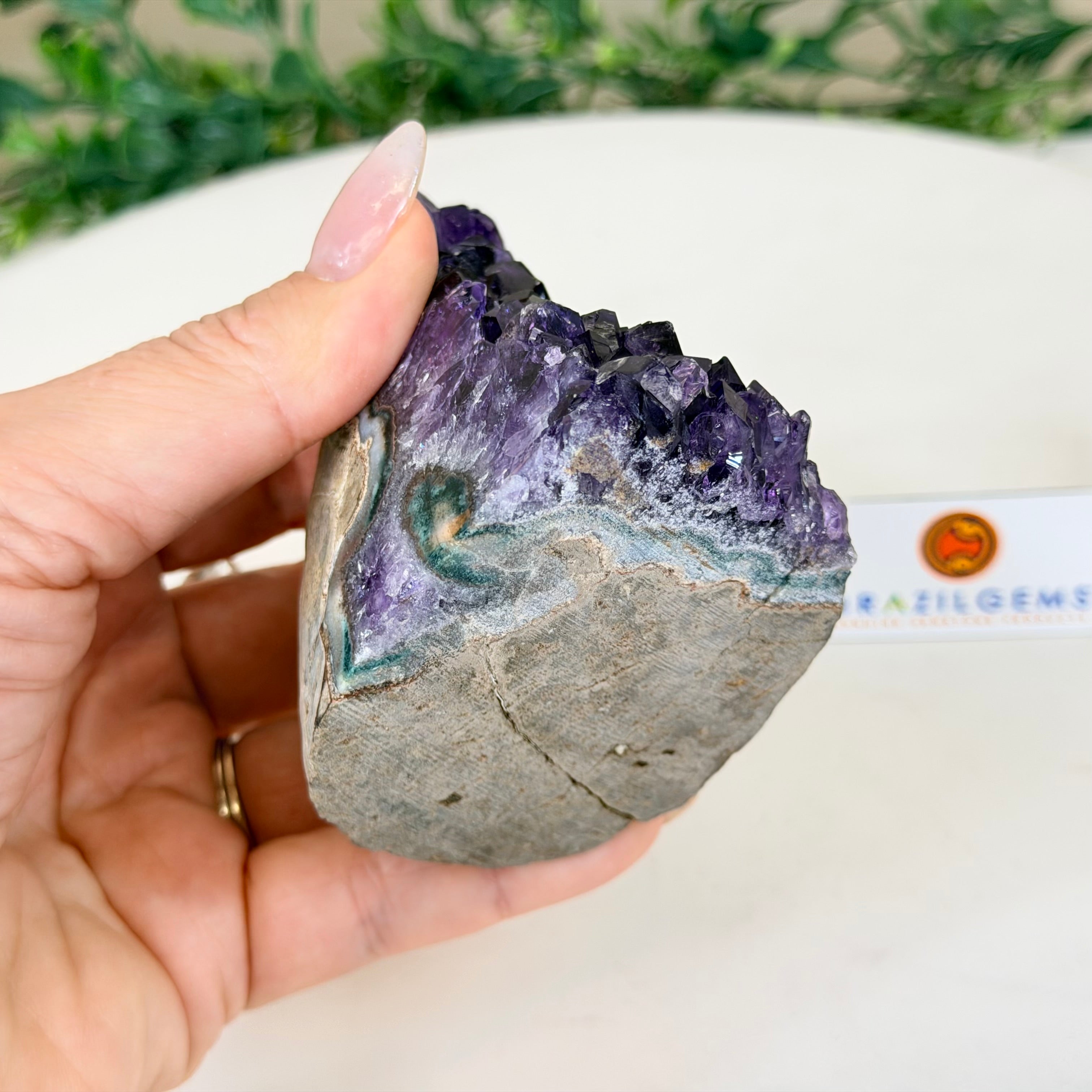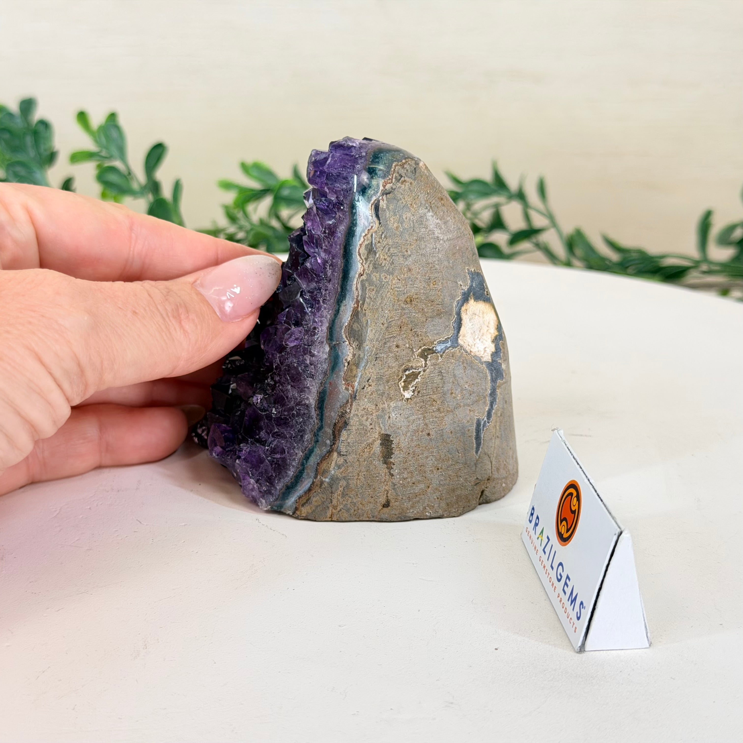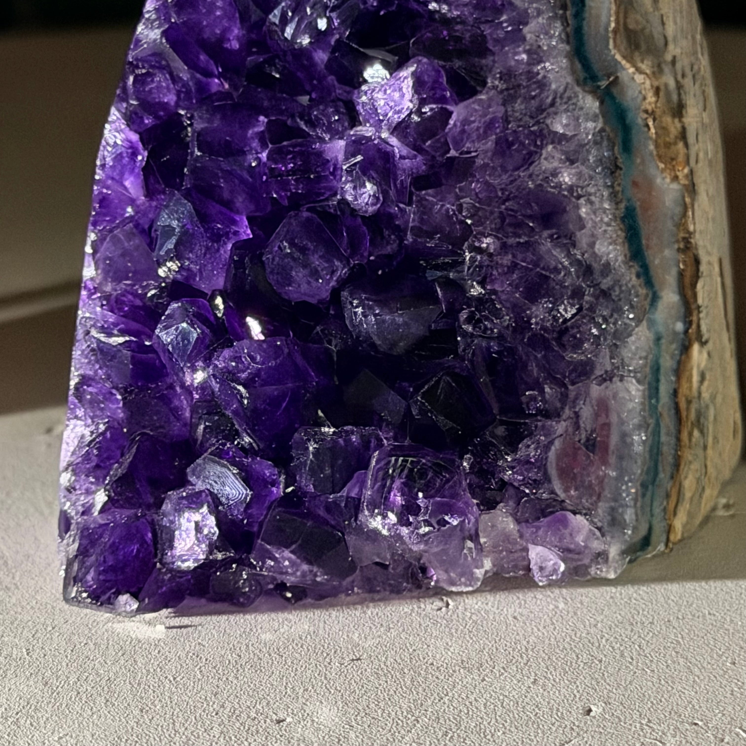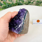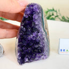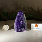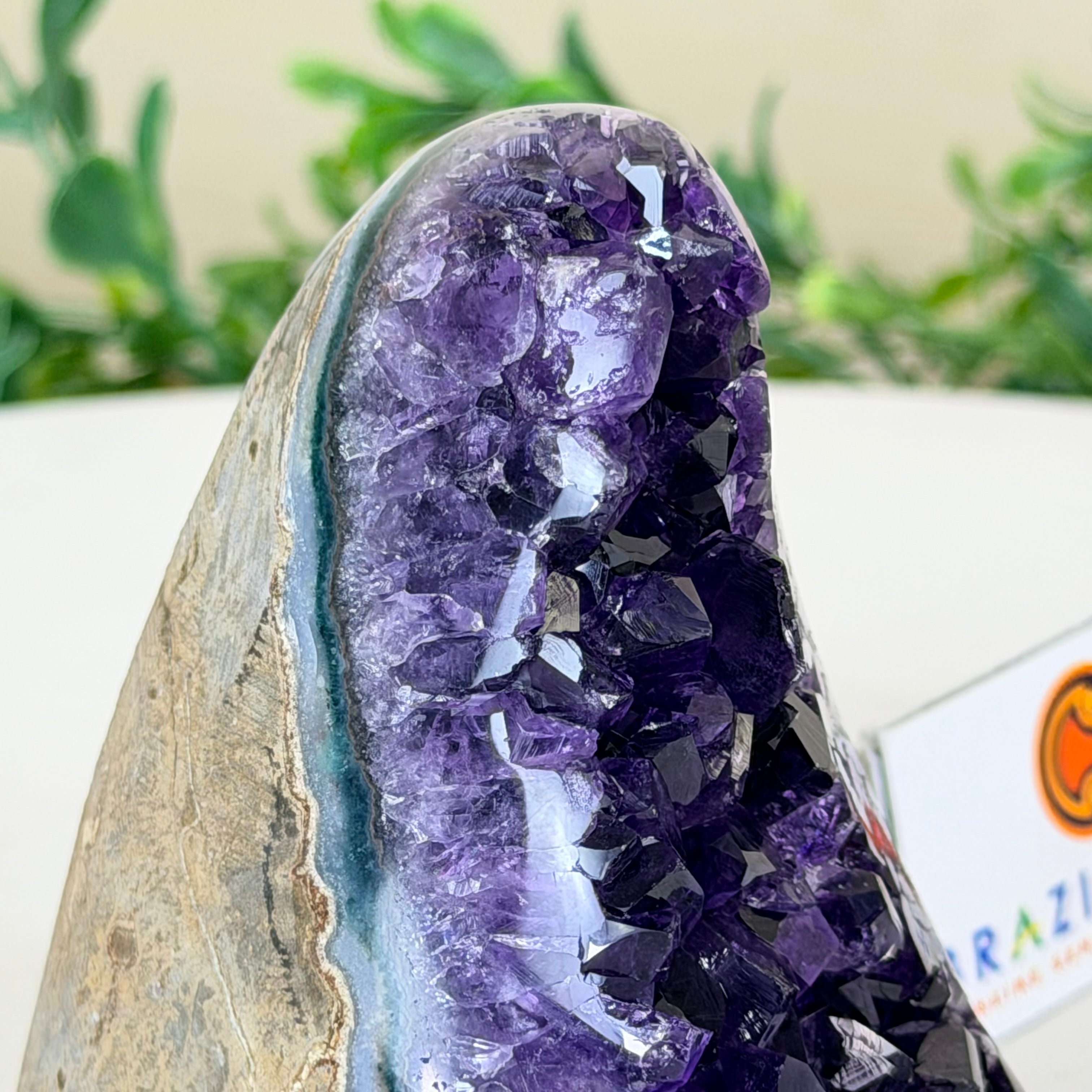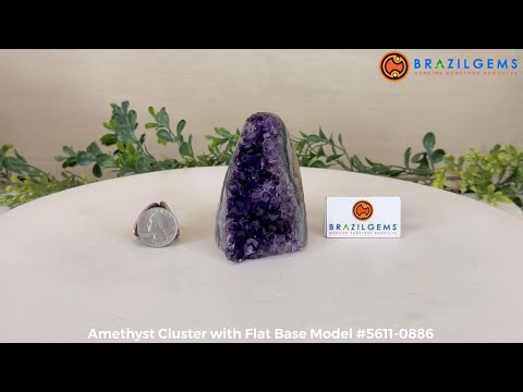 Embrace the natural beauty of this Small Brazilian Extra Plus Quality Amethyst Crystal Cluster with a flat base by Brazil Gems®. This piece has deep purple colors, nicely shaped crystal points and polished edges.