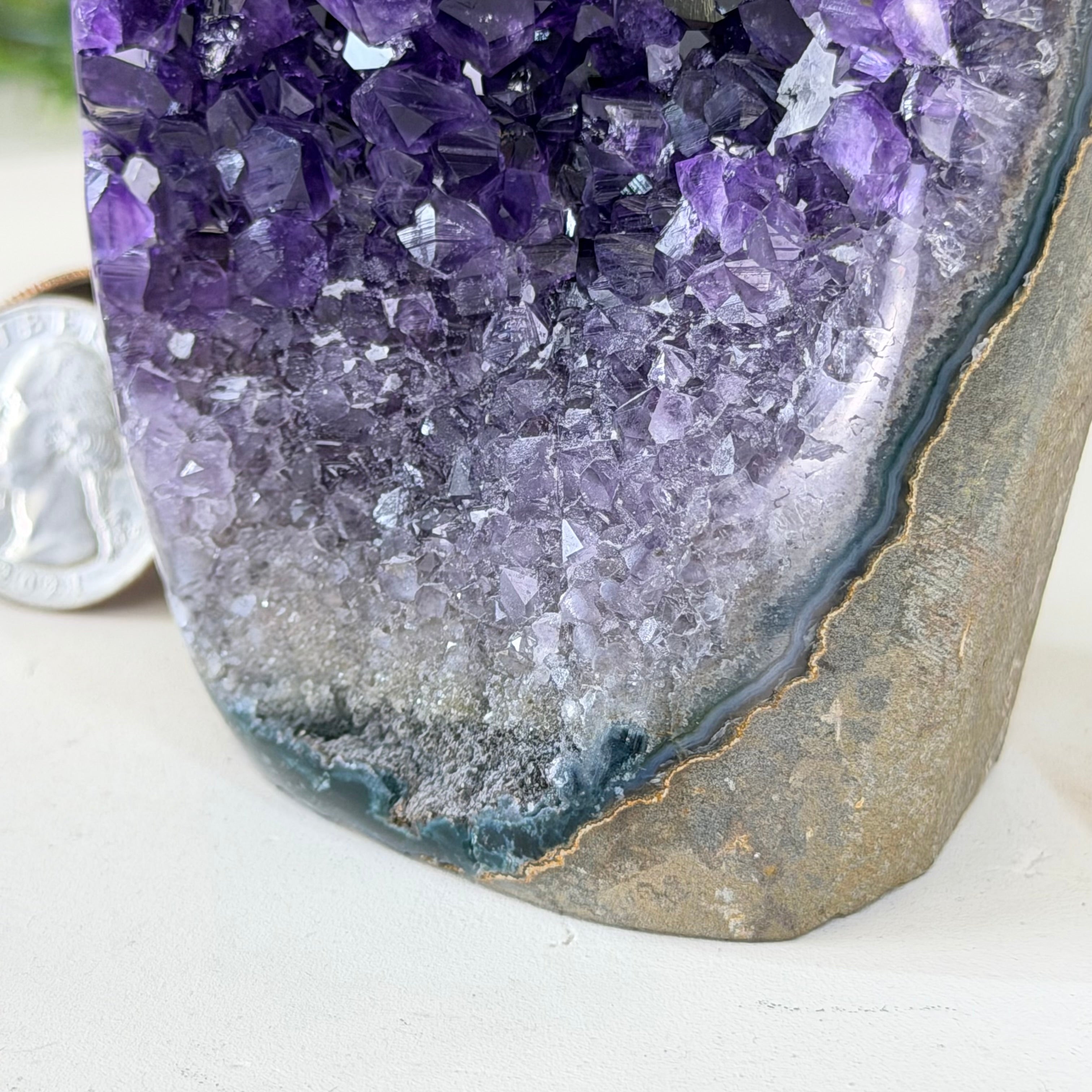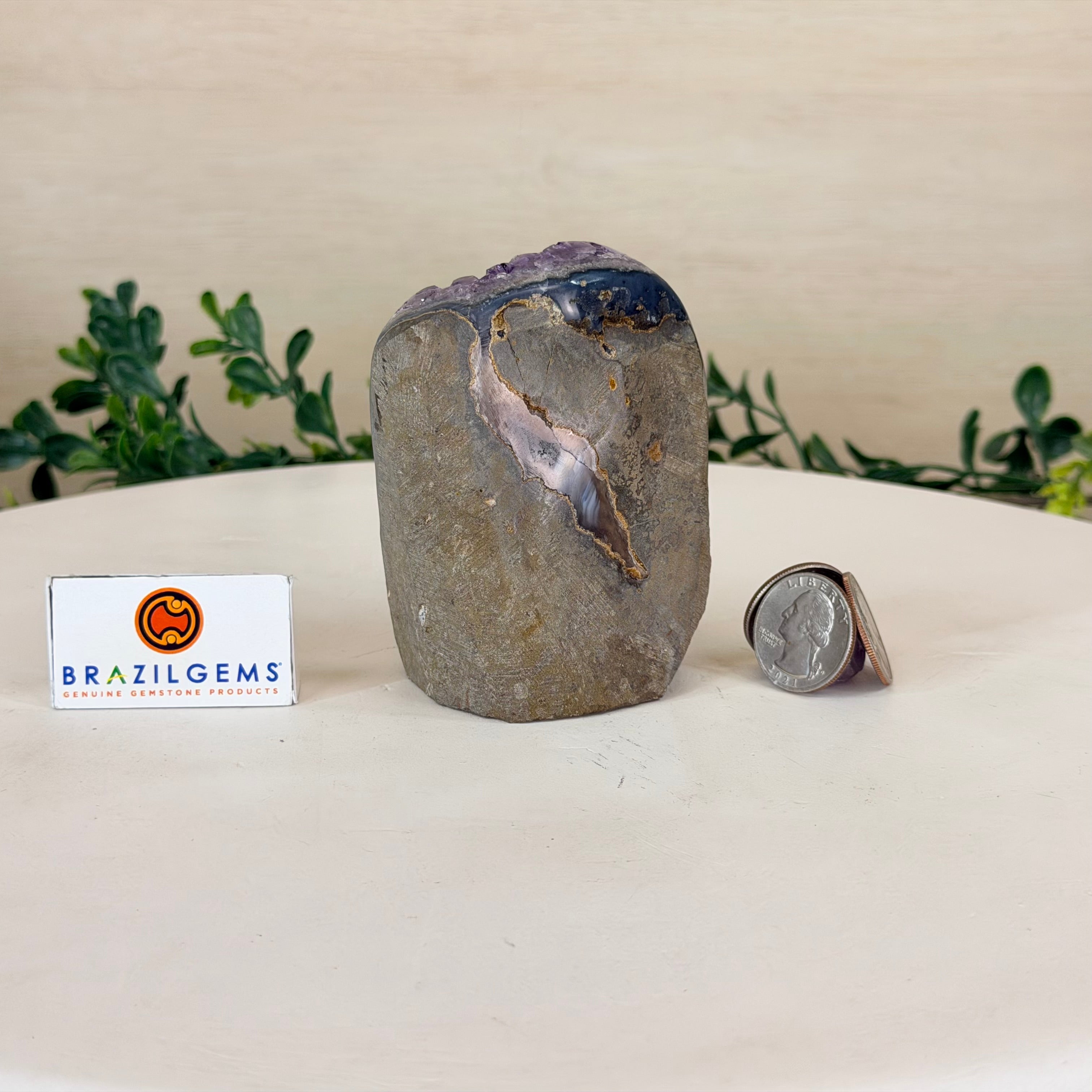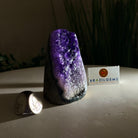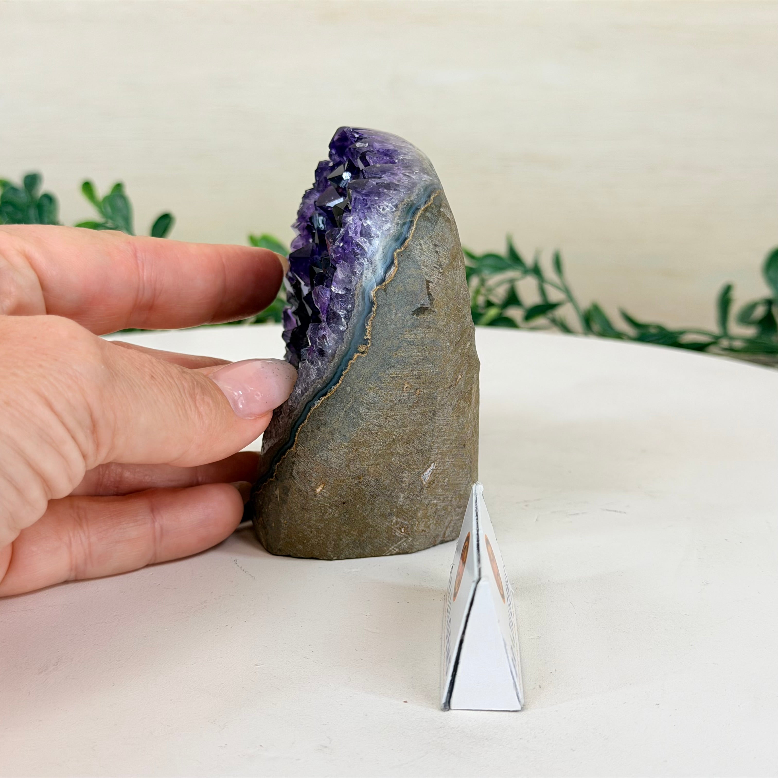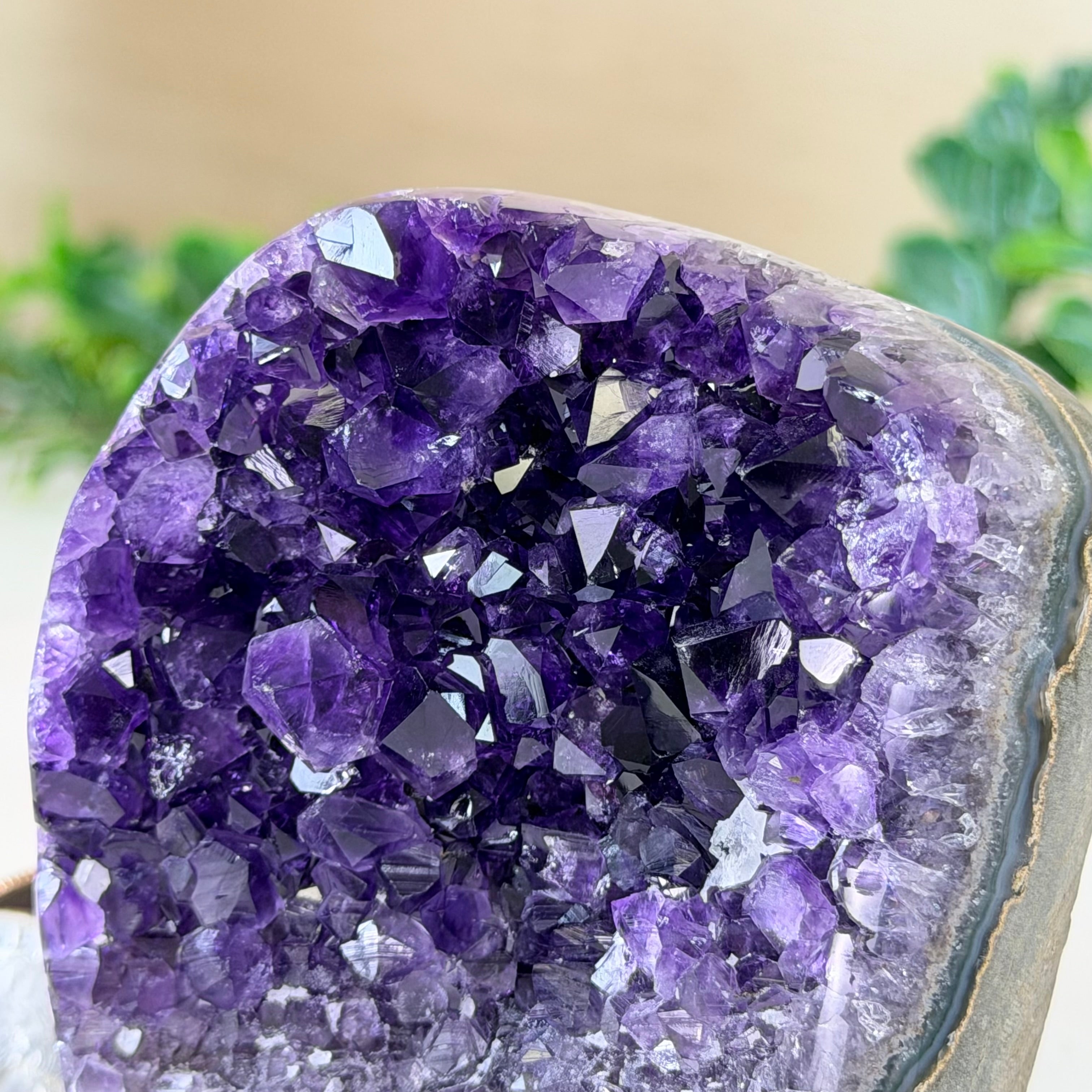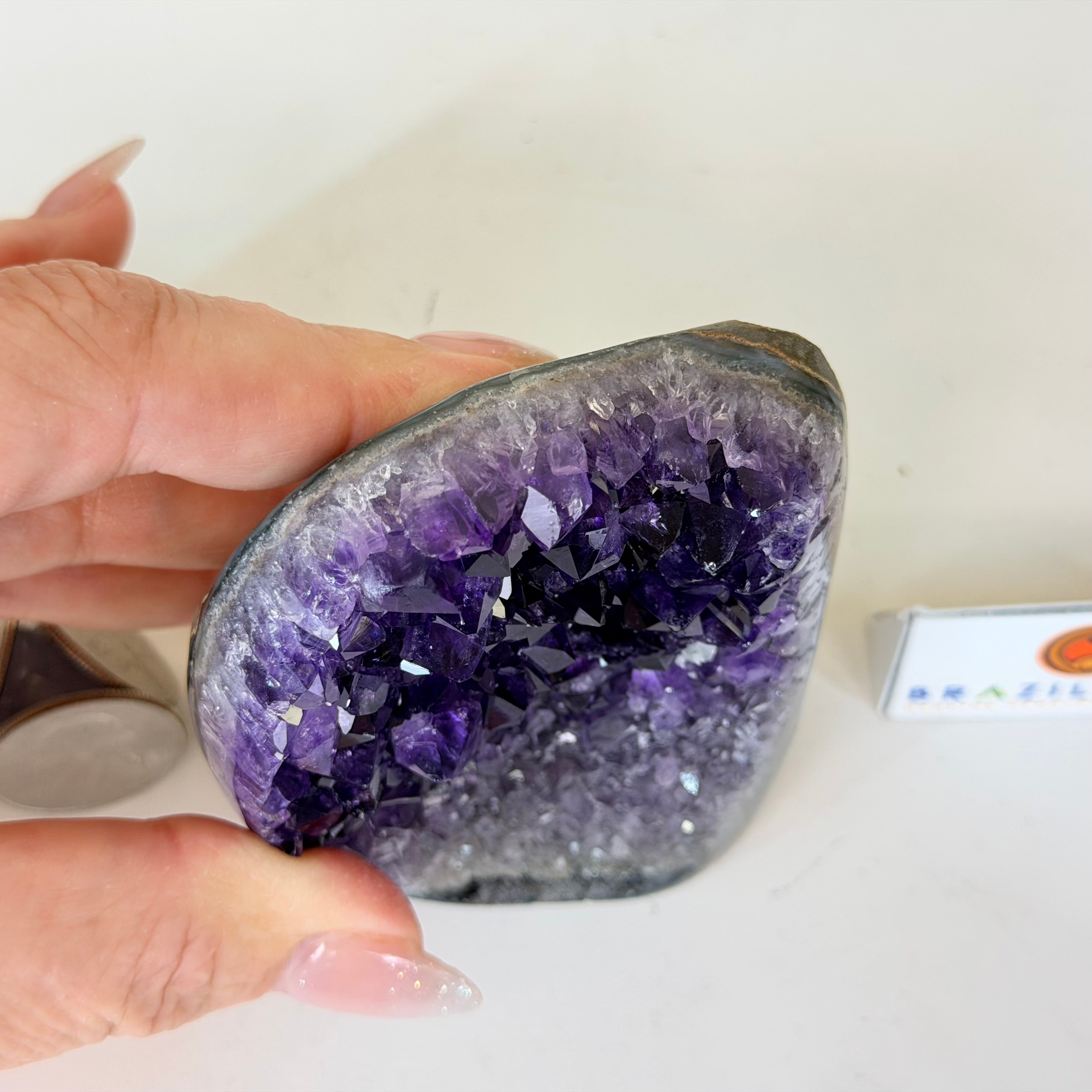Embrace the natural beauty of this Small Brazilian Extra Plus Quality Amethyst Crystal Cluster with a flat base by Brazil Gems®. This piece has deep purple colors, nicely shaped crystal points and polished edges.