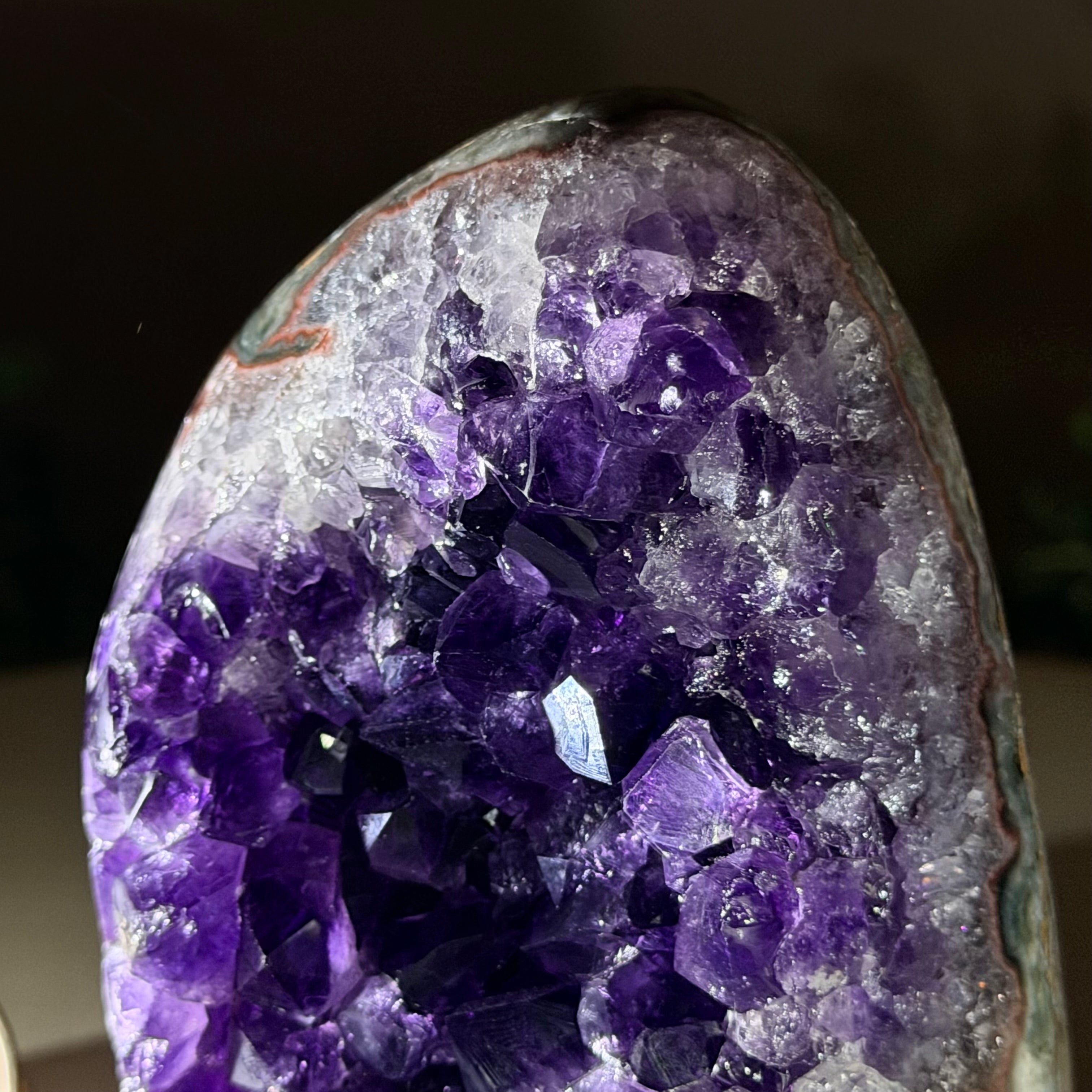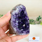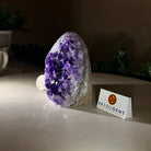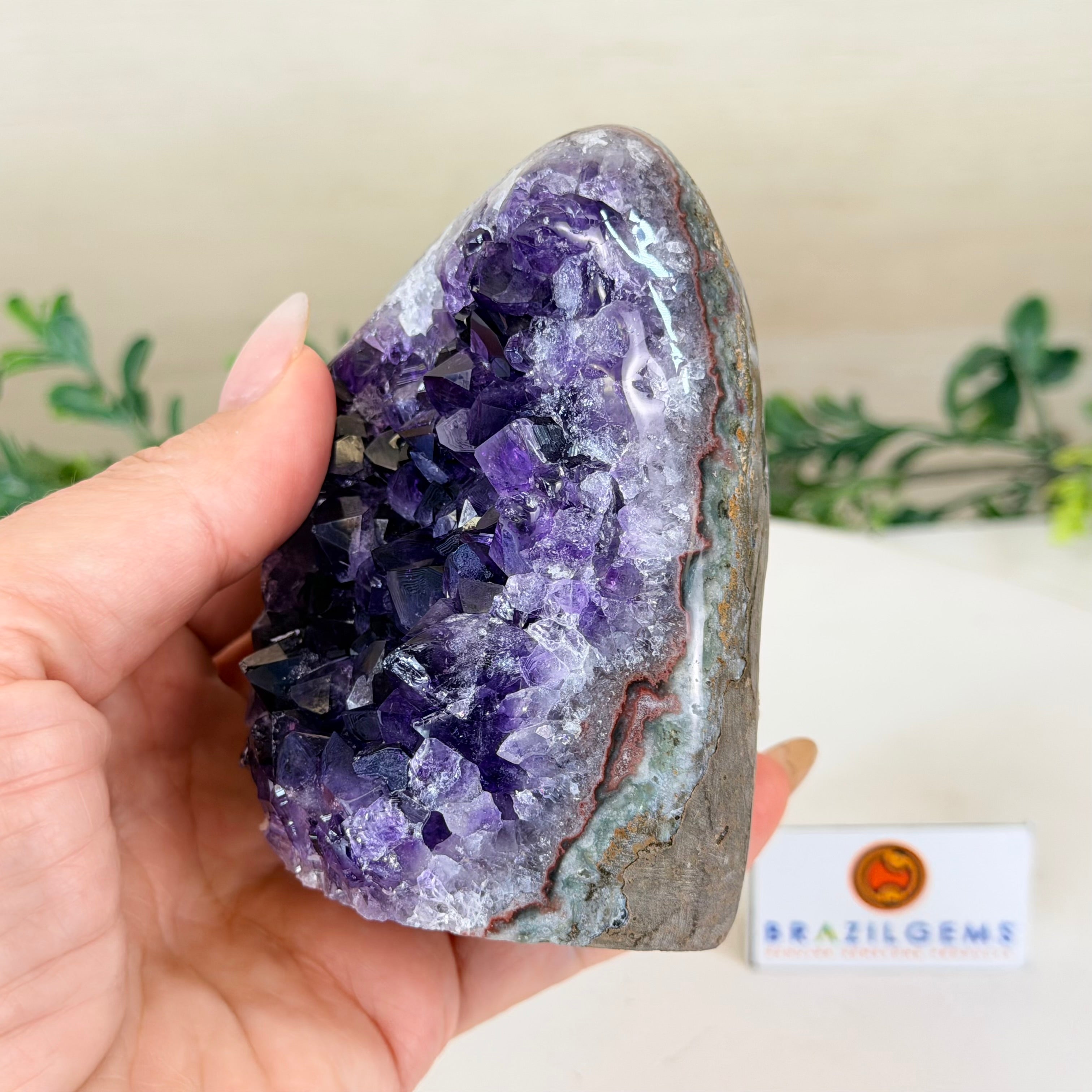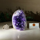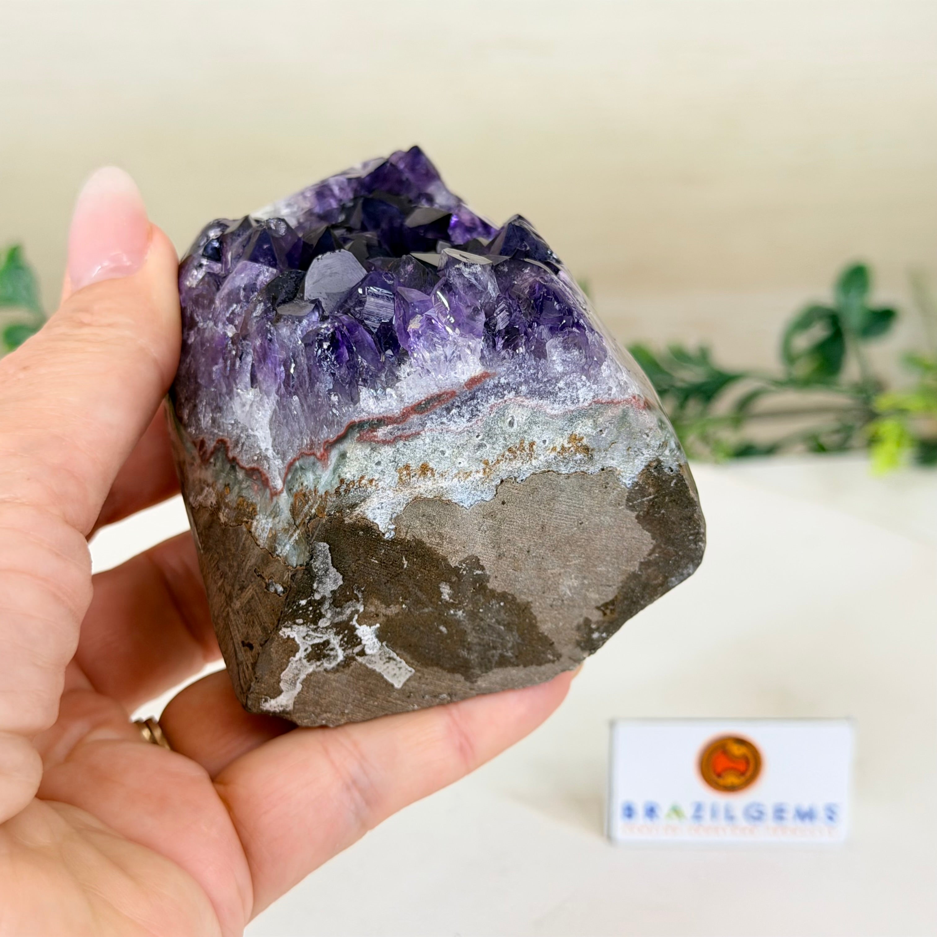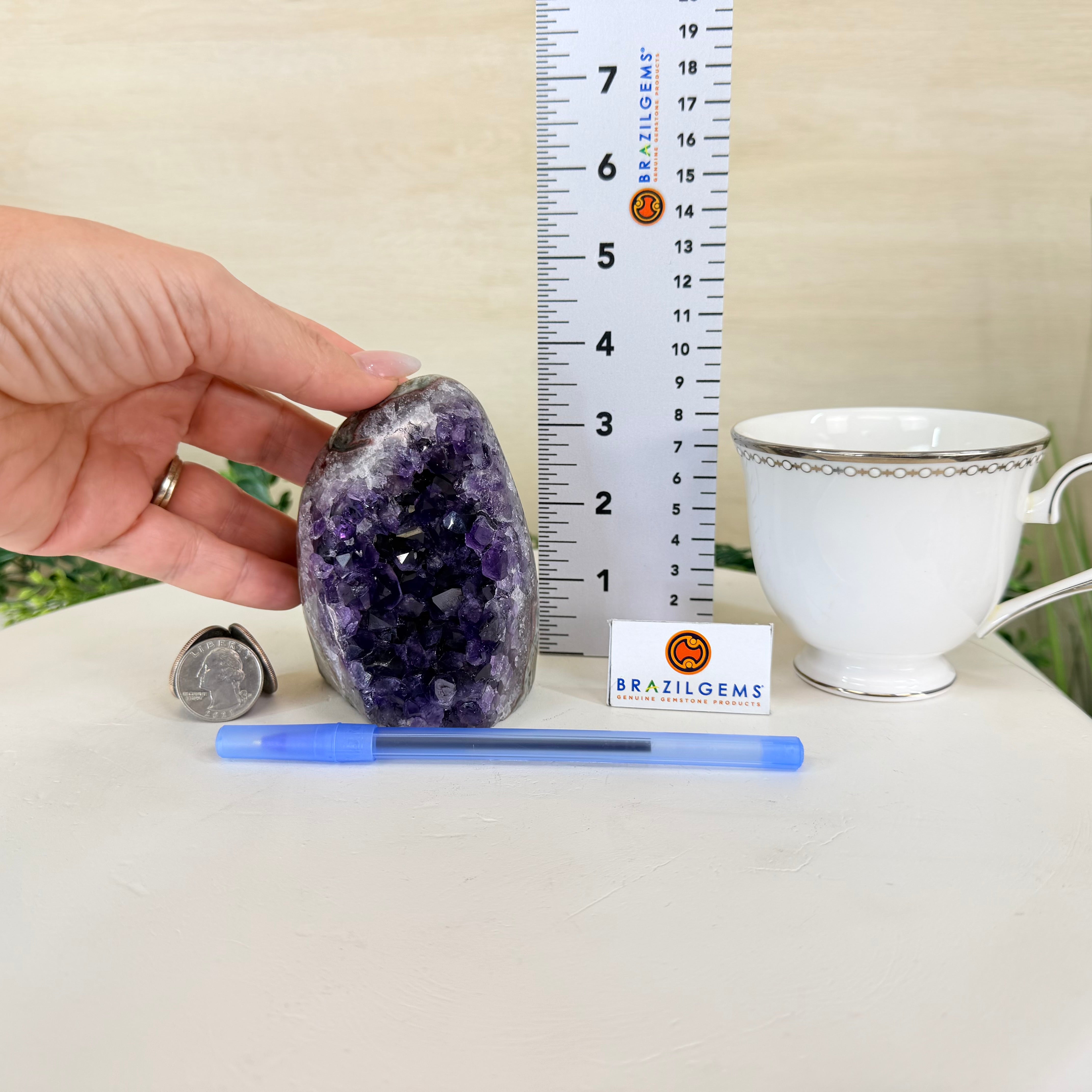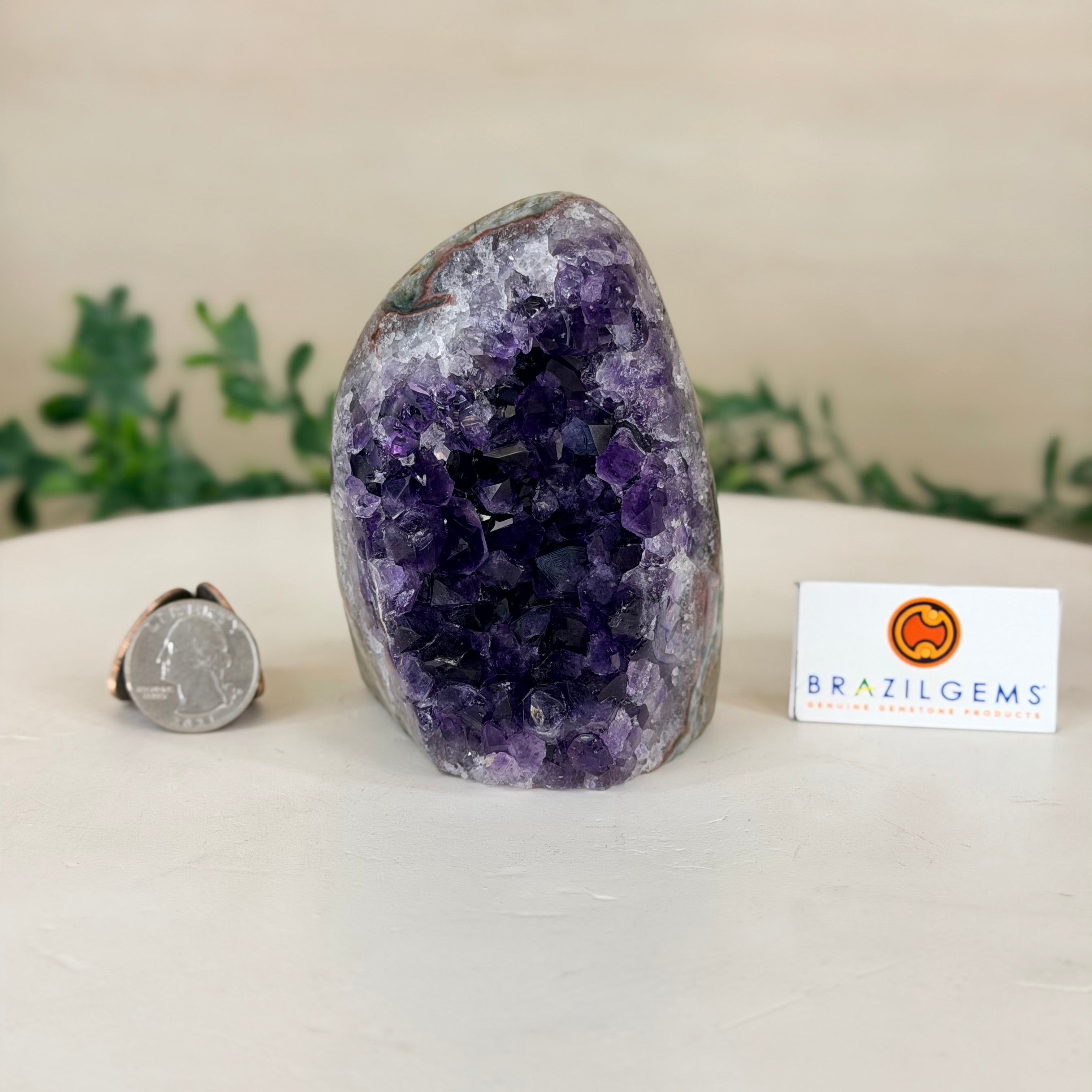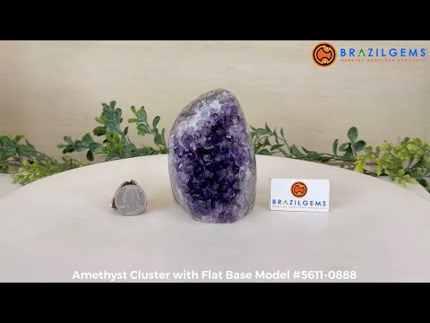 Embrace the natural beauty of this Small Brazilian Extra Plus Quality Amethyst Crystal Cluster with a flat base by Brazil Gems®. This piece has deep purple colors, nicely shaped crystal points and polished edges.