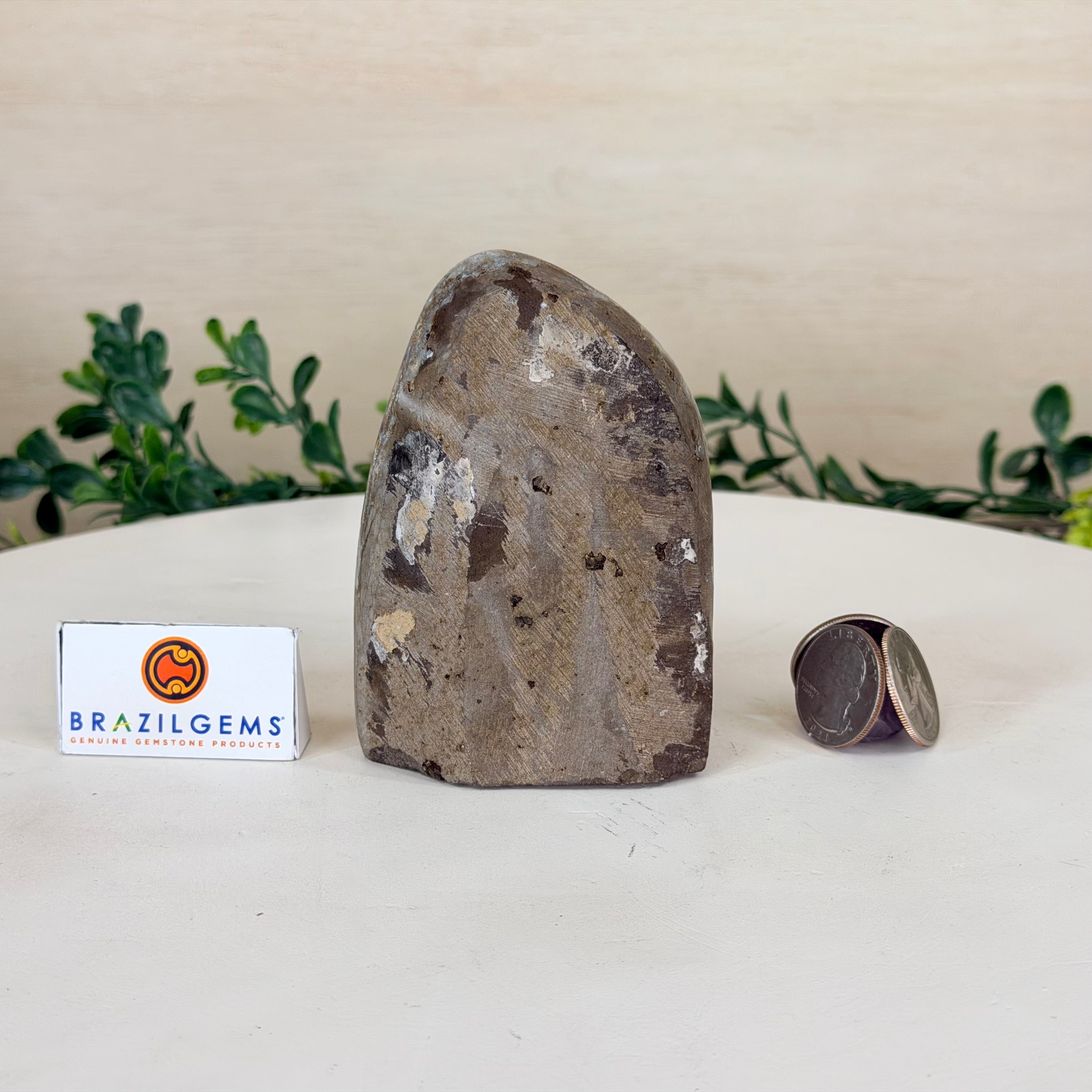 Disclaimer: This is a natural gemstone crystal sold by Brazil Gems® as is and as you see it in its images and video. It is the exact one you will receive. It may contain natural imperfections and/or imperfections, broken edges and repairs from the extraction, polishing and prepping processes. In order for it to stand on its own the bottom has been cut flat. At Brazil Gems® we make every effort to get measurements as exact as possible but they are done by human hands and eyes and therefore may have minor discrepancies.