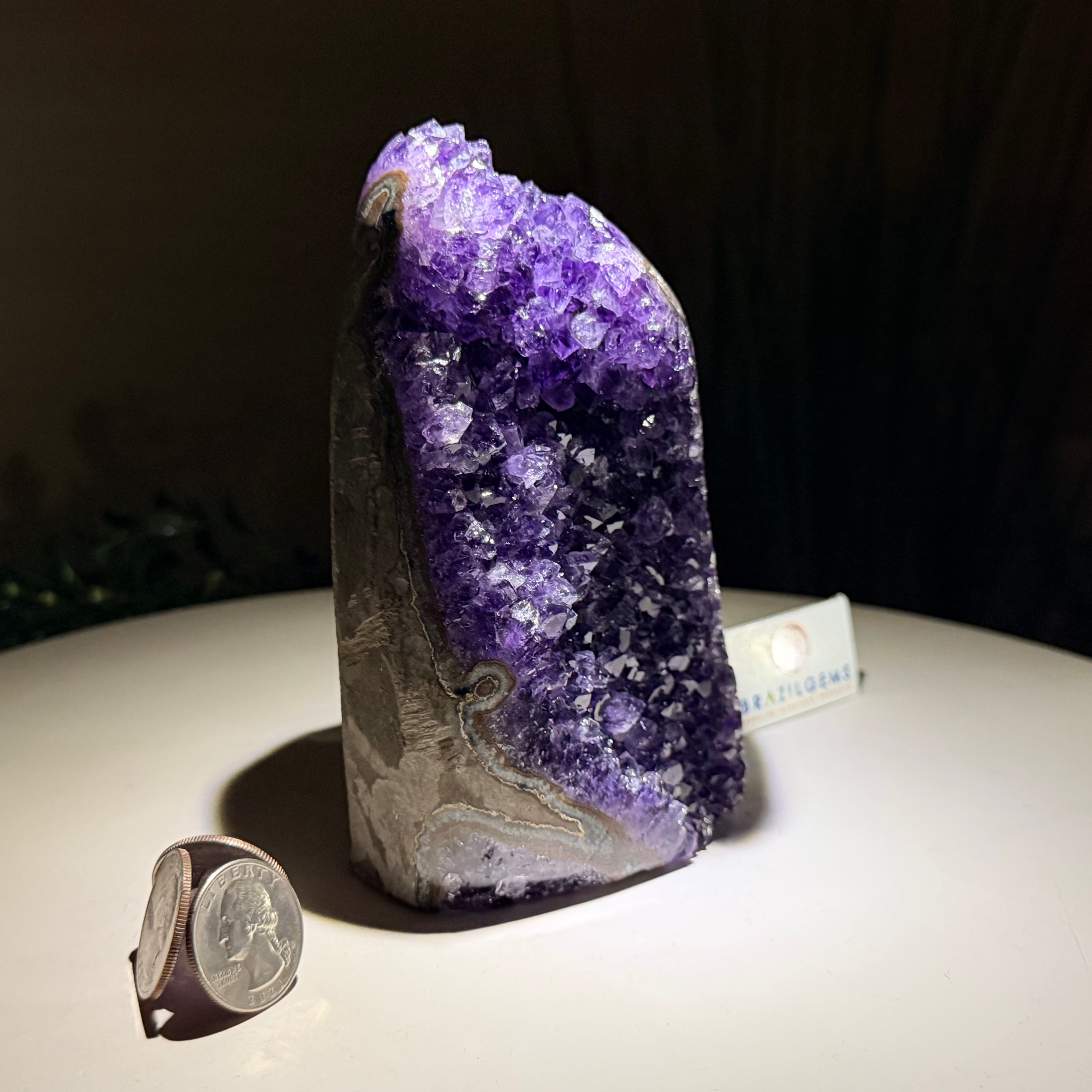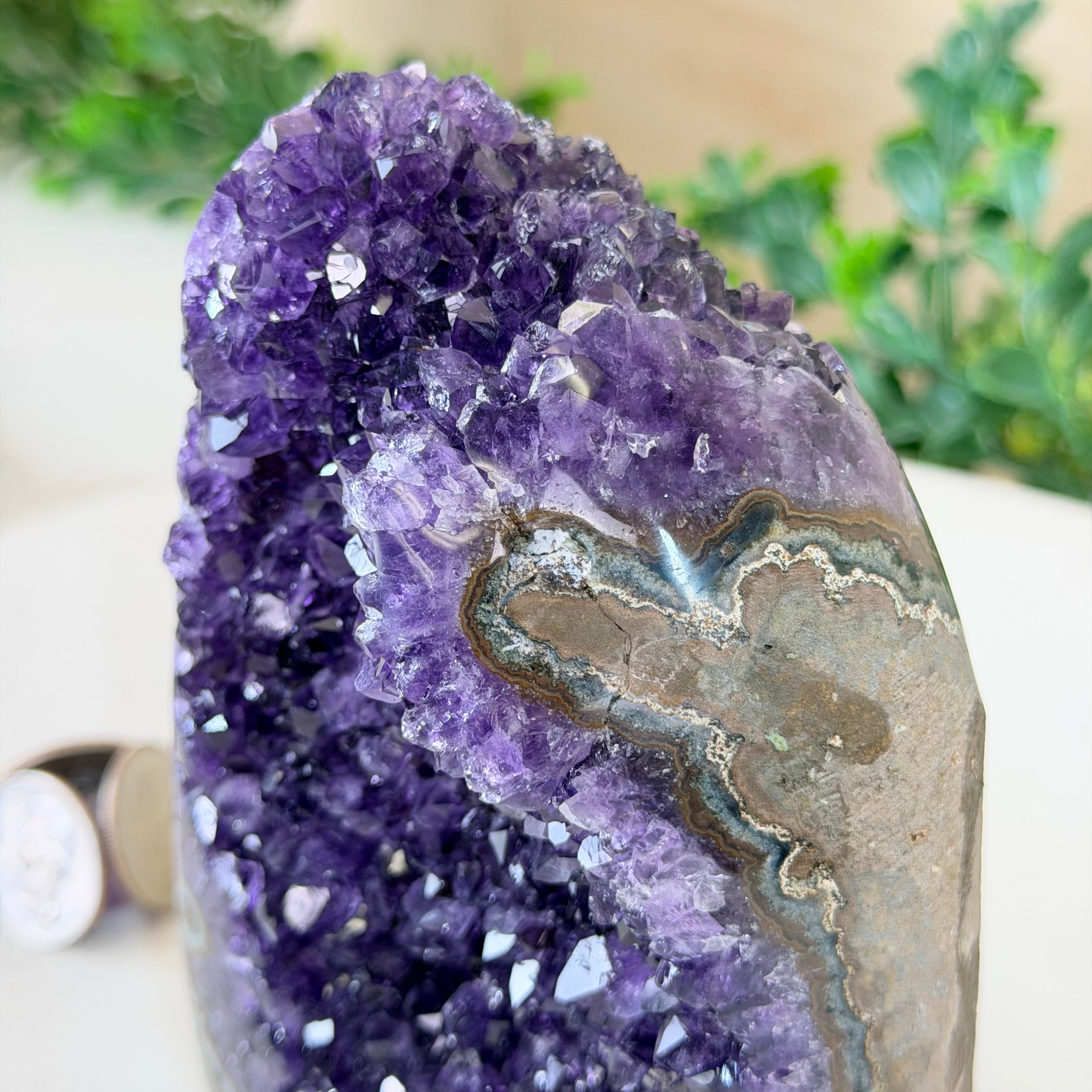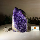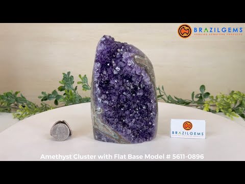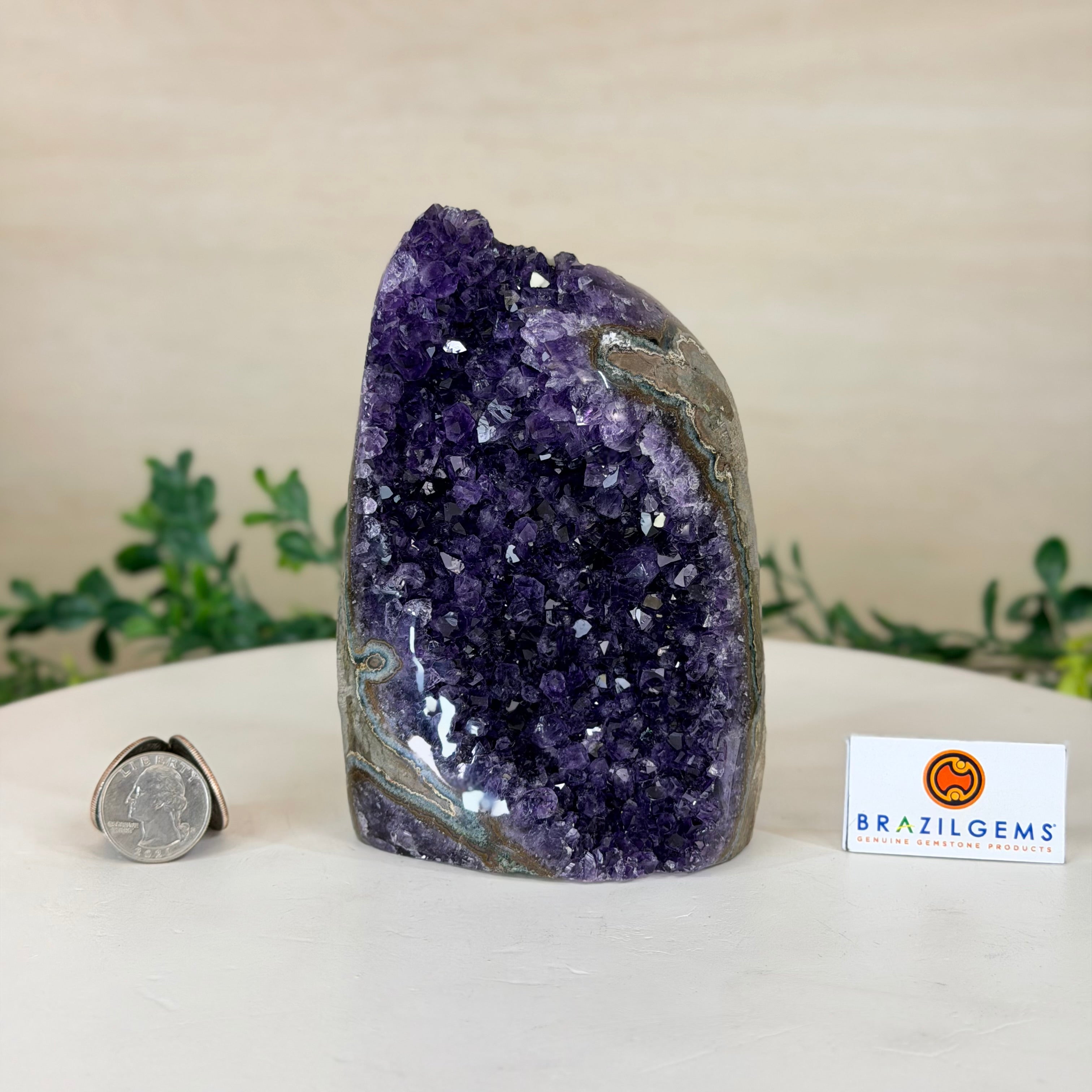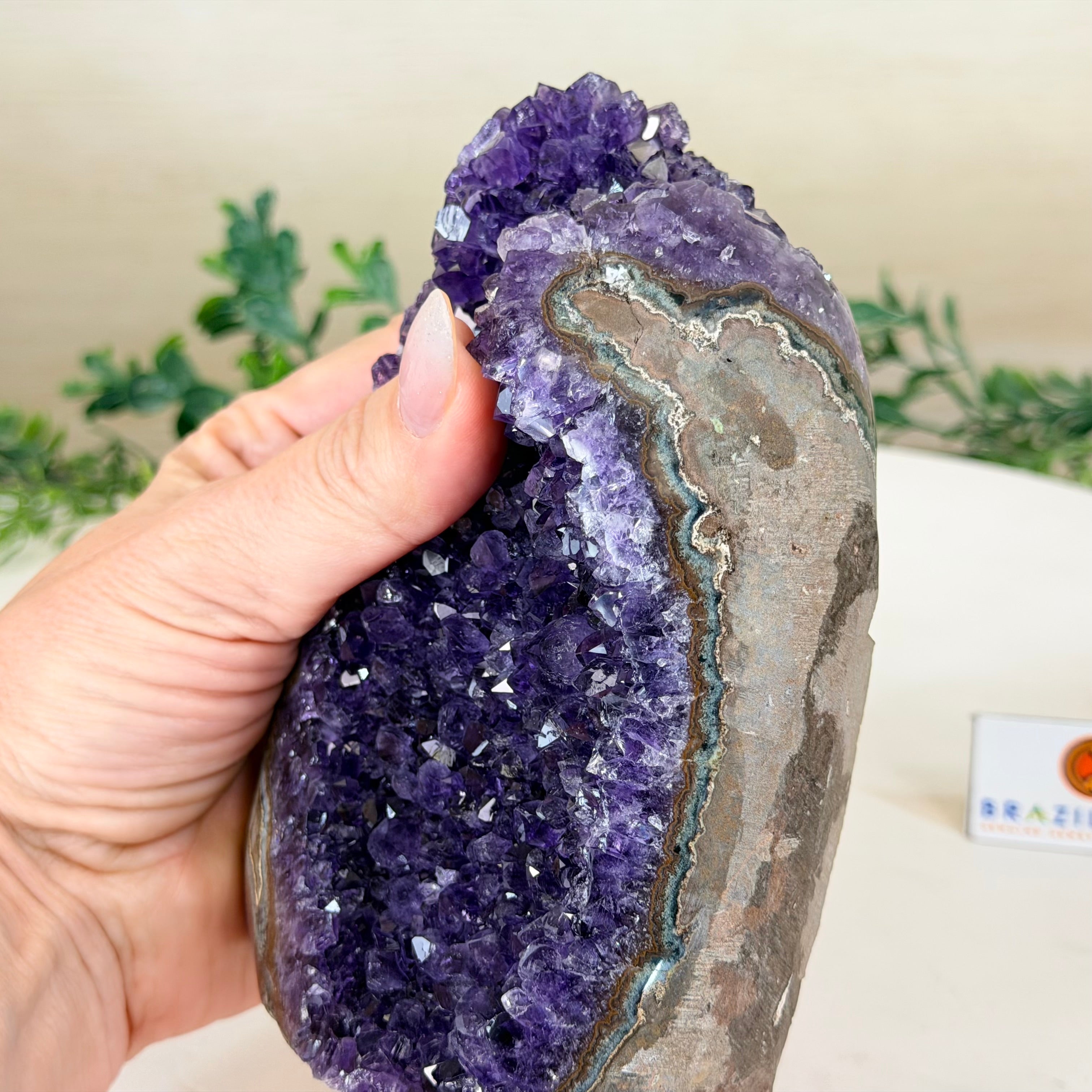 Embrace the natural beauty of this Small Brazilian Extra Plus Quality Amethyst Crystal Cluster with a flat base by Brazil Gems®. This piece has deep purple colors, nicely shaped crystal points and polished edges.