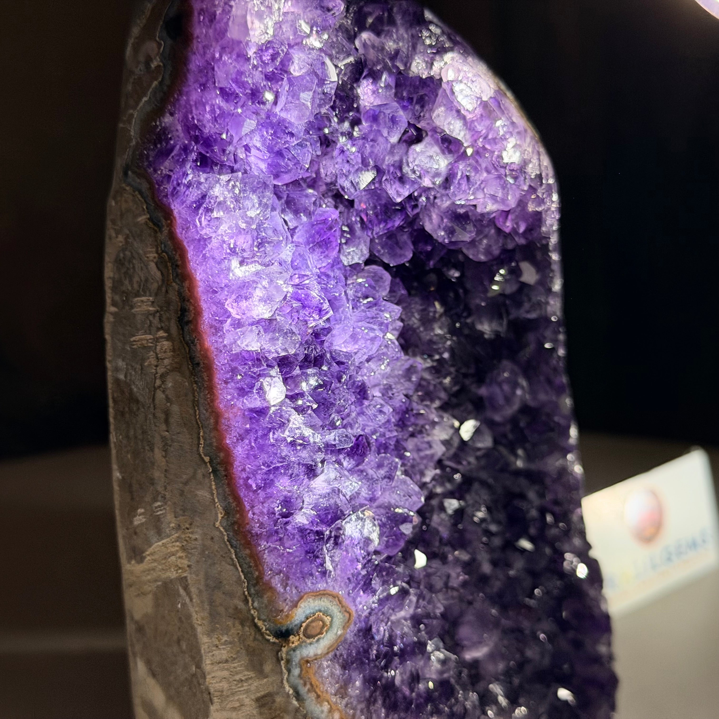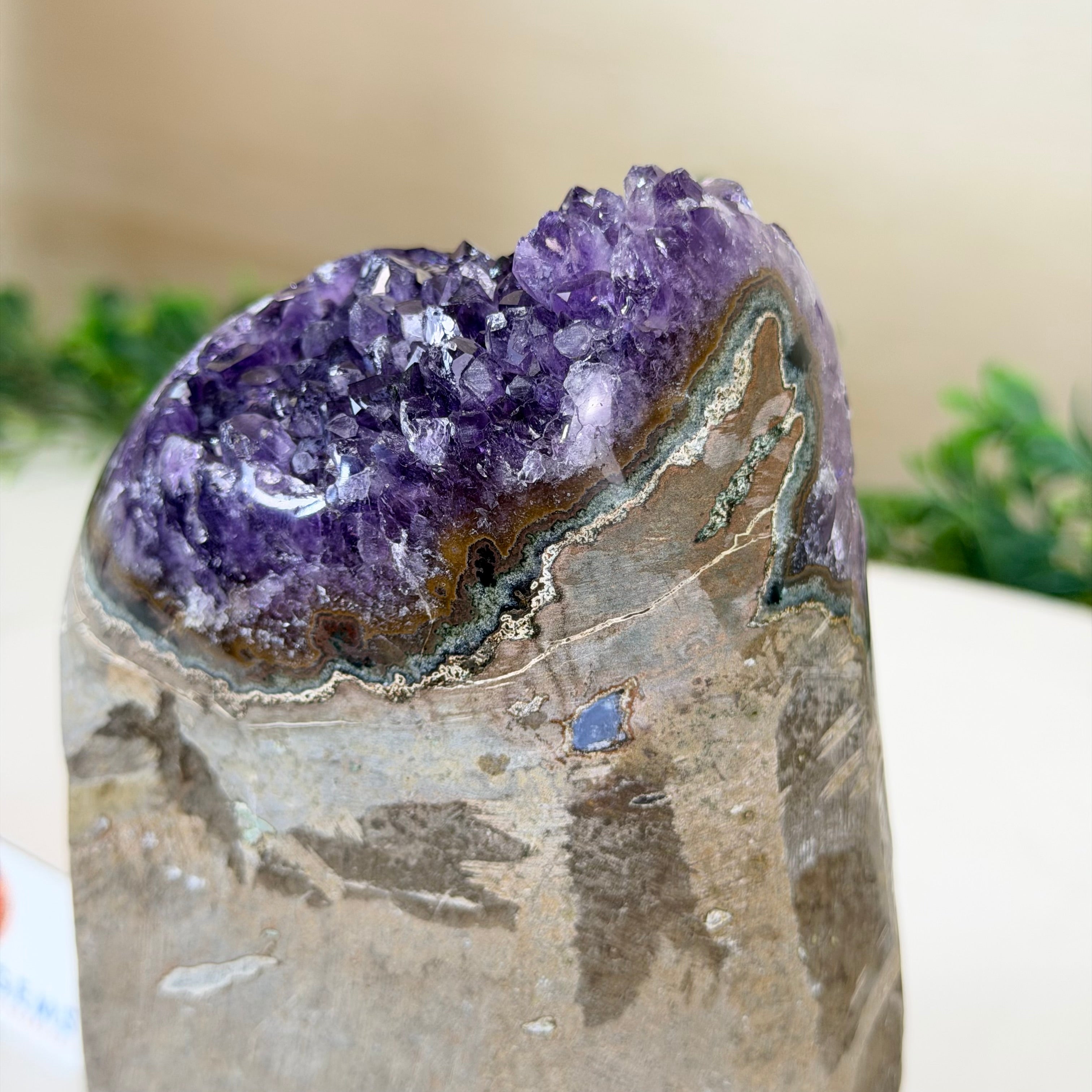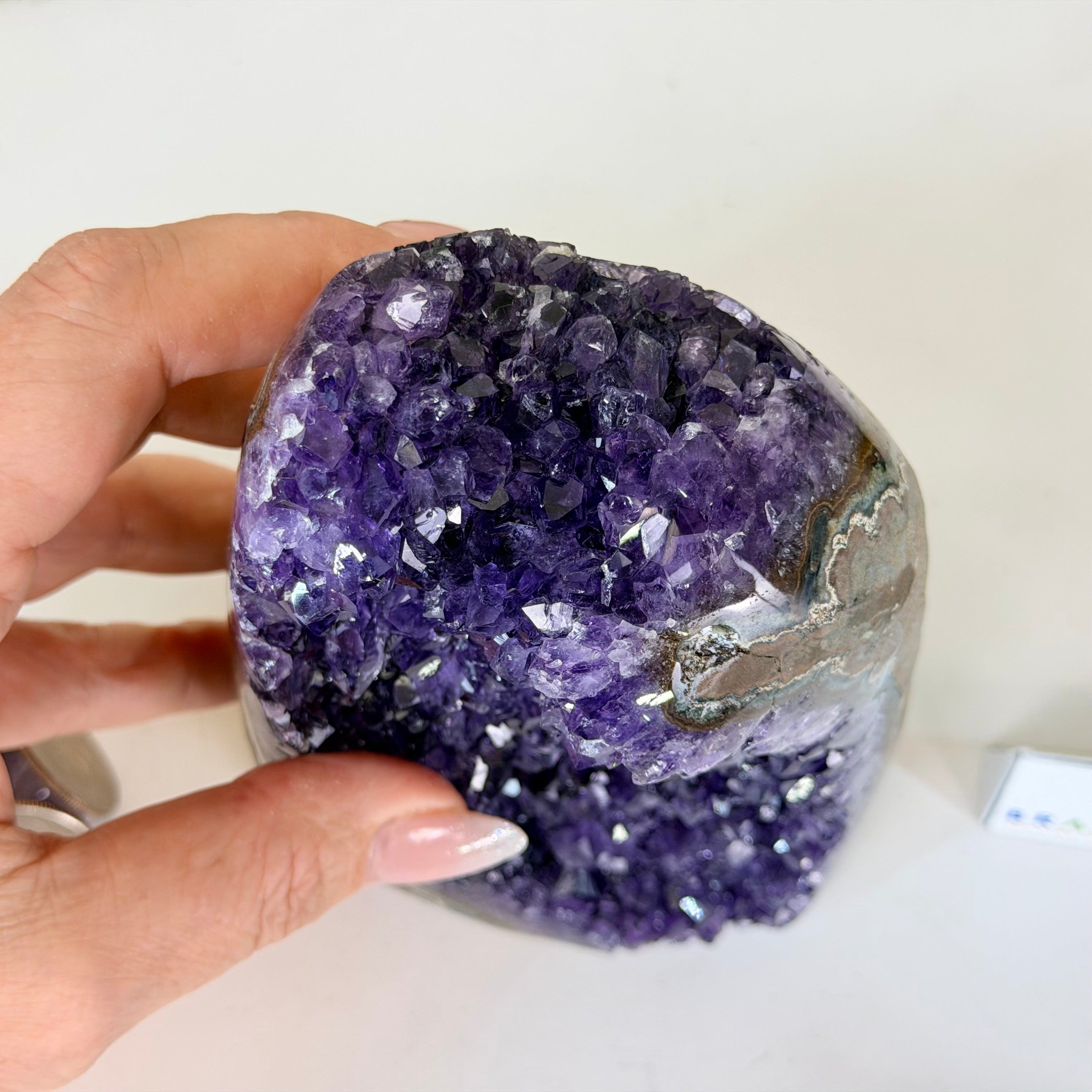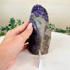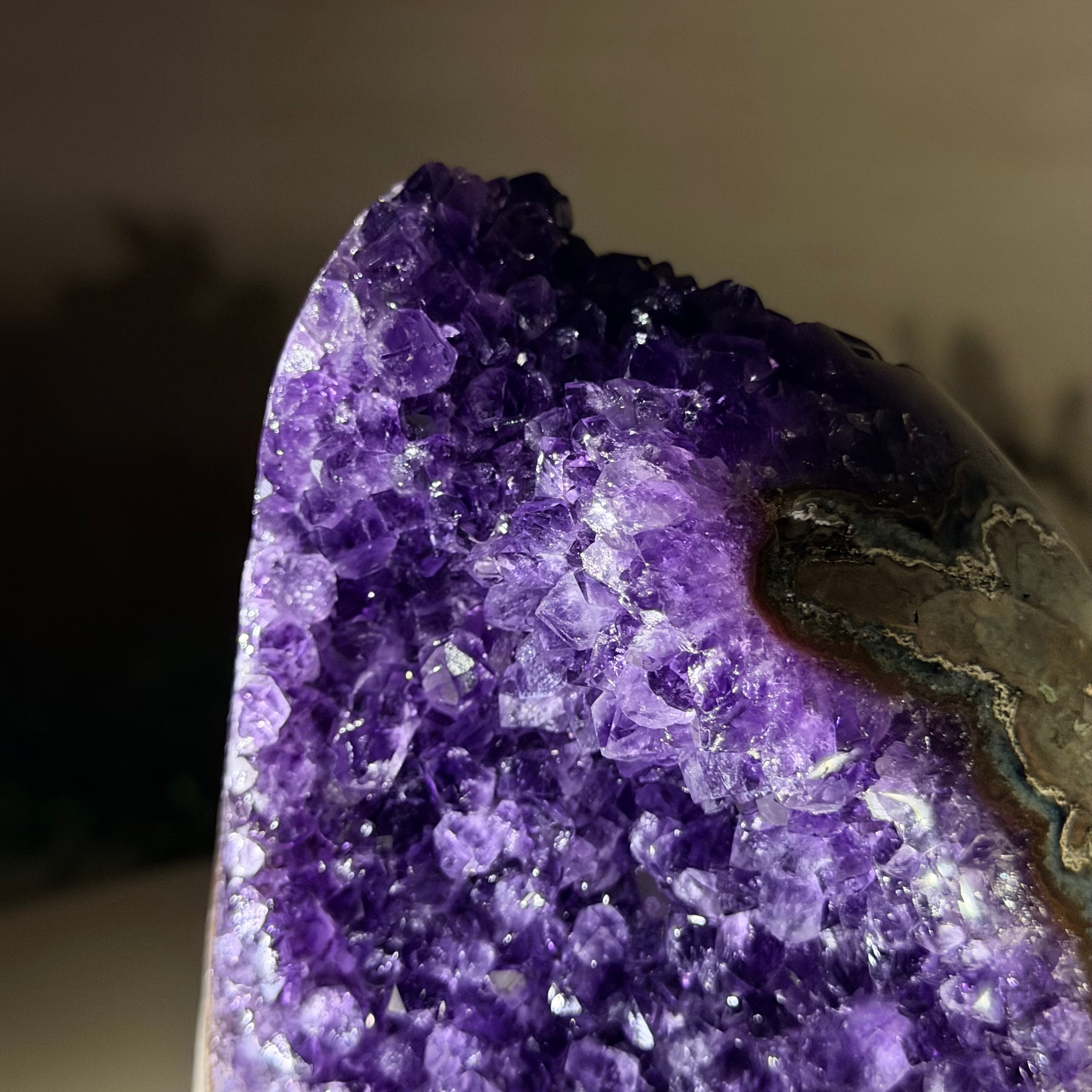 Embrace the natural beauty of this Small Brazilian Extra Plus Quality Amethyst Crystal Cluster with a flat base by Brazil Gems®. This piece has deep purple colors, nicely shaped crystal points and polished edges.