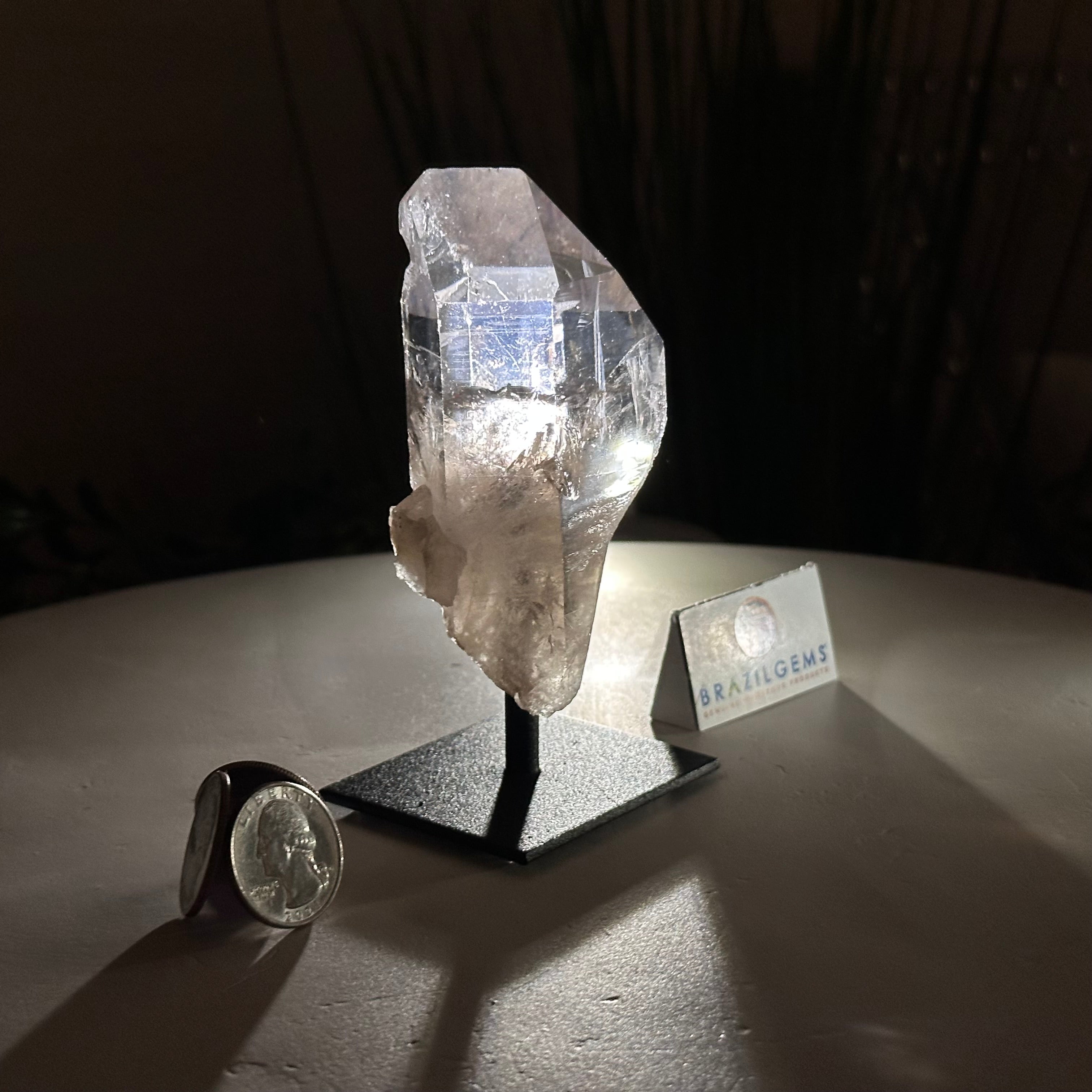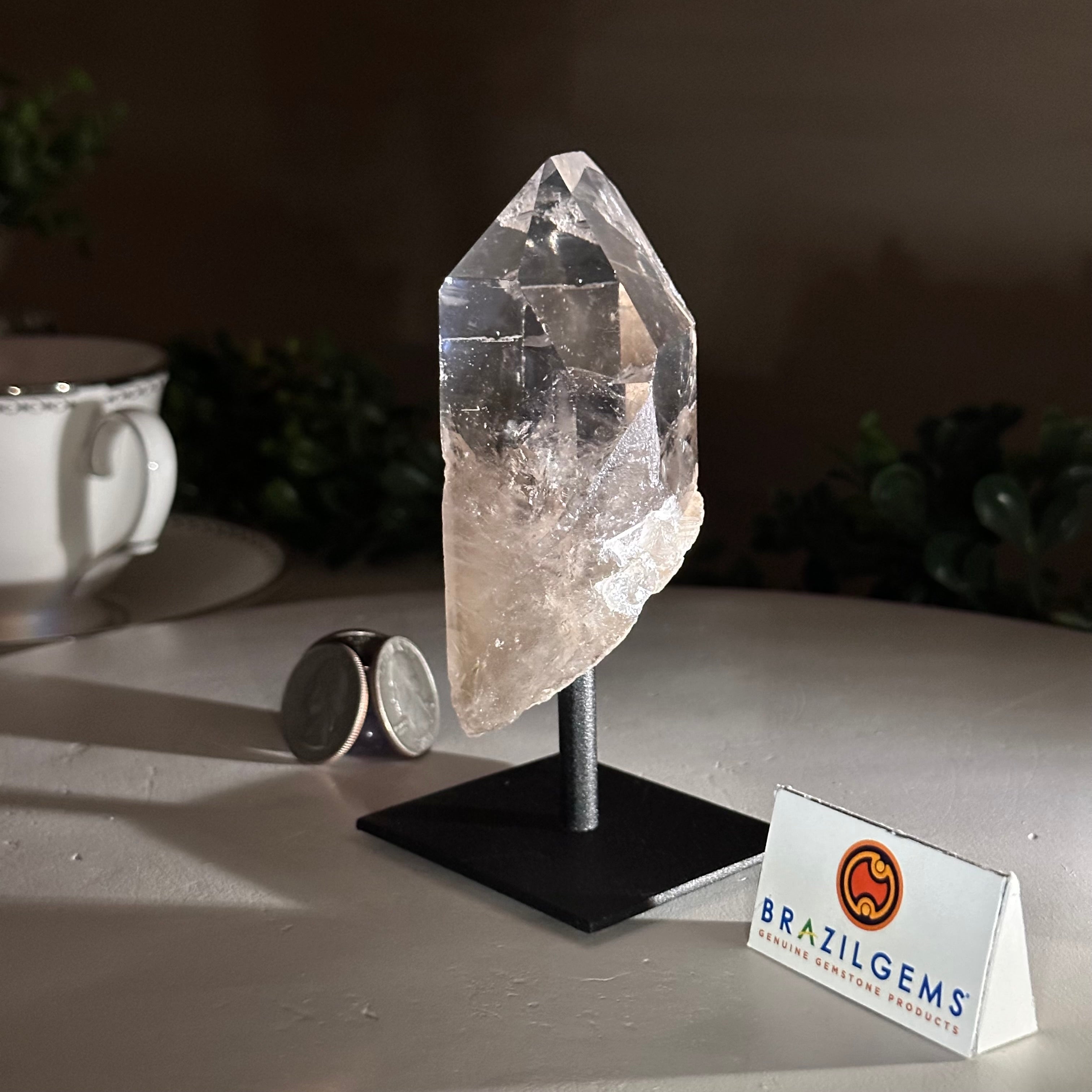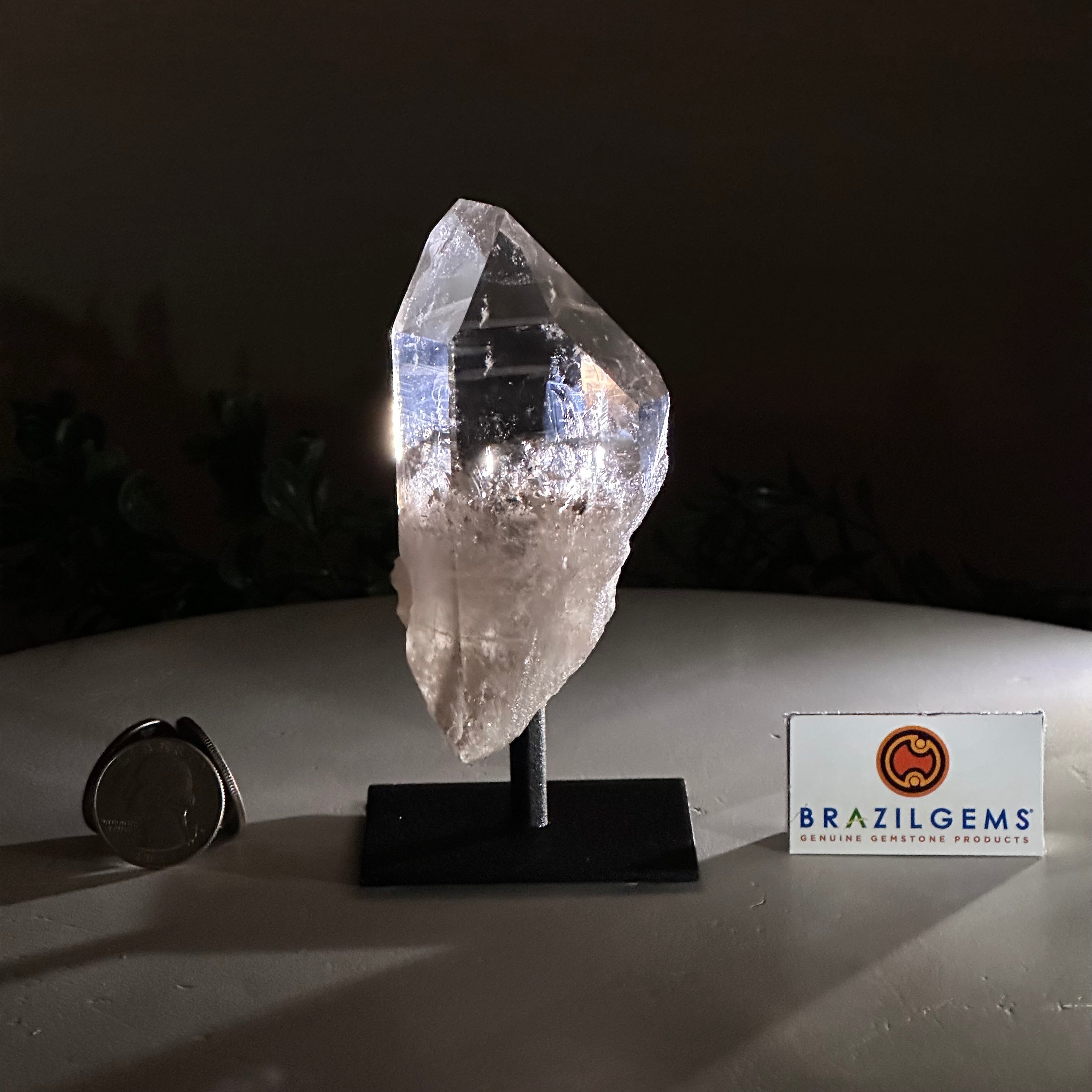 Disclaimer: This is a natural gemstone crystal sold by Brazil Gems® as is and as you see it in its images and video. It is the exact one you will receive. It may contain natural imperfections, scratches, repairs, and/or broken edges from the extraction, polishing, mounting, and prepping processes. A small hole was drilled into the bottom of the crystal in order to mount it on its black painted metal stand. At Brazil Gems® we make every effort to get measurements as exact as possible but they are done by human hands and eyes and therefore may have minor discrepancies.
