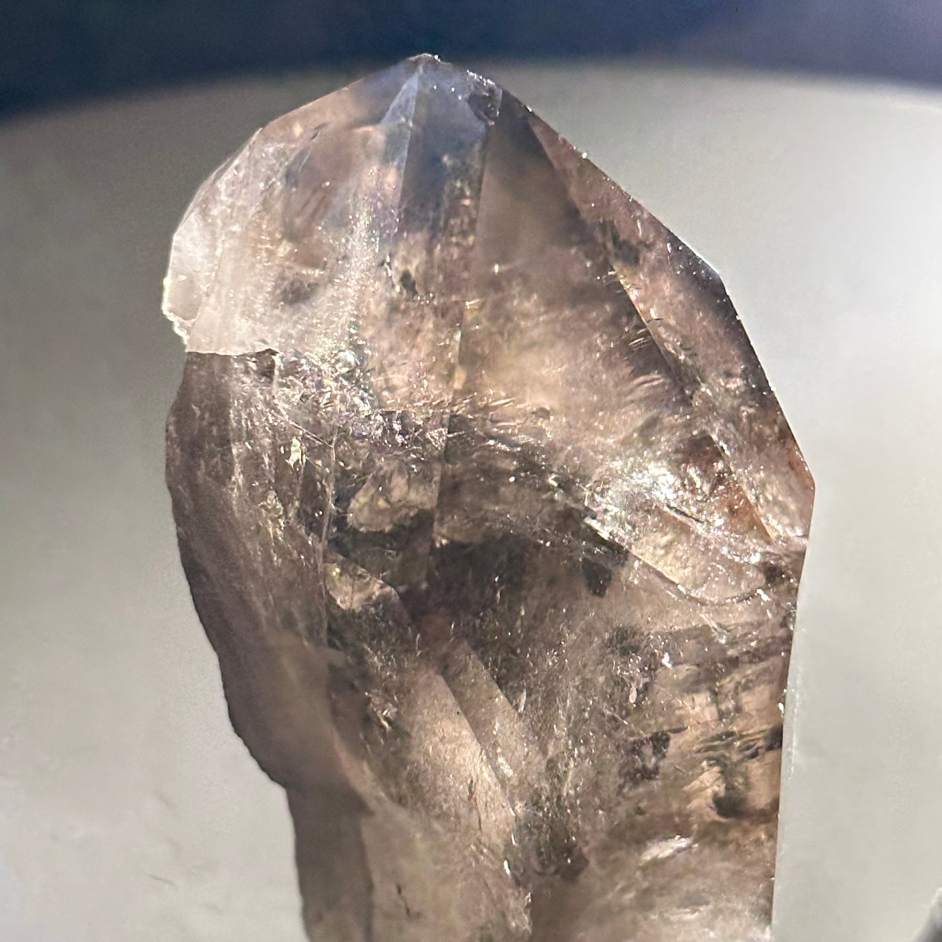 Enhance your home or sacred space with the multi-faceted beauty of this Smoky Quartz Crystal Point on a Metal Stand by Brazil Gems. Crafted from Brazilian Smoky Quartz, this all natural crystal has naturally smooth faces of a 6-sided point on the top, rough side edges, a warm hue and a translucent glow when lit from behind. Its calming presence is perfect for home décor, and its beauty and natural energy will enrich any environment.