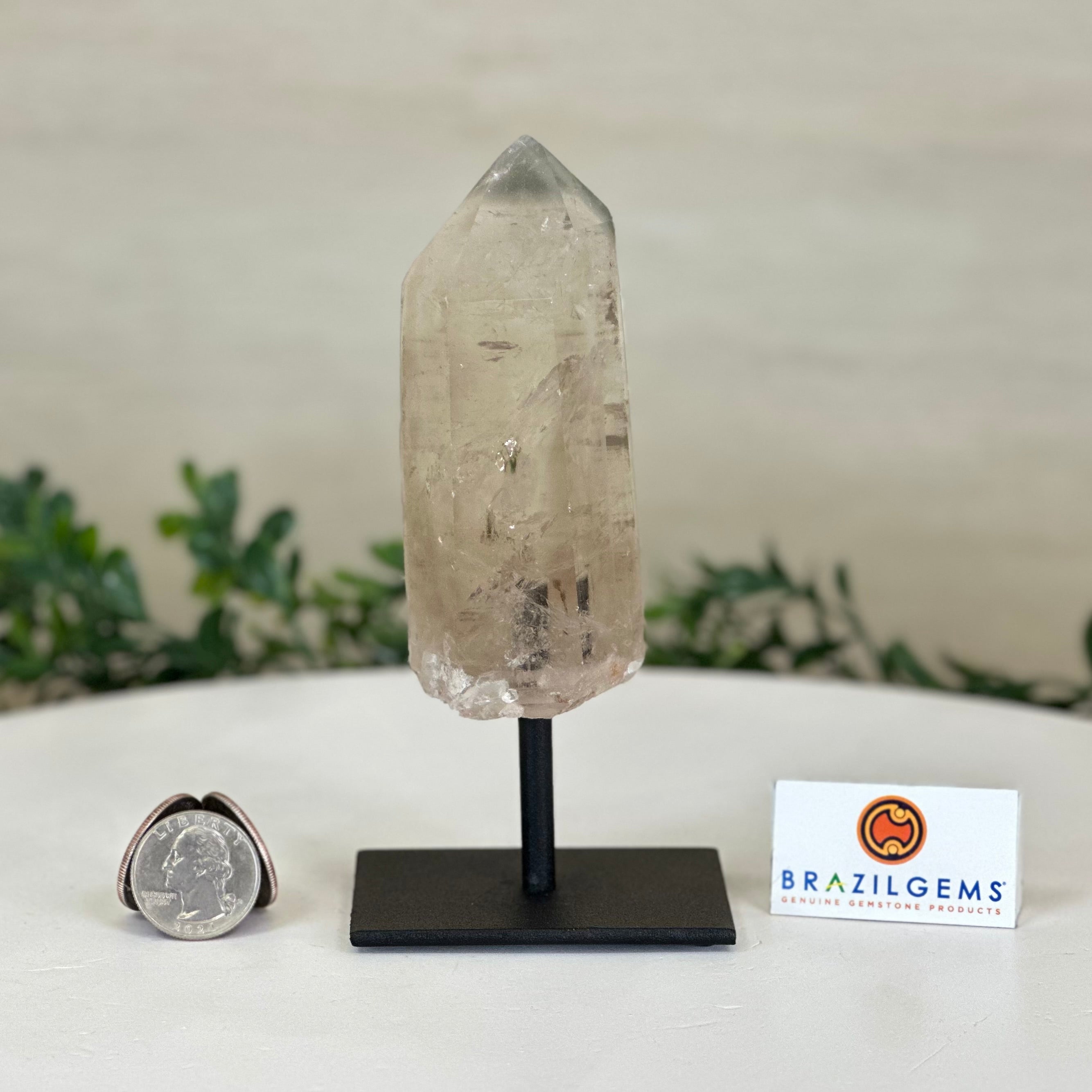 Enhance your home or sacred space with the multi-faceted beauty of this Smoky Quartz Crystal Point on a Metal Stand by Brazil Gems. Crafted from Brazilian Smoky Quartz, this all natural crystal has naturally smooth faces of a 6-sided point on the top, rough side edges, a warm hue and a translucent glow when lit from behind. Its calming presence is perfect for home décor, and its beauty and natural energy will enrich any environment.
