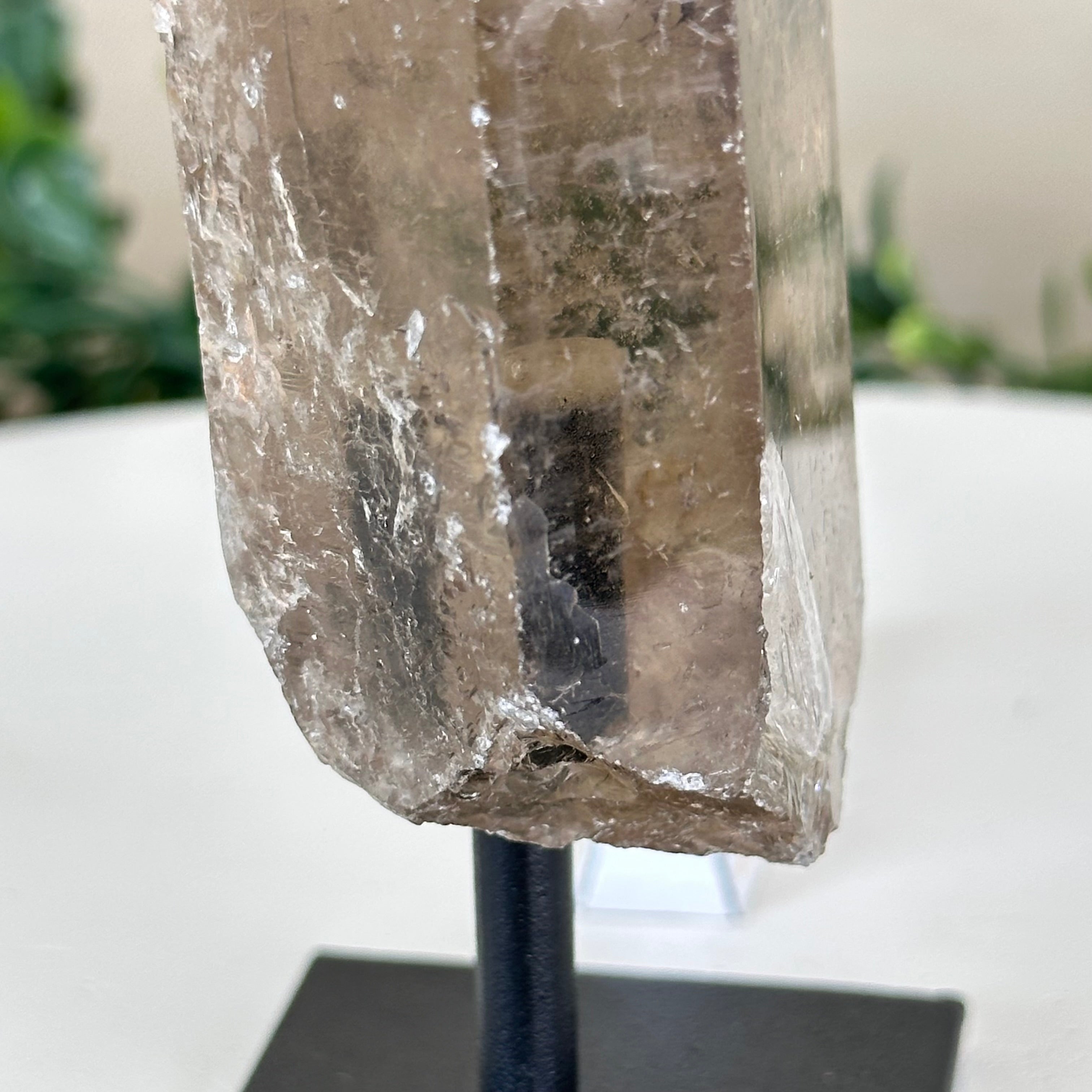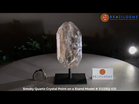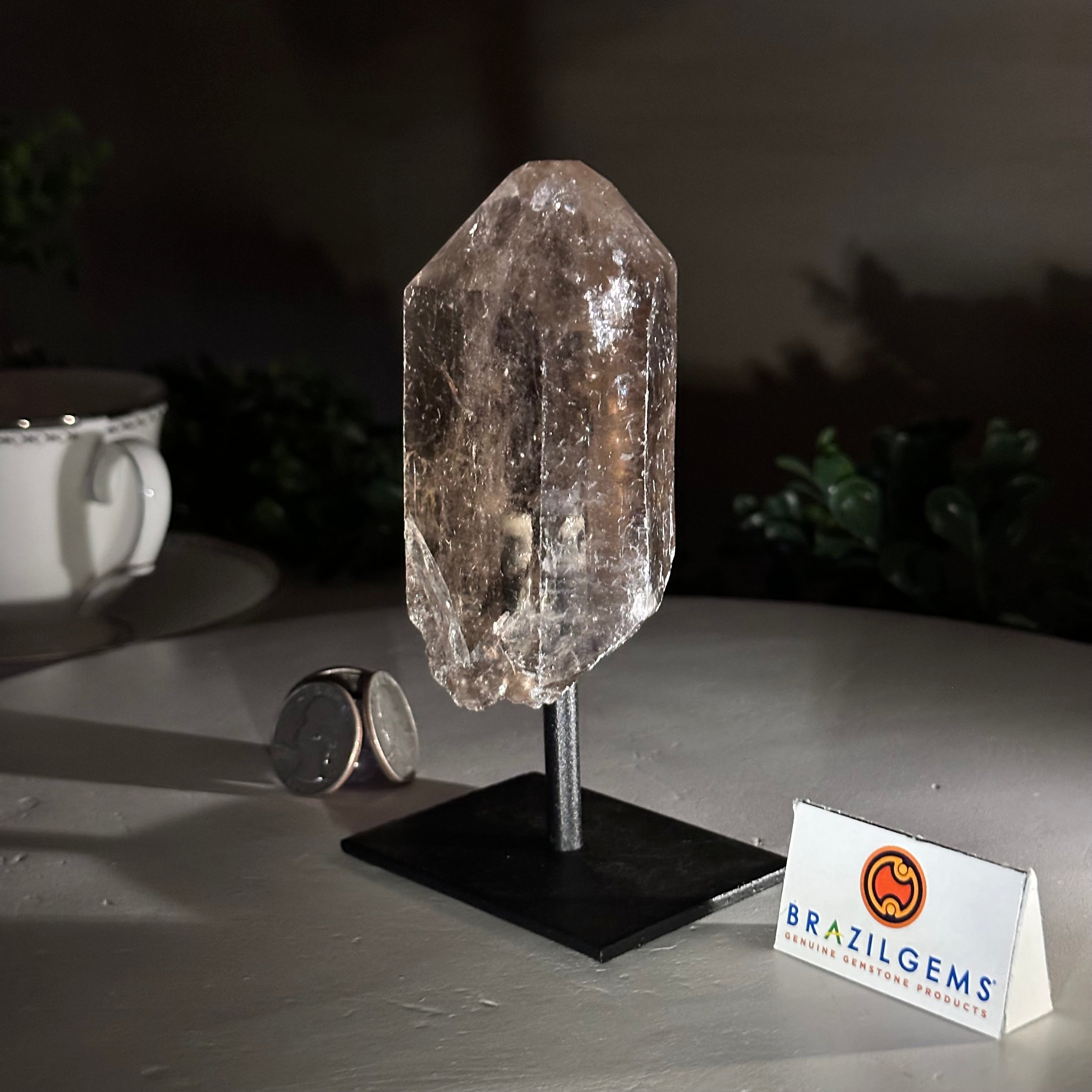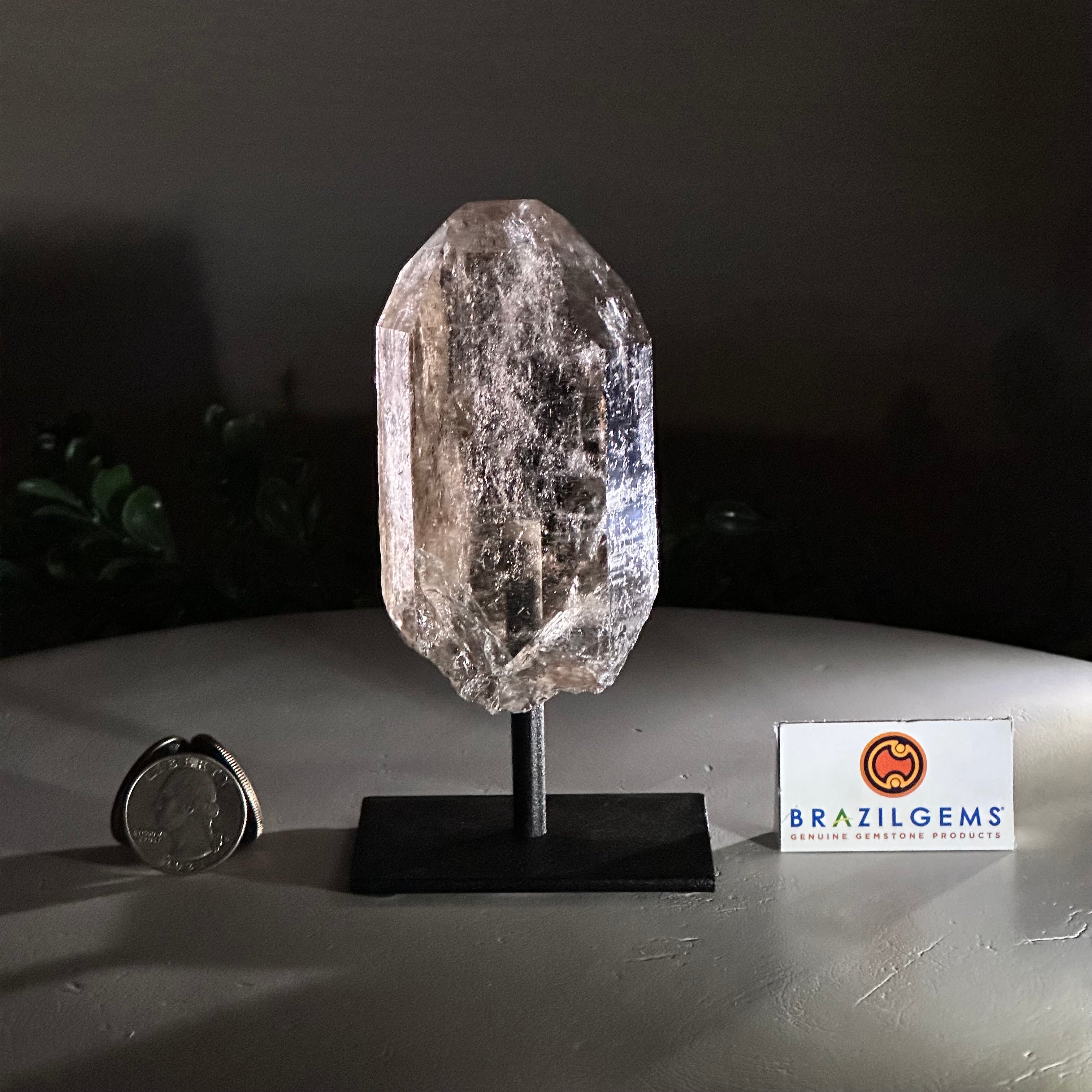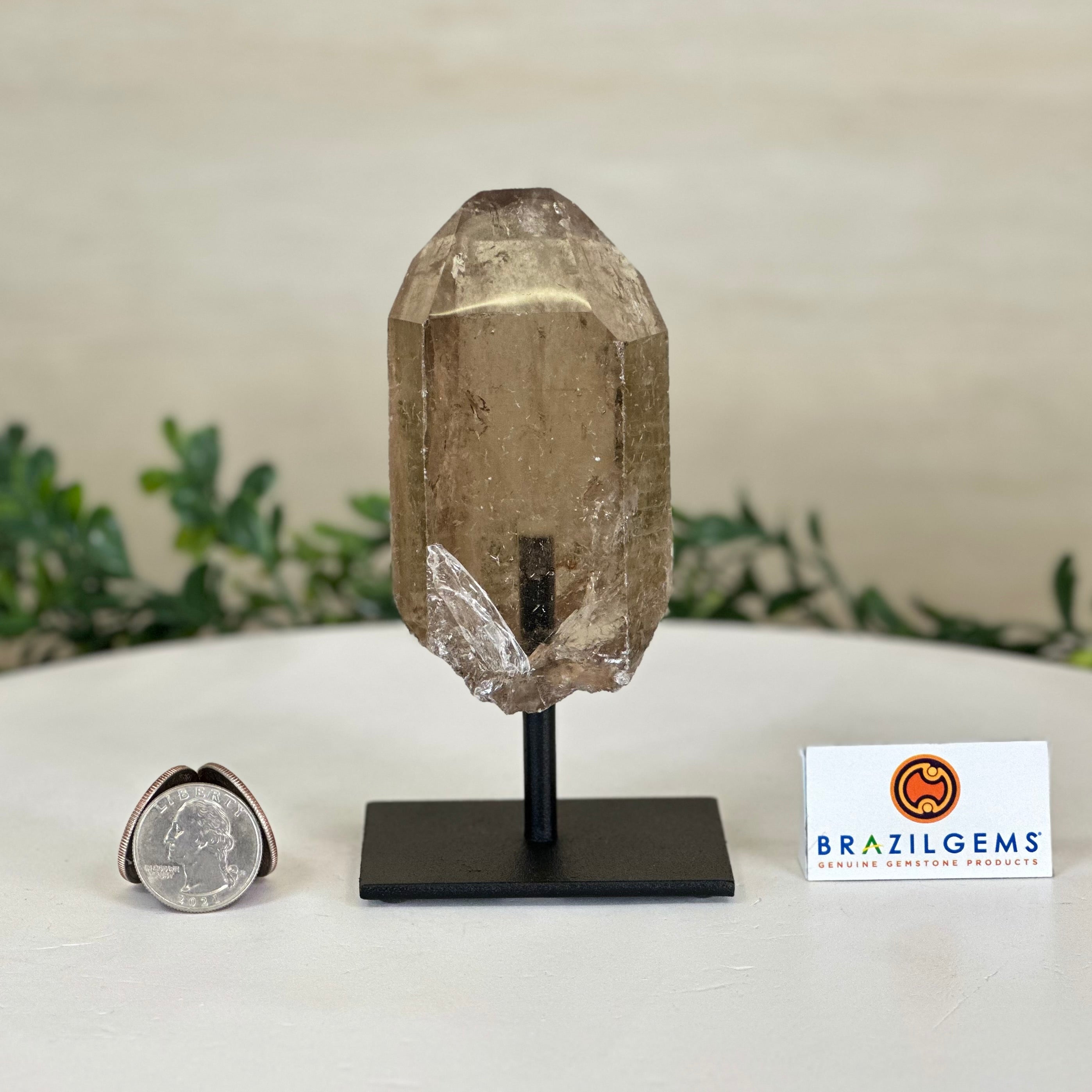 Enhance your home or sacred space with the multi-faceted beauty of this Smoky Quartz Crystal Point on a Metal Stand by Brazil Gems. Crafted from Brazilian Smoky Quartz, this all natural crystal has naturally smooth faces of a 6-sided point on the top, rough side edges, a warm hue and a translucent glow when lit from behind. Its calming presence is perfect for home décor, and its beauty and natural energy will enrich any environment.