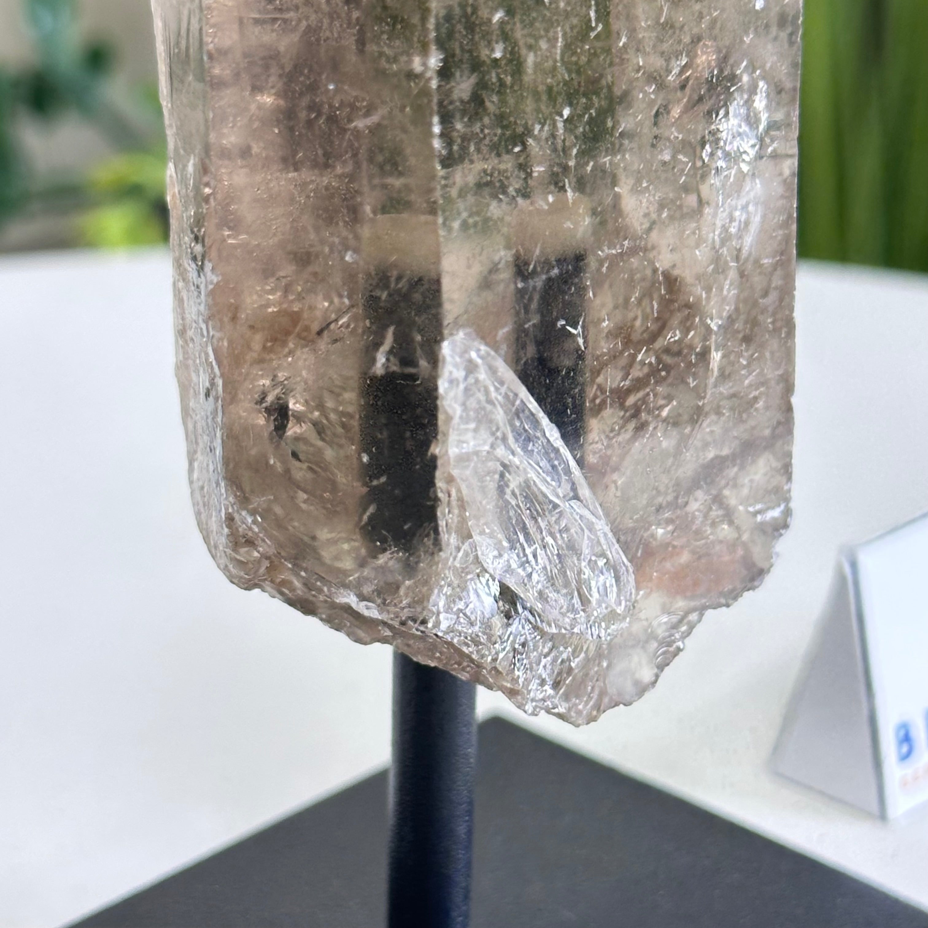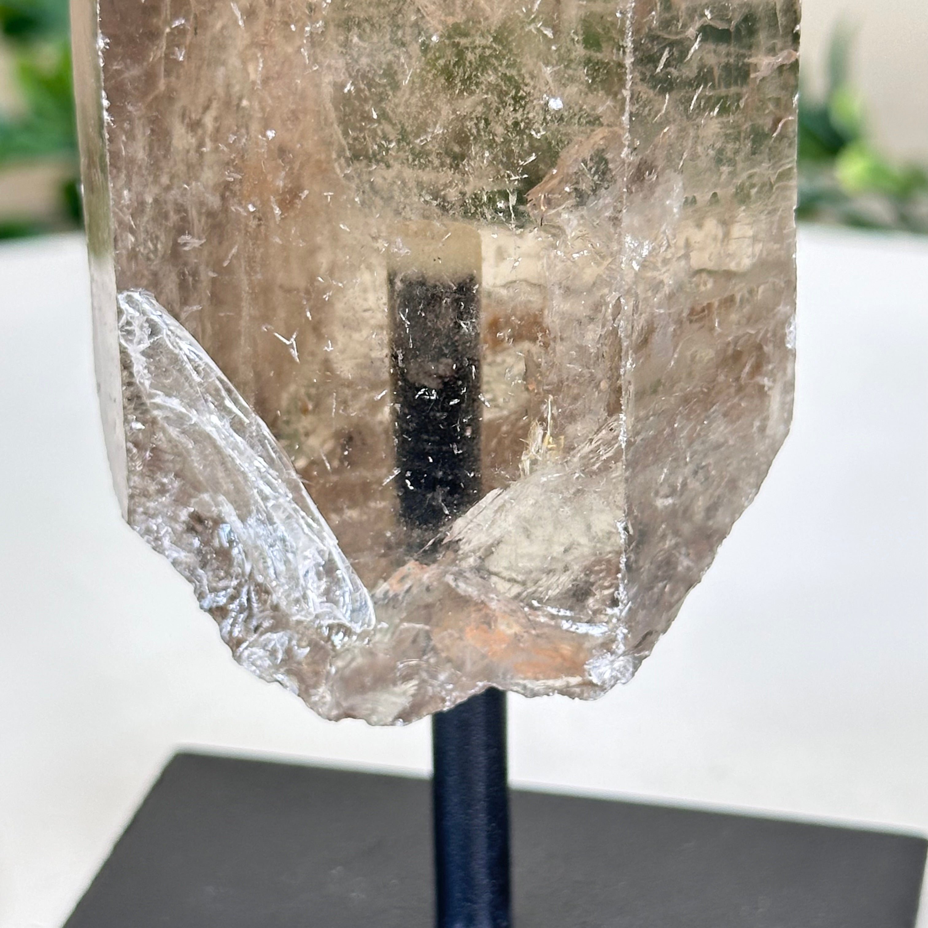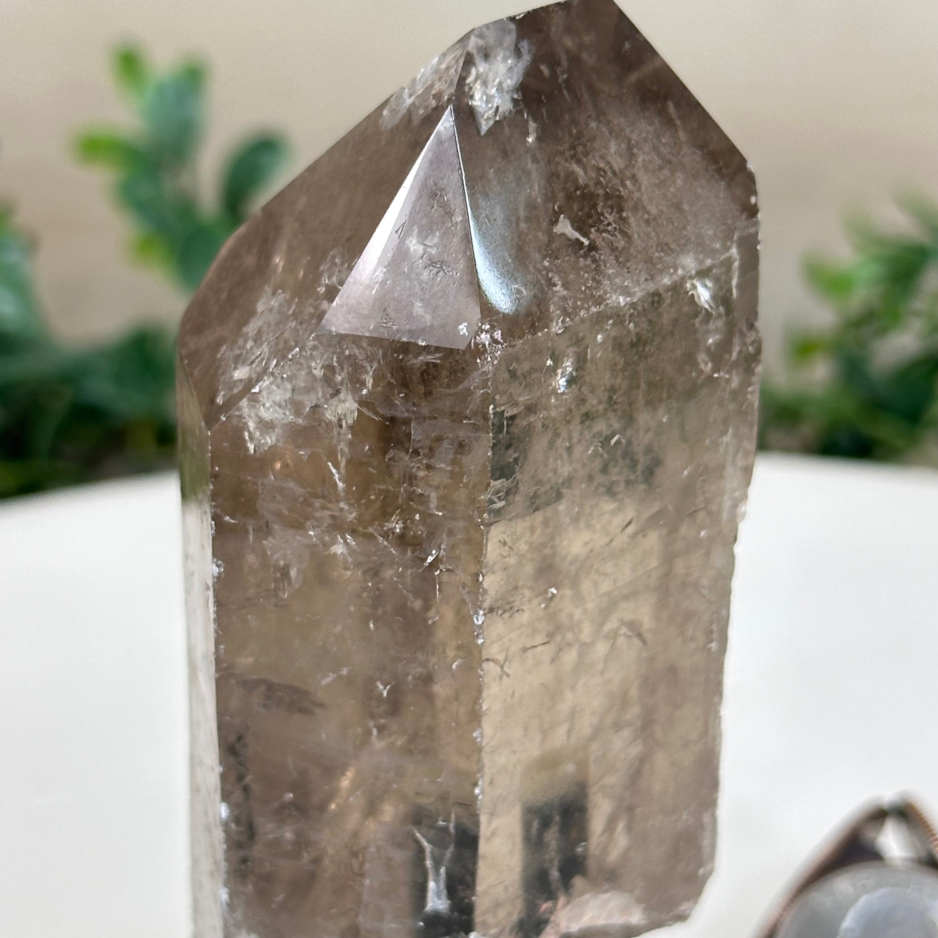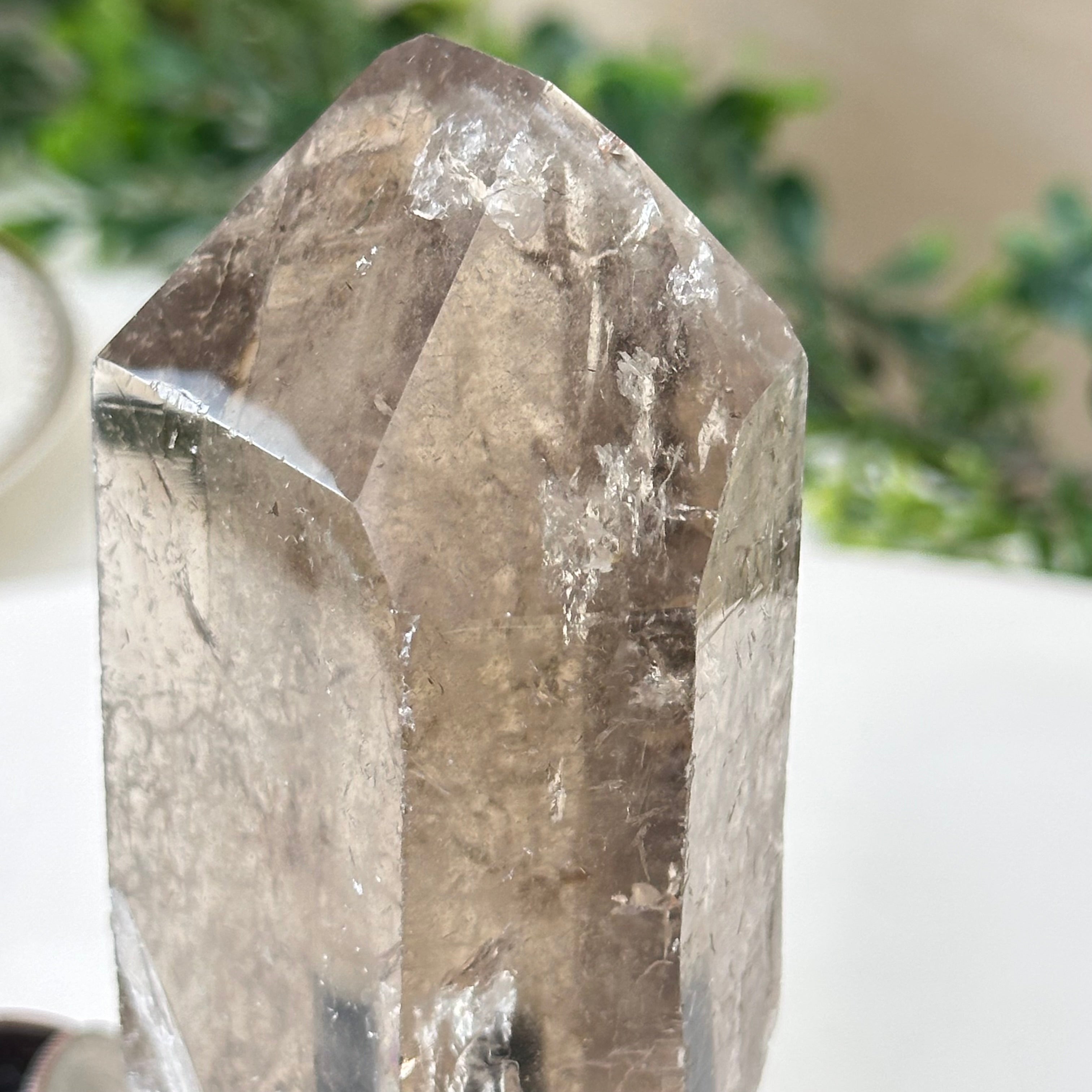 Enhance your home or sacred space with the multi-faceted beauty of this Smoky Quartz Crystal Point on a Metal Stand by Brazil Gems. Crafted from Brazilian Smoky Quartz, this all natural crystal has naturally smooth faces of a 6-sided point on the top, rough side edges, a warm hue and a translucent glow when lit from behind. Its calming presence is perfect for home décor, and its beauty and natural energy will enrich any environment.