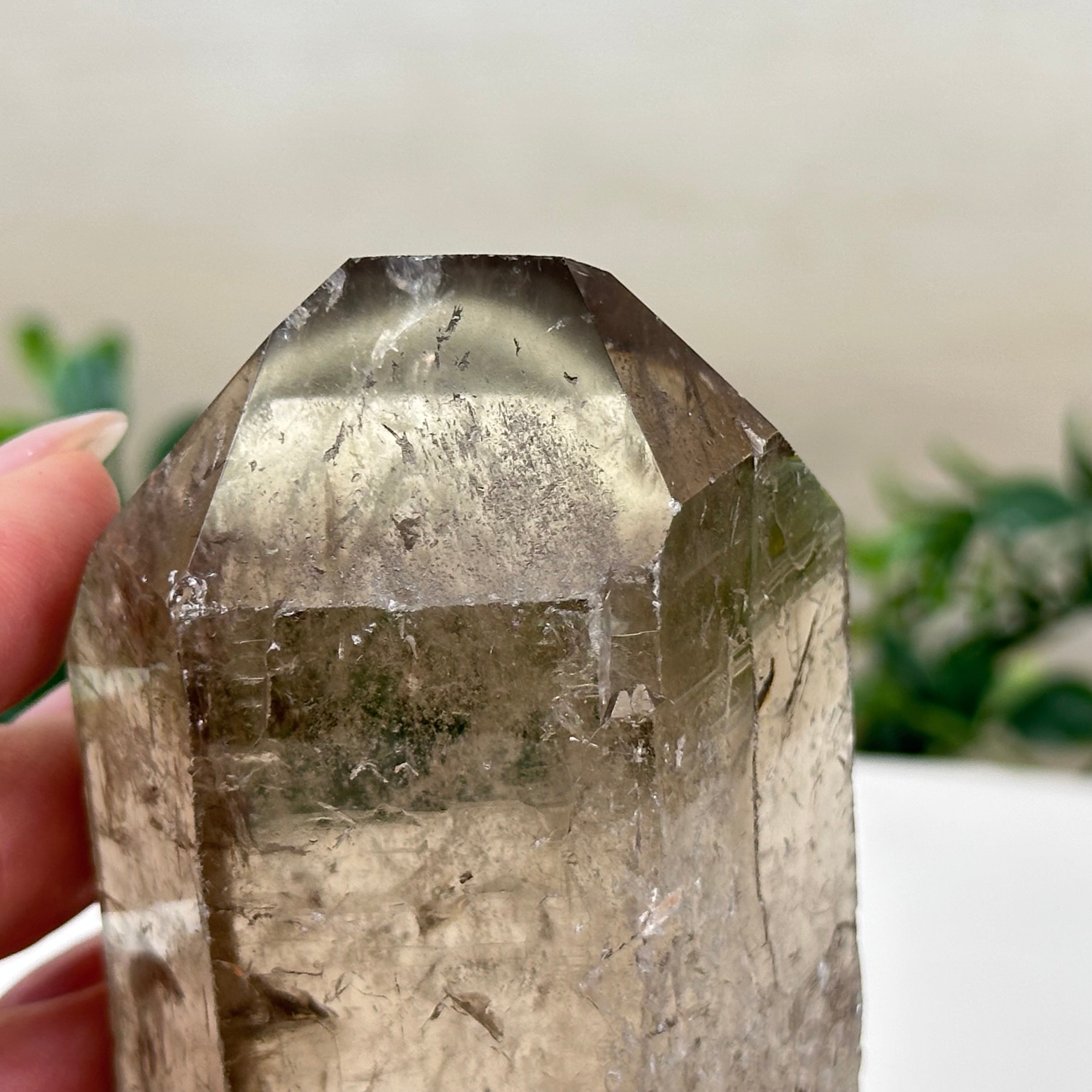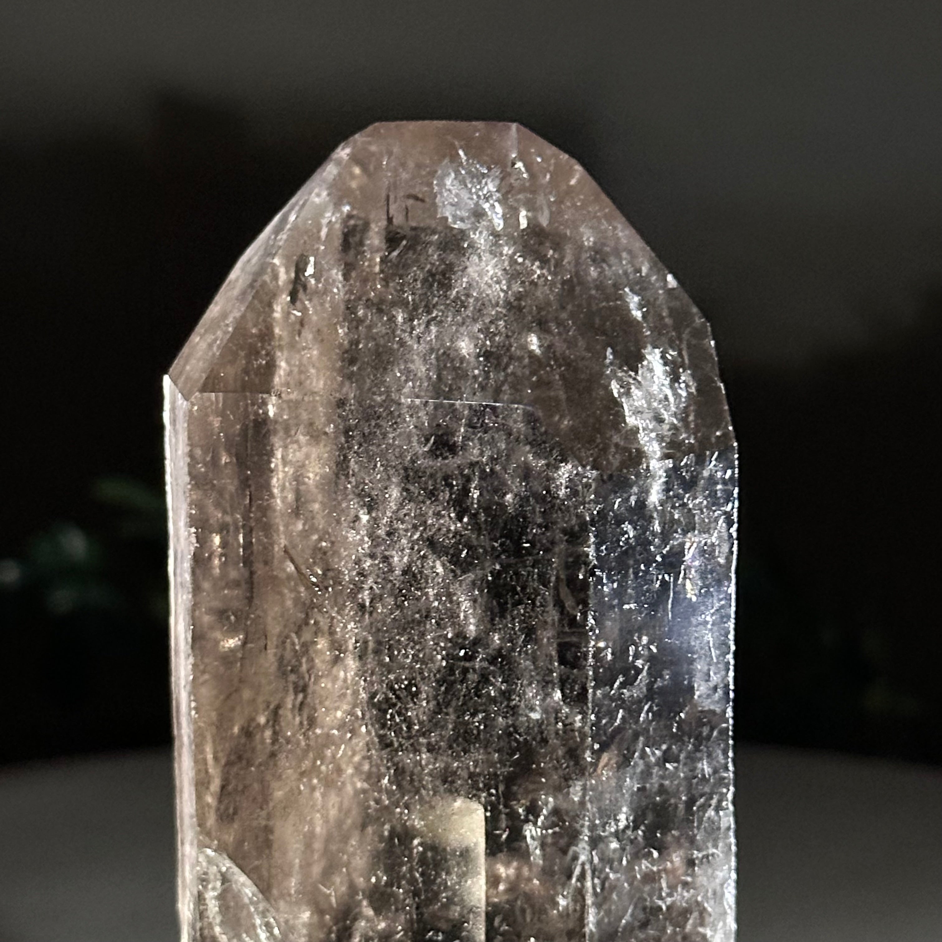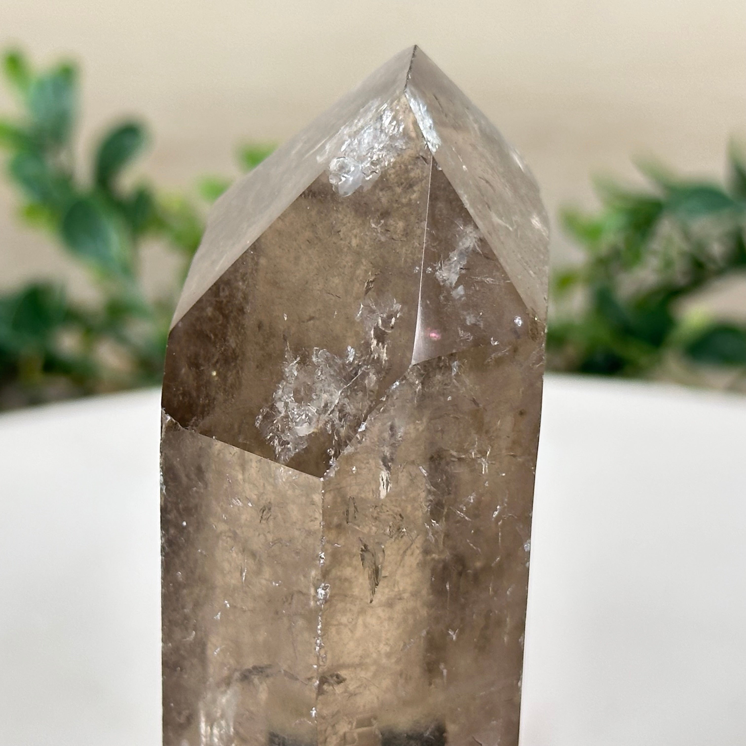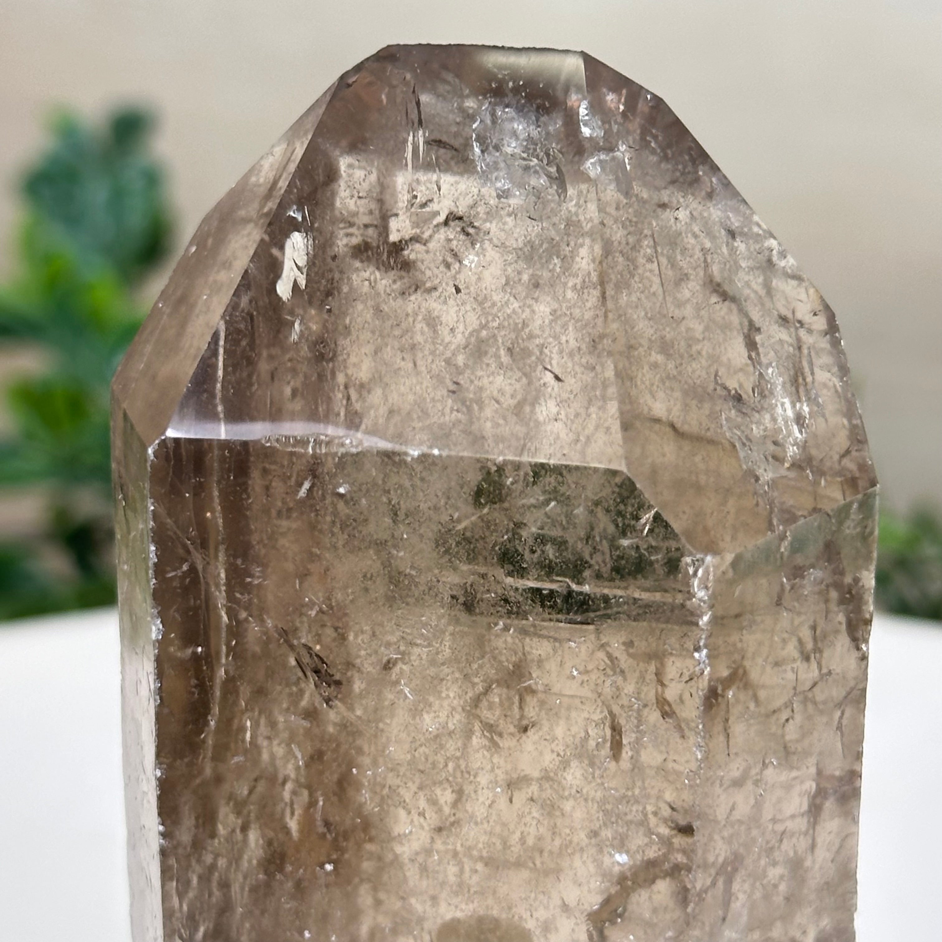 Enhance your home or sacred space with the multi-faceted beauty of this Smoky Quartz Crystal Point on a Metal Stand by Brazil Gems. Crafted from Brazilian Smoky Quartz, this all natural crystal has naturally smooth faces of a 6-sided point on the top, rough side edges, a warm hue and a translucent glow when lit from behind. Its calming presence is perfect for home décor, and its beauty and natural energy will enrich any environment.
