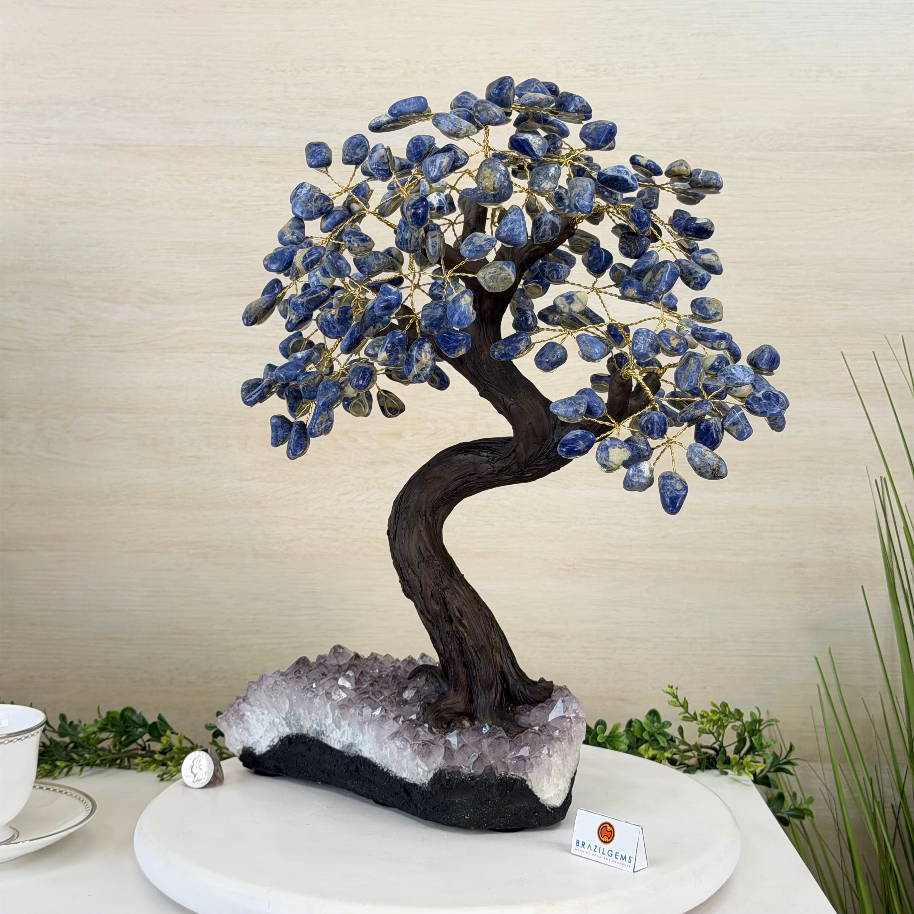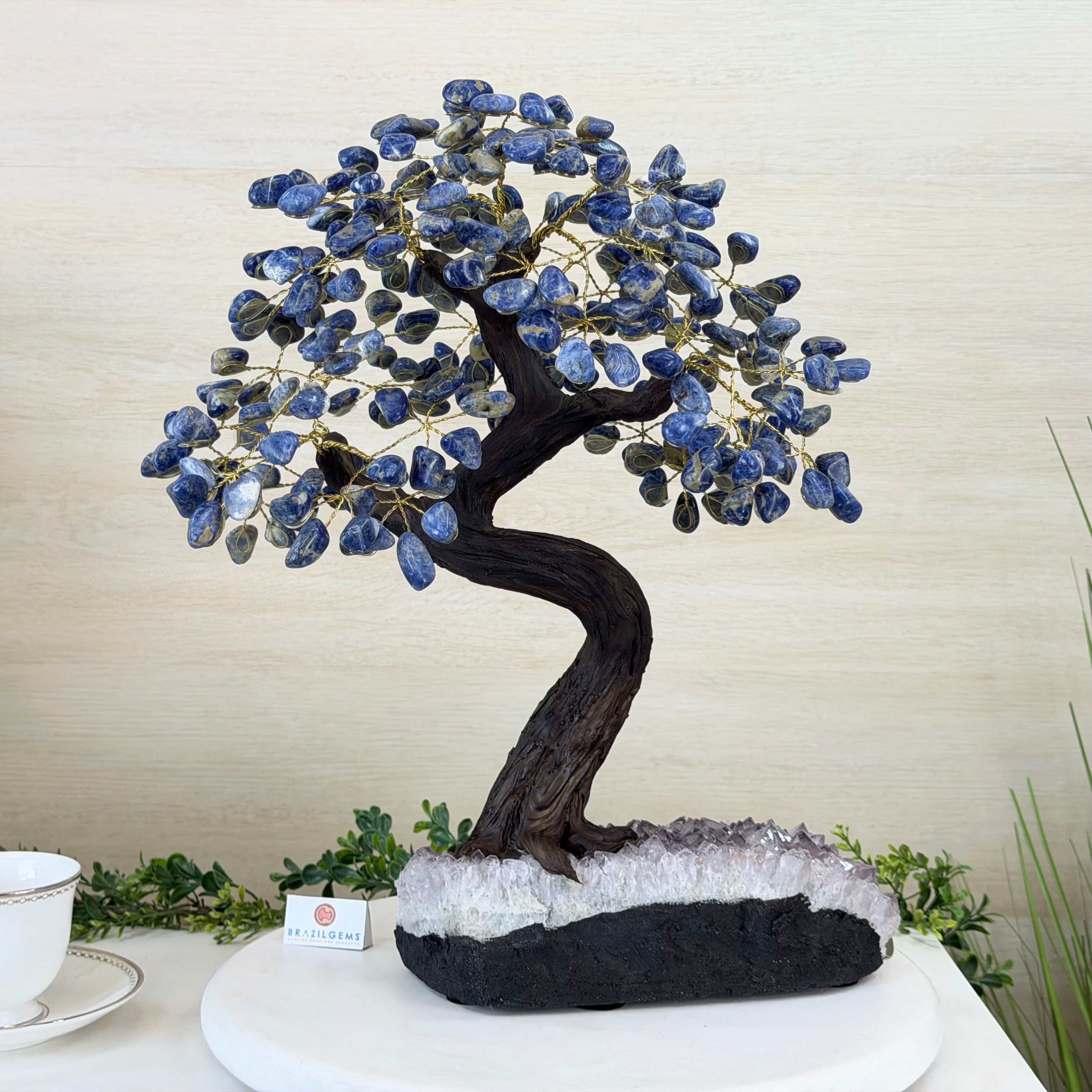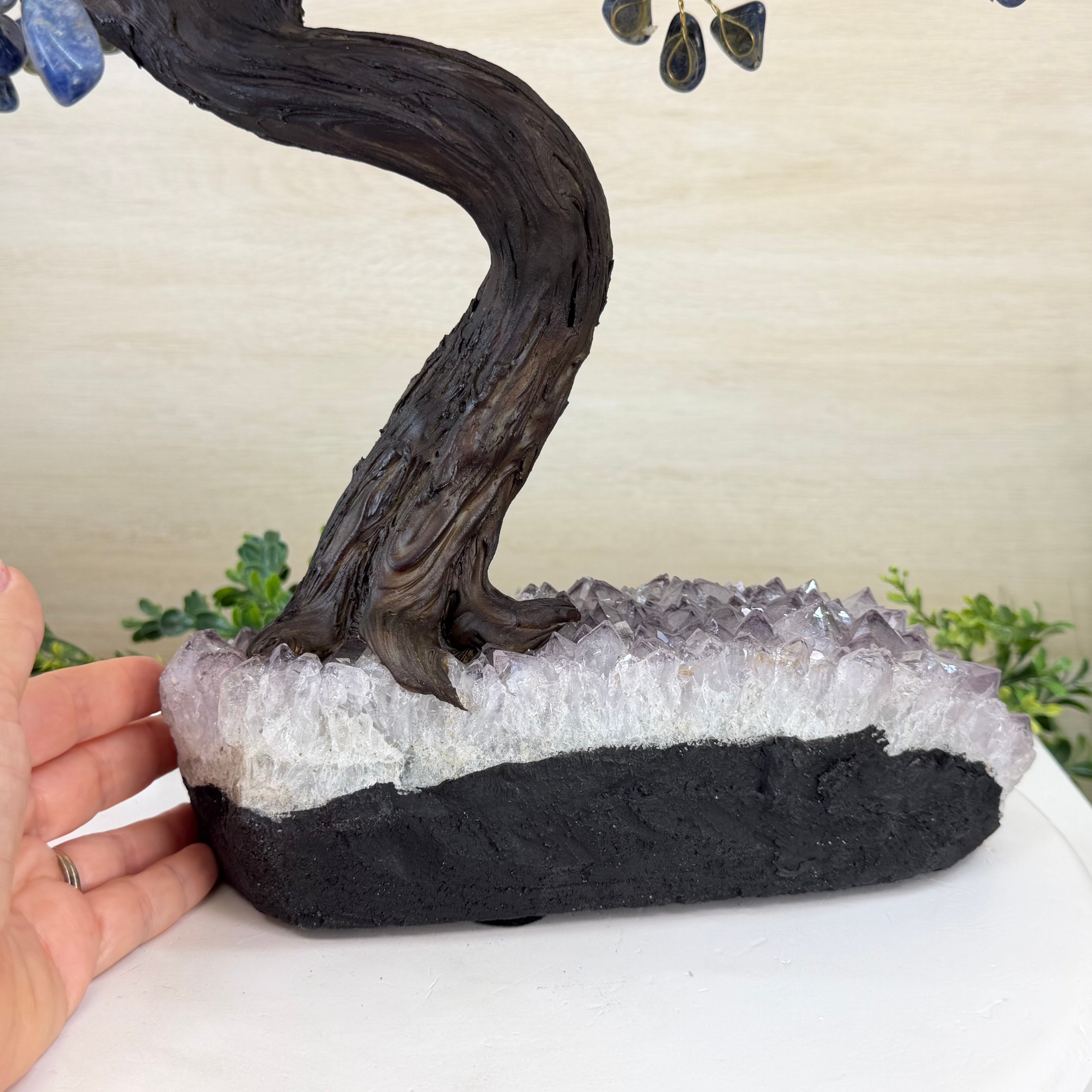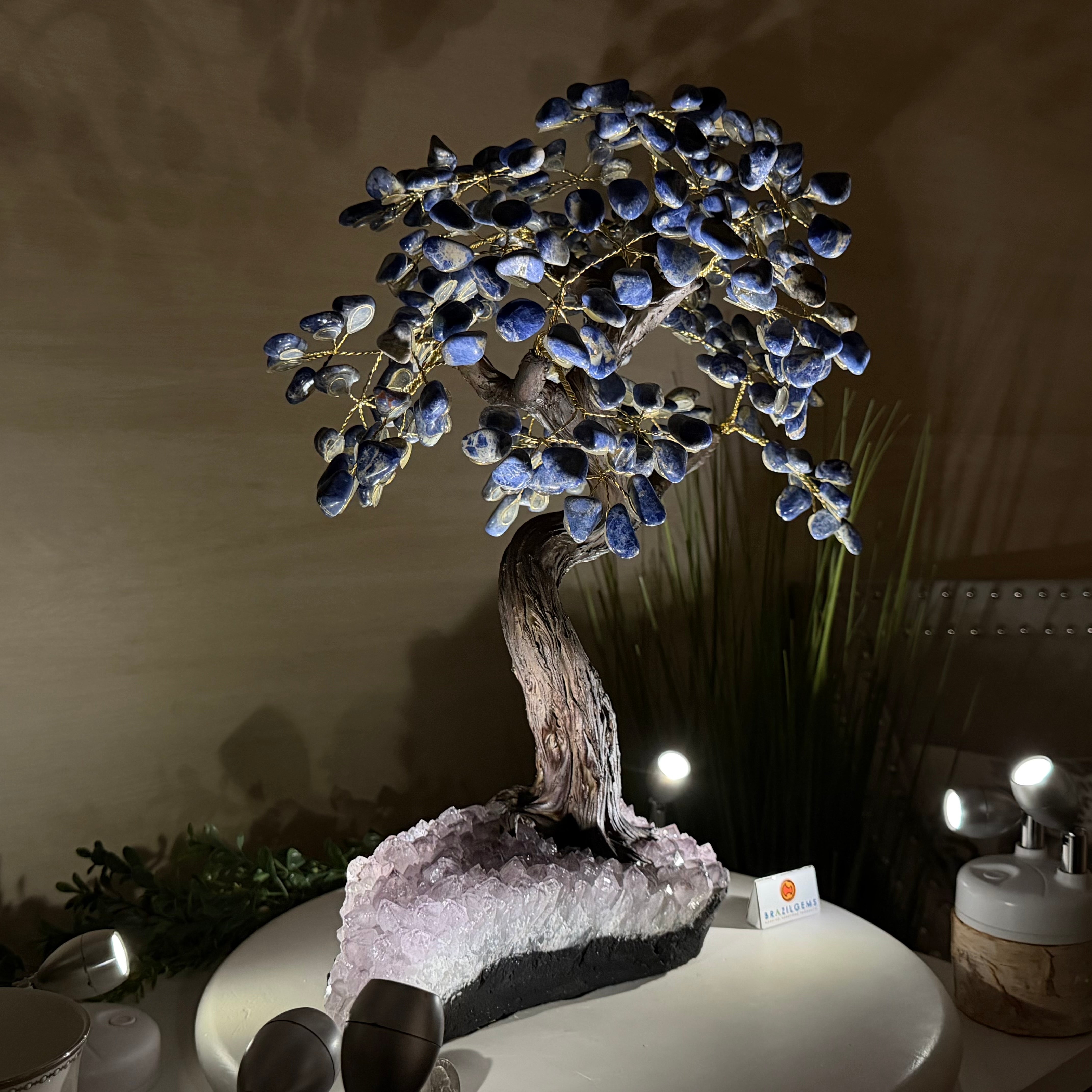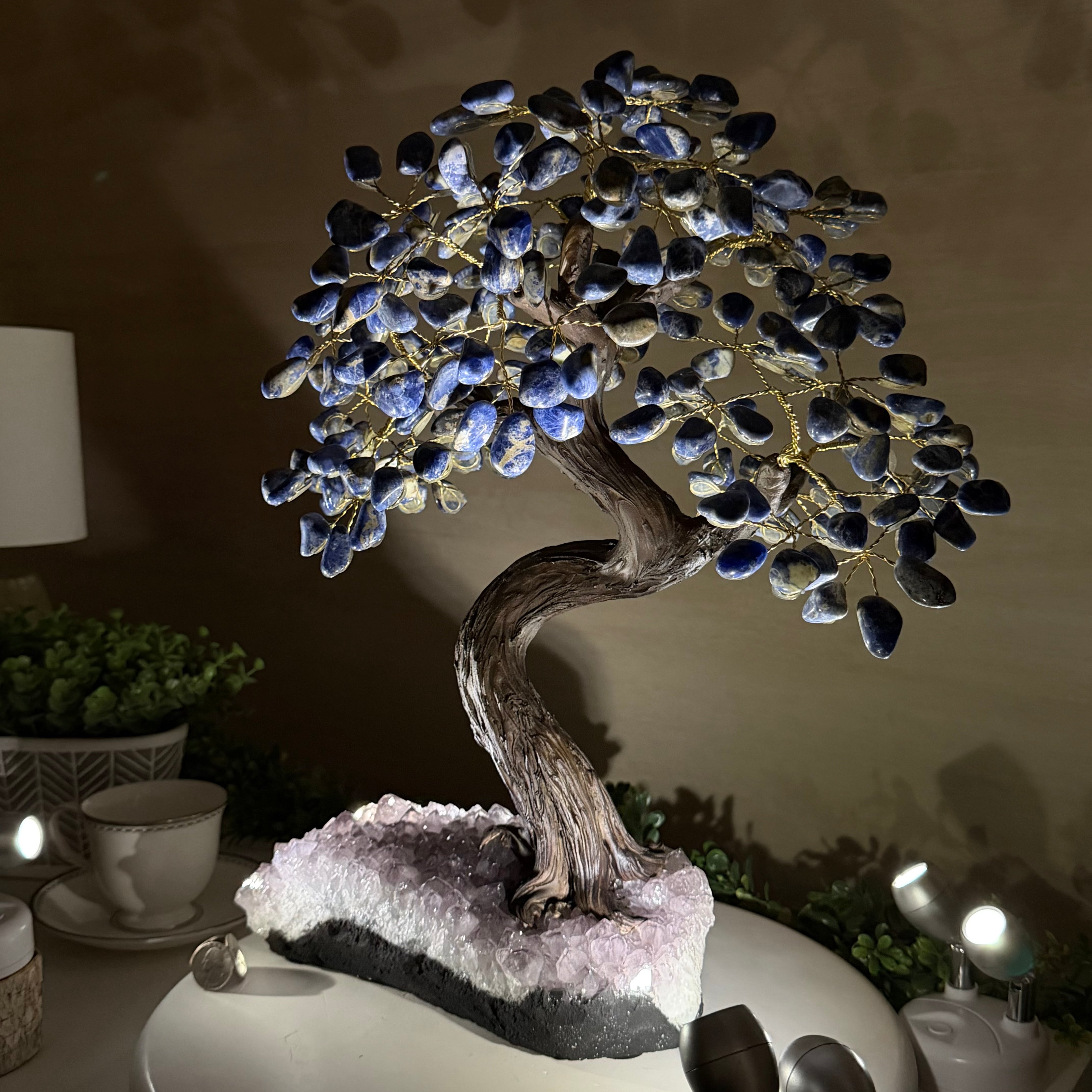 Sodalite Bonsai Gemstone Tree on an Amethyst Cluster Base Handcrafted in Brazil, this striking gemstone tree stands approximately 17" tall and features a sturdy bonsai-style trunk and branches adorned with 240 tumbled Sodalite gemstones as its leaves.