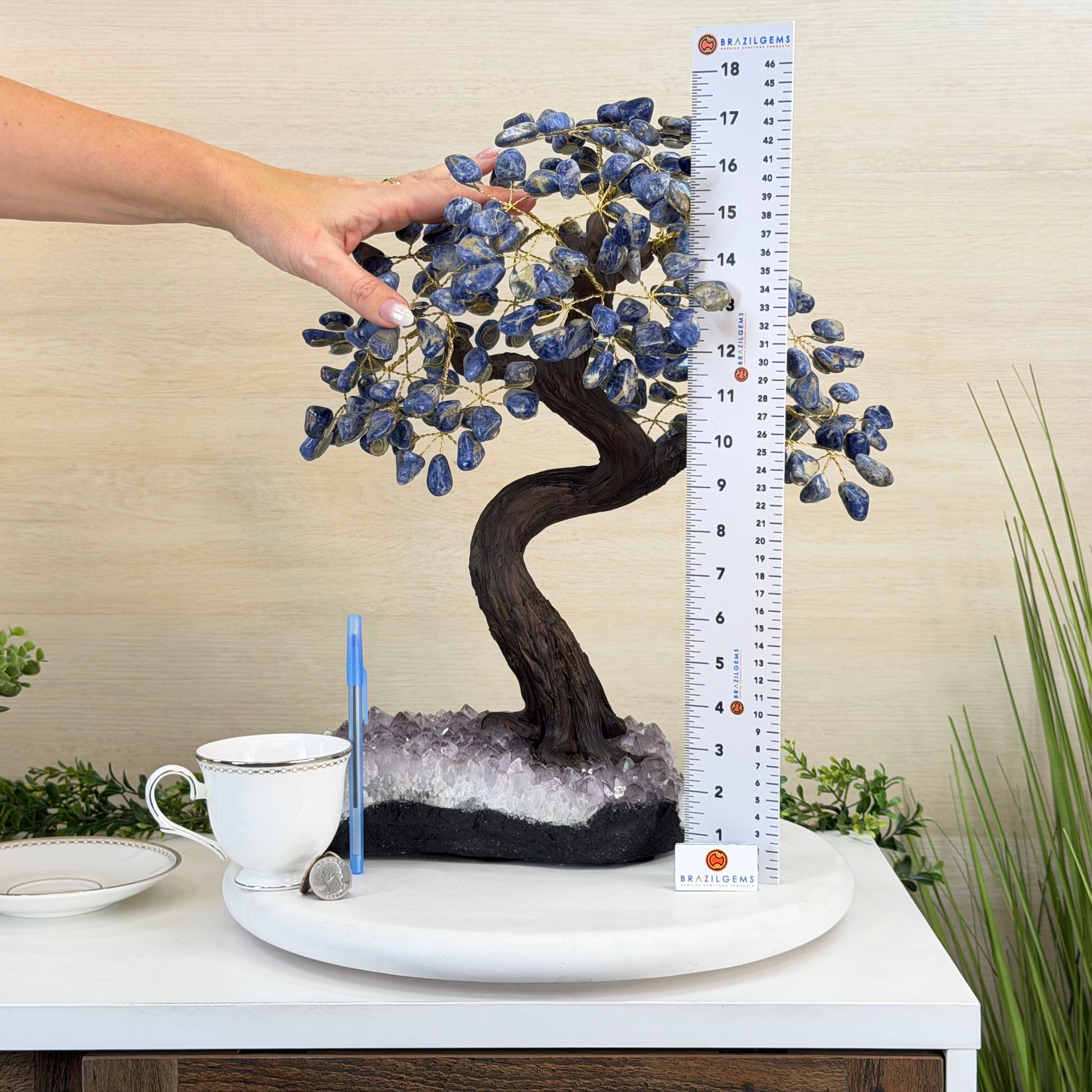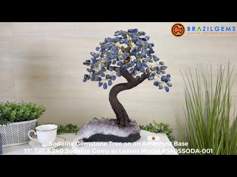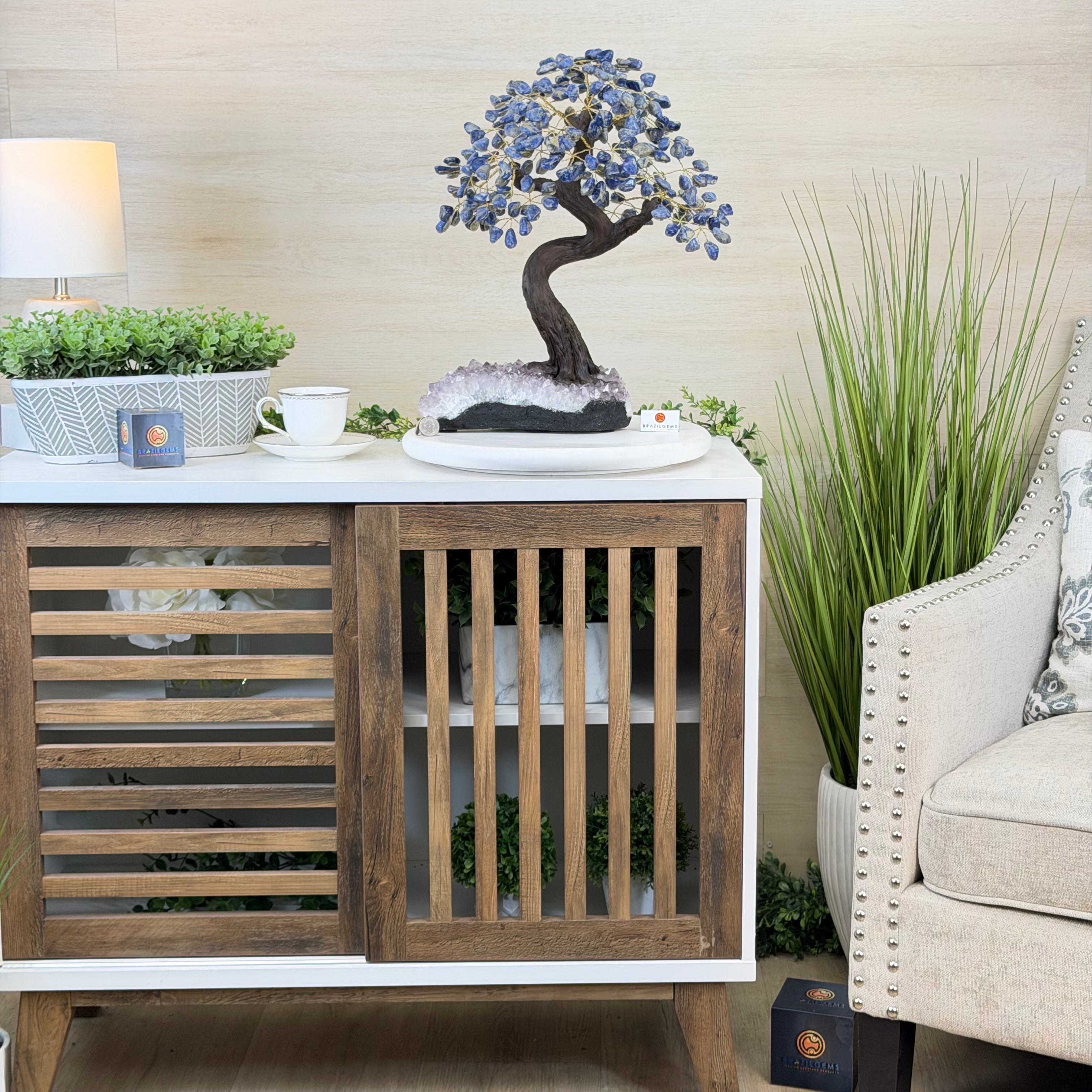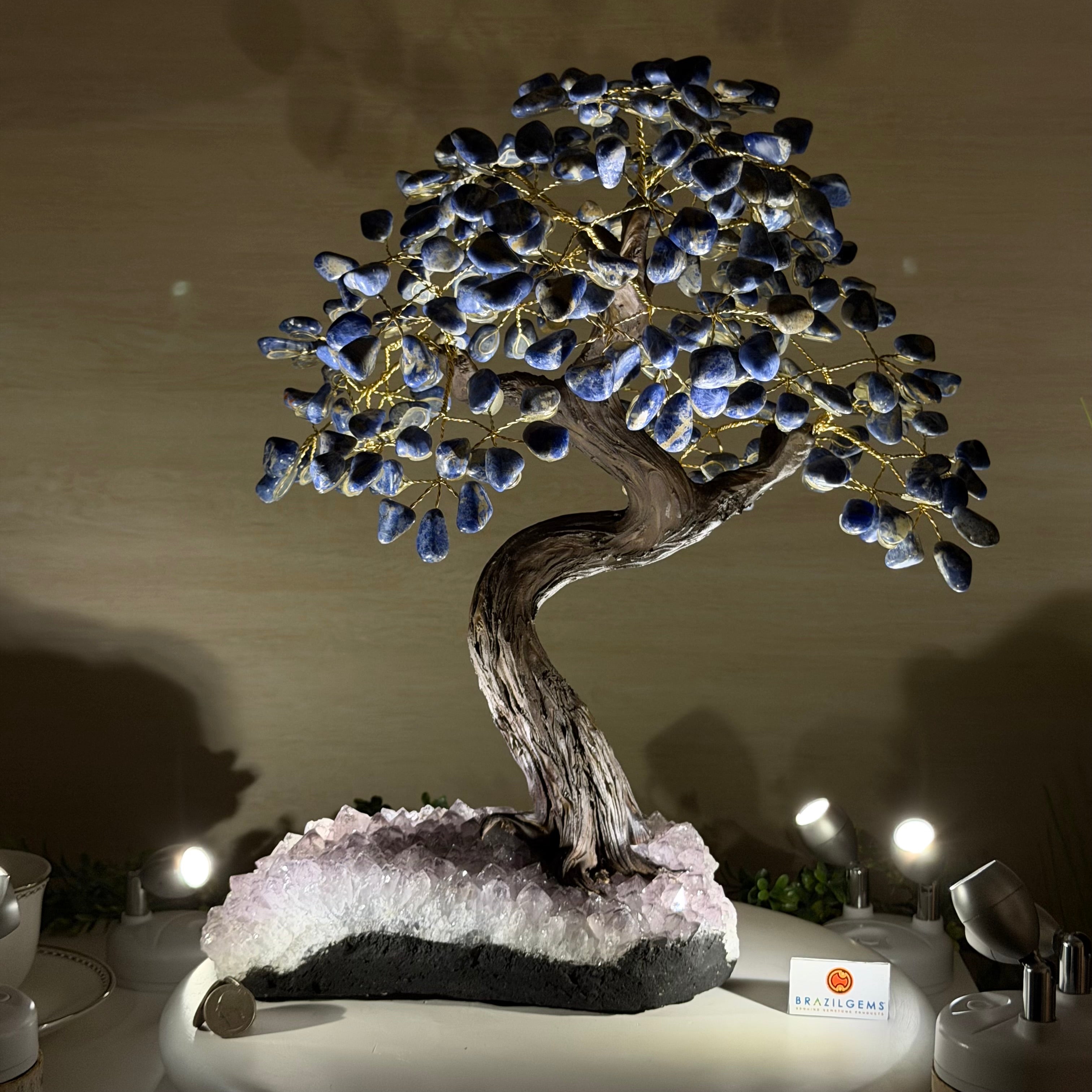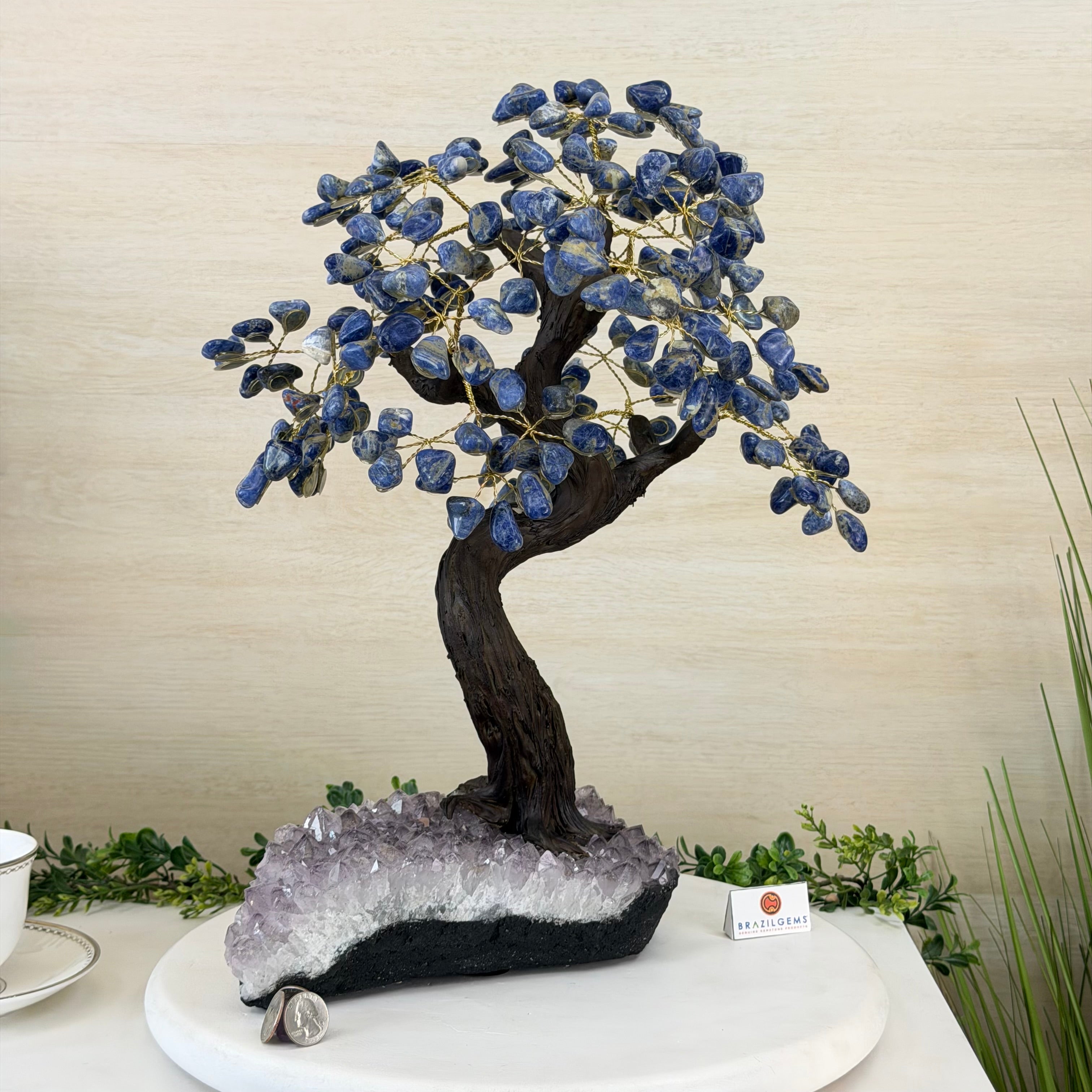 Sodalite Bonsai Gemstone Tree on an Amethyst Cluster Base Handcrafted in Brazil, this striking gemstone tree stands approximately 17" tall and features a sturdy bonsai-style trunk and branches adorned with 240 tumbled Sodalite gemstones as its leaves.