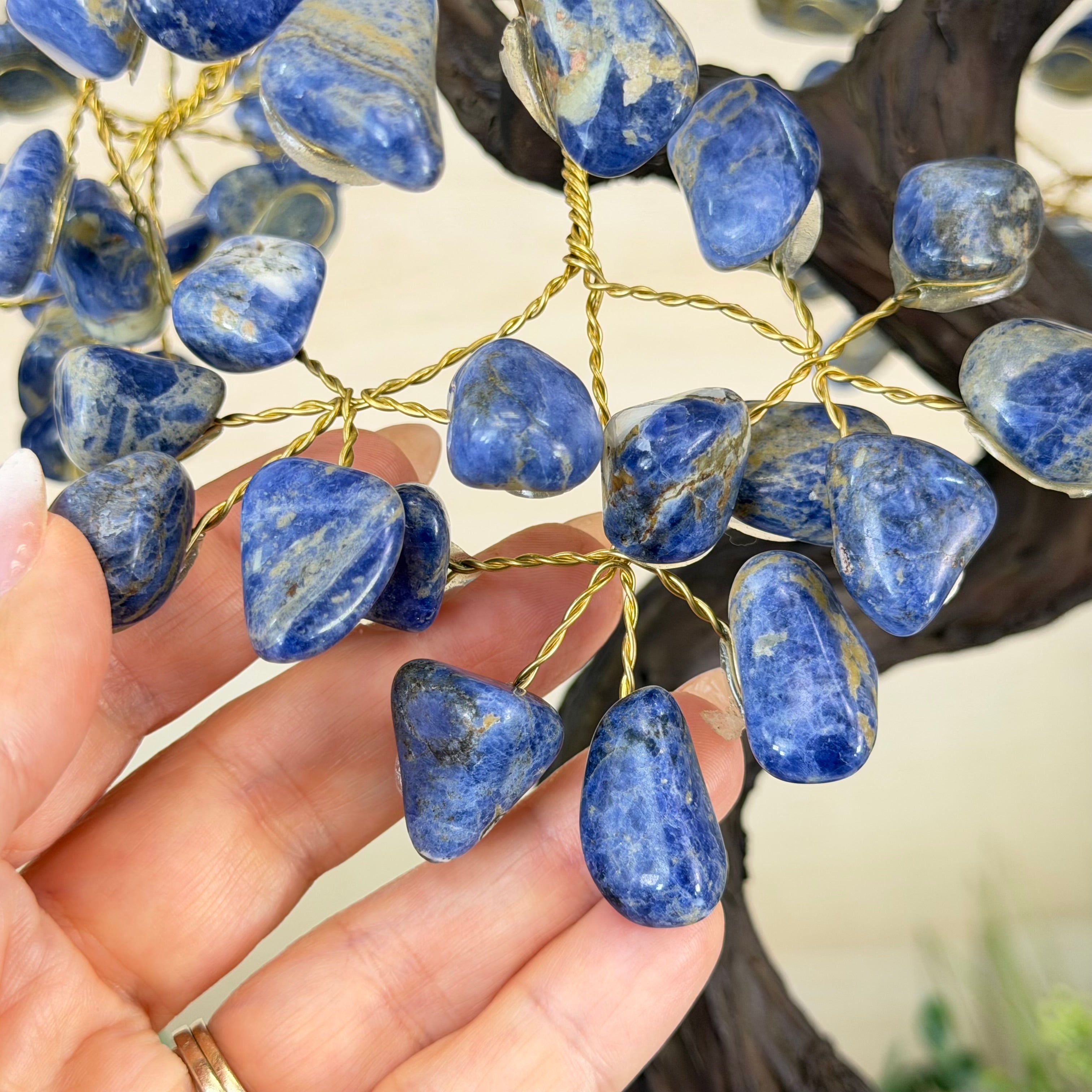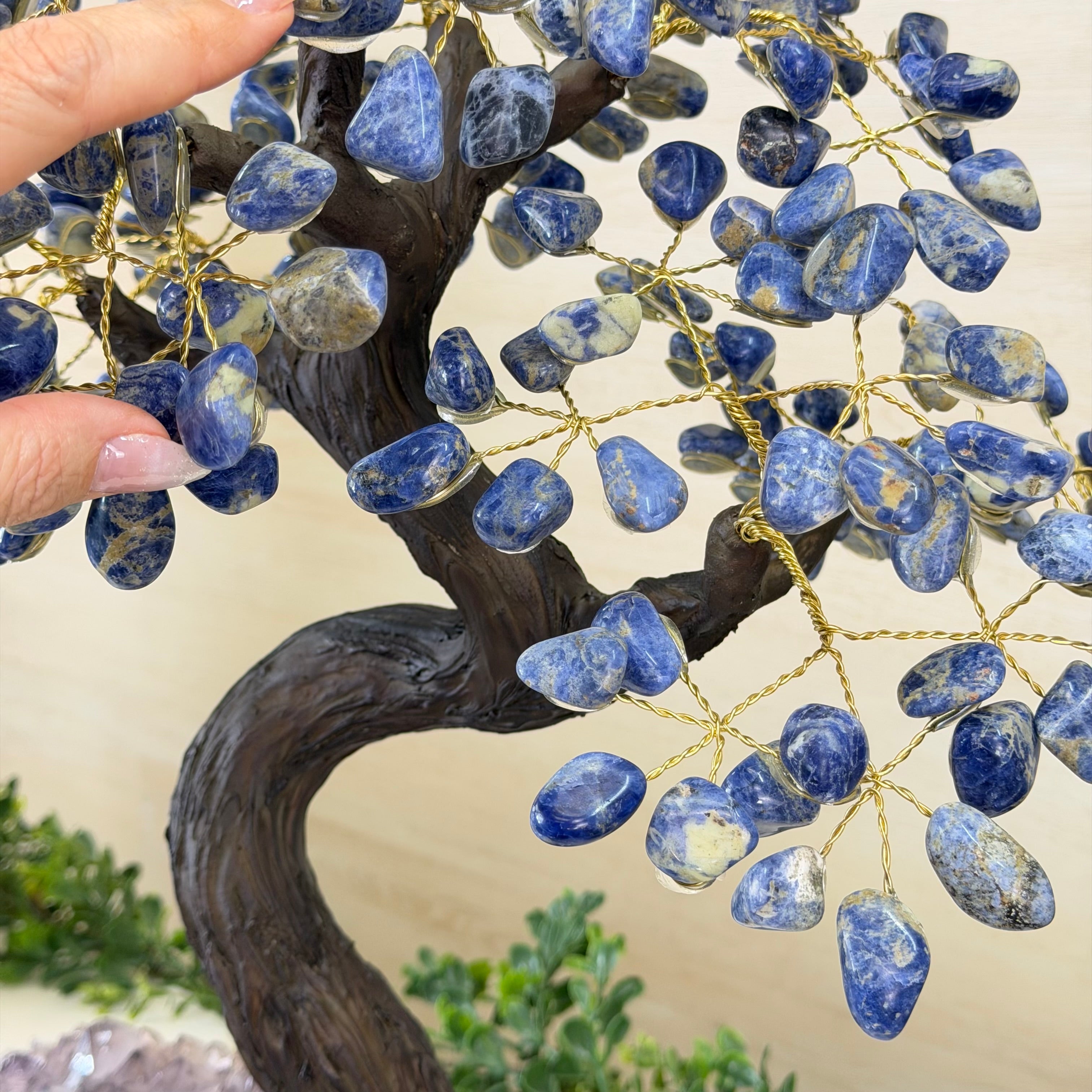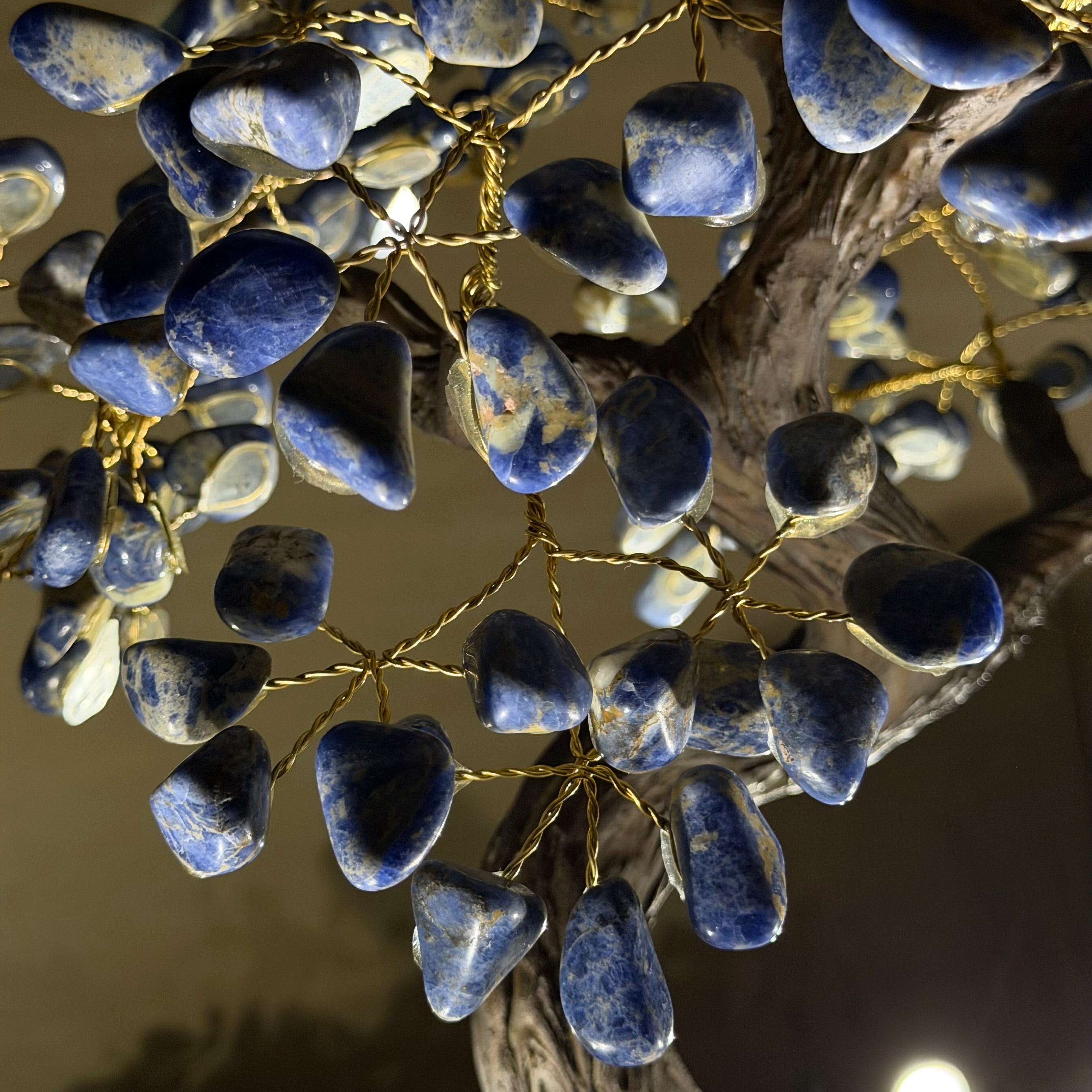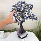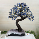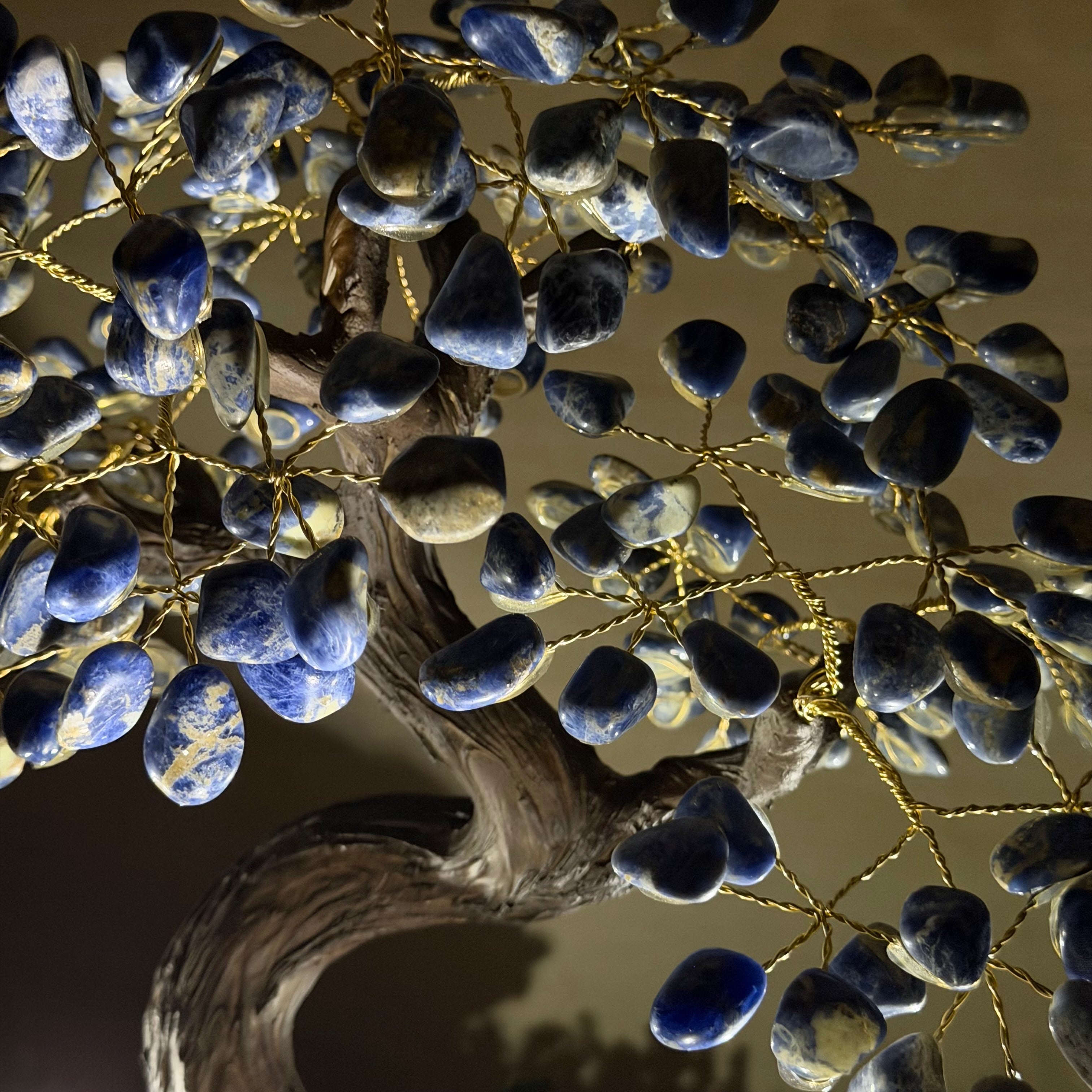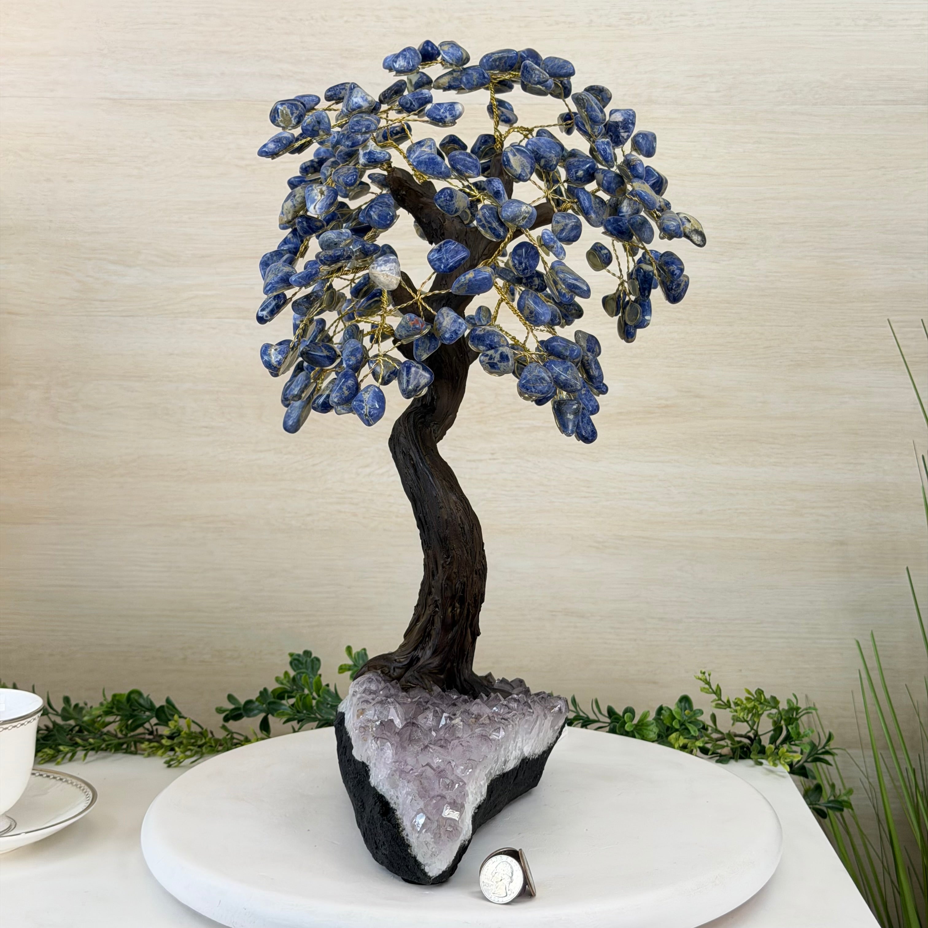 Sodalite Bonsai Gemstone Tree on an Amethyst Cluster Base Handcrafted in Brazil, this striking gemstone tree stands approximately 17" tall and features a sturdy bonsai-style trunk and branches adorned with 240 tumbled Sodalite gemstones as its leaves.