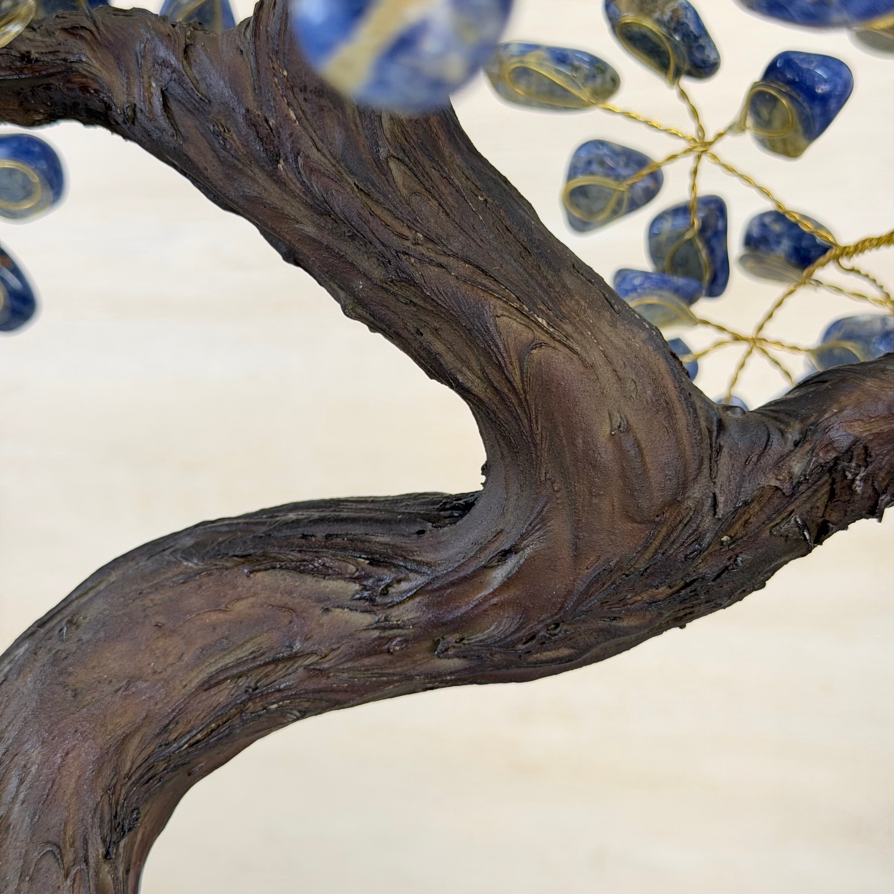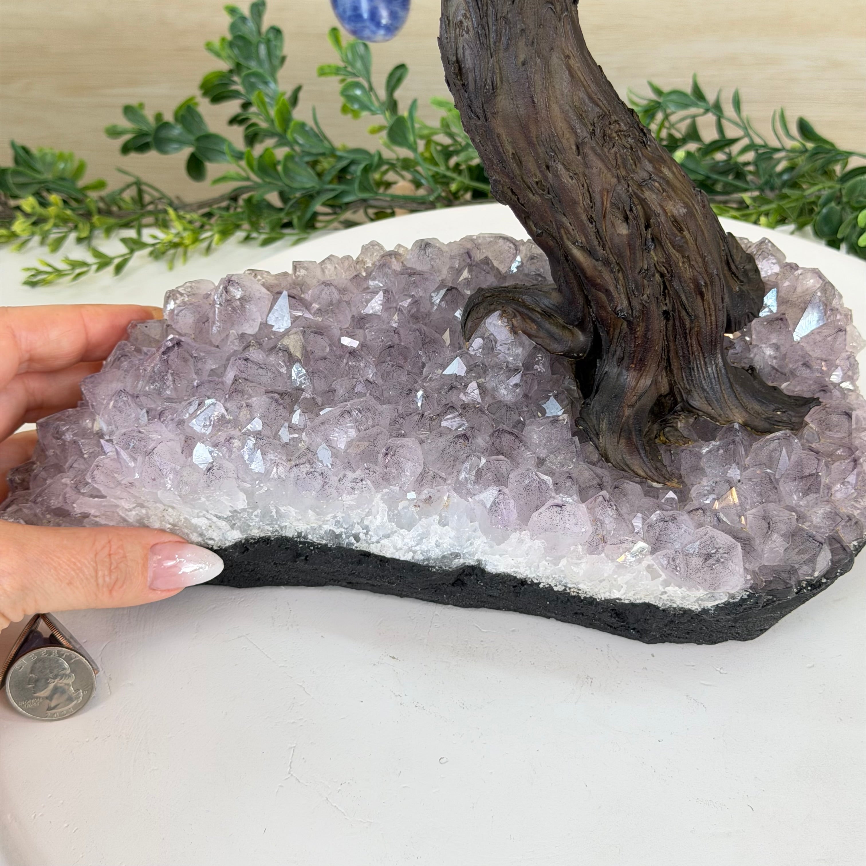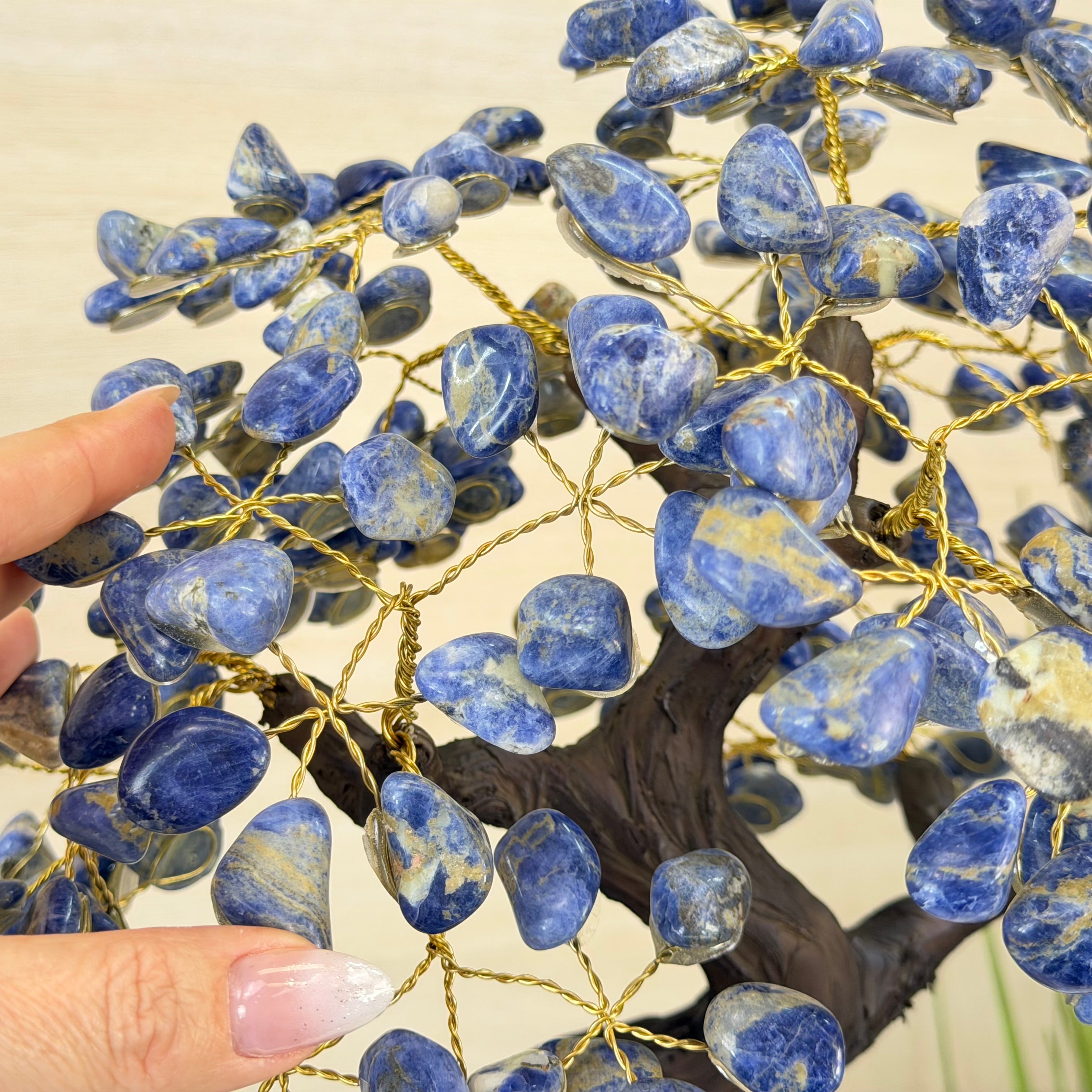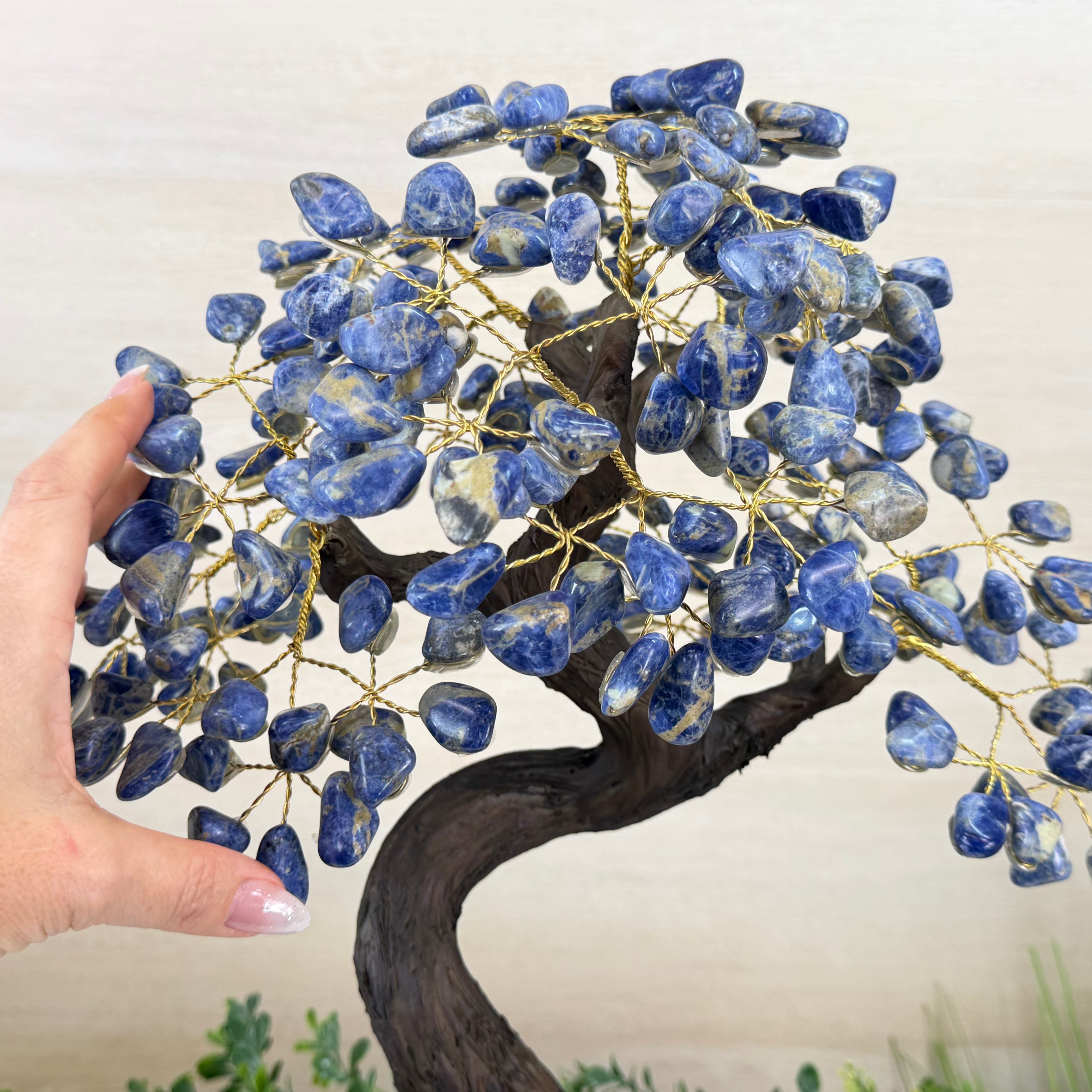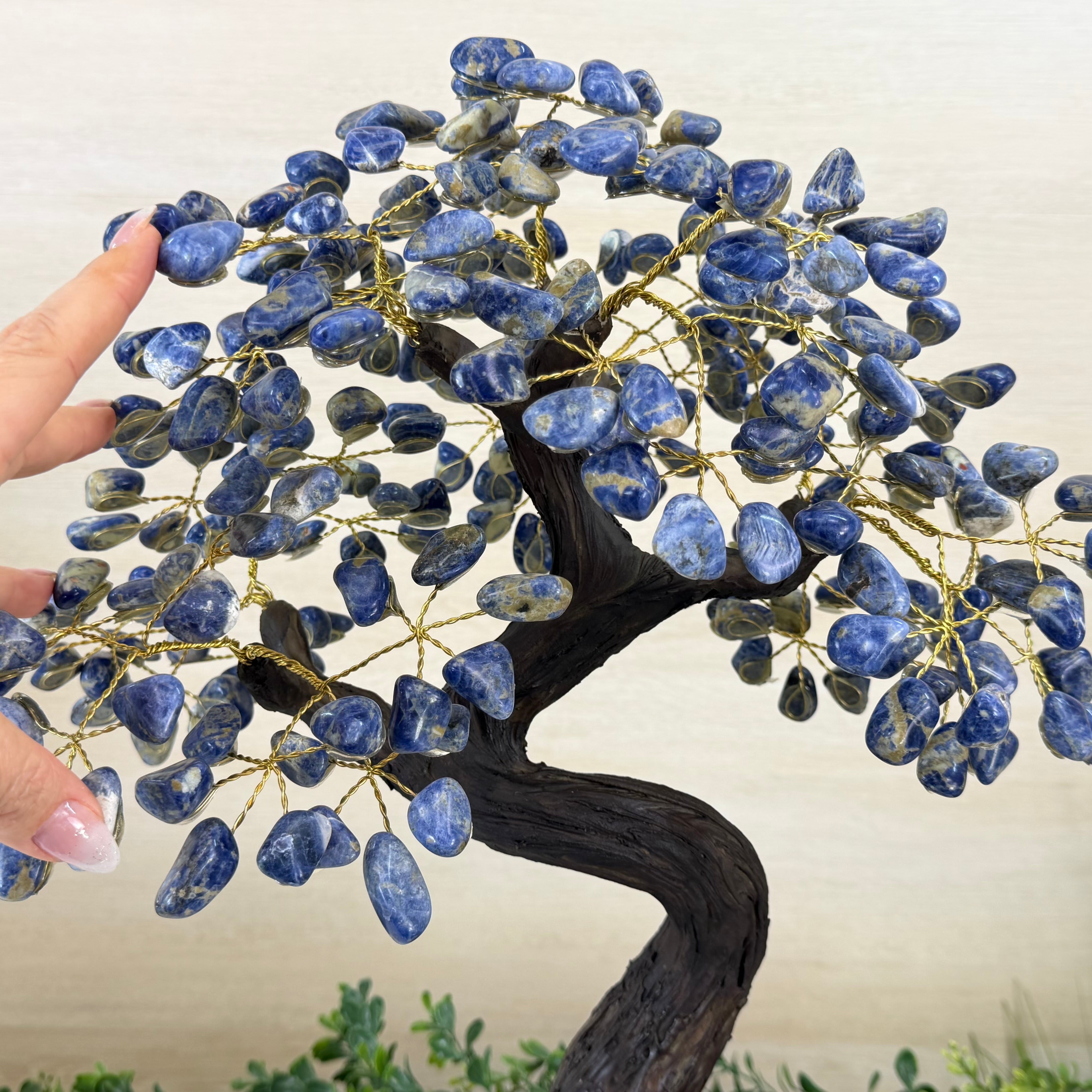 Sodalite Bonsai Gemstone Tree on an Amethyst Cluster Base Handcrafted in Brazil, this striking gemstone tree stands approximately 17" tall and features a sturdy bonsai-style trunk and branches adorned with 240 tumbled Sodalite gemstones as its leaves.