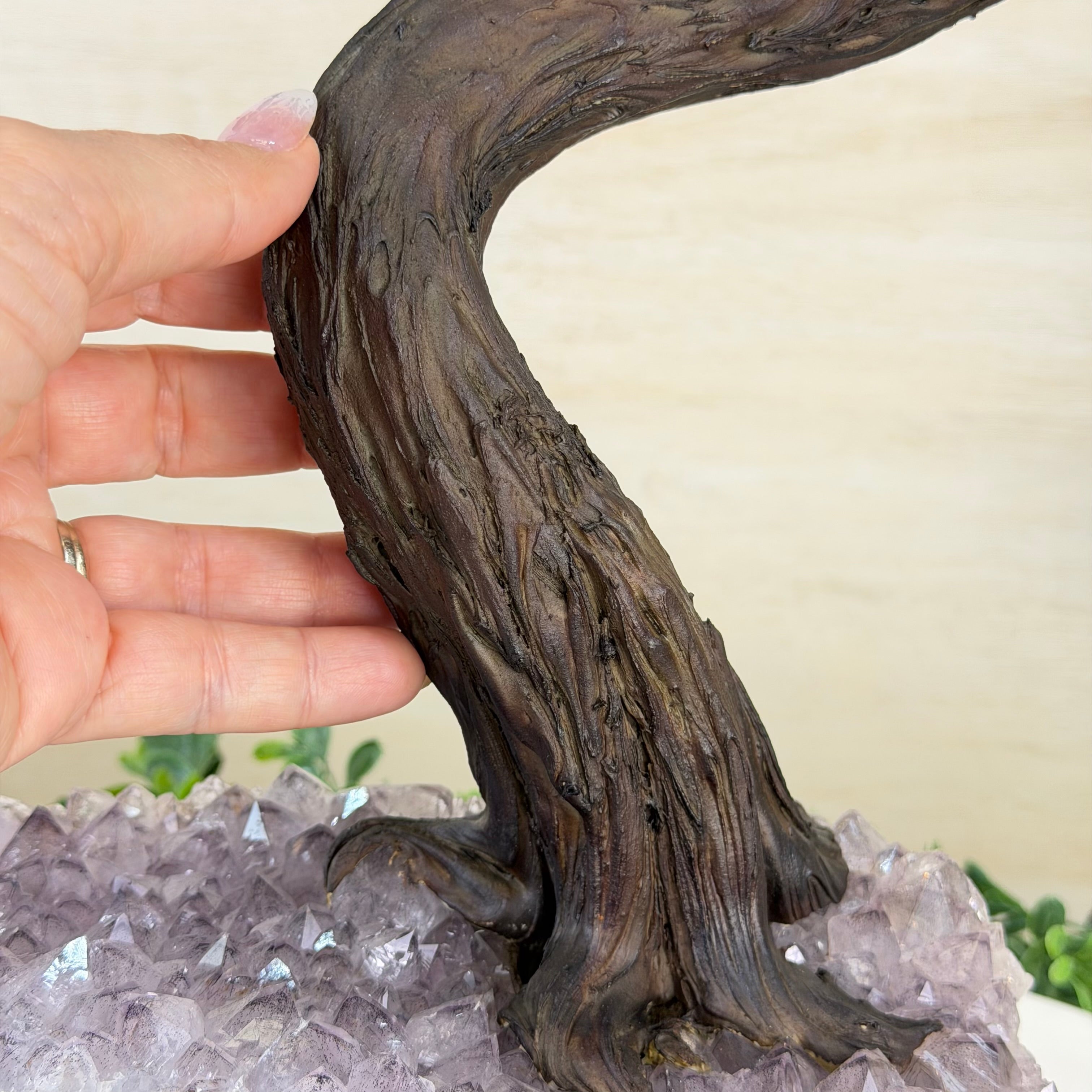 The process to make a gemstone tree like this is very extensive and meticulous. A special polished Amethyst cluster is selected for the base, the resin trunk and branches are crafted into a bonsai style by artisans in Brazil and then each gemstone is glued to the tree by hand. The result is a work of art that radiates harmony, care, and intention.