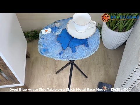 Large Blue Agate Side Table (dyed blue) w/ one slice of stone on a black metal base. An amazing vibrant specimen to accent the decor of your home.