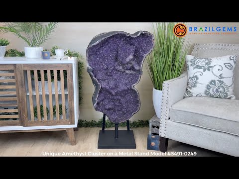 Discover the natural elegance of this Extra Plus Quality Natural Uruguayan Amethyst Cluster on a sleek metal base from Brazil Gems®. With vibrant purple amethyst points naturally flowing in a freeform shape, this gemstone radiates a sense of effortless beauty.