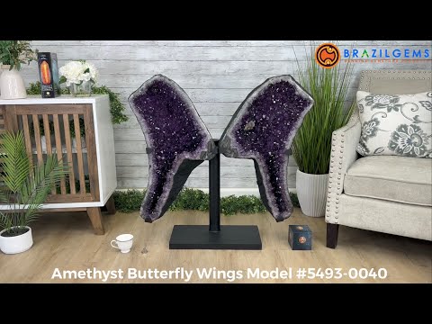Butterfly wings come from one single Amethyst geode cut in half and placed in a very sturdy black metal base that displays it beautifully side by side.