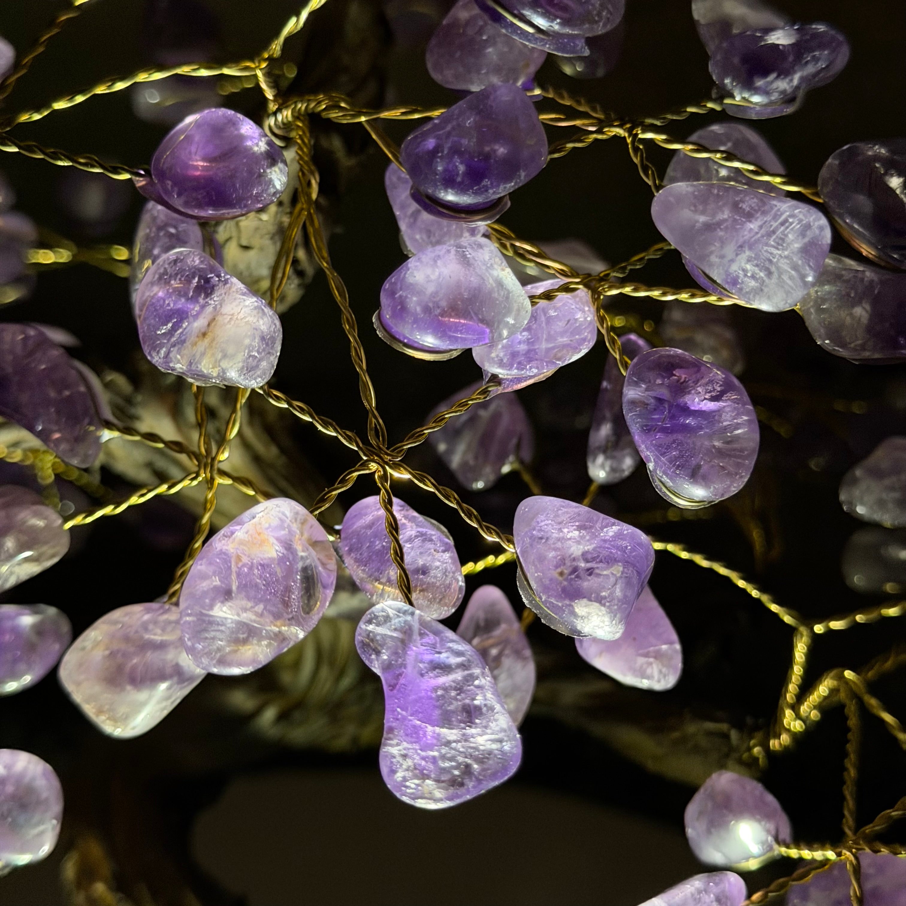The process to make a gemstone tree like this is very extensive and meticulous. A special Amethyst cluster is selected for the base, the resin trunk and branches are crafted into a bonsai style by artisans in Brazil and then each gemstone is glued to the tree by hand.