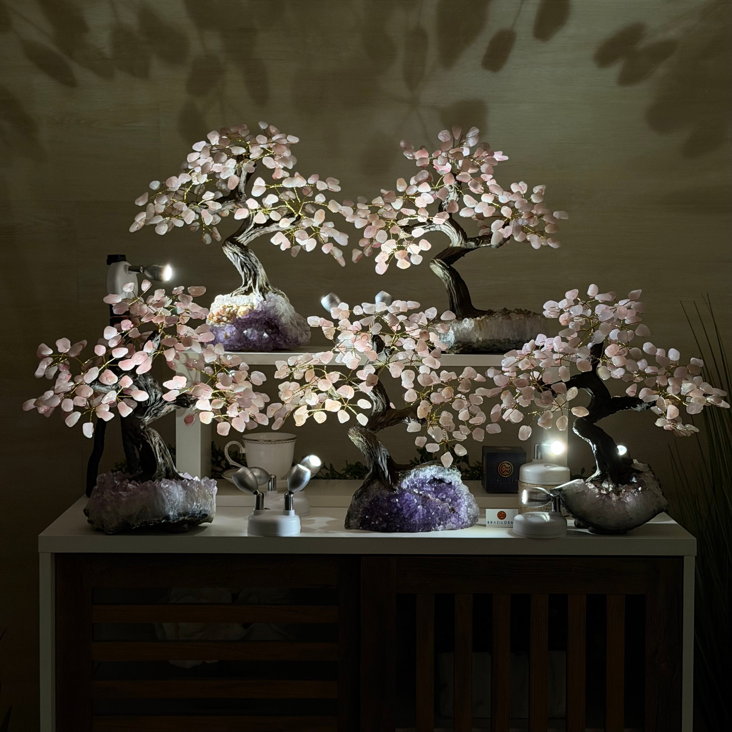 Stunning Rose Quartz Bonsai Gemstone Tree on an Amethyst Cluster Base. Handcrafted in Brazil, this striking gemstone tree stands approximately 14" tall and features a sturdy resin trunk with 36 wire branches adorned with 180 tumbled Rose Quartz gemstones. This work of art will elevate the decor of your favorite space or make a great forever-gift to a loved one.