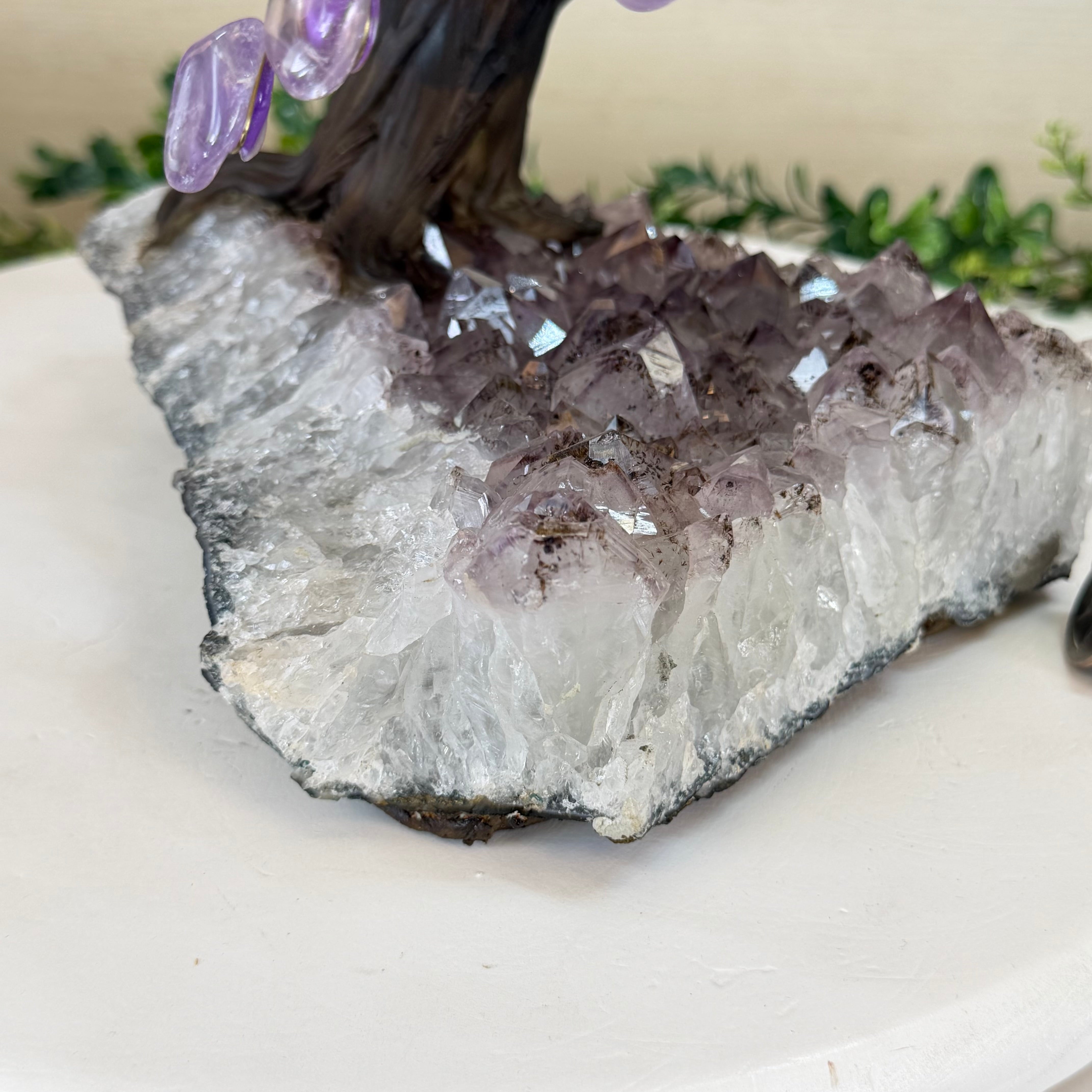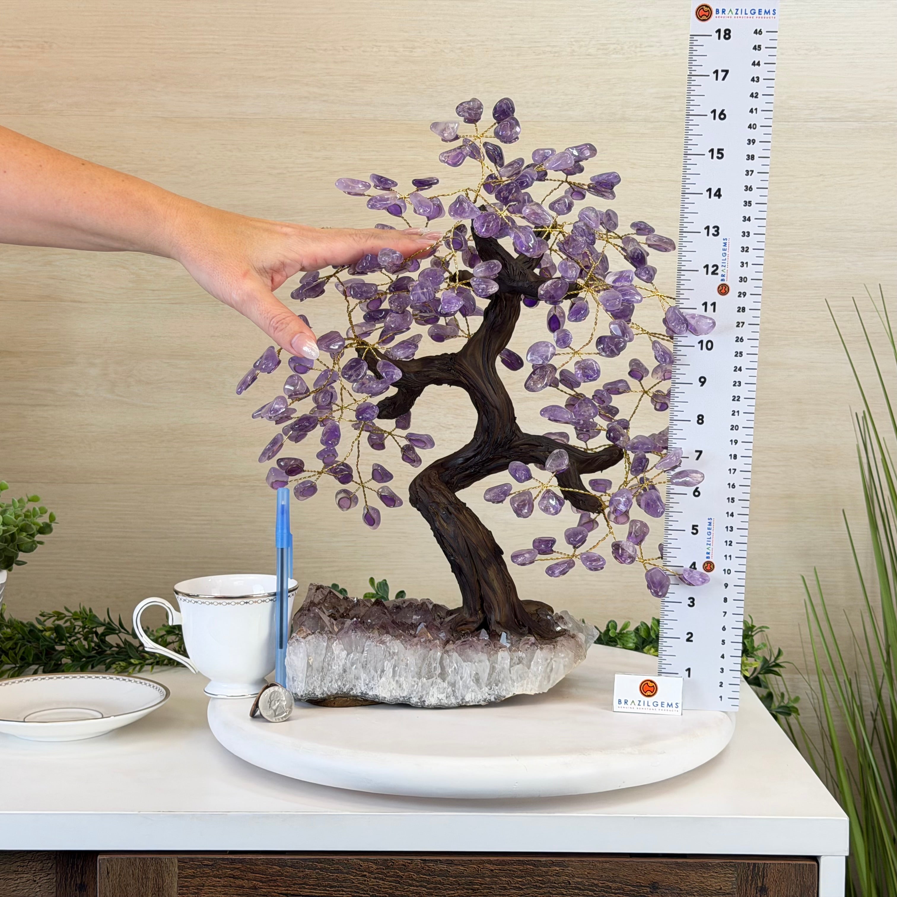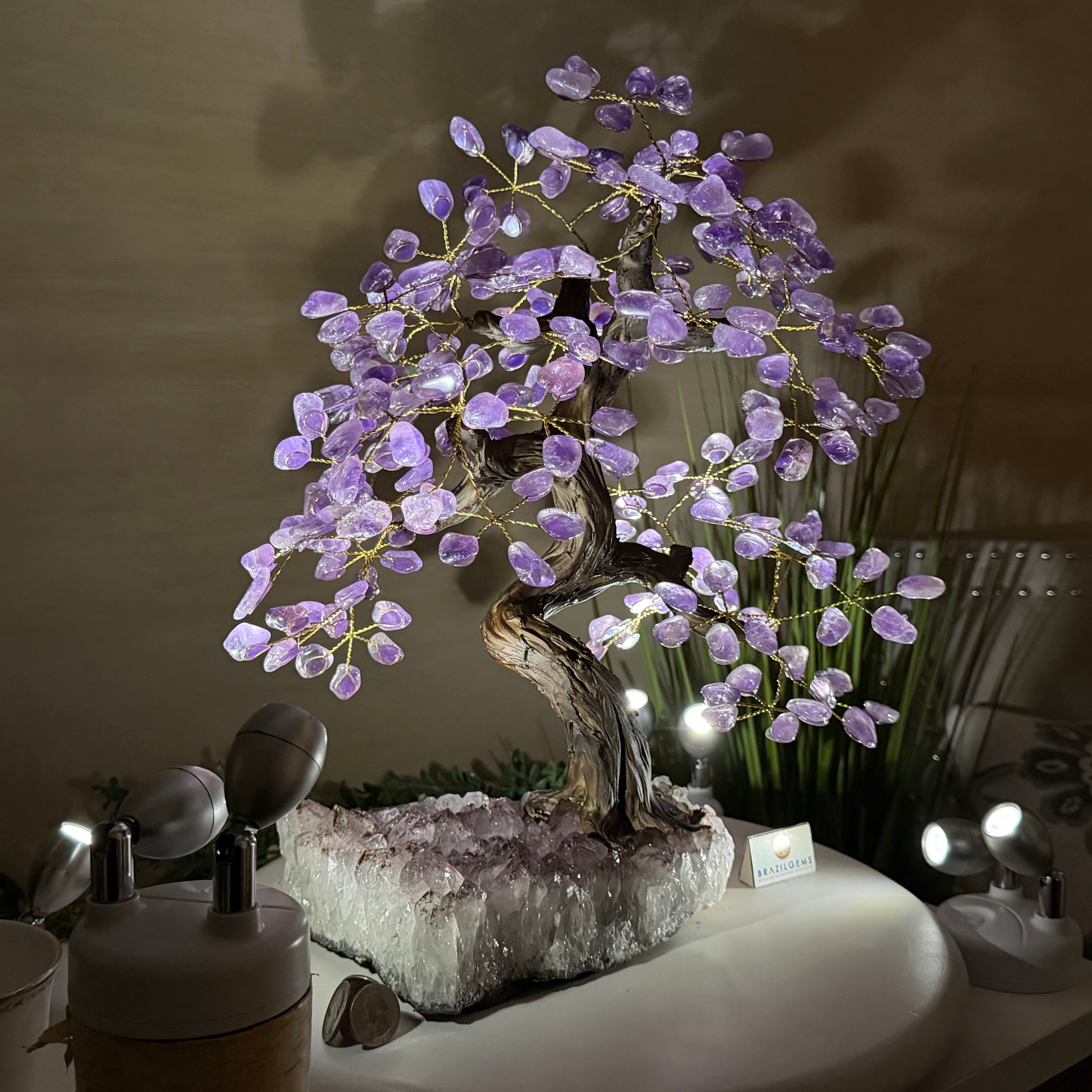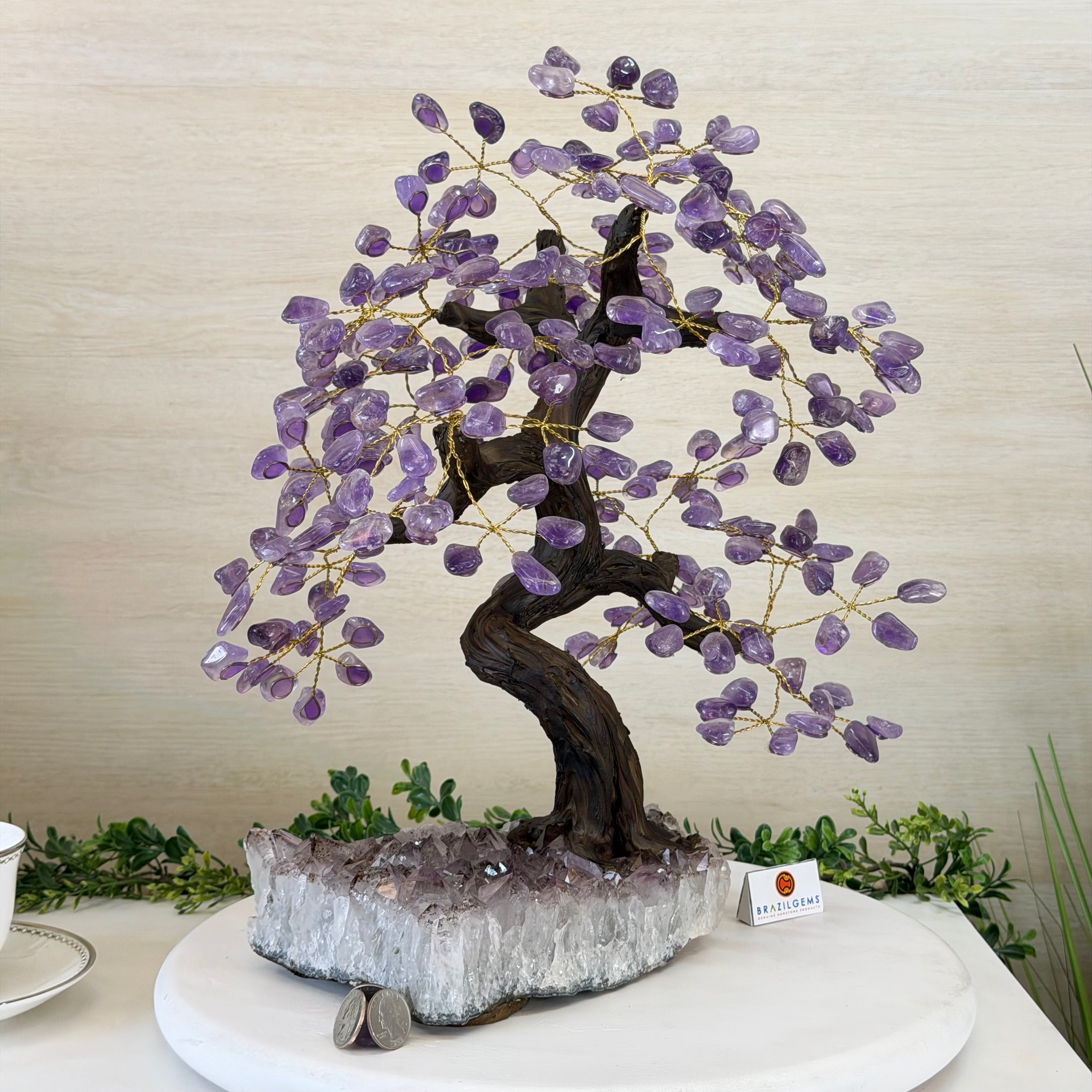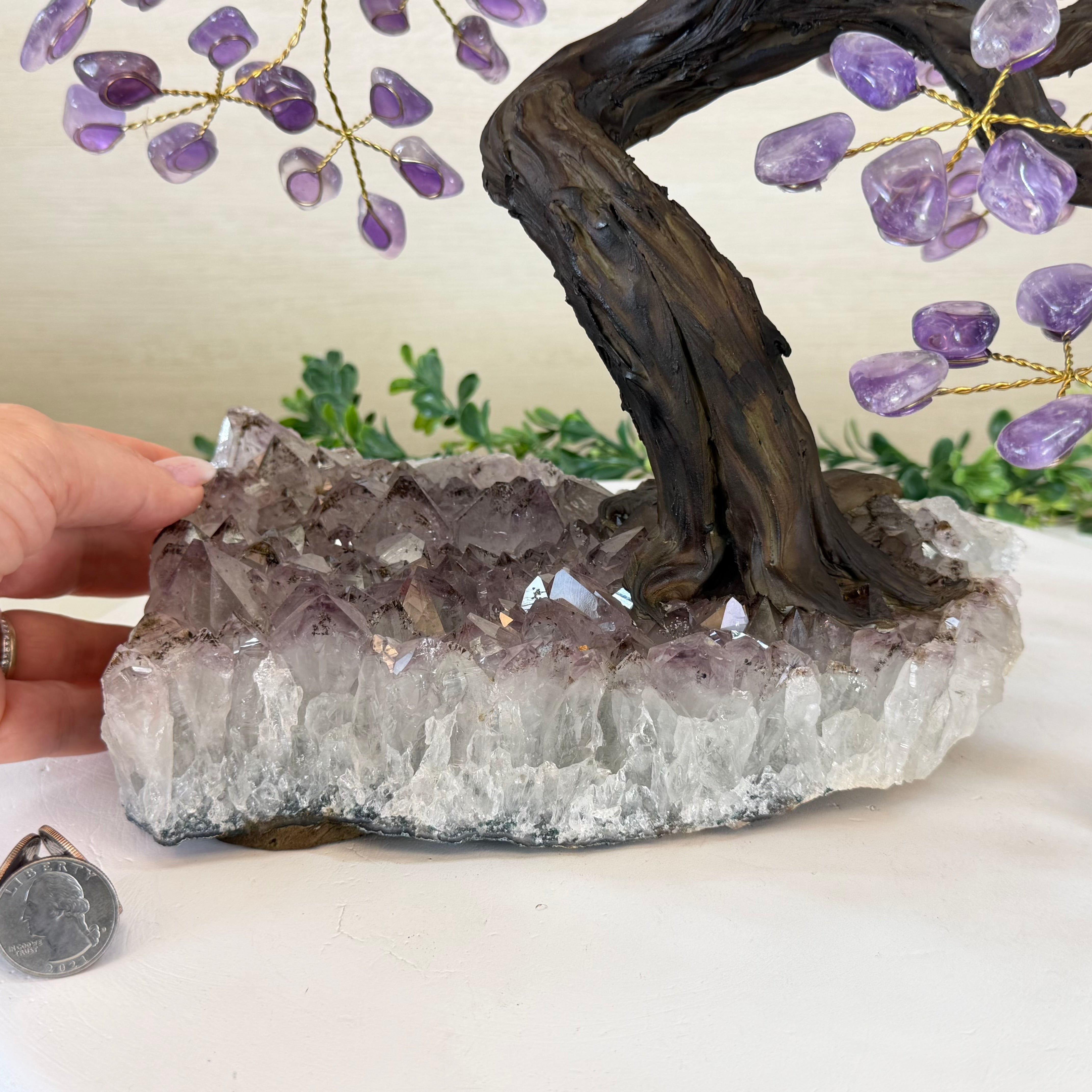 Amethyst Bonsai Gemstone Tree on an Amethyst Cluster Base Handcrafted in Brazil, this striking gemstone tree stands approximately 17" tall and features a sturdy bonsai-style trunk and branches adorned with 240 tumbled Amethyst gemstones as its leaves.