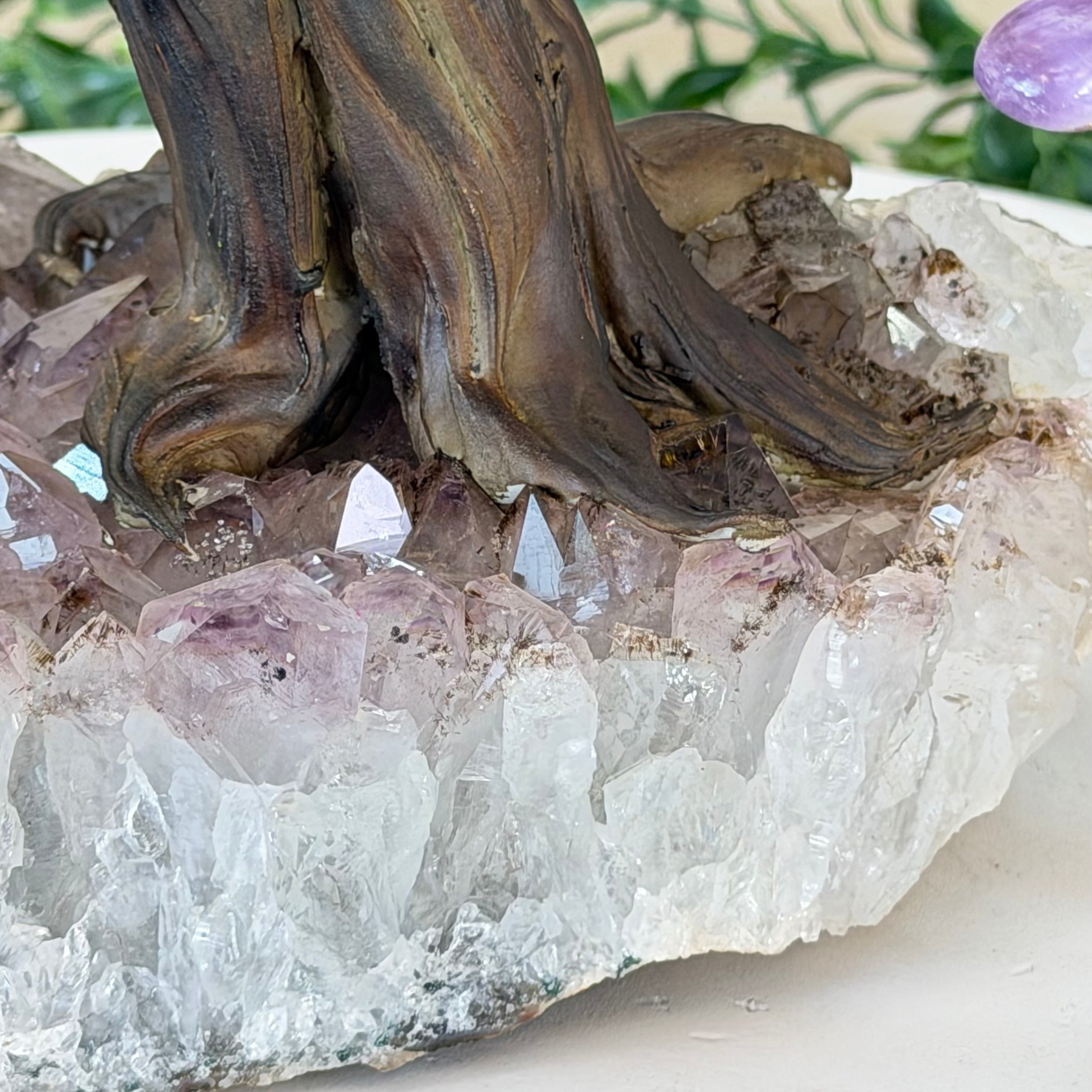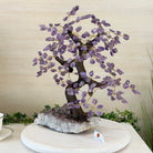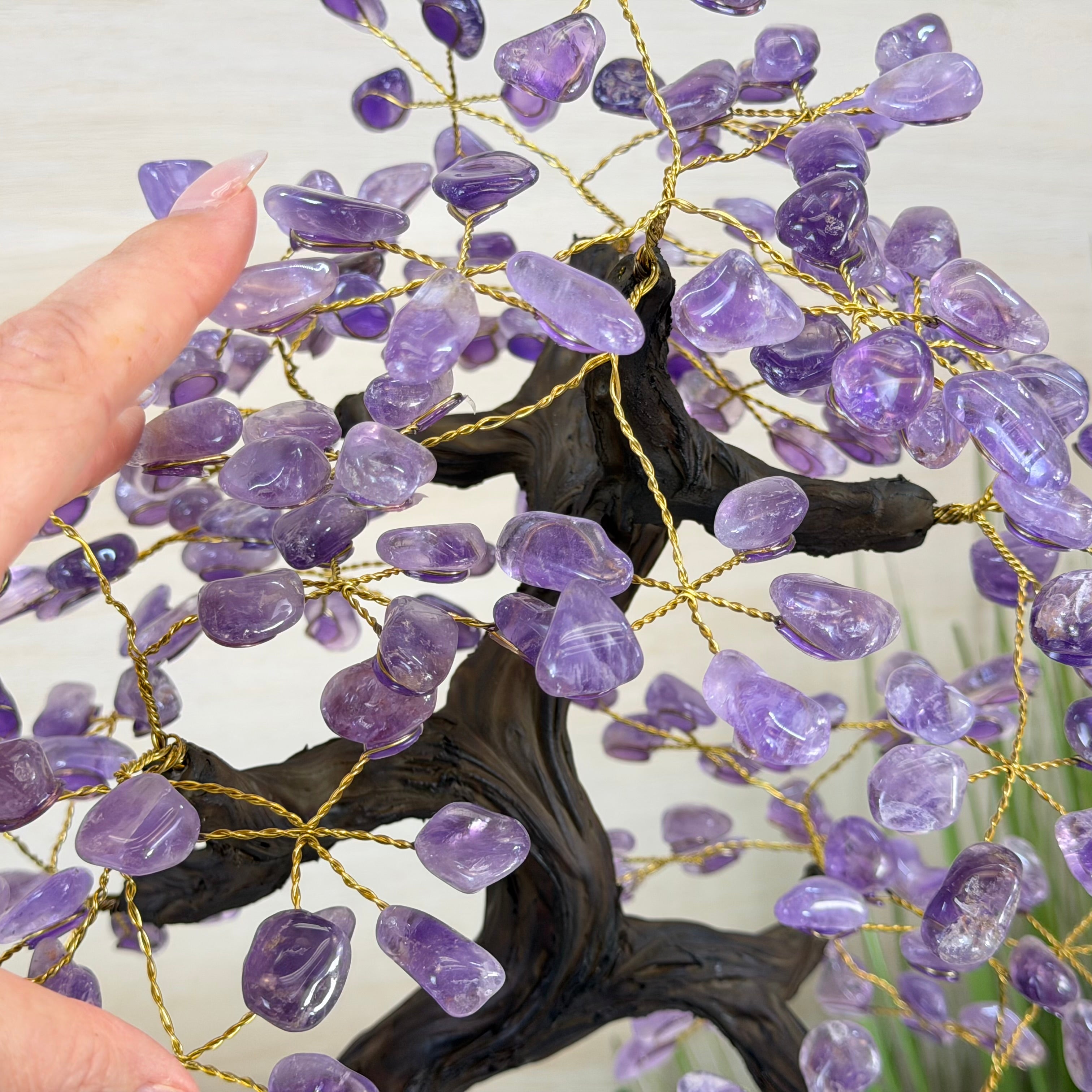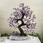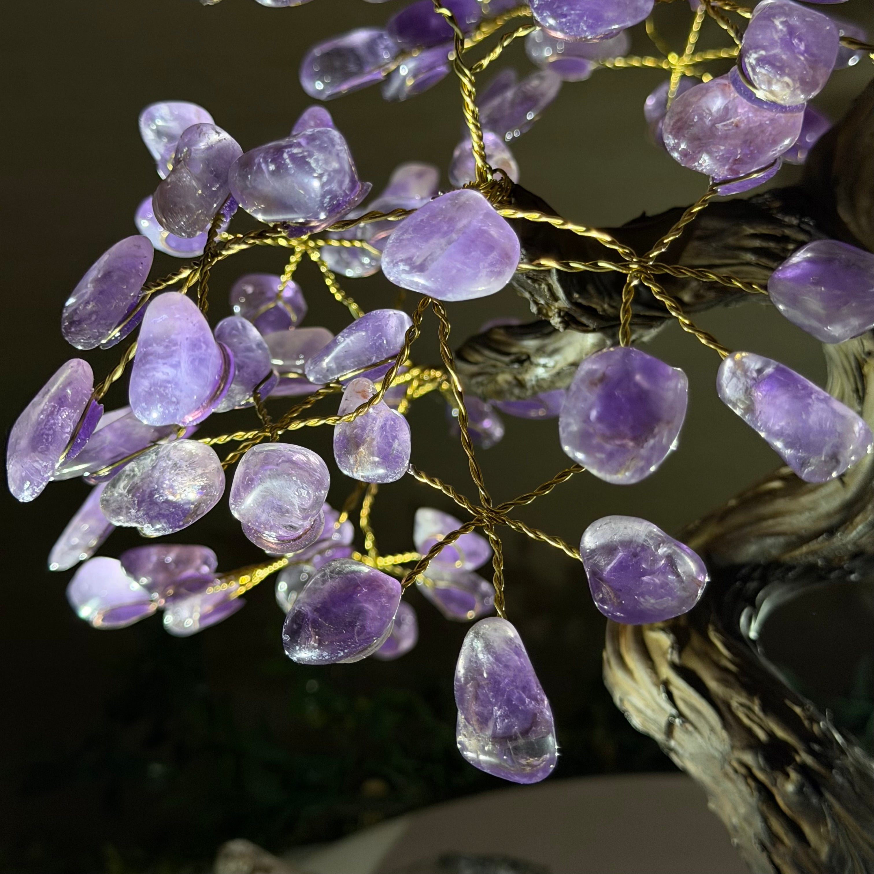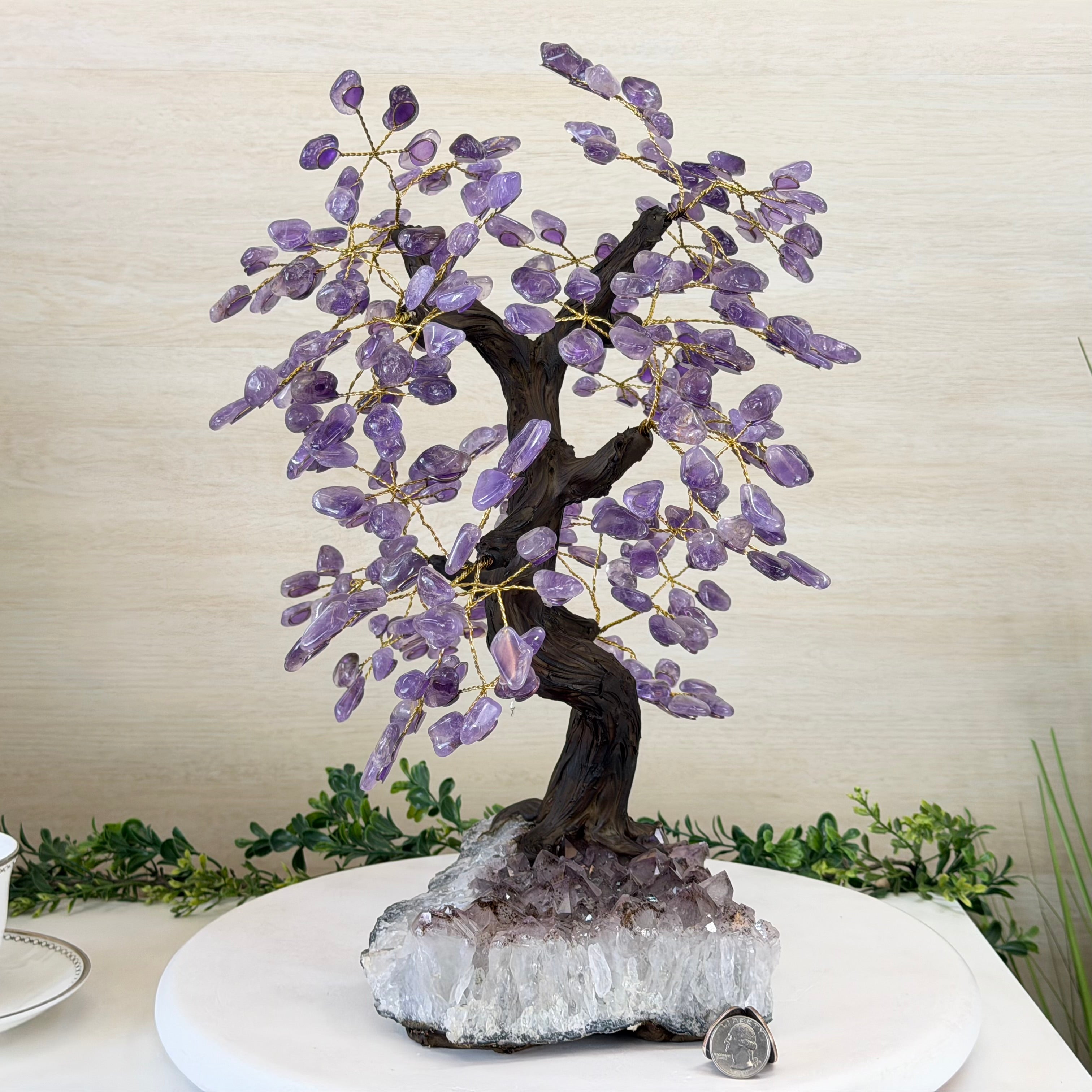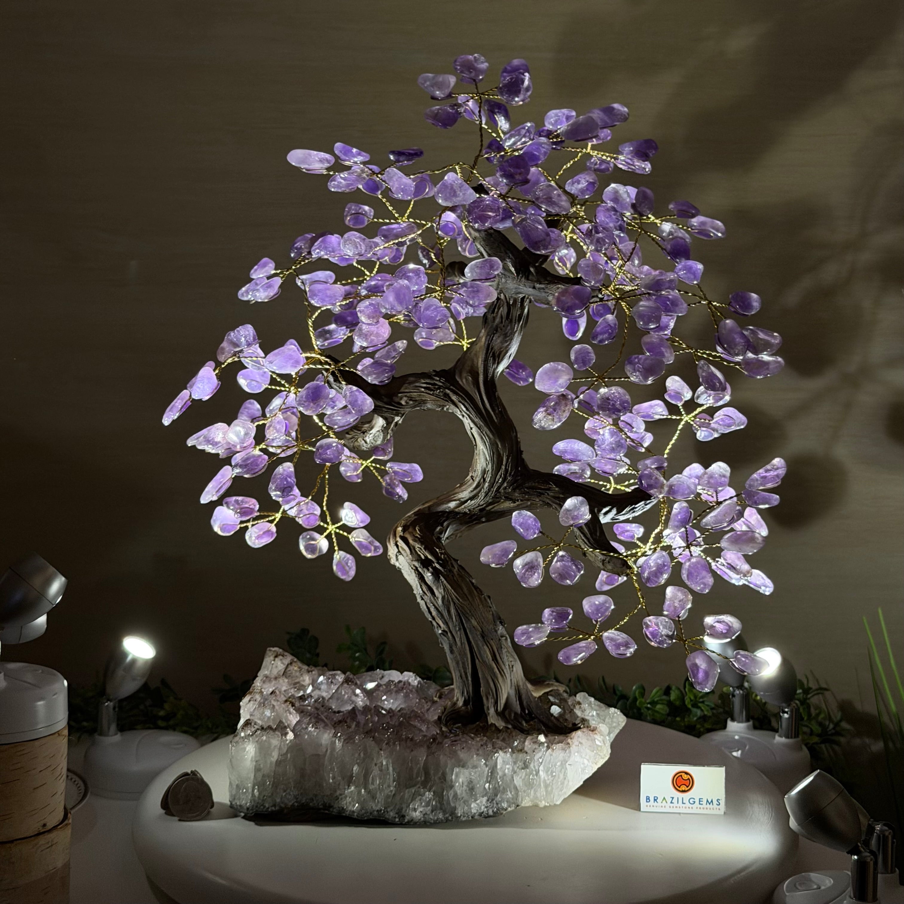 Amethyst Bonsai Gemstone Tree on an Amethyst Cluster Base Handcrafted in Brazil, this striking gemstone tree stands approximately 17" tall and features a sturdy bonsai-style trunk and branches adorned with 240 tumbled Amethyst gemstones as its leaves.
