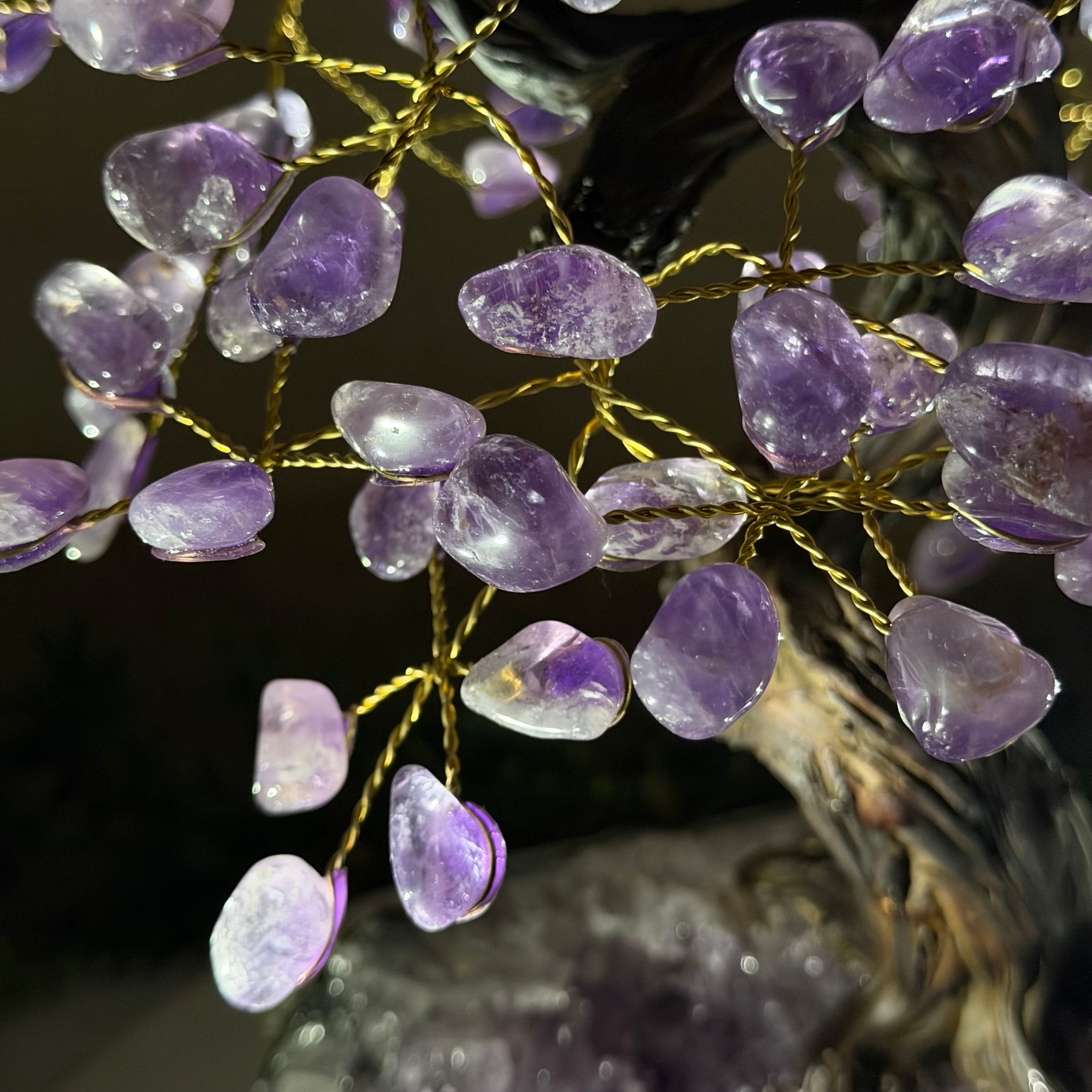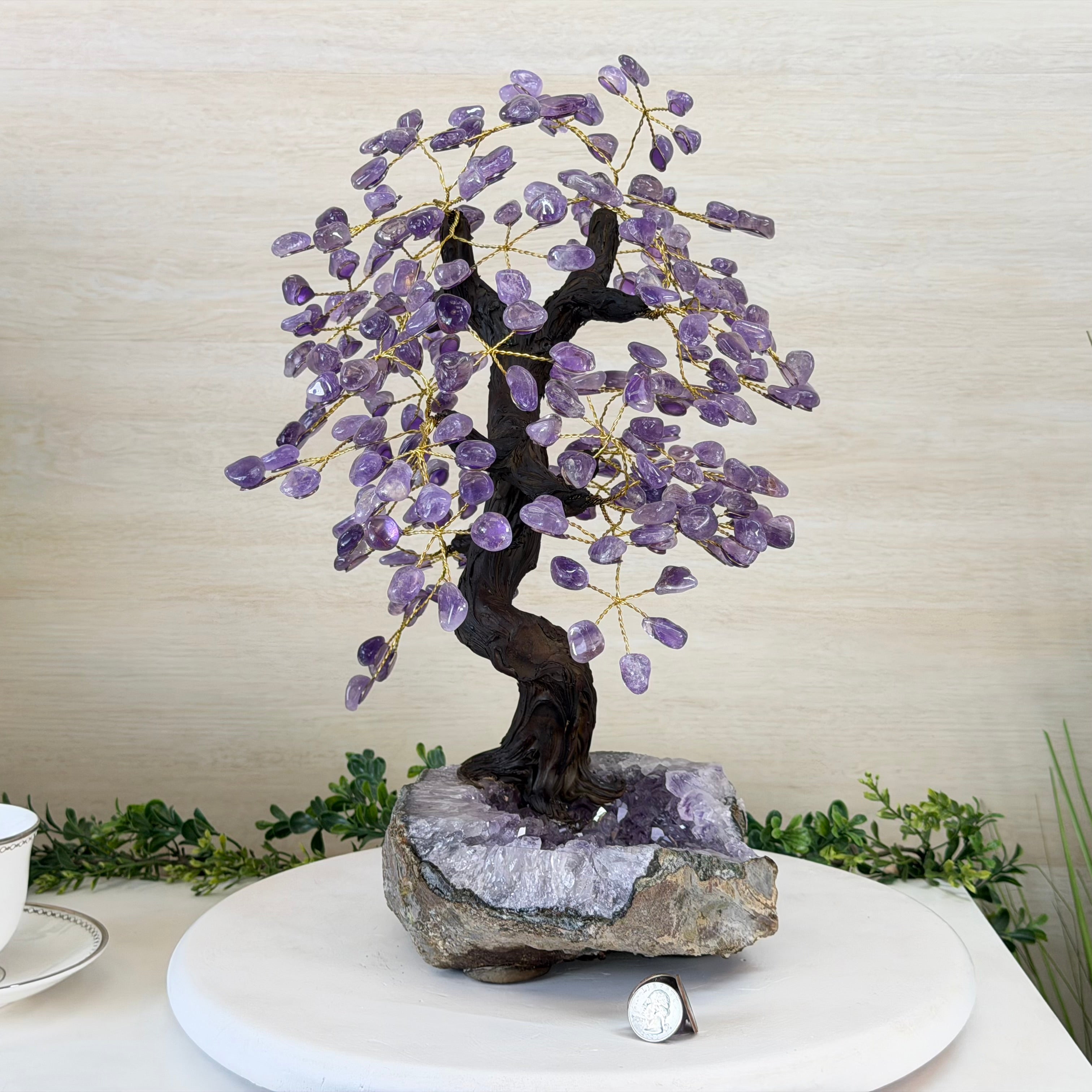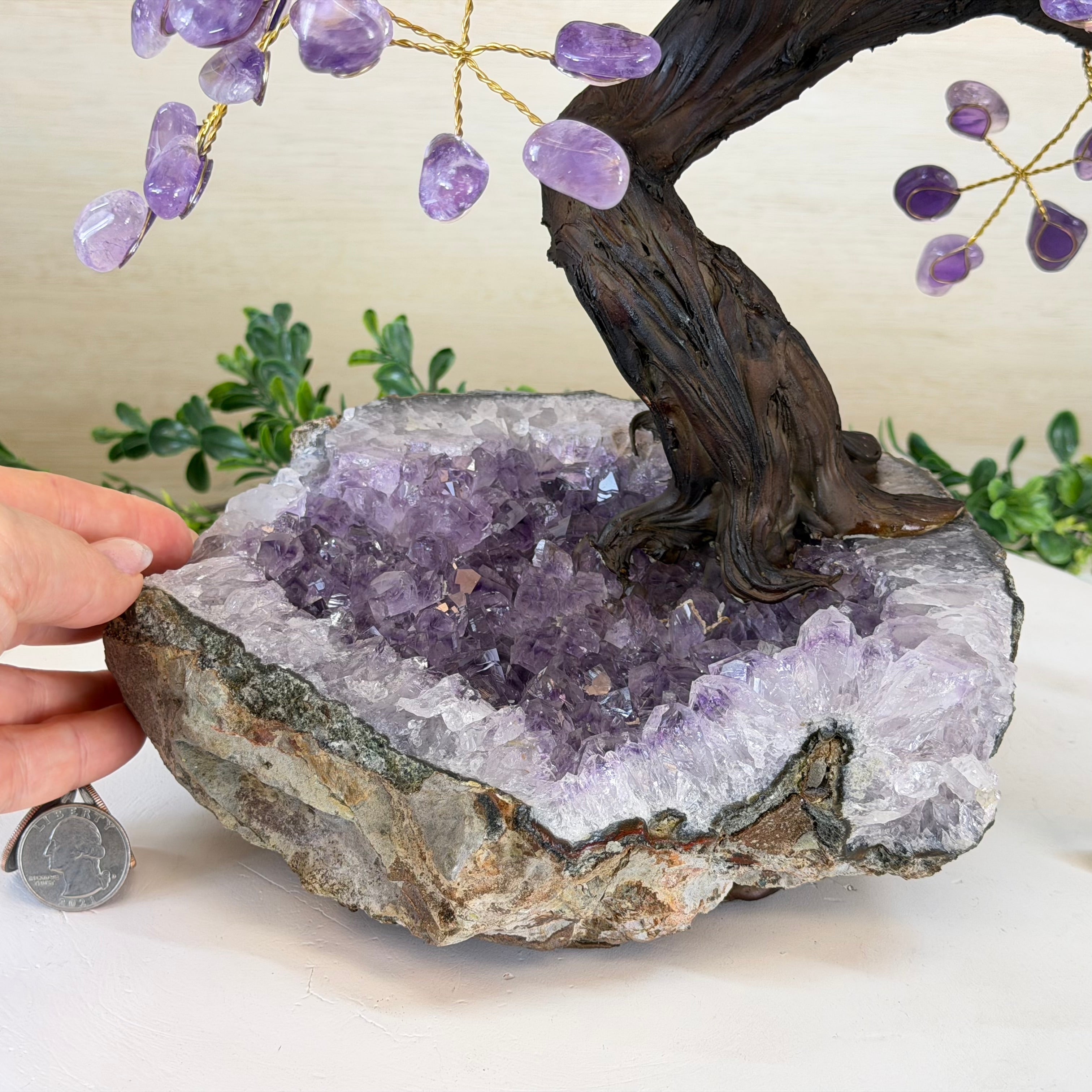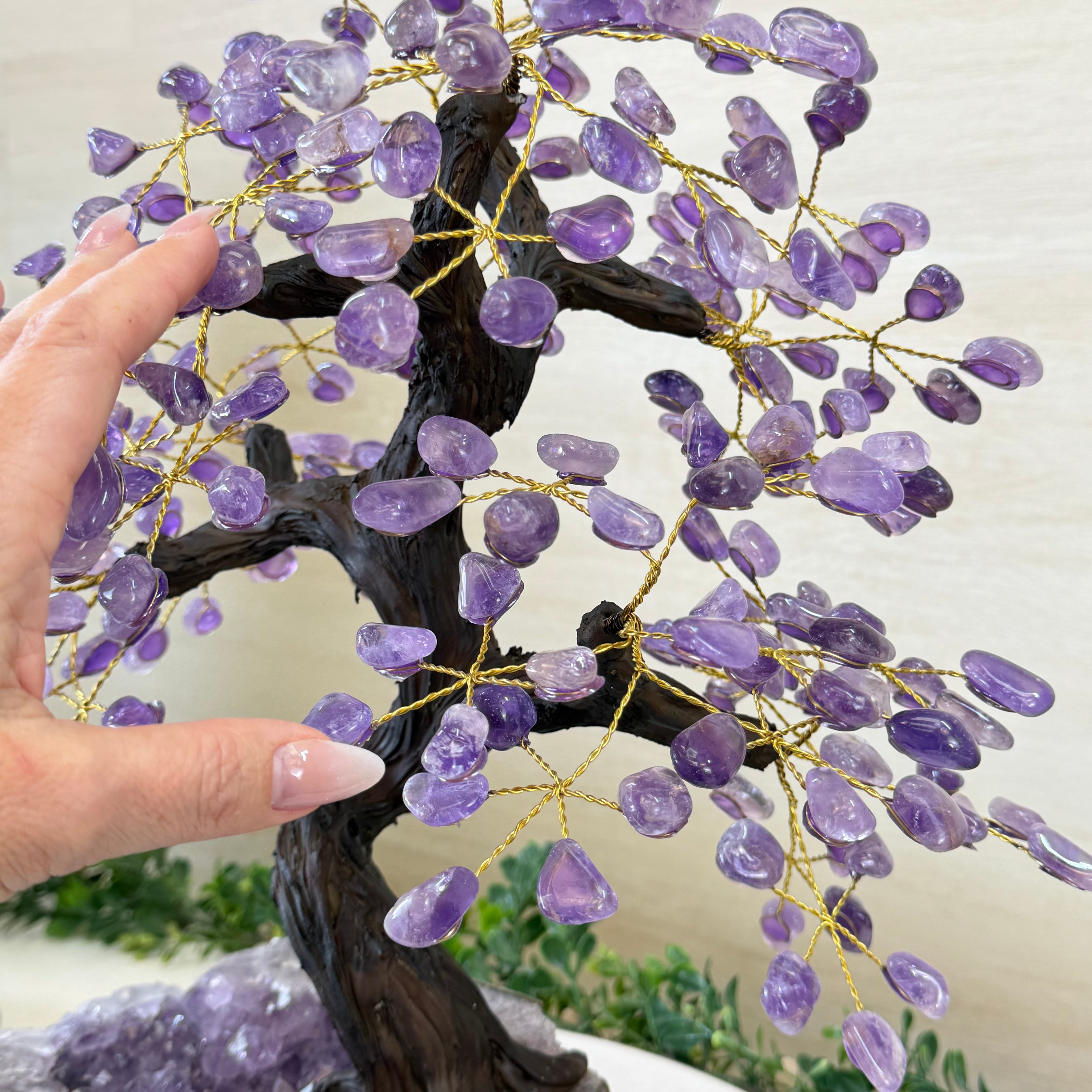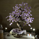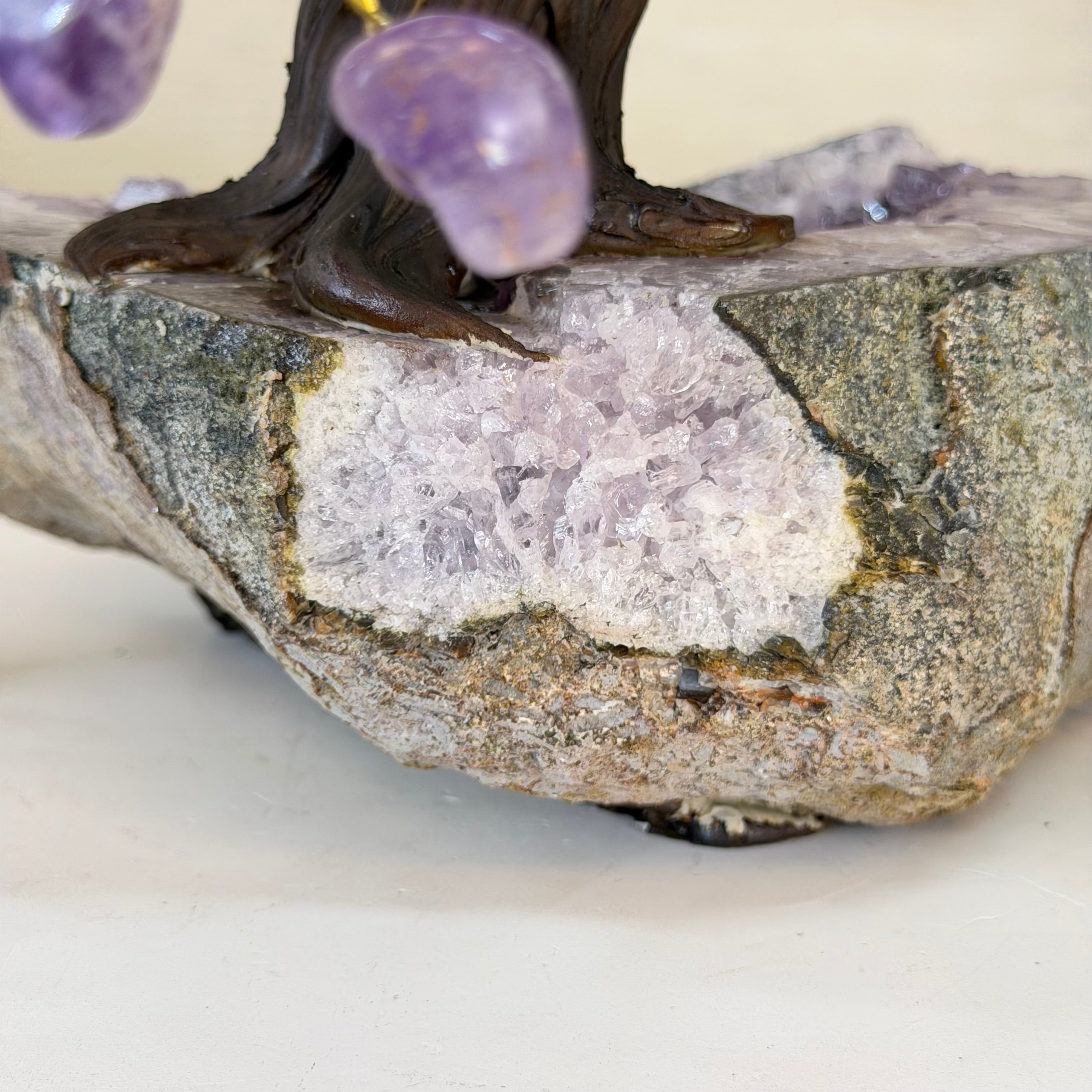 Amethyst Bonsai Gemstone Tree on an Amethyst Cluster Base Handcrafted in Brazil, this striking gemstone tree stands approximately 17" tall and features a sturdy bonsai-style trunk and branches adorned with 240 tumbled Amethyst gemstones as its leaves.