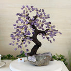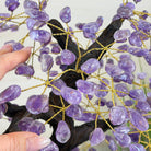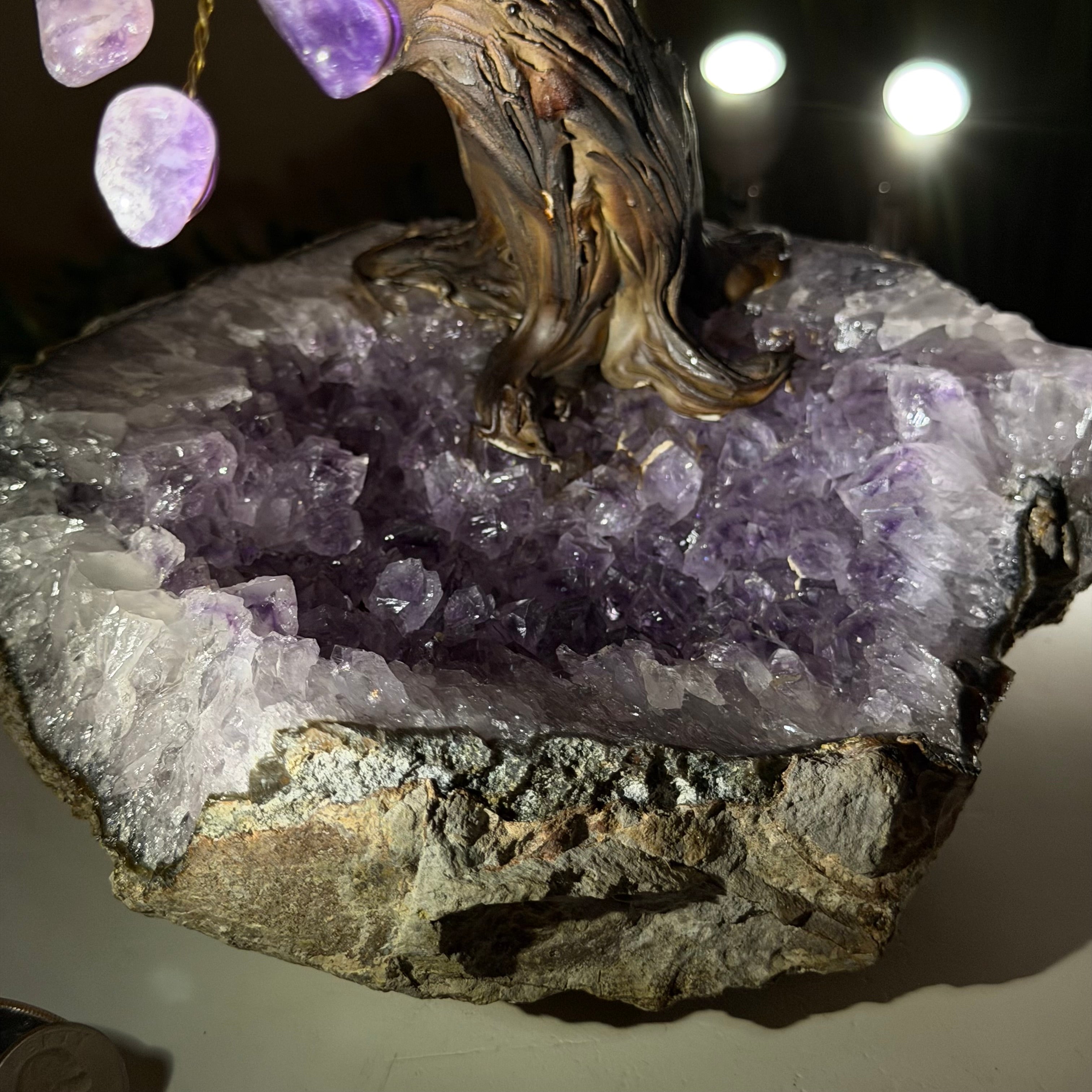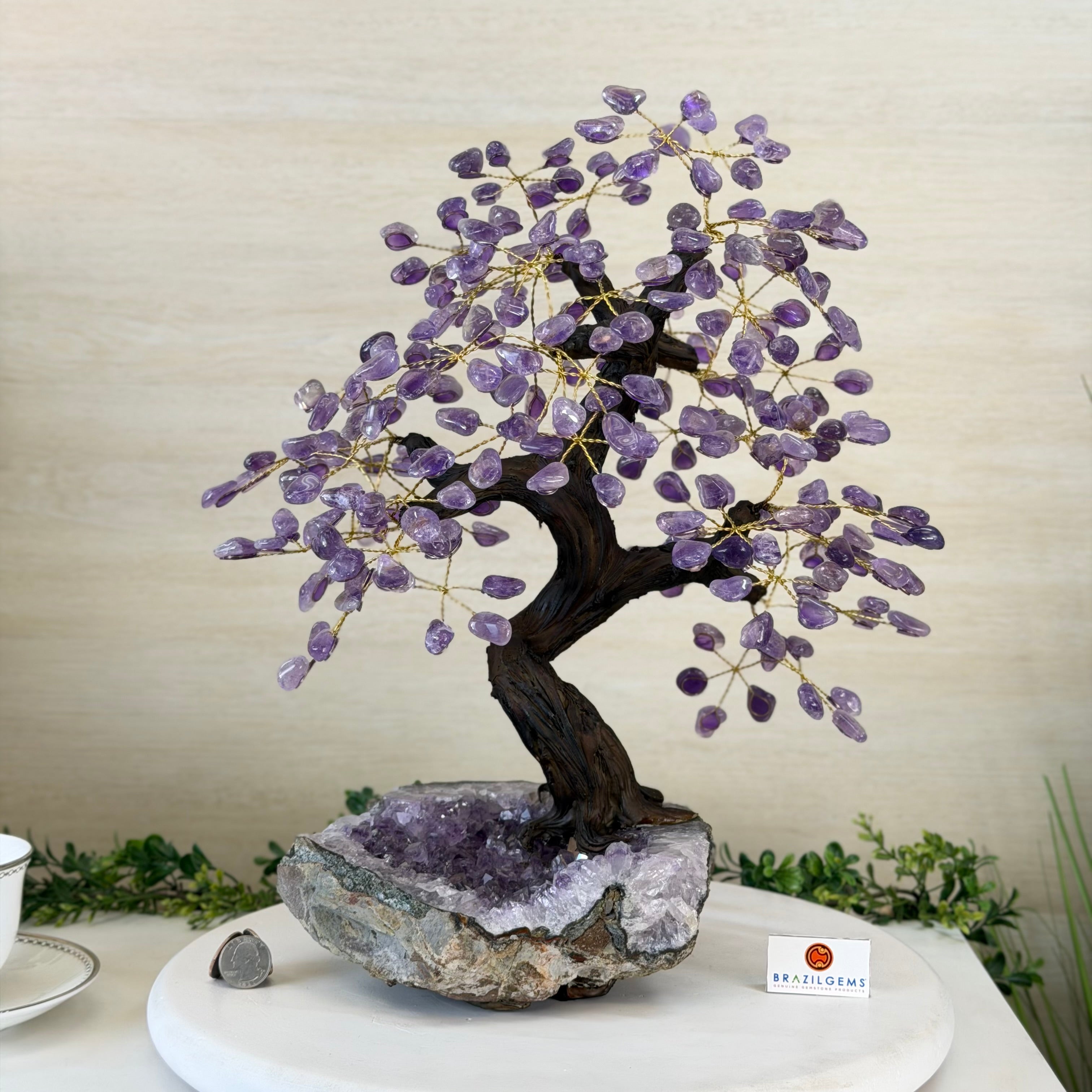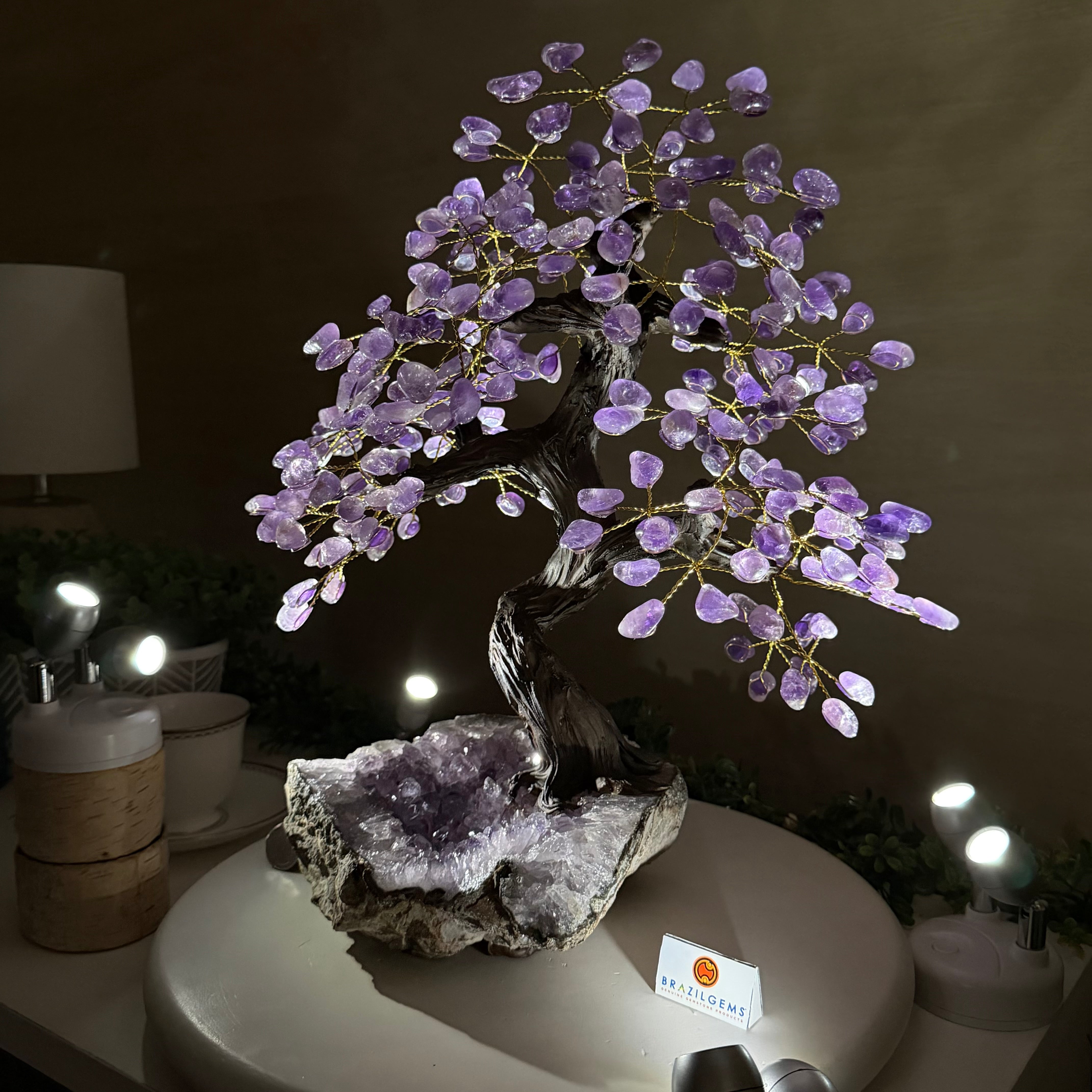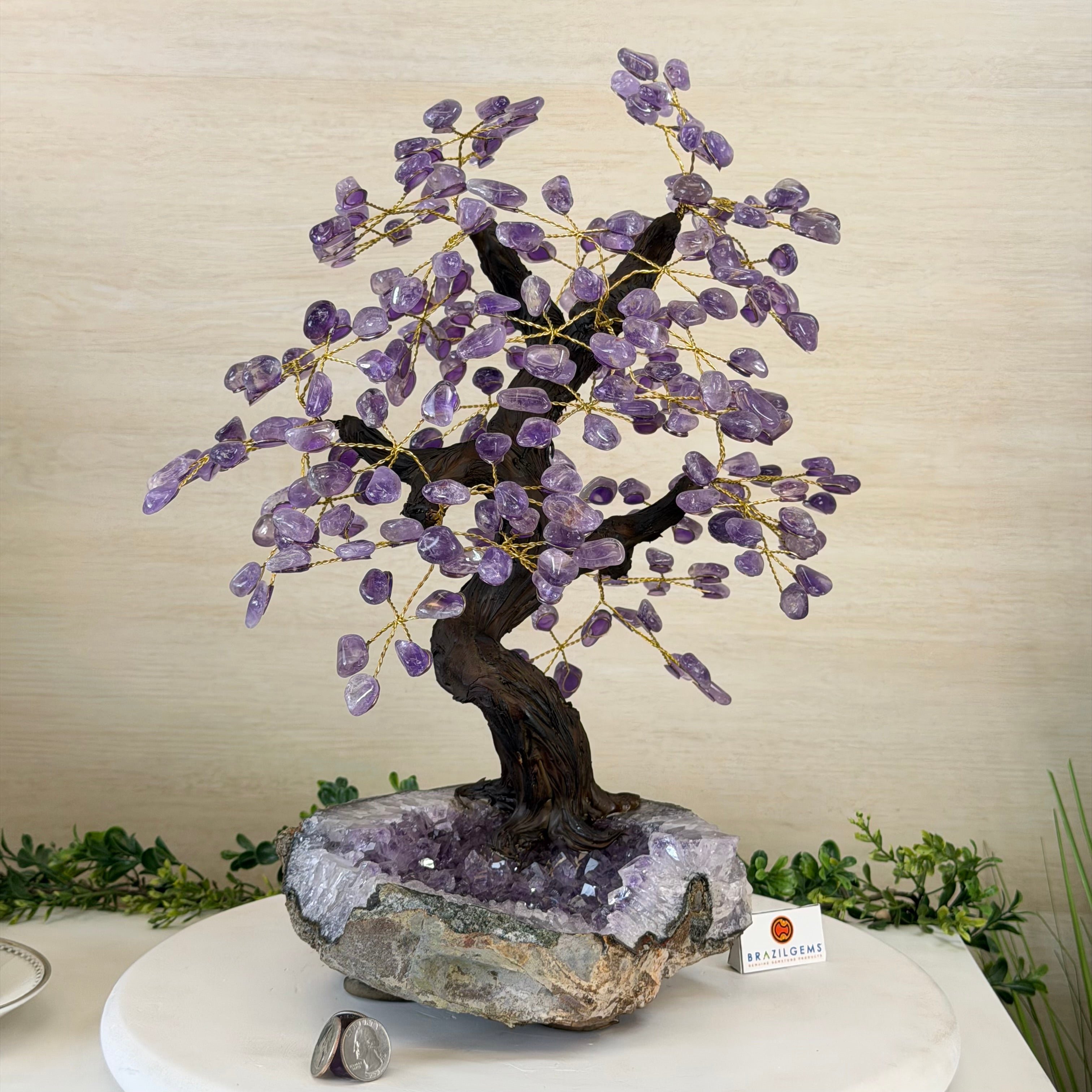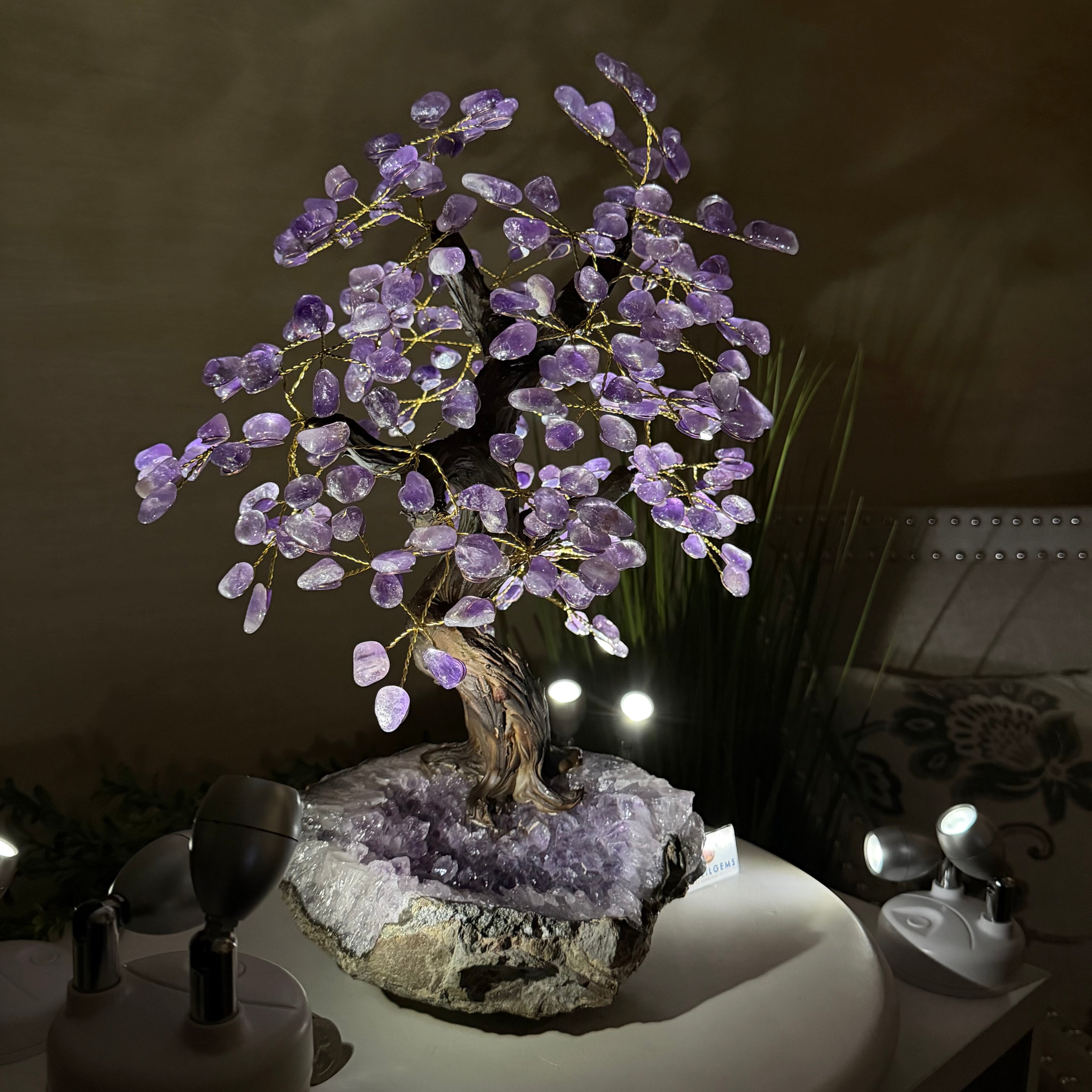 Amethyst Bonsai Gemstone Tree on an Amethyst Cluster Base Handcrafted in Brazil, this striking gemstone tree stands approximately 17" tall and features a sturdy bonsai-style trunk and branches adorned with 240 tumbled Amethyst gemstones as its leaves.