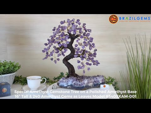 Handcrafted in Brazil, this striking gemstone tree stands approximately 16" tall and features a sturdy bonsai-style trunk and branches adorned with 240 tumbled Amethyst gemstones as its leaves.