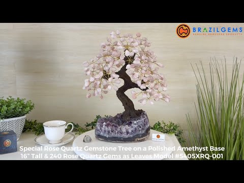 Handcrafted in Brazil, this striking gemstone tree stands approximately 16" tall and features a sturdy resin trunk adorned with 240 tumbled Rose Quartz gemstones as the leaves.