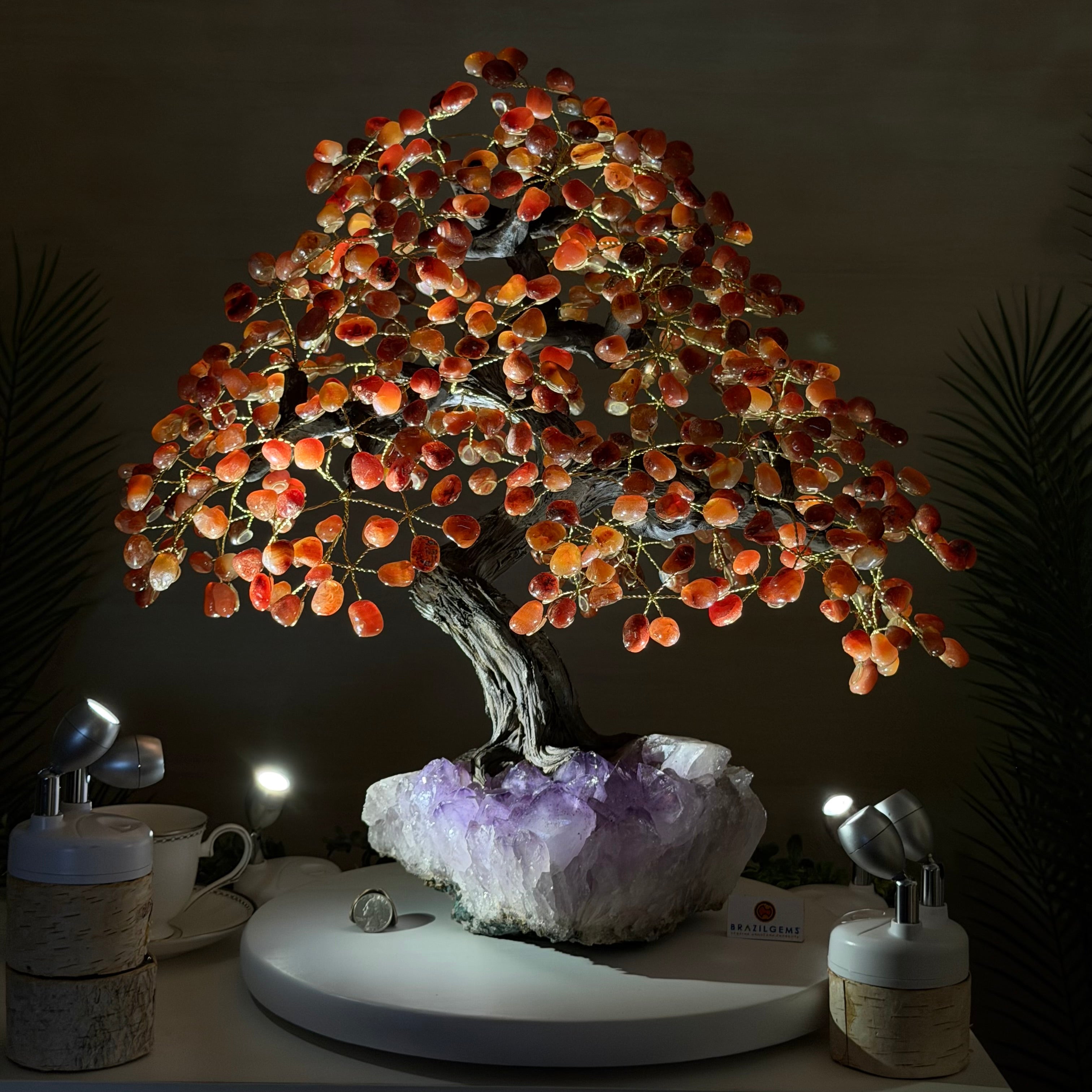The process to make a crystal gem tree like this is very extensive and meticulous. A special amethyst cluster is selected for the base, the resin trunk and branches are crafted by Brazilian artisans and then each gemstone is glued to the tree by hand. MADE IN BRAZIL!