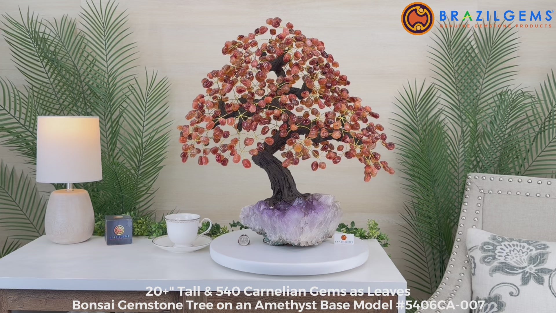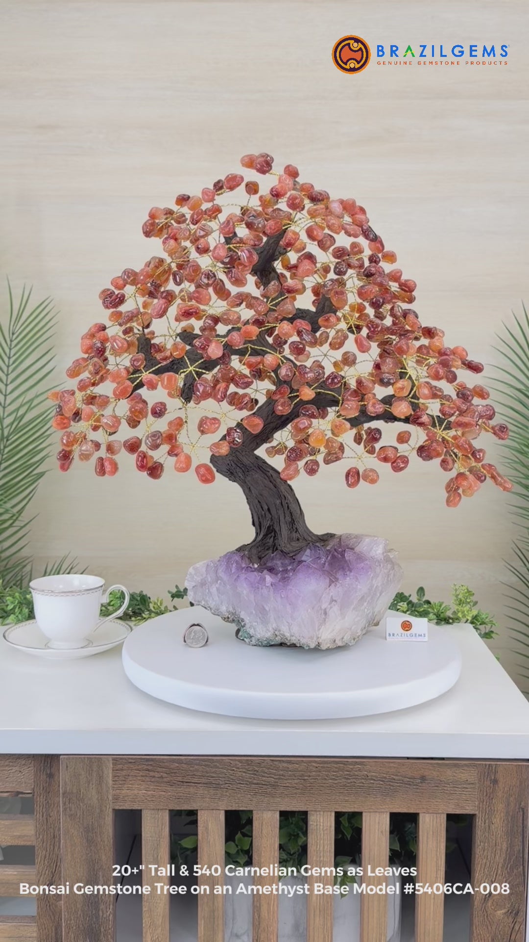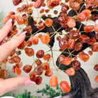 Nature and Artistry combine to create this Large Handmade Gemstone Tree with Carnelian Gemstones as leaves. Set atop a large Amethyst cluster base, it has a masterfully detailed trunk and branches crafted from resin in a bonsai tree style supporting 540 tumbled gemstones.