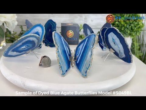 Discover vibrant Small Blue Agate "Butterfly Wings" from Brazil Gems®, approximately 4" in length, with a brilliantly dyed blue hue. Mounted on a sleek silver colored metal body, this delicate piece is perfect for gifting to a loved one.