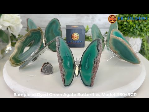 Discover vibrant Small Green Agate "Butterfly Wings" from Brazil Gems®, approximately 4" in length, with a brilliantly dyed green hue. Mounted on a sleek silver colored metal body, this delicate piece is perfect for gifting to a loved one.
