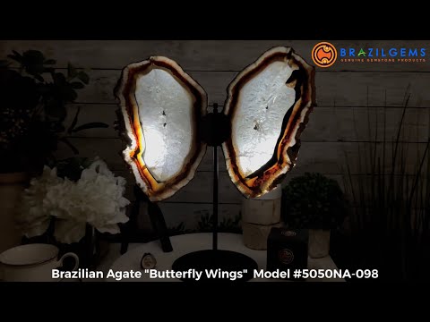 Brazil Gems® brings you this Natural Brazilian Agate Slices beautifully displayed as Butterfly Wings on a black metal stand. These are delicate and elegant pieces that will accent any décor and make for great gifts to a loved one. They are translucent and will look amazing with light behind or placed by a window.