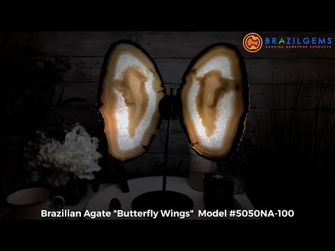 Brazil Gems® brings you this Natural Brazilian Agate Slices beautifully displayed as Butterfly Wings on a black metal stand. These are delicate and elegant pieces that will accent any décor and make for great gifts to a loved one. They are translucent and will look amazing with light behind or placed by a window.
