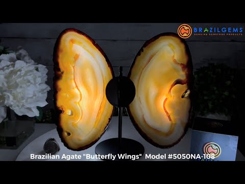 Brazil Gems® brings you this Natural Brazilian Agate Slices beautifully displayed as Butterfly Wings on a black metal stand. These are delicate and elegant pieces that will accent any décor and make for great gifts to a loved one. They are translucent and will look amazing with light behind or placed by a window.