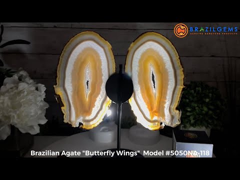 Brazil Gems® brings you this Natural Brazilian Agate Slices beautifully displayed as Butterfly Wings on a black metal stand. These are delicate and elegant pieces that will accent any décor and make for great gifts to a loved one. They are translucent and will look amazing with light behind or placed by a window.