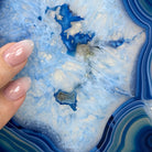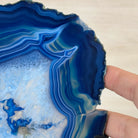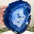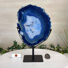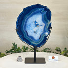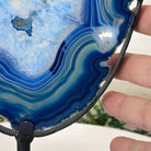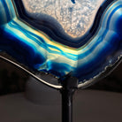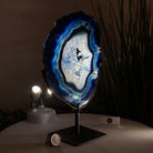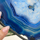 Enhance your decor with this bright slice of Brazilian Blue Agate (dyed blue) beautifully placed on a metal stand by Brazil Gems®. With its striking colors, well defined bands and drusy crystals, this is nature's work of millions of years now available to you.